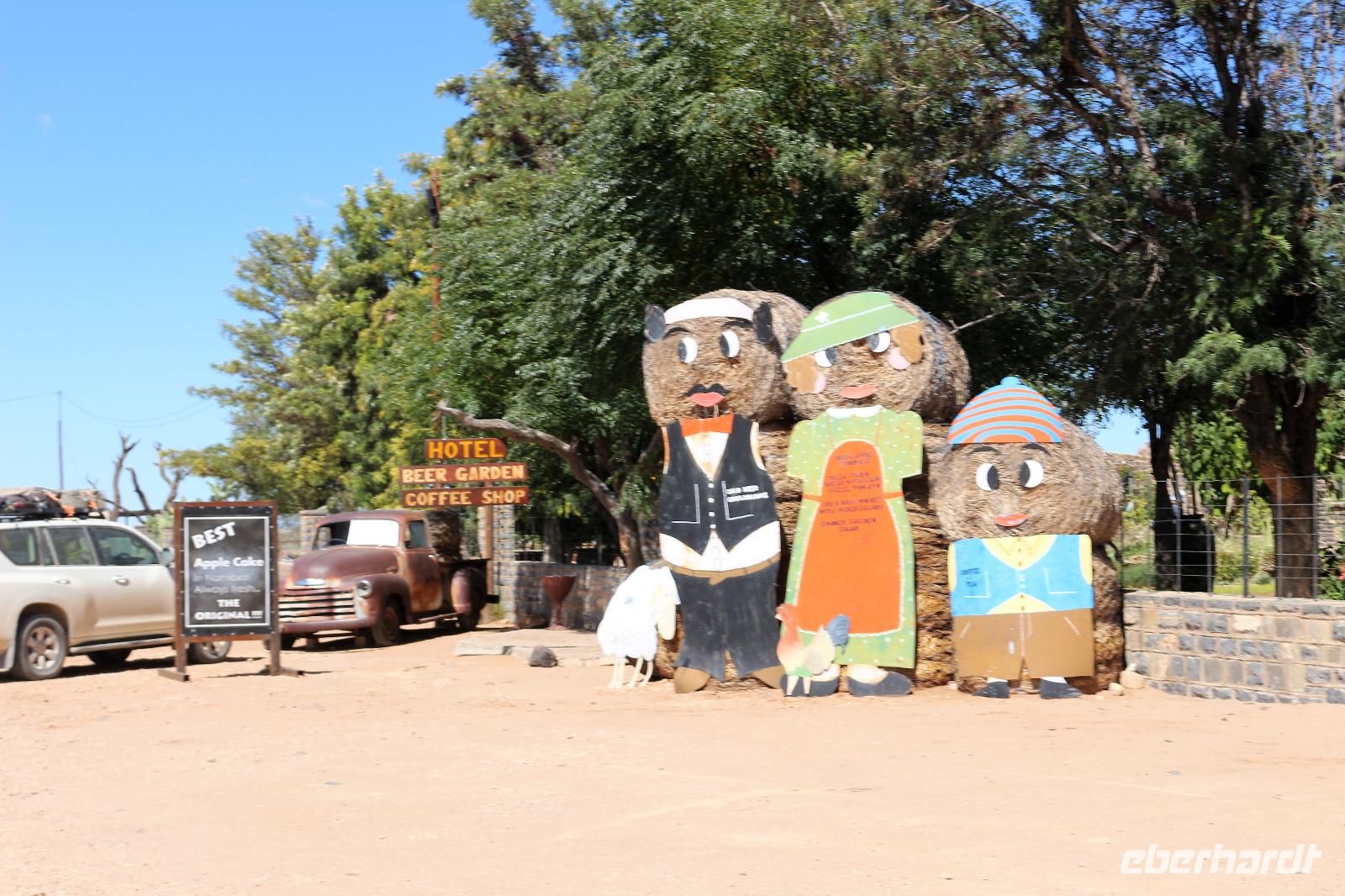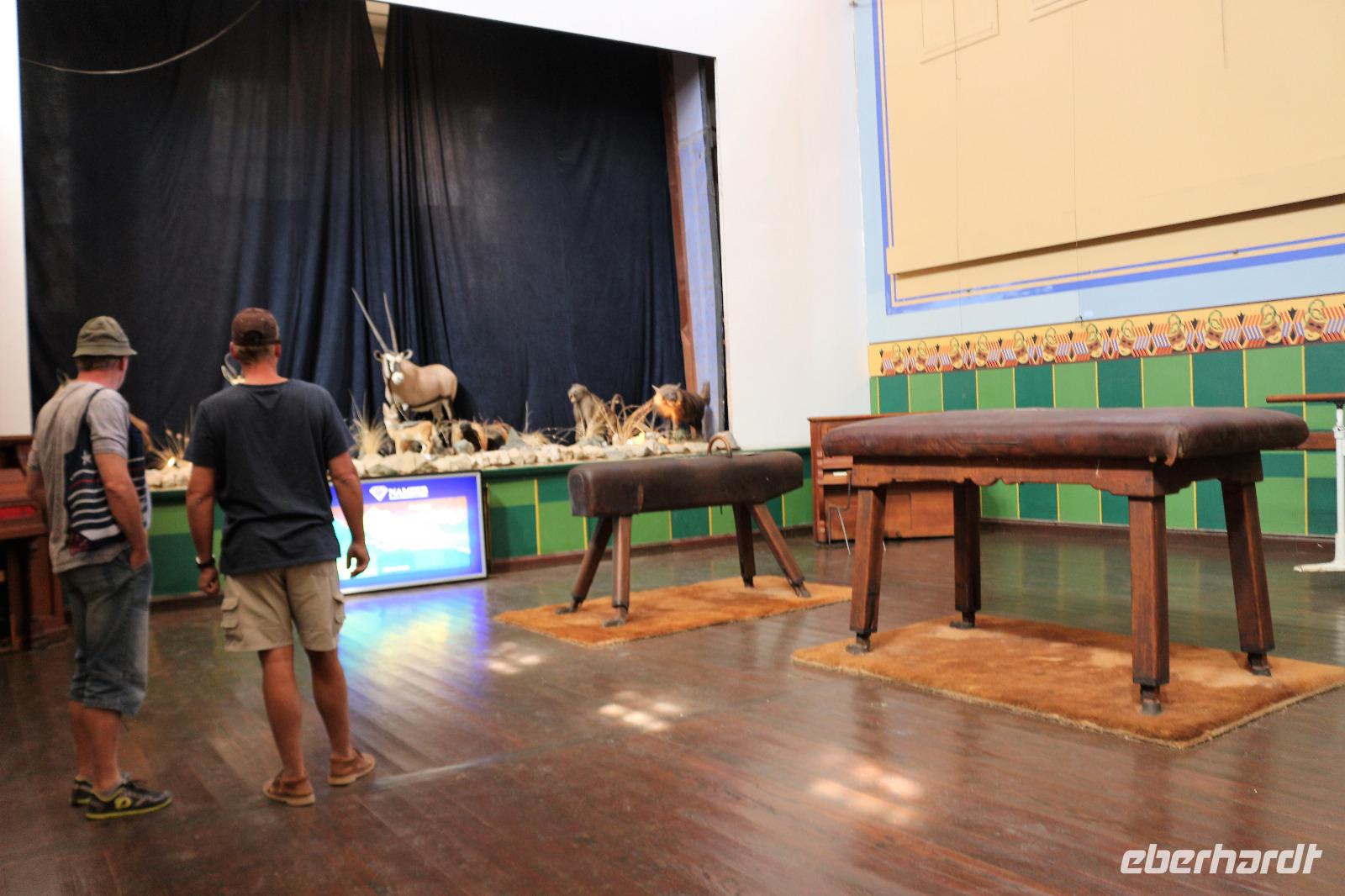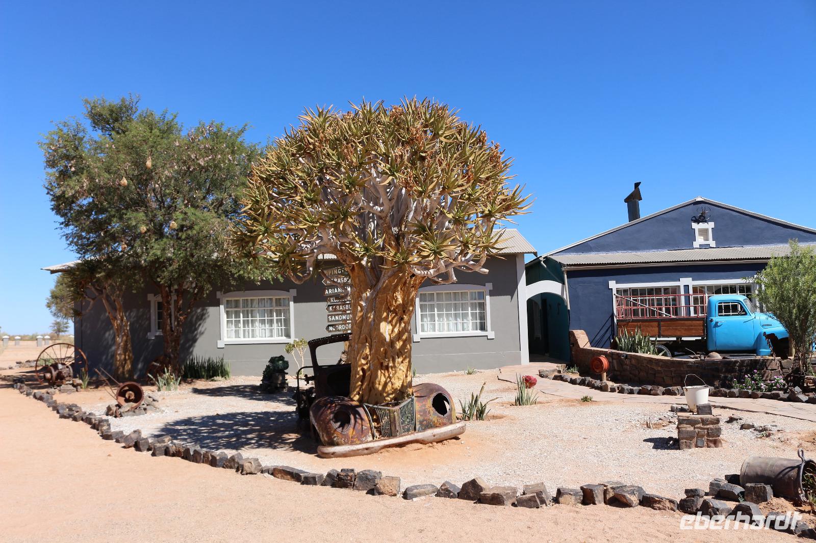 Unsere weitere geplante Besichtigung musste auf den nächsten Tag verschoben werden, da diese bei diesem Unwetter schlichtweg nicht umsetzbar war. So fuhren wir direkt weiter bis Keetmanshoop, wo wir zunächst ein kleines, aber sehr feines Heimatmuseum in der Felsenkirche besichtigten. Weiter fuhren wir zu unserer nächsten Lodge, dem „Schützenhaus". Nachdem die Zimmer bezogen waren, trafen wir uns in der Bar, um mit einem leckeren „Springbock" auf Henners Geburtstag anzustoßen. Dabei staunten wir nicht schlecht, als wir diverse Deutschland-Fahnen aus verschiedenen Zeiten an den Wänden entdeckten. Und das, obwohl doch in Namibia so viel dafür getan wird, diesen Teil der Vergangenheit vollkommen hinter sich zu lassen. Am Abend erwartete uns, wie sollte es in einem Schützenhaus auch anders sein, ein klassisches Wiener Schnitzel. Gut gesättigt von den reichlichen Portionen verabschiedeten wir uns auf unsere Zimmer.