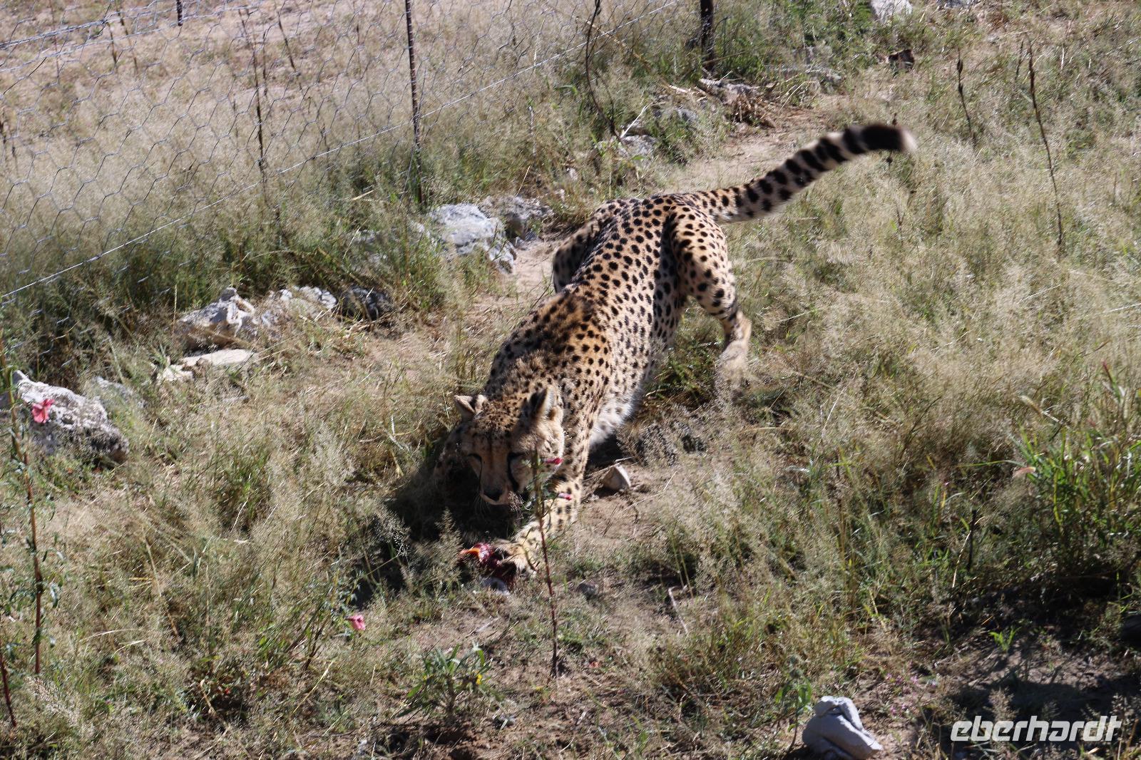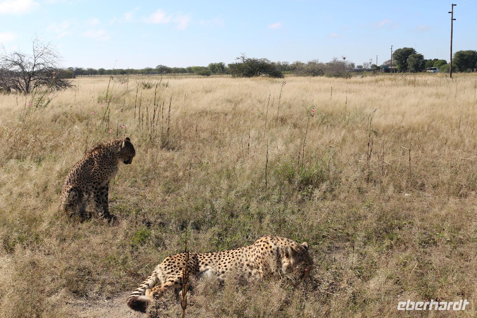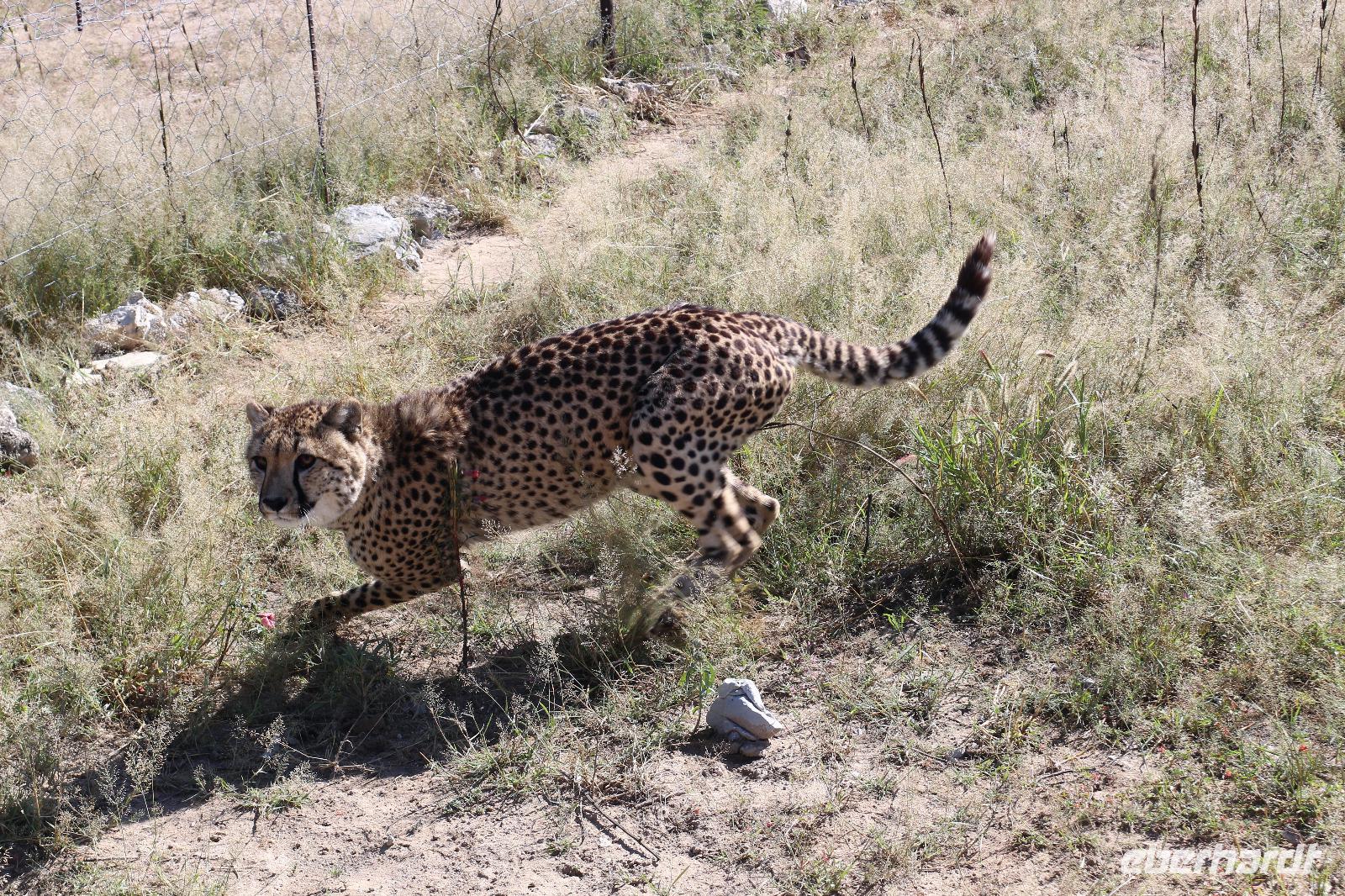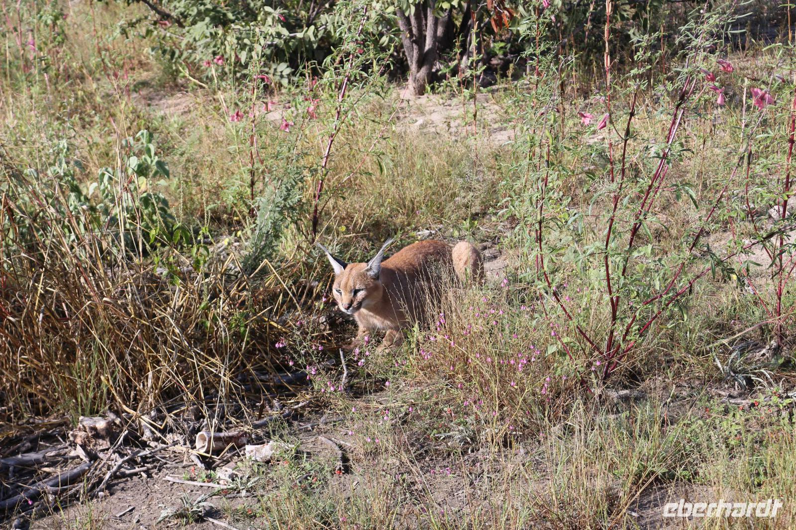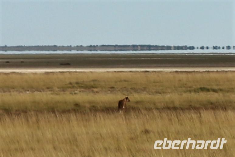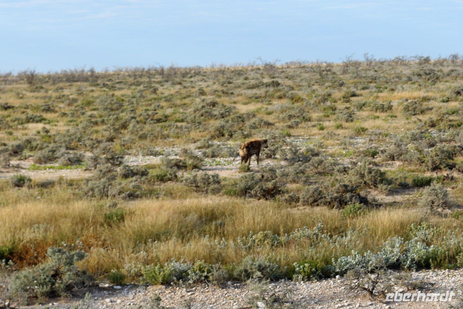 Da wir bis jetzt leider keine Wildkatzen entdeckt hatten, wollten wir unserem Glück heute etwas auf die Sprünge helfen. So fuhren wir nach dem Frühstück direkt erst einmal zur Eldorado Farm, kurz vor dem Etosha Nationalpark. Dies ist eine Wildfarm, in welcher Wildkatzen leben, die mehrfach aus dem Etosha Nationalpark ausgebrochen und deshalb zum Abschuss freigegeben worden waren. Der Eigentümer der Farm hatte jedoch zu dieser Zeit die Genehmigung erhalten, die Tiere auf seiner Farm zu halten, sodass man diese heute dort besichtigen kann. Nach ein paar einführenden Worten, insbesondere zum Schaden, der ihm persönlich durch Wildausbrüche aus dem Etosha Nationalpark widerfahren war, starteten wir unseren Rundgang. Auf diesem bekamen wir endlich einen Leoparden zu sehen, welcher sich wie ein Model verhielt und für unsere Fotos auf einem Baumstamm posierte. Anschließend kamen wir zu den Karakalen, welche jedoch wenig Begeisterung über unsere Anwesenheit zeigten und dies mit lautem Zischen und Knurren zum Ausdruck brachten. Nachdem wir auch die Braune Hyäne sowie eine Tüpfelhyäne gesehen hatten, fuhren wir in das Gepardengehege, wo die Tiere ihr Frühstück erhielten. Zu guter Letzt konnten wir auch zwei Löwen beobachten. Wir erhielten zahlreiche wunderschöne Fotos und konnten endlich die ersehnten Wildkatzen beobachten, wenn auch leider nur hinter Zäunen. Zurück am Farmeingang zeigten sich uns noch Stachelschweine und eine Nachtkatze, welche wir ebenfalls fotografierten. Anschließend verließen wir Eldorado und fuhren in den Etosha Nationalpark, wo wir eine weitere Pirschfahrt unternahmen. Jedoch schien auch heute das Glück nicht auf unserer Seite zu sein, sodass wir bis zum Mittag außer Gnus, Springböcken und Oryx kein Wild zu Gesicht bekamen. Jedoch fotografierten wir die wunderschöne Landschaft sowie auch die Etosha Pfanne und bestaunten die unendliche Weite.