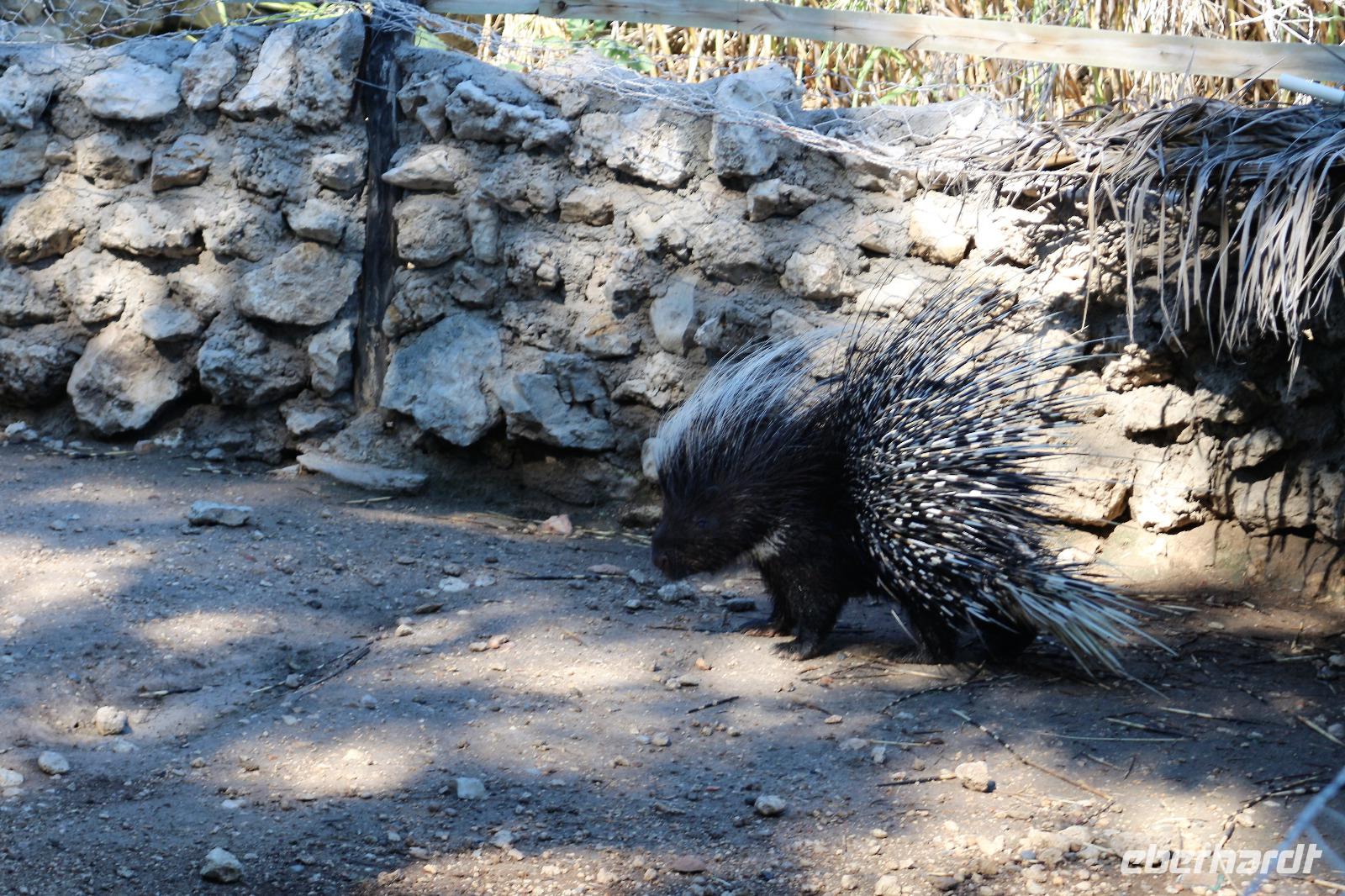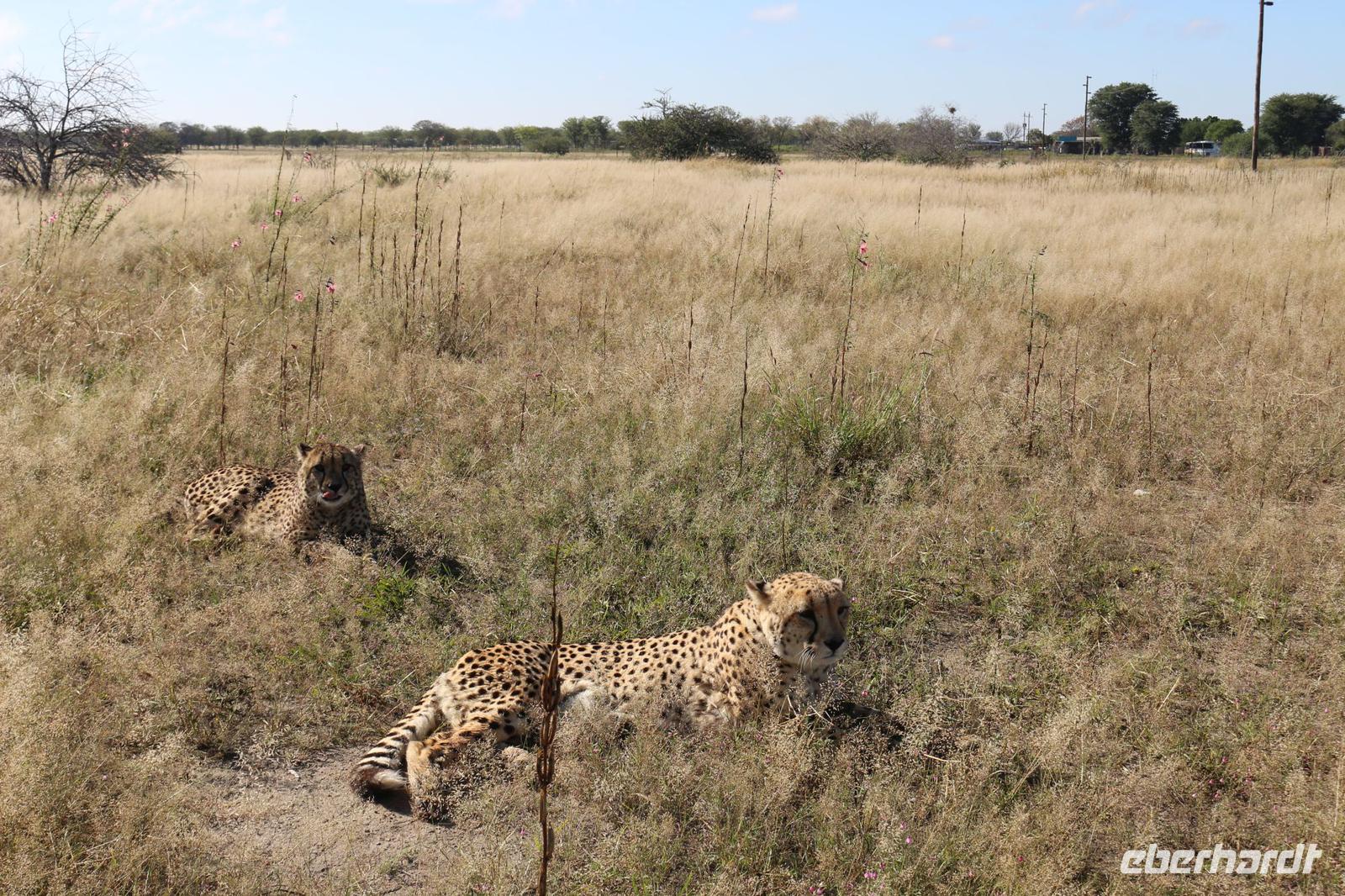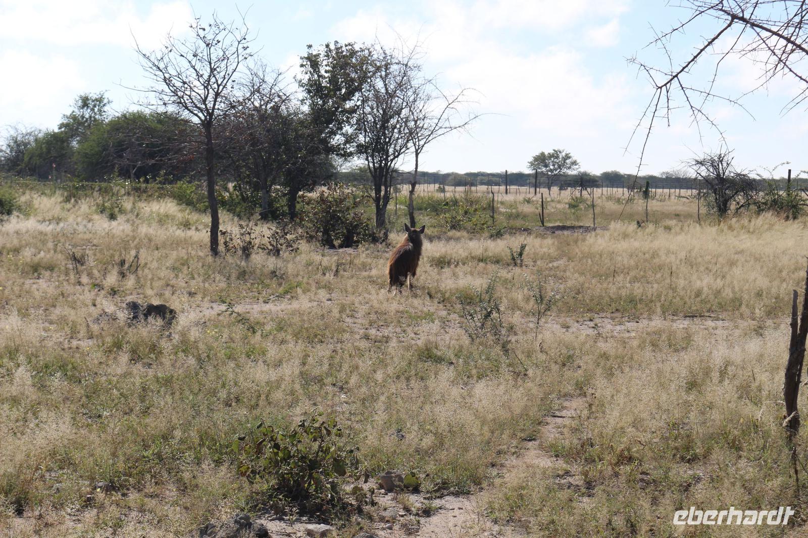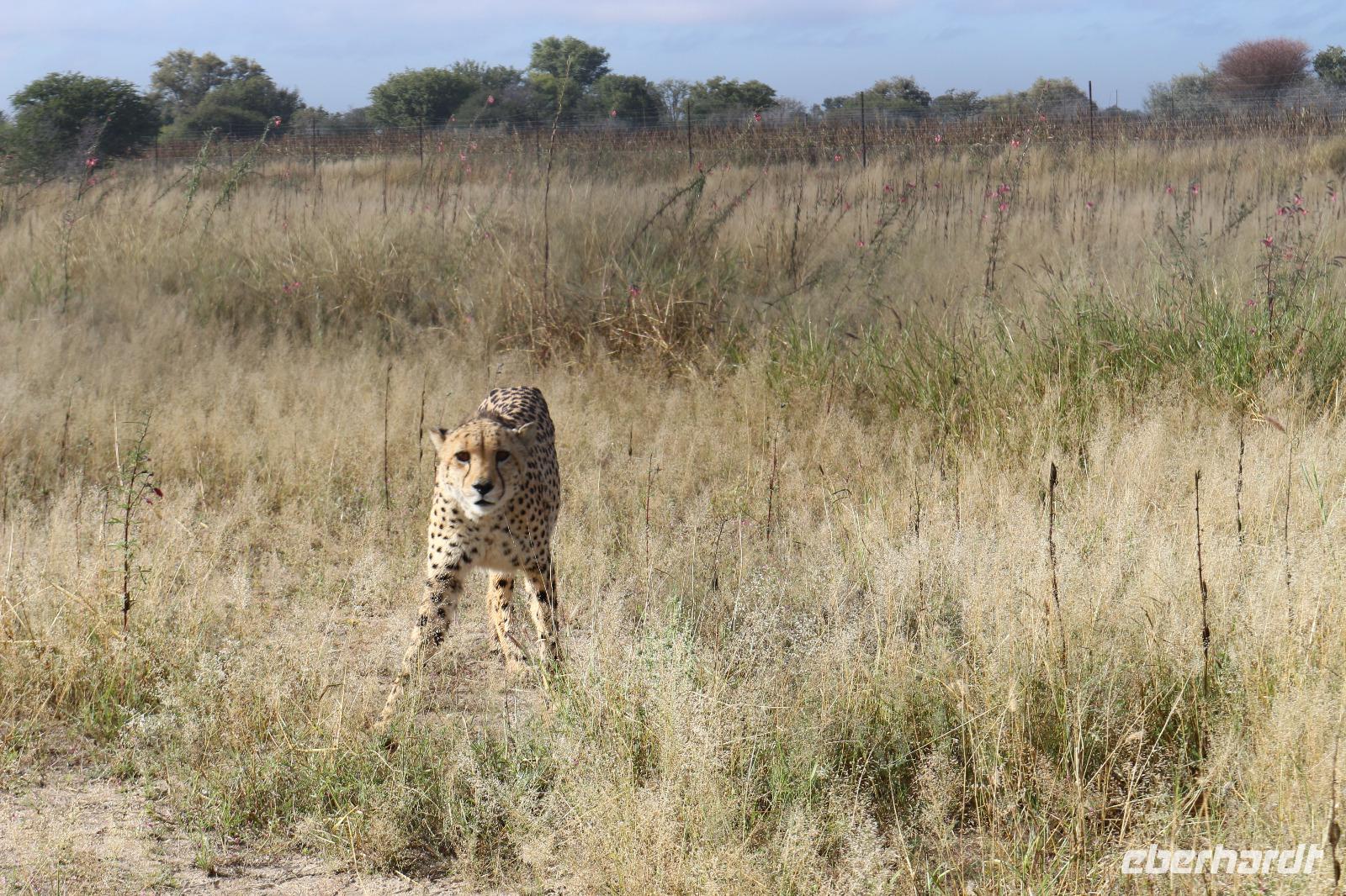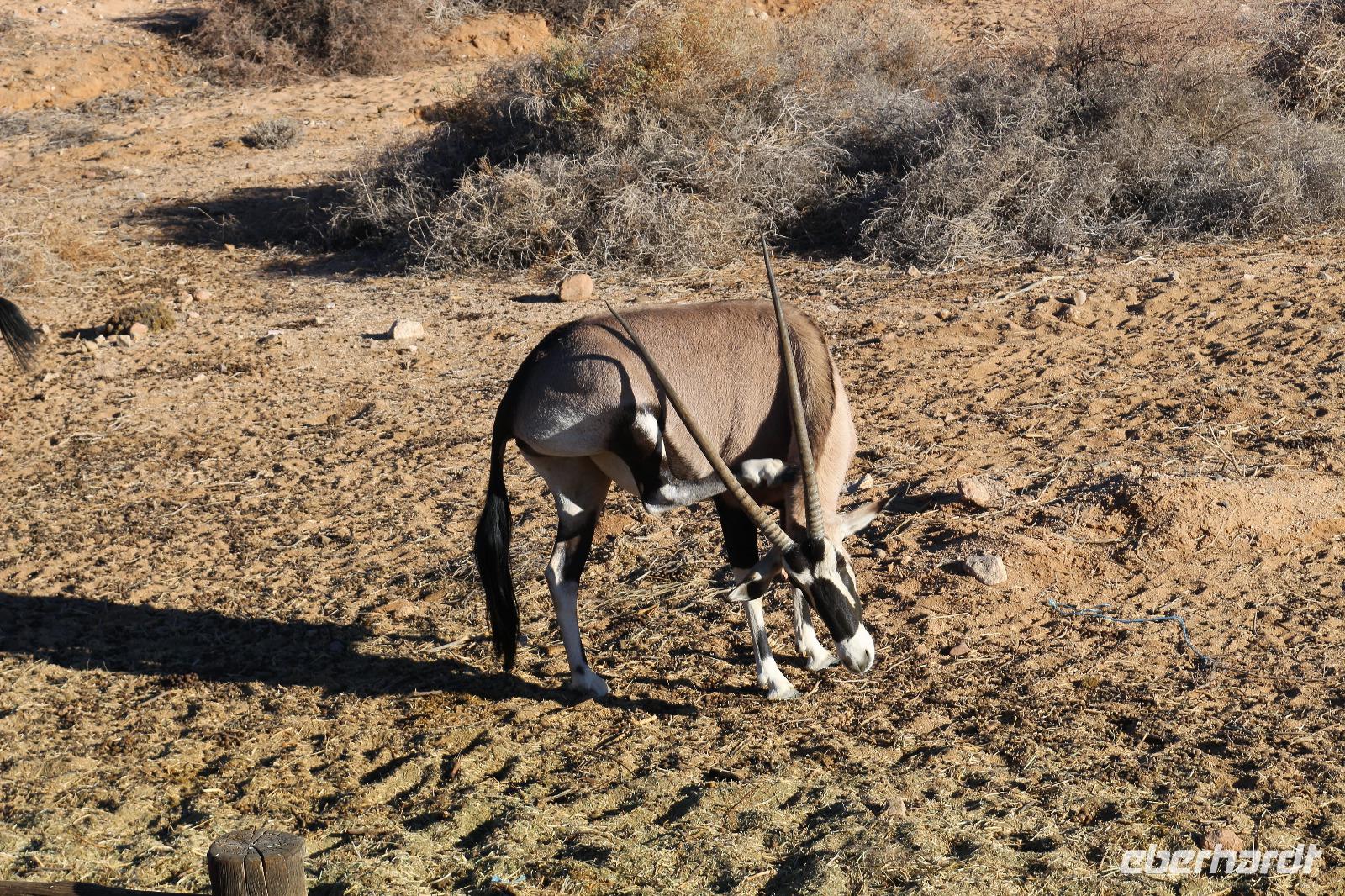 Da wir bis jetzt leider keine Wildkatzen entdeckt hatten, wollten wir unserem Glück heute etwas auf die Sprünge helfen. So fuhren wir nach dem Frühstück direkt erst einmal zur Eldorado Farm, kurz vor dem Etosha Nationalpark. Dies ist eine Wildfarm, in welcher Wildkatzen leben, die mehrfach aus dem Etosha Nationalpark ausgebrochen und deshalb zum Abschuss freigegeben worden waren. Der Eigentümer der Farm hatte jedoch zu dieser Zeit die Genehmigung erhalten, die Tiere auf seiner Farm zu halten, sodass man diese heute dort besichtigen kann. Nach ein paar einführenden Worten, insbesondere zum Schaden, der ihm persönlich durch Wildausbrüche aus dem Etosha Nationalpark widerfahren war, starteten wir unseren Rundgang. Auf diesem bekamen wir endlich einen Leoparden zu sehen, welcher sich wie ein Model verhielt und für unsere Fotos auf einem Baumstamm posierte. Anschließend kamen wir zu den Karakalen, welche jedoch wenig Begeisterung über unsere Anwesenheit zeigten und dies mit lautem Zischen und Knurren zum Ausdruck brachten. Nachdem wir auch die Braune Hyäne sowie eine Tüpfelhyäne gesehen hatten, fuhren wir in das Gepardengehege, wo die Tiere ihr Frühstück erhielten. Zu guter Letzt konnten wir auch zwei Löwen beobachten. Wir erhielten zahlreiche wunderschöne Fotos und konnten endlich die ersehnten Wildkatzen beobachten, wenn auch leider nur hinter Zäunen. Zurück am Farmeingang zeigten sich uns noch Stachelschweine und eine Nachtkatze, welche wir ebenfalls fotografierten. Anschließend verließen wir Eldorado und fuhren in den Etosha Nationalpark, wo wir eine weitere Pirschfahrt unternahmen. Jedoch schien auch heute das Glück nicht auf unserer Seite zu sein, sodass wir bis zum Mittag außer Gnus, Springböcken und Oryx kein Wild zu Gesicht bekamen. Jedoch fotografierten wir die wunderschöne Landschaft sowie auch die Etosha Pfanne und bestaunten die unendliche Weite.