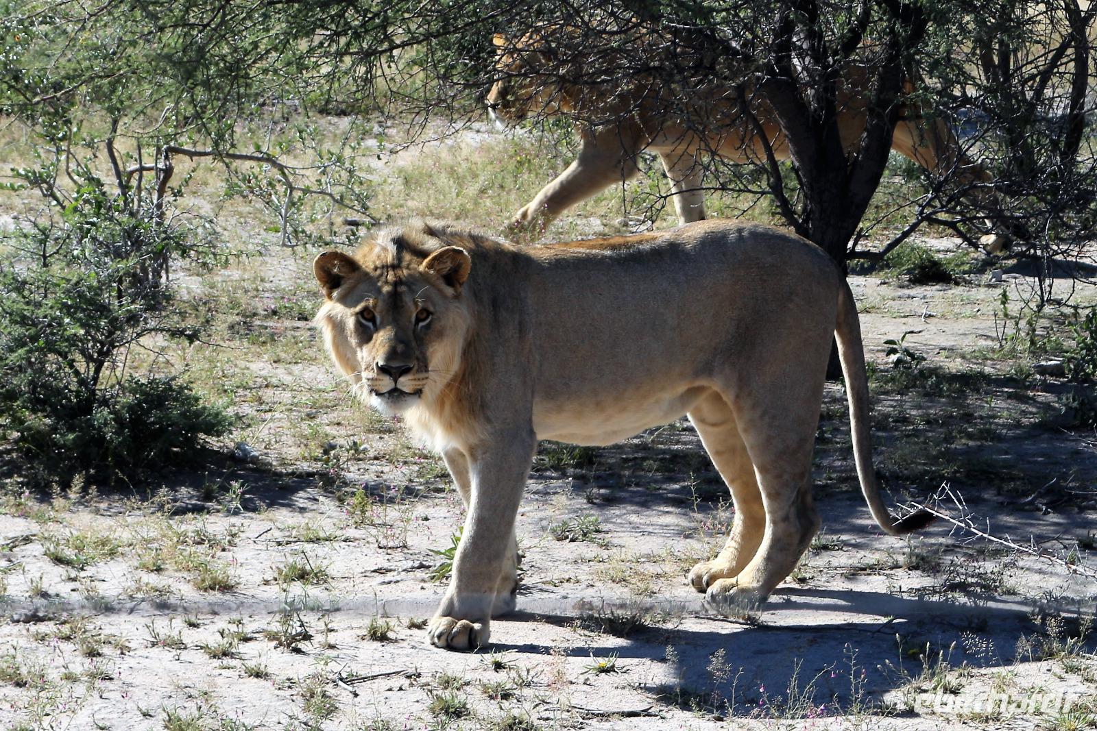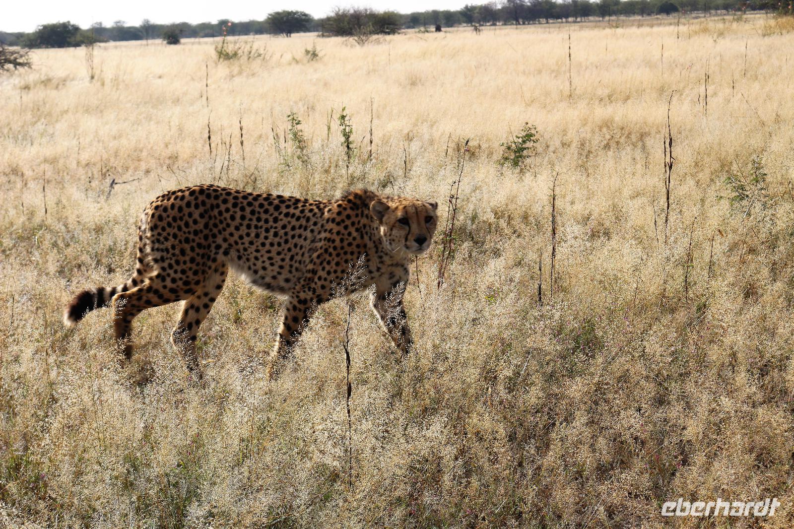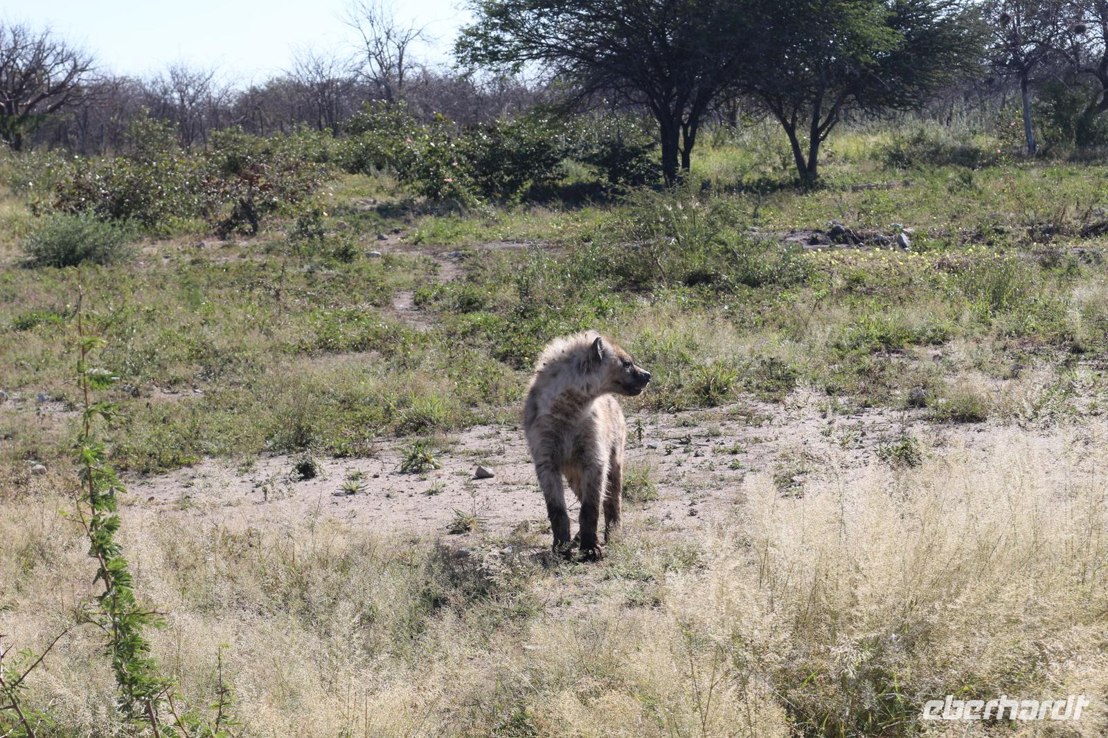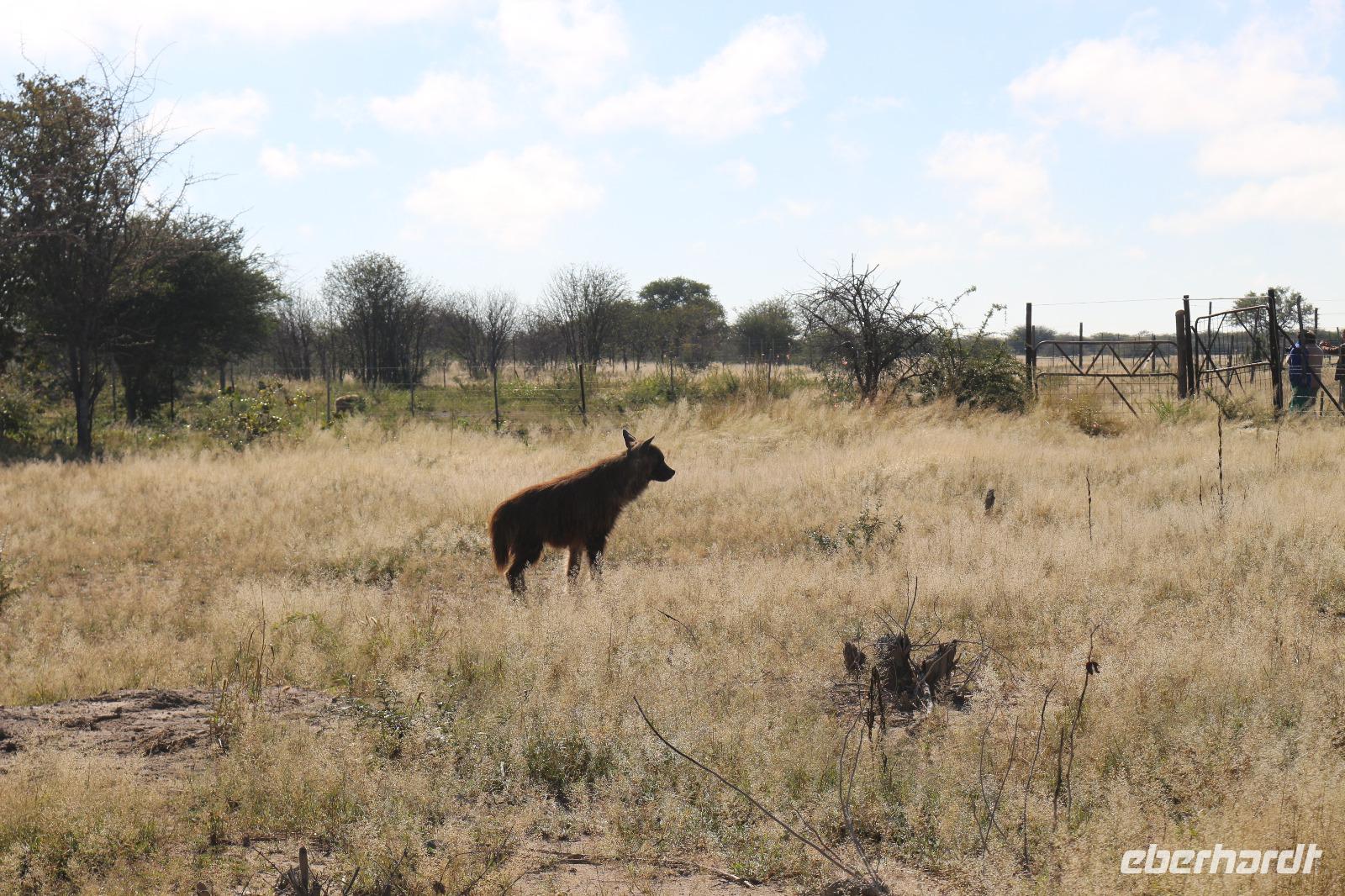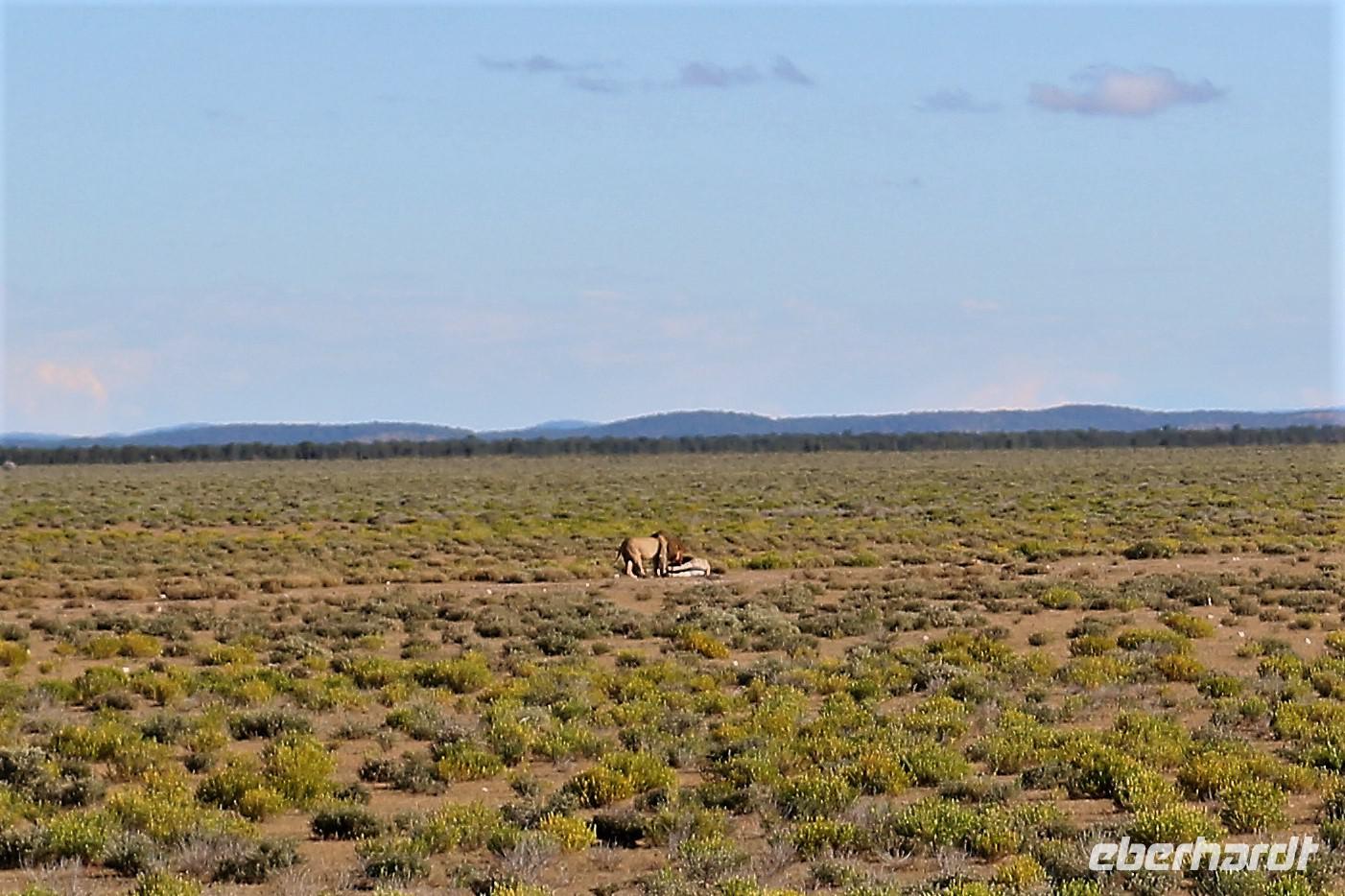 Da wir bis jetzt leider keine Wildkatzen entdeckt hatten, wollten wir unserem Glück heute etwas auf die Sprünge helfen. So fuhren wir nach dem Frühstück direkt erst einmal zur Eldorado Farm, kurz vor dem Etosha Nationalpark. Dies ist eine Wildfarm, in welcher Wildkatzen leben, die mehrfach aus dem Etosha Nationalpark ausgebrochen und deshalb zum Abschuss freigegeben worden waren. Der Eigentümer der Farm hatte jedoch zu dieser Zeit die Genehmigung erhalten, die Tiere auf seiner Farm zu halten, sodass man diese heute dort besichtigen kann. Nach ein paar einführenden Worten, insbesondere zum Schaden, der ihm persönlich durch Wildausbrüche aus dem Etosha Nationalpark widerfahren war, starteten wir unseren Rundgang. Auf diesem bekamen wir endlich einen Leoparden zu sehen, welcher sich wie ein Model verhielt und für unsere Fotos auf einem Baumstamm posierte. Anschließend kamen wir zu den Karakalen, welche jedoch wenig Begeisterung über unsere Anwesenheit zeigten und dies mit lautem Zischen und Knurren zum Ausdruck brachten. Nachdem wir auch die Braune Hyäne sowie eine Tüpfelhyäne gesehen hatten, fuhren wir in das Gepardengehege, wo die Tiere ihr Frühstück erhielten. Zu guter Letzt konnten wir auch zwei Löwen beobachten. Wir erhielten zahlreiche wunderschöne Fotos und konnten endlich die ersehnten Wildkatzen beobachten, wenn auch leider nur hinter Zäunen. Zurück am Farmeingang zeigten sich uns noch Stachelschweine und eine Nachtkatze, welche wir ebenfalls fotografierten. Anschließend verließen wir Eldorado und fuhren in den Etosha Nationalpark, wo wir eine weitere Pirschfahrt unternahmen. Jedoch schien auch heute das Glück nicht auf unserer Seite zu sein, sodass wir bis zum Mittag außer Gnus, Springböcken und Oryx kein Wild zu Gesicht bekamen. Jedoch fotografierten wir die wunderschöne Landschaft sowie auch die Etosha Pfanne und bestaunten die unendliche Weite.