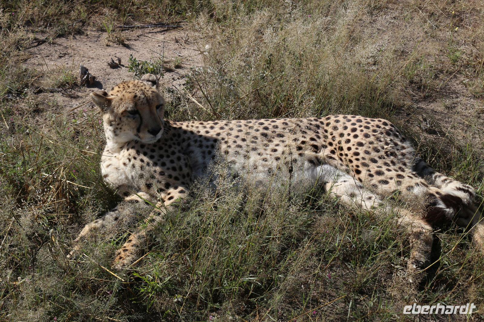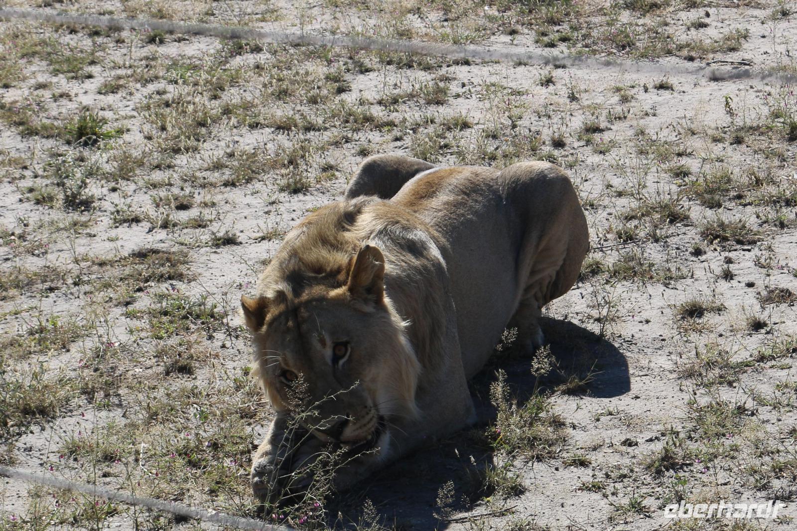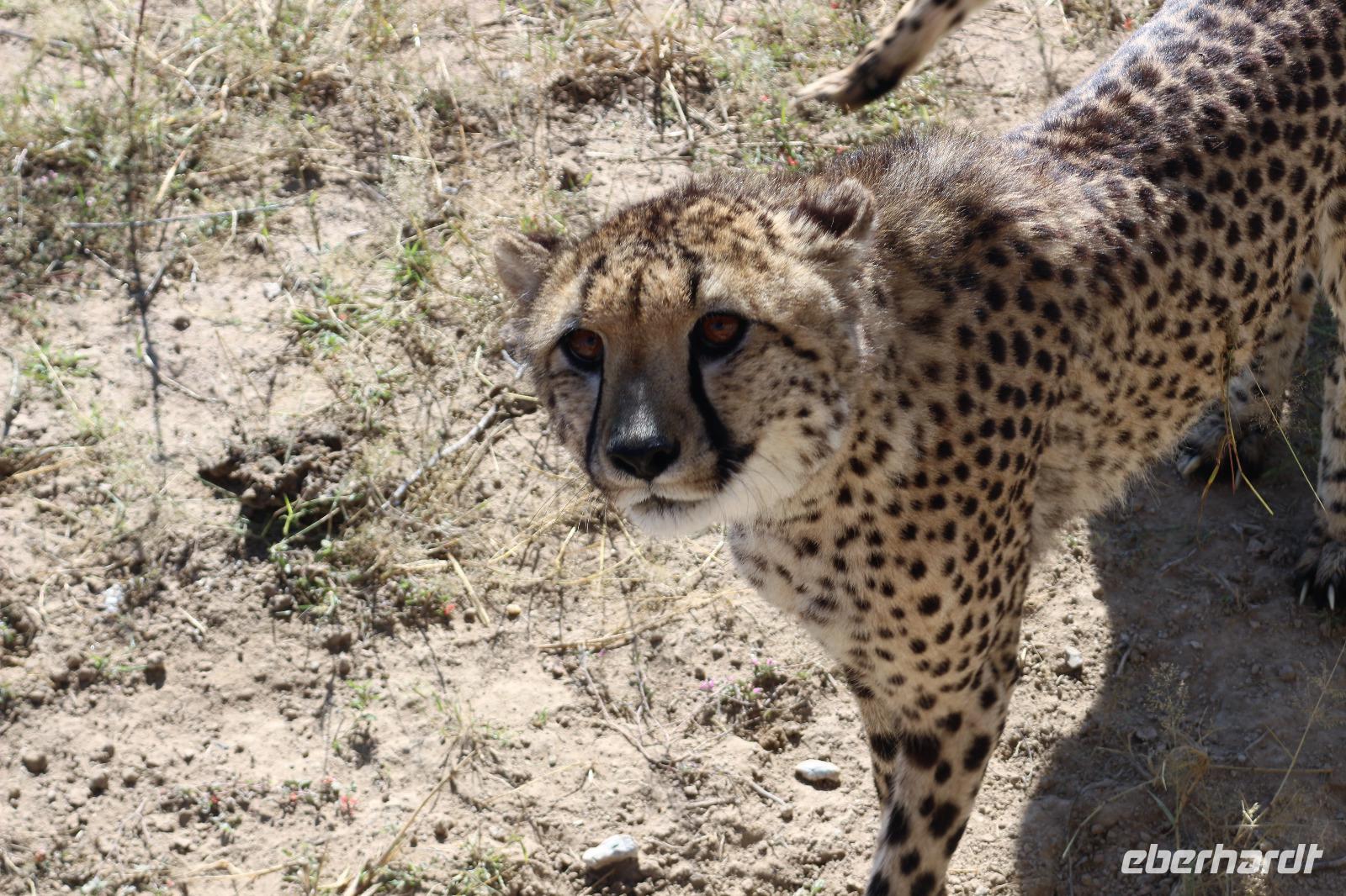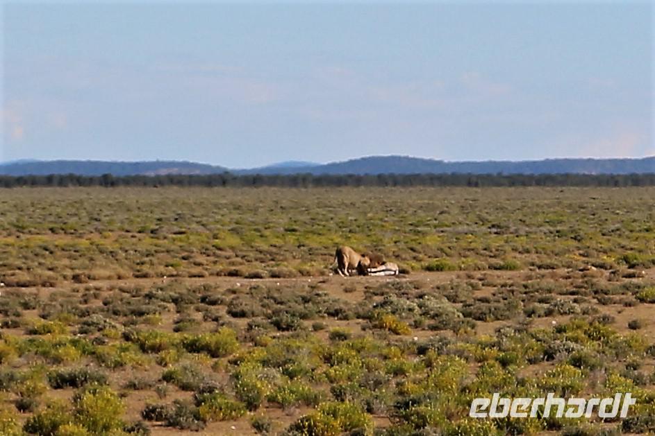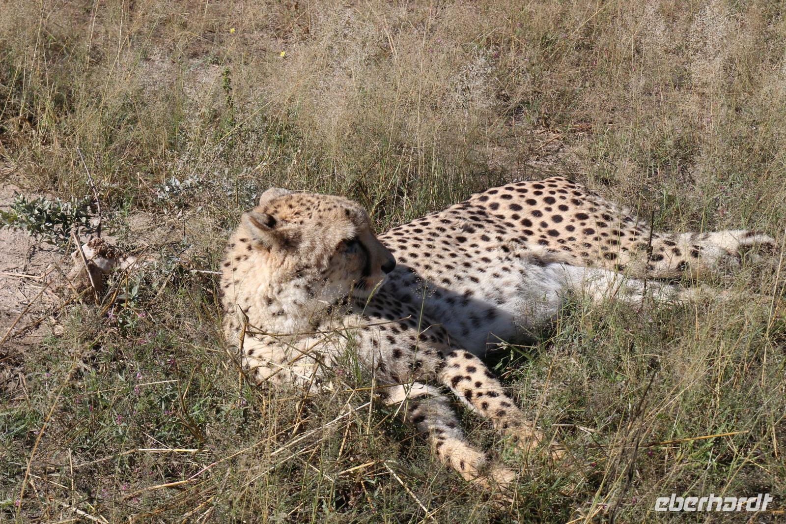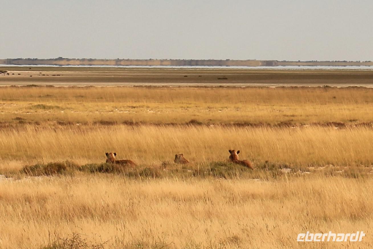 Da wir bis jetzt leider keine Wildkatzen entdeckt hatten, wollten wir unserem Glück heute etwas auf die Sprünge helfen. So fuhren wir nach dem Frühstück direkt erst einmal zur Eldorado Farm, kurz vor dem Etosha Nationalpark. Dies ist eine Wildfarm, in welcher Wildkatzen leben, die mehrfach aus dem Etosha Nationalpark ausgebrochen und deshalb zum Abschuss freigegeben worden waren. Der Eigentümer der Farm hatte jedoch zu dieser Zeit die Genehmigung erhalten, die Tiere auf seiner Farm zu halten, sodass man diese heute dort besichtigen kann. Nach ein paar einführenden Worten, insbesondere zum Schaden, der ihm persönlich durch Wildausbrüche aus dem Etosha Nationalpark widerfahren war, starteten wir unseren Rundgang. Auf diesem bekamen wir endlich einen Leoparden zu sehen, welcher sich wie ein Model verhielt und für unsere Fotos auf einem Baumstamm posierte. Anschließend kamen wir zu den Karakalen, welche jedoch wenig Begeisterung über unsere Anwesenheit zeigten und dies mit lautem Zischen und Knurren zum Ausdruck brachten. Nachdem wir auch die Braune Hyäne sowie eine Tüpfelhyäne gesehen hatten, fuhren wir in das Gepardengehege, wo die Tiere ihr Frühstück erhielten. Zu guter Letzt konnten wir auch zwei Löwen beobachten. Wir erhielten zahlreiche wunderschöne Fotos und konnten endlich die ersehnten Wildkatzen beobachten, wenn auch leider nur hinter Zäunen. Zurück am Farmeingang zeigten sich uns noch Stachelschweine und eine Nachtkatze, welche wir ebenfalls fotografierten. Anschließend verließen wir Eldorado und fuhren in den Etosha Nationalpark, wo wir eine weitere Pirschfahrt unternahmen. Jedoch schien auch heute das Glück nicht auf unserer Seite zu sein, sodass wir bis zum Mittag außer Gnus, Springböcken und Oryx kein Wild zu Gesicht bekamen. Jedoch fotografierten wir die wunderschöne Landschaft sowie auch die Etosha Pfanne und bestaunten die unendliche Weite.