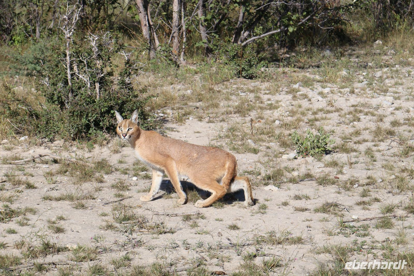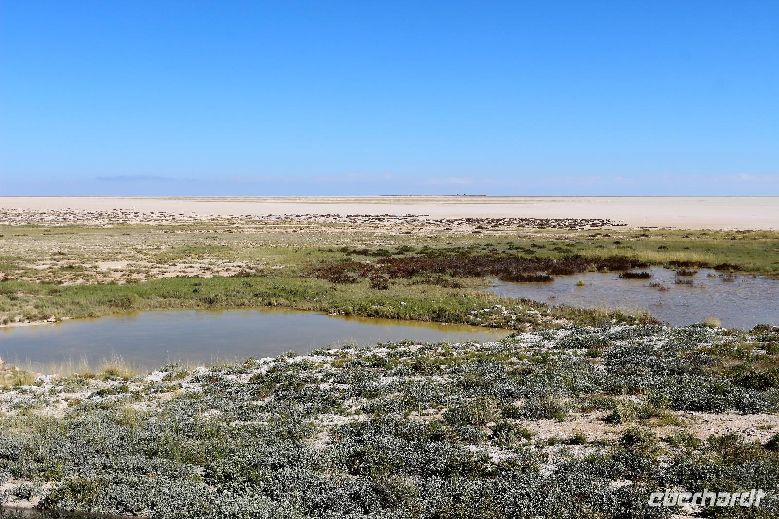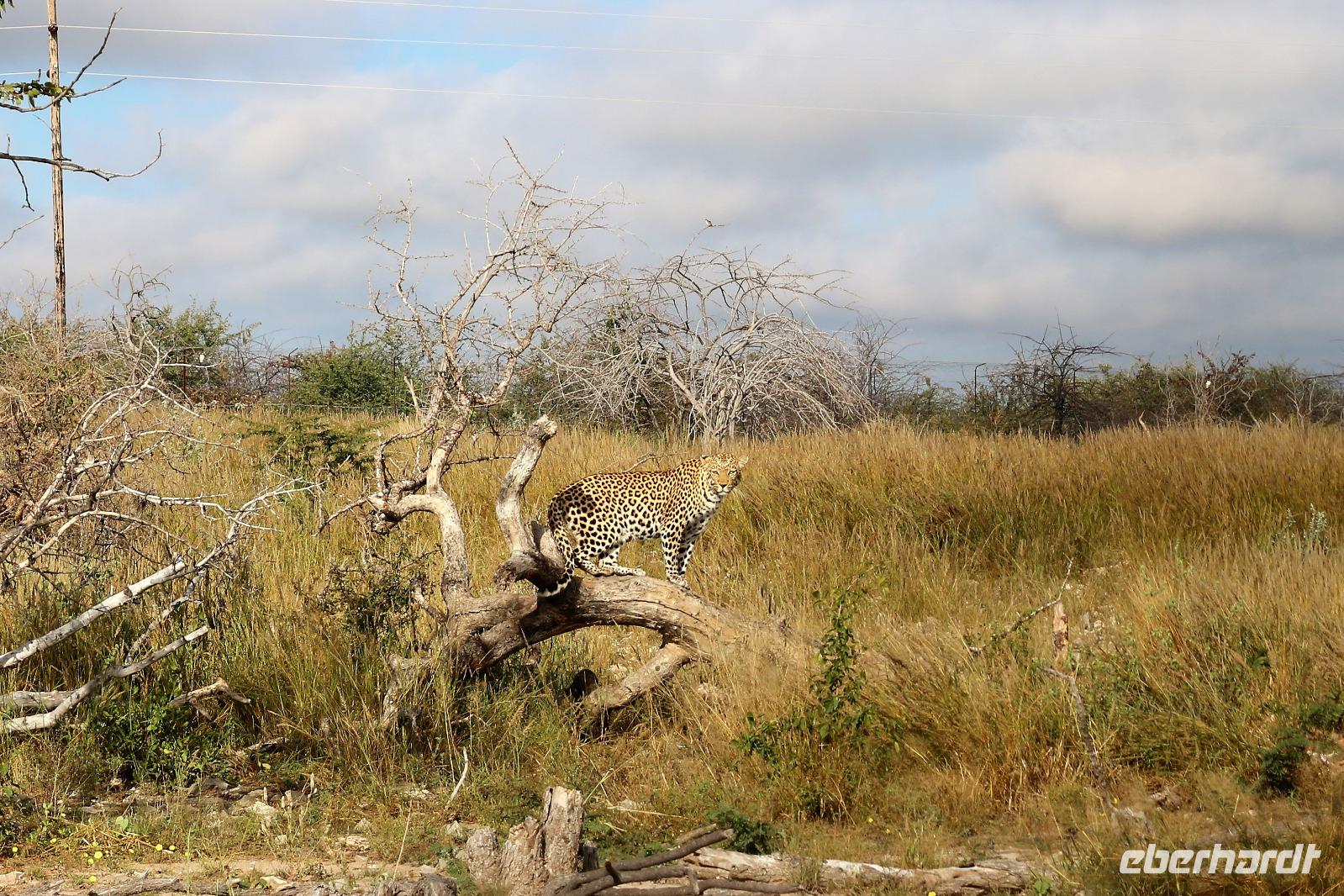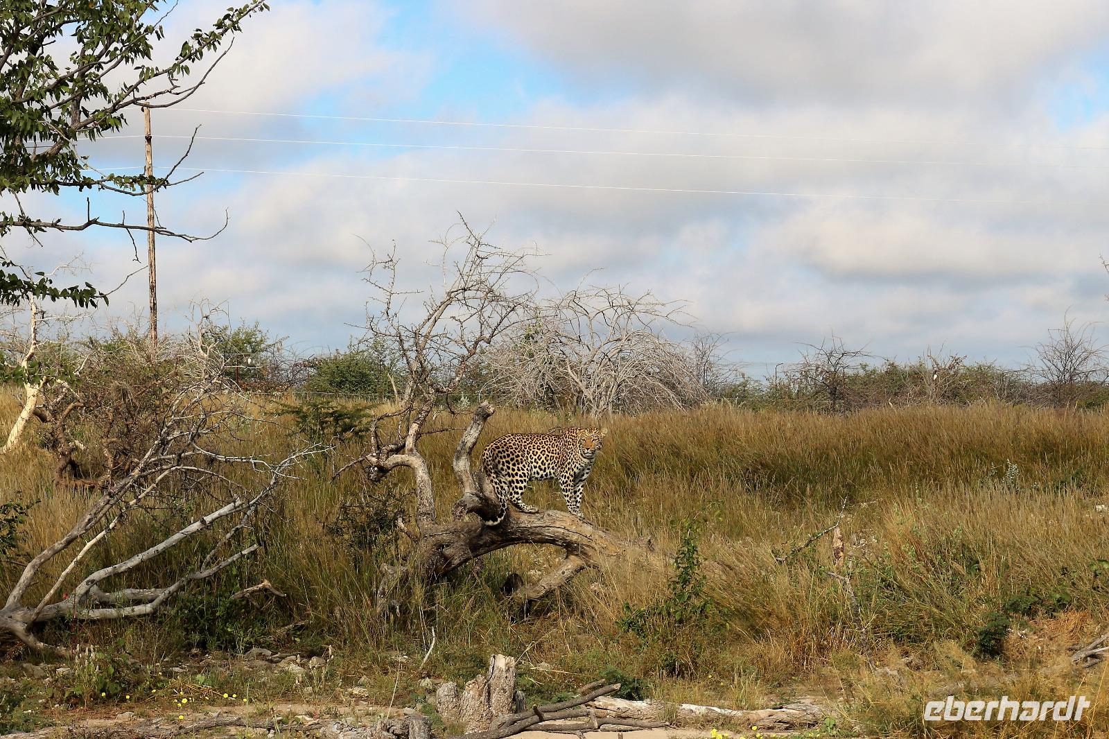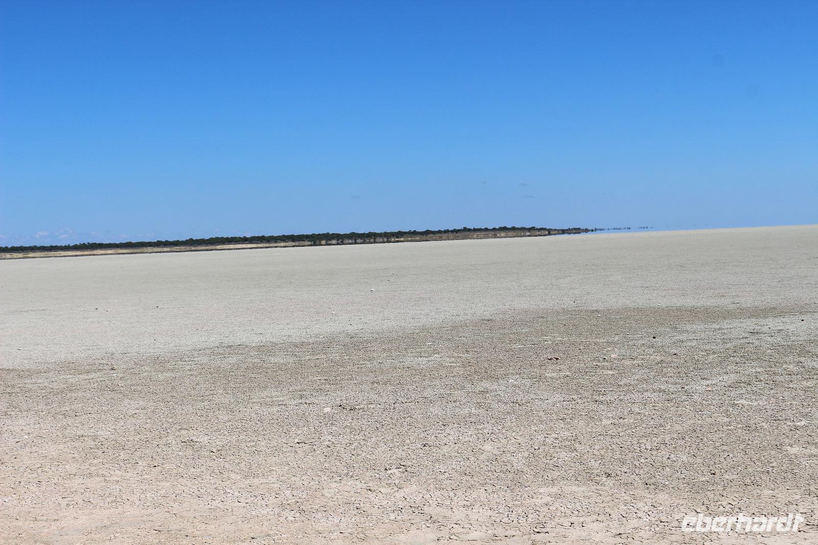 Da wir bis jetzt leider keine Wildkatzen entdeckt hatten, wollten wir unserem Glück heute etwas auf die Sprünge helfen. So fuhren wir nach dem Frühstück direkt erst einmal zur Eldorado Farm, kurz vor dem Etosha Nationalpark. Dies ist eine Wildfarm, in welcher Wildkatzen leben, die mehrfach aus dem Etosha Nationalpark ausgebrochen und deshalb zum Abschuss freigegeben worden waren. Der Eigentümer der Farm hatte jedoch zu dieser Zeit die Genehmigung erhalten, die Tiere auf seiner Farm zu halten, sodass man diese heute dort besichtigen kann. Nach ein paar einführenden Worten, insbesondere zum Schaden, der ihm persönlich durch Wildausbrüche aus dem Etosha Nationalpark widerfahren war, starteten wir unseren Rundgang. Auf diesem bekamen wir endlich einen Leoparden zu sehen, welcher sich wie ein Model verhielt und für unsere Fotos auf einem Baumstamm posierte. Anschließend kamen wir zu den Karakalen, welche jedoch wenig Begeisterung über unsere Anwesenheit zeigten und dies mit lautem Zischen und Knurren zum Ausdruck brachten. Nachdem wir auch die Braune Hyäne sowie eine Tüpfelhyäne gesehen hatten, fuhren wir in das Gepardengehege, wo die Tiere ihr Frühstück erhielten. Zu guter Letzt konnten wir auch zwei Löwen beobachten. Wir erhielten zahlreiche wunderschöne Fotos und konnten endlich die ersehnten Wildkatzen beobachten, wenn auch leider nur hinter Zäunen. Zurück am Farmeingang zeigten sich uns noch Stachelschweine und eine Nachtkatze, welche wir ebenfalls fotografierten. Anschließend verließen wir Eldorado und fuhren in den Etosha Nationalpark, wo wir eine weitere Pirschfahrt unternahmen. Jedoch schien auch heute das Glück nicht auf unserer Seite zu sein, sodass wir bis zum Mittag außer Gnus, Springböcken und Oryx kein Wild zu Gesicht bekamen. Jedoch fotografierten wir die wunderschöne Landschaft sowie auch die Etosha Pfanne und bestaunten die unendliche Weite.