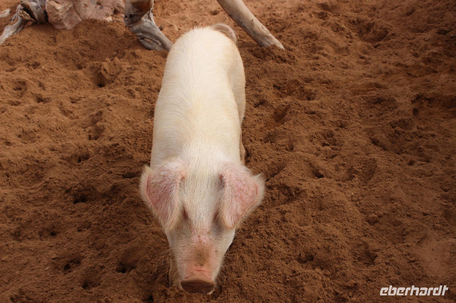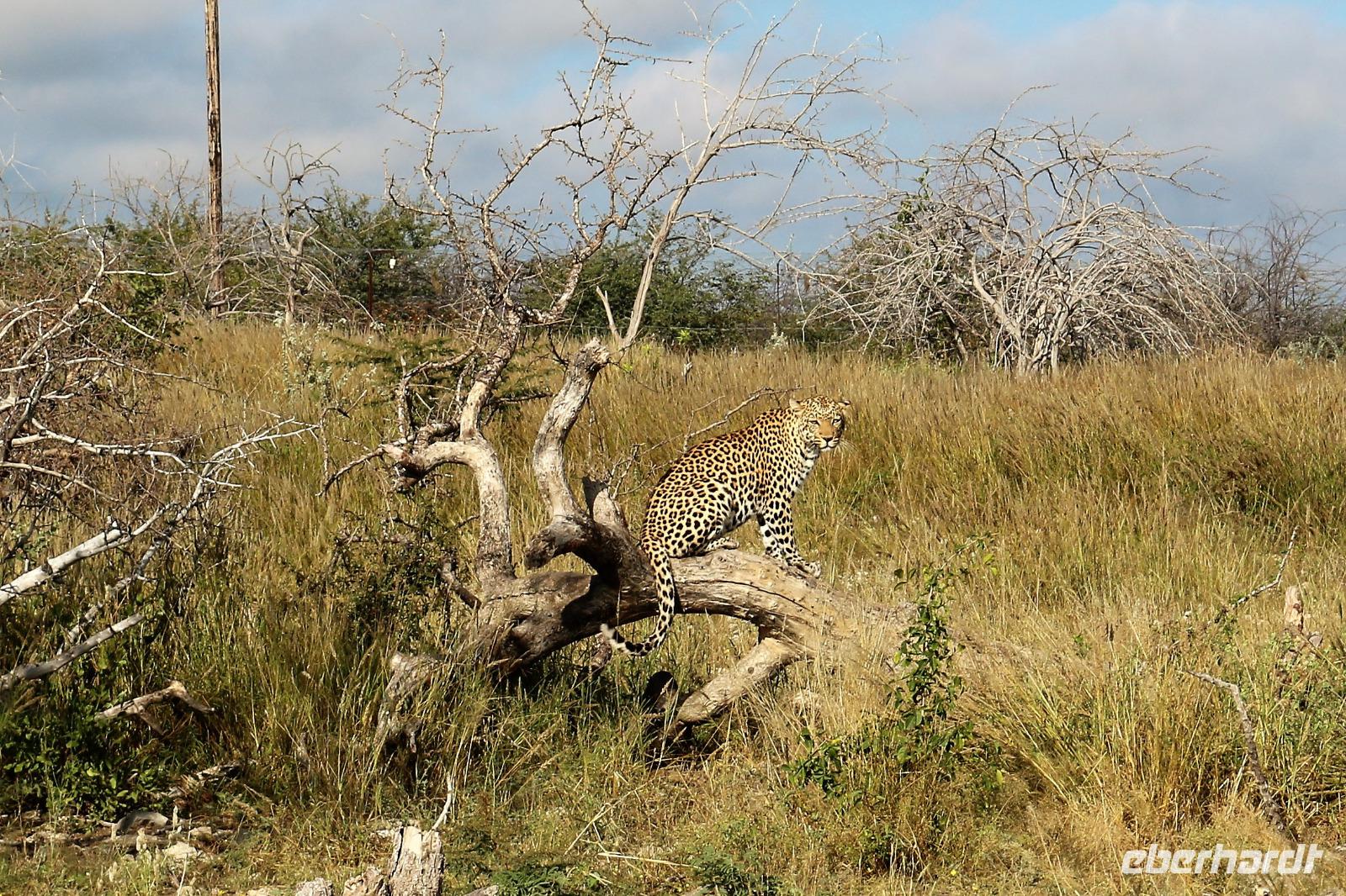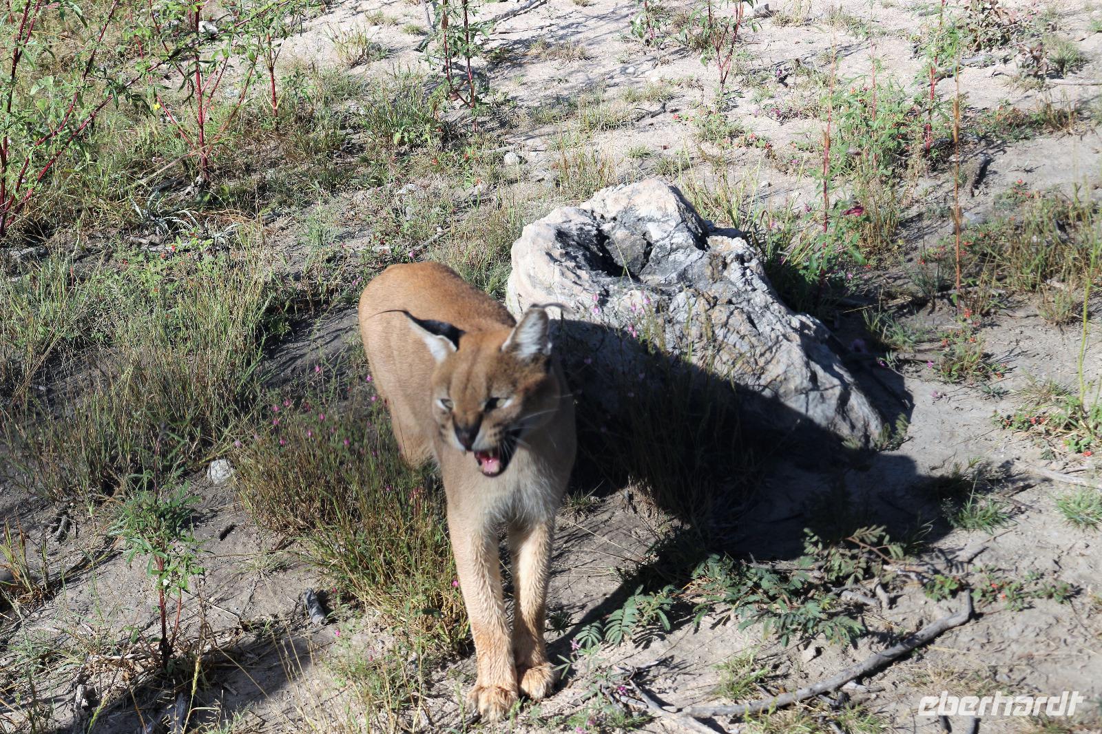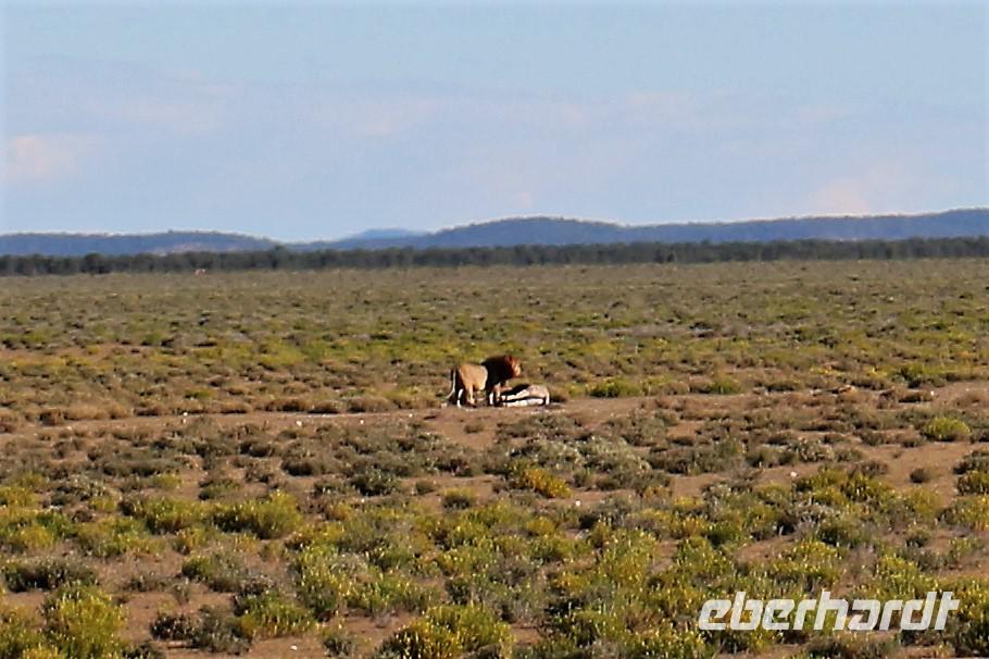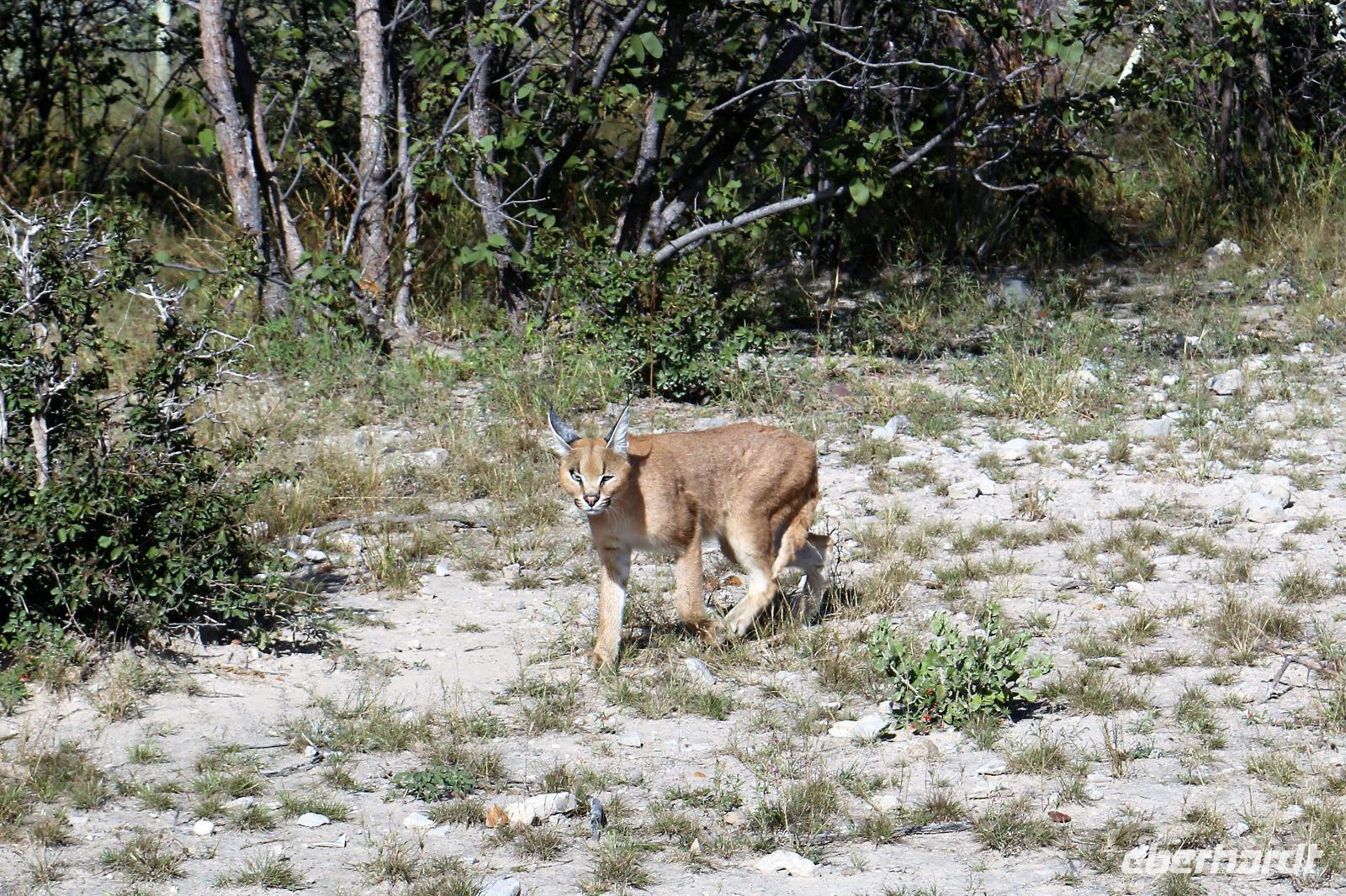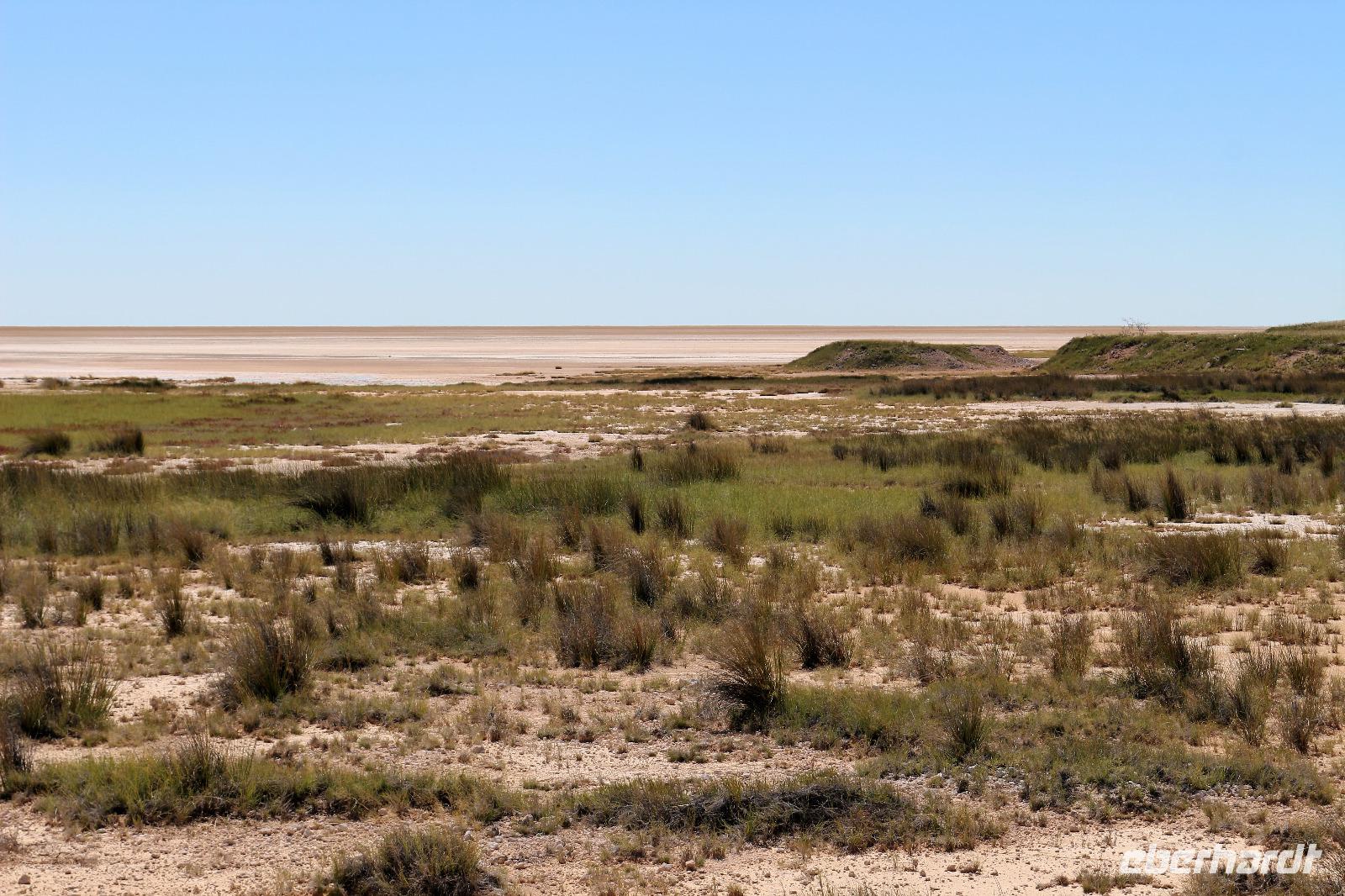 Da wir bis jetzt leider keine Wildkatzen entdeckt hatten, wollten wir unserem Glück heute etwas auf die Sprünge helfen. So fuhren wir nach dem Frühstück direkt erst einmal zur Eldorado Farm, kurz vor dem Etosha Nationalpark. Dies ist eine Wildfarm, in welcher Wildkatzen leben, die mehrfach aus dem Etosha Nationalpark ausgebrochen und deshalb zum Abschuss freigegeben worden waren. Der Eigentümer der Farm hatte jedoch zu dieser Zeit die Genehmigung erhalten, die Tiere auf seiner Farm zu halten, sodass man diese heute dort besichtigen kann. Nach ein paar einführenden Worten, insbesondere zum Schaden, der ihm persönlich durch Wildausbrüche aus dem Etosha Nationalpark widerfahren war, starteten wir unseren Rundgang. Auf diesem bekamen wir endlich einen Leoparden zu sehen, welcher sich wie ein Model verhielt und für unsere Fotos auf einem Baumstamm posierte. Anschließend kamen wir zu den Karakalen, welche jedoch wenig Begeisterung über unsere Anwesenheit zeigten und dies mit lautem Zischen und Knurren zum Ausdruck brachten. Nachdem wir auch die Braune Hyäne sowie eine Tüpfelhyäne gesehen hatten, fuhren wir in das Gepardengehege, wo die Tiere ihr Frühstück erhielten. Zu guter Letzt konnten wir auch zwei Löwen beobachten. Wir erhielten zahlreiche wunderschöne Fotos und konnten endlich die ersehnten Wildkatzen beobachten, wenn auch leider nur hinter Zäunen. Zurück am Farmeingang zeigten sich uns noch Stachelschweine und eine Nachtkatze, welche wir ebenfalls fotografierten. Anschließend verließen wir Eldorado und fuhren in den Etosha Nationalpark, wo wir eine weitere Pirschfahrt unternahmen. Jedoch schien auch heute das Glück nicht auf unserer Seite zu sein, sodass wir bis zum Mittag außer Gnus, Springböcken und Oryx kein Wild zu Gesicht bekamen. Jedoch fotografierten wir die wunderschöne Landschaft sowie auch die Etosha Pfanne und bestaunten die unendliche Weite.
