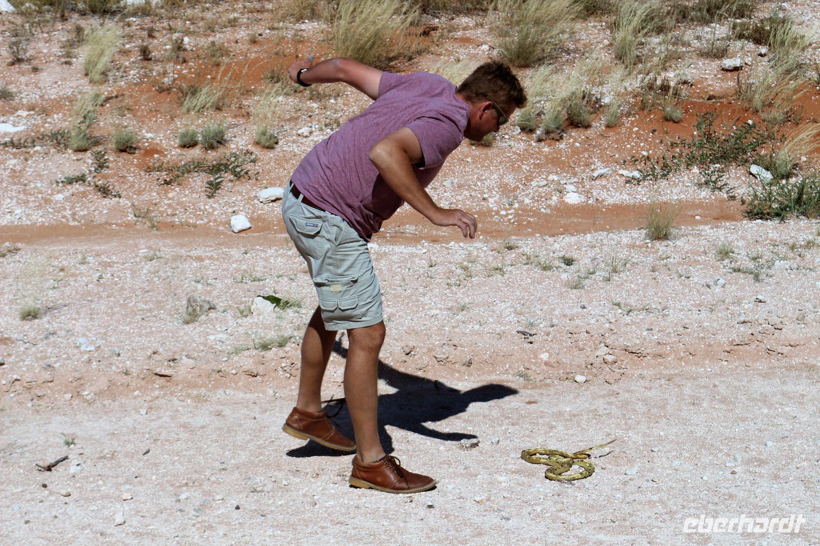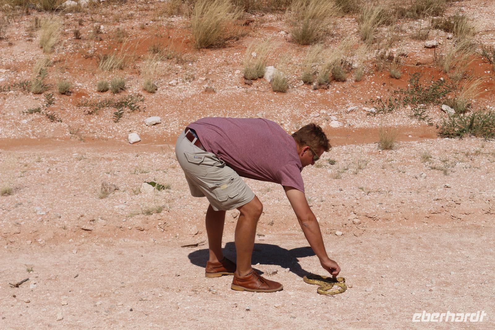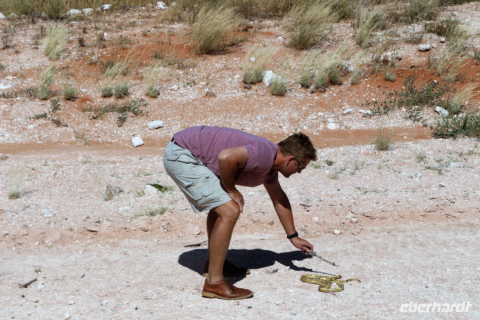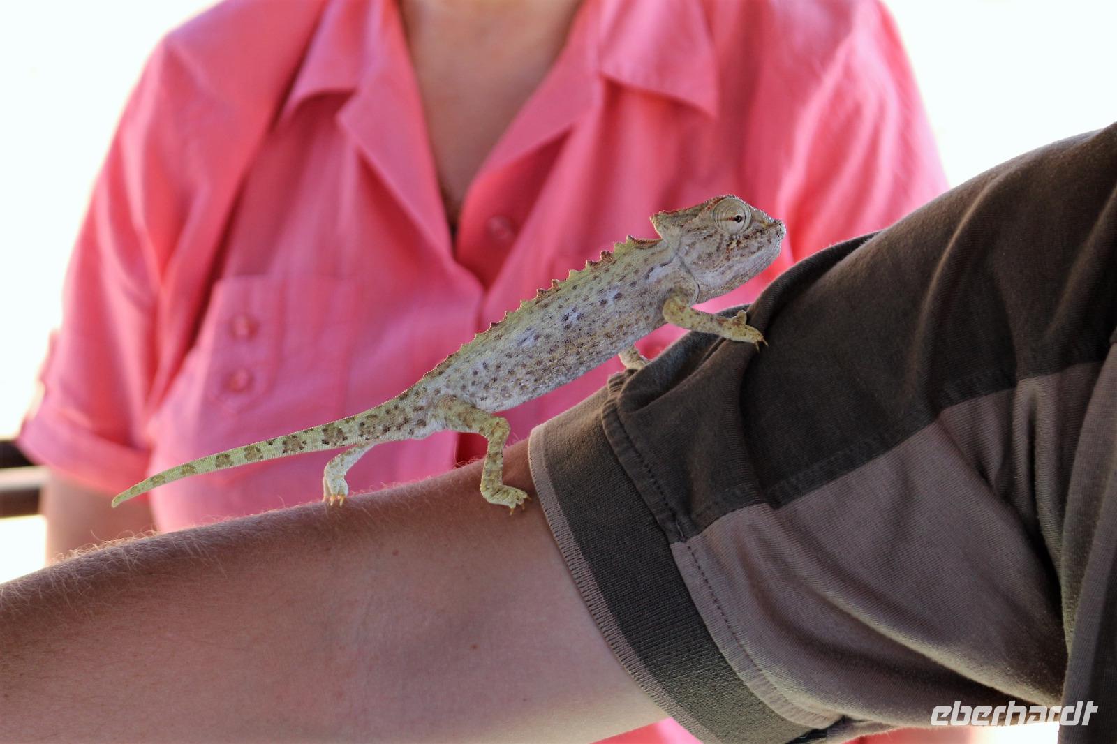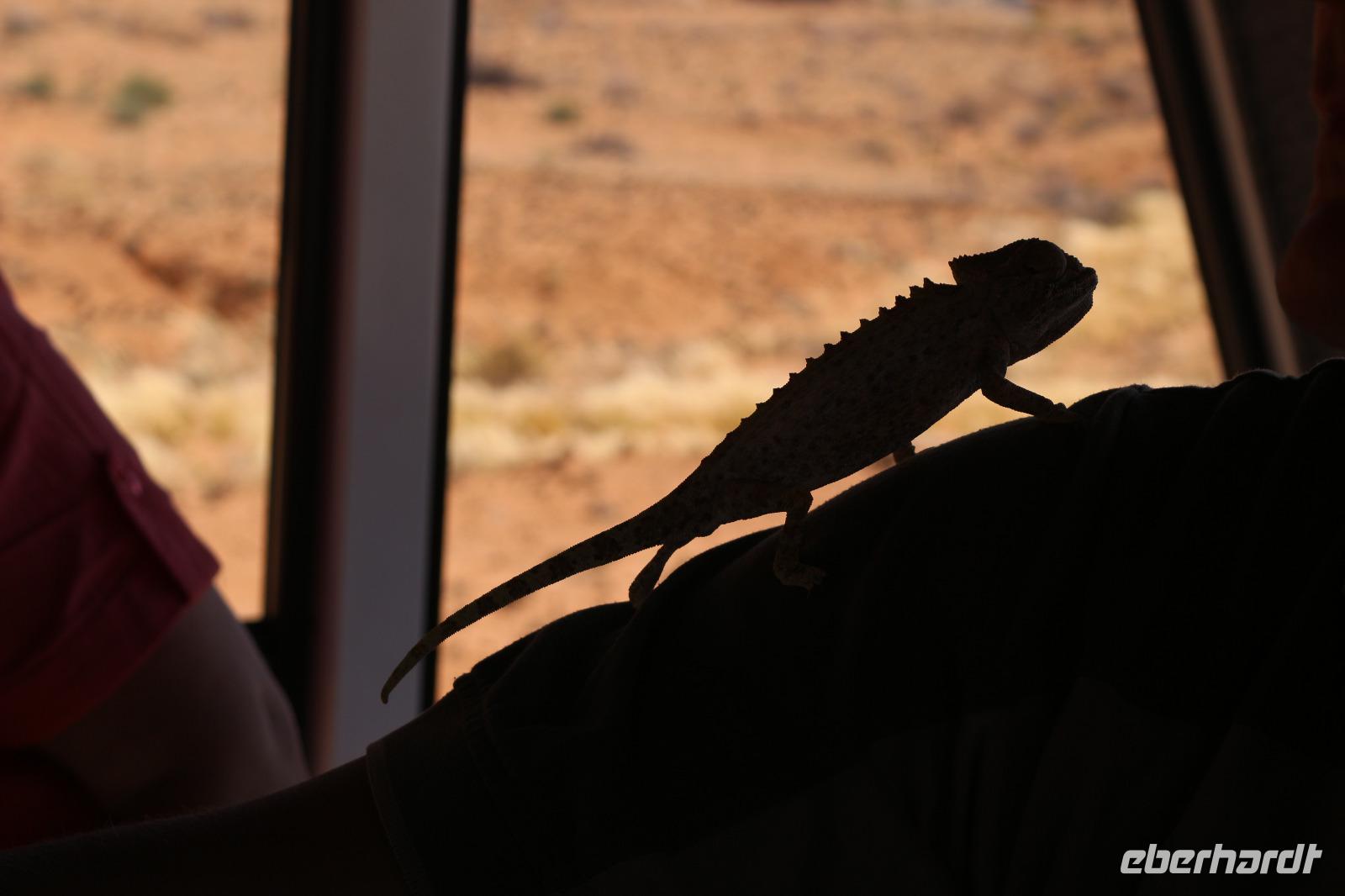 Heute lag ein langer Fahrttag mit vielen Kilometern vor uns. Doch zuvor stärkten wir uns am äußerst reichhaltigen Frühstücksbuffet des Hotels. Zur gewohnten Zeit verließen wir unser Hotel und damit auch die Stadt Lüderitz. Unterwegs sahen wir recht viele der wilden Pferde, welche nur noch sehr selten anzutreffen sind und aller Voraussicht nach in wenigen Jahren ausgestorben sein werden. Außerdem zeigte sich uns auf einer Farm ein Exemplar des nur äußerst selten vorkommenden Goldenen Orxy, welcher besonders wertvoll und deswegen auch entsprechend preisintensiv zu erwerben ist. Gegen Mittag kamen wir in dem doch sehr überschaubaren Ort Helmeringhausen an, welcher aus einer Tankstelle, einem Hotel und zwei weiteren Häusern besteht. Jedoch hat dieser Ort den wohl besten Apfelkuchen Namibias zu bieten, wovon wir uns aber natürlich selbst überzeugen wollten. Im sehr gemütlichen Garten des Hotels ließen wir uns diesen Kuchen schmecken und waren tatsächlich äußerst angetan. Im Anschluss setzten wir unsere Fahrt in Richtung Norden fort. Unterwegs begegnete uns auf der Straße ein Chamäleon, welches unser Reiseleiter uns genau zeigte. Nach anfänglichen Startschwierigkeiten fühlte sich das Tier auch sichtlich wohl bei uns, jedoch mussten wir es schließlich doch dalassen. Weiterhin entdeckte unser Reiseleiter Henner eine schwarze Spuckkobra mitten auf der Straße, jedoch war diese bereits tot.