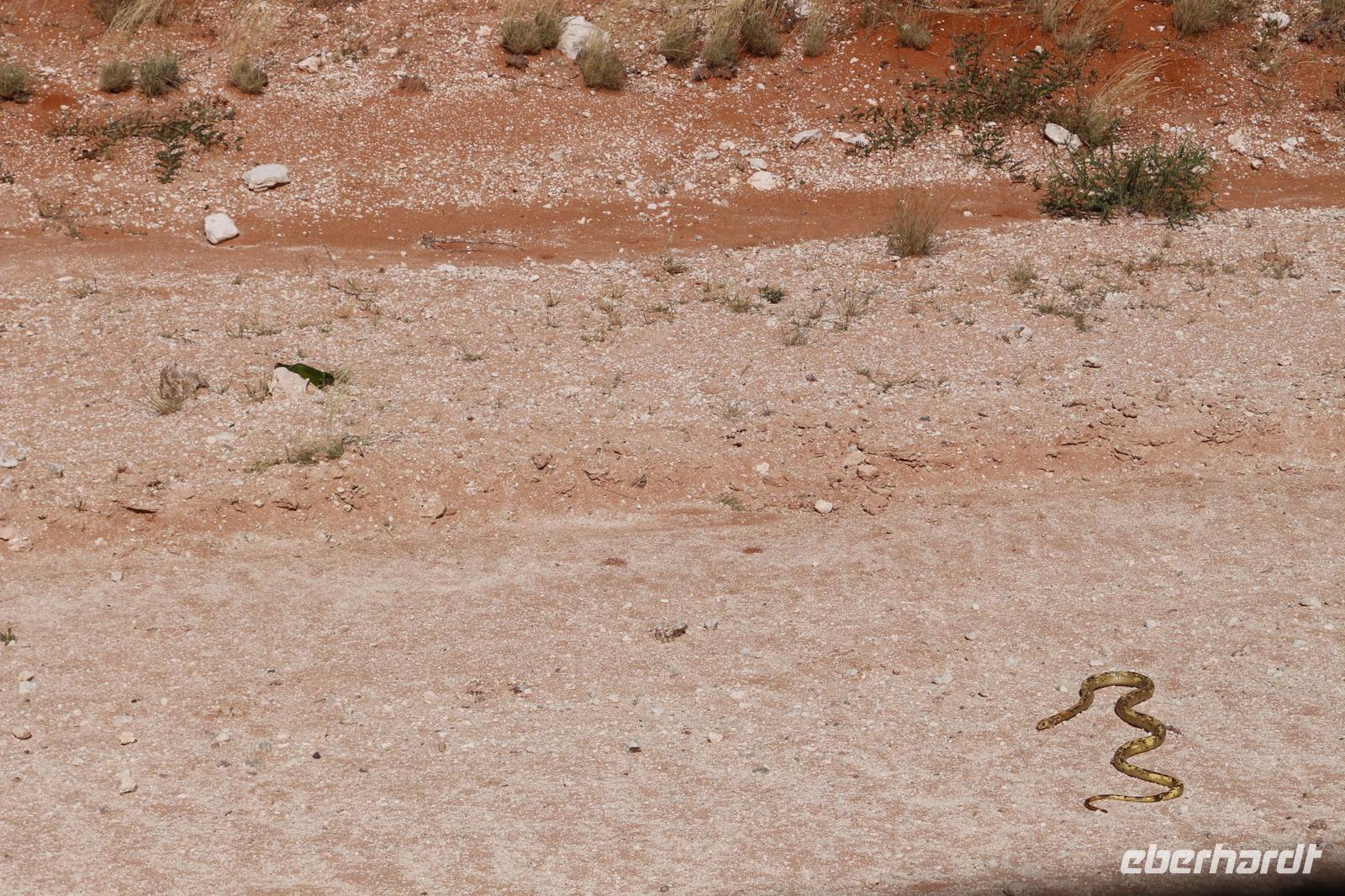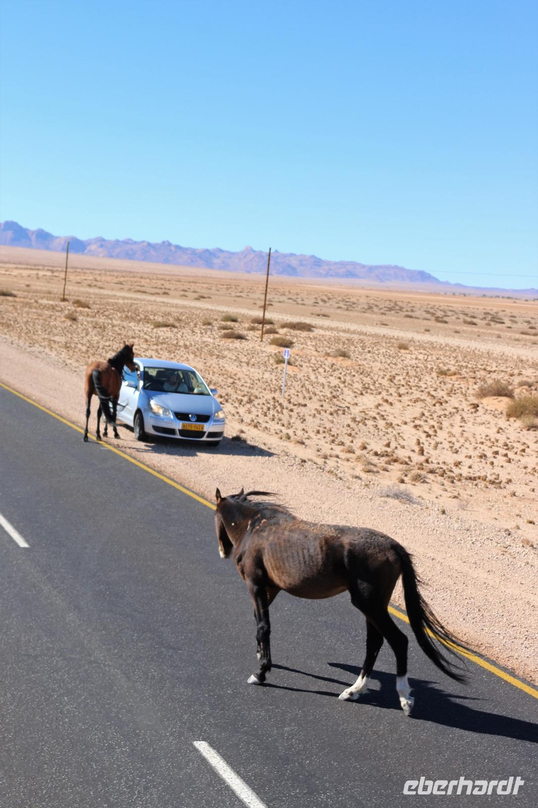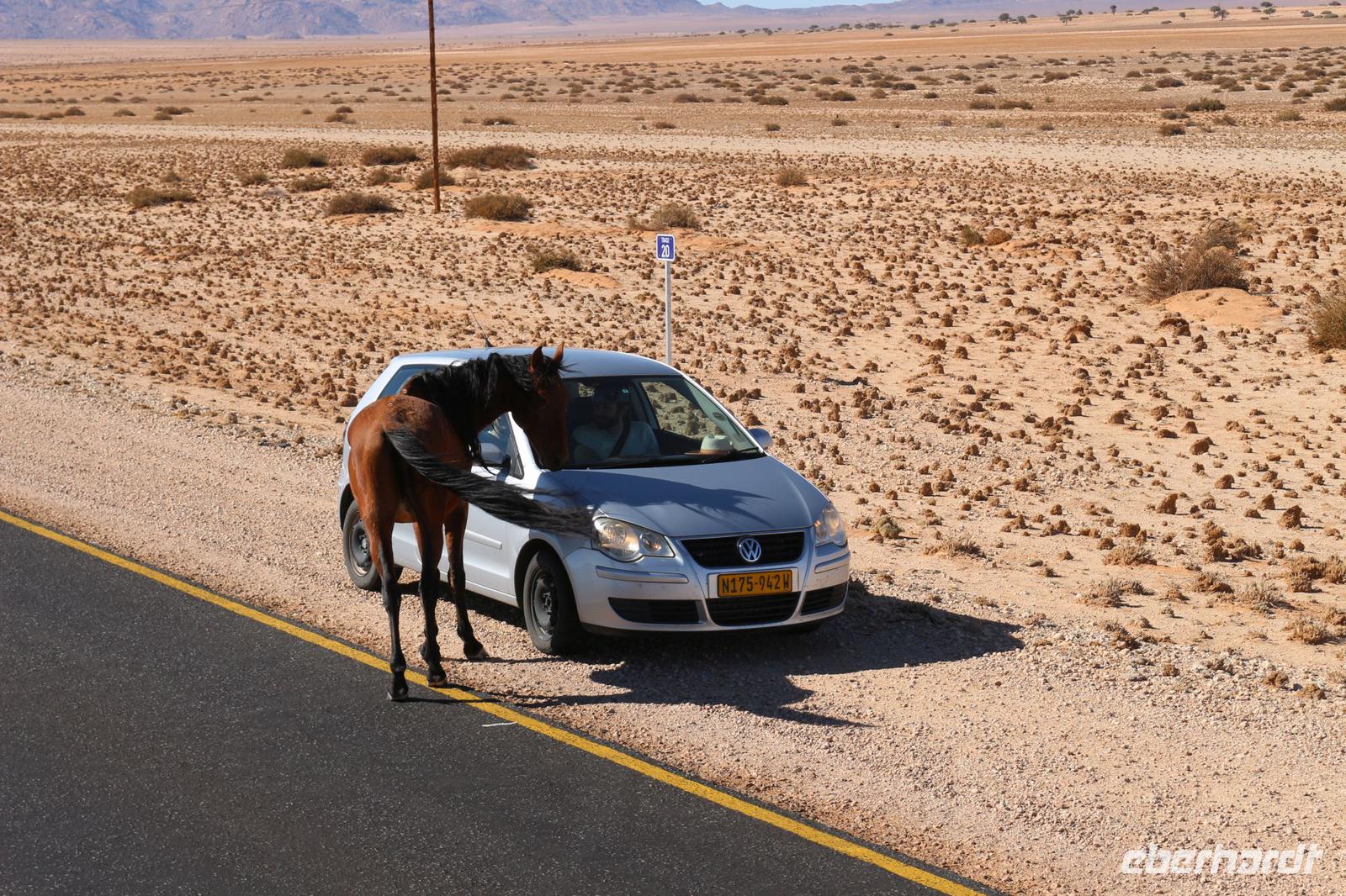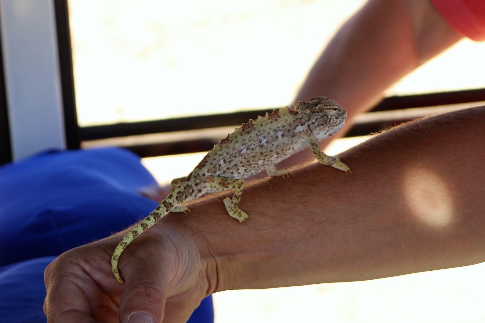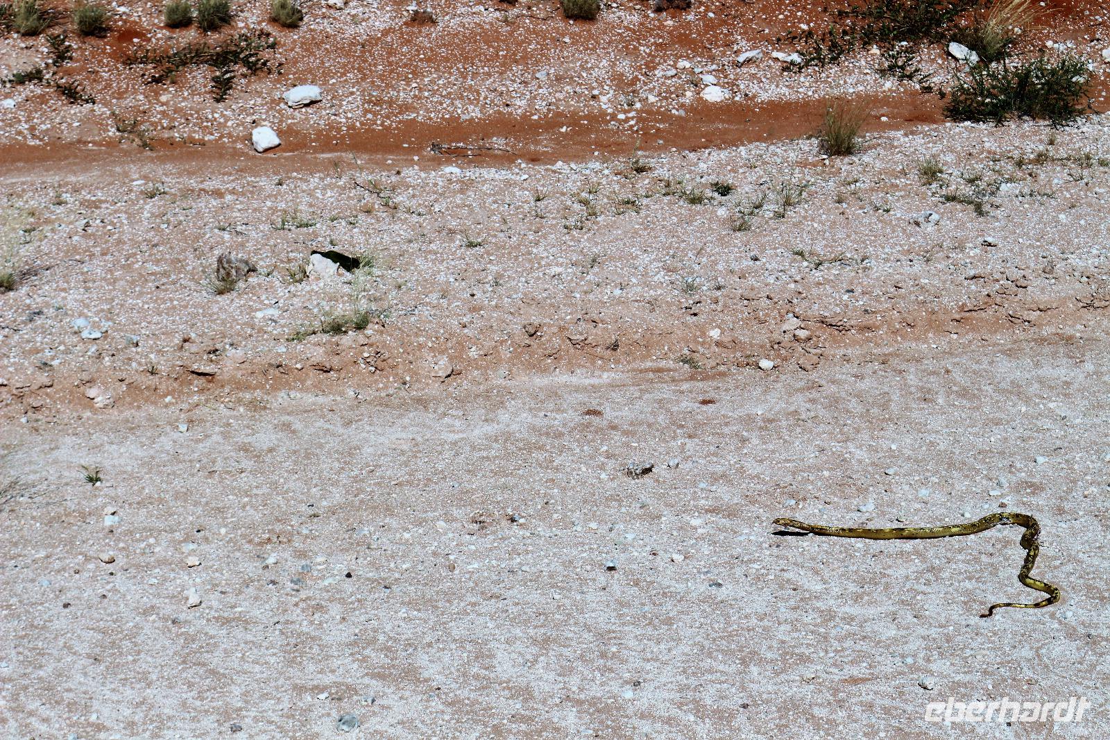 Heute lag ein langer Fahrttag mit vielen Kilometern vor uns. Doch zuvor stärkten wir uns am äußerst reichhaltigen Frühstücksbuffet des Hotels. Zur gewohnten Zeit verließen wir unser Hotel und damit auch die Stadt Lüderitz. Unterwegs sahen wir recht viele der wilden Pferde, welche nur noch sehr selten anzutreffen sind und aller Voraussicht nach in wenigen Jahren ausgestorben sein werden. Außerdem zeigte sich uns auf einer Farm ein Exemplar des nur äußerst selten vorkommenden Goldenen Orxy, welcher besonders wertvoll und deswegen auch entsprechend preisintensiv zu erwerben ist. Gegen Mittag kamen wir in dem doch sehr überschaubaren Ort Helmeringhausen an, welcher aus einer Tankstelle, einem Hotel und zwei weiteren Häusern besteht. Jedoch hat dieser Ort den wohl besten Apfelkuchen Namibias zu bieten, wovon wir uns aber natürlich selbst überzeugen wollten. Im sehr gemütlichen Garten des Hotels ließen wir uns diesen Kuchen schmecken und waren tatsächlich äußerst angetan. Im Anschluss setzten wir unsere Fahrt in Richtung Norden fort. Unterwegs begegnete uns auf der Straße ein Chamäleon, welches unser Reiseleiter uns genau zeigte. Nach anfänglichen Startschwierigkeiten fühlte sich das Tier auch sichtlich wohl bei uns, jedoch mussten wir es schließlich doch dalassen. Weiterhin entdeckte unser Reiseleiter Henner eine schwarze Spuckkobra mitten auf der Straße, jedoch war diese bereits tot.