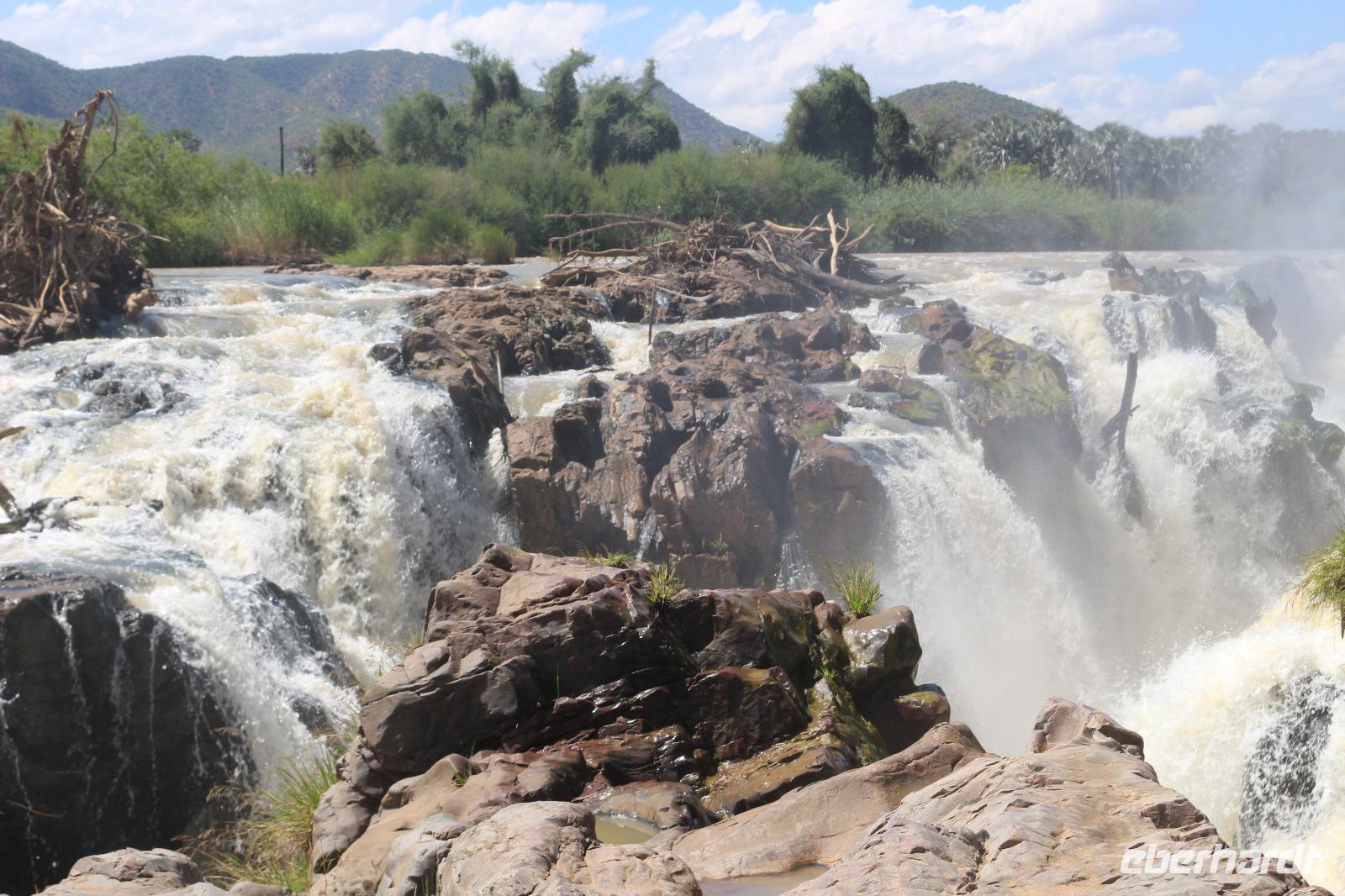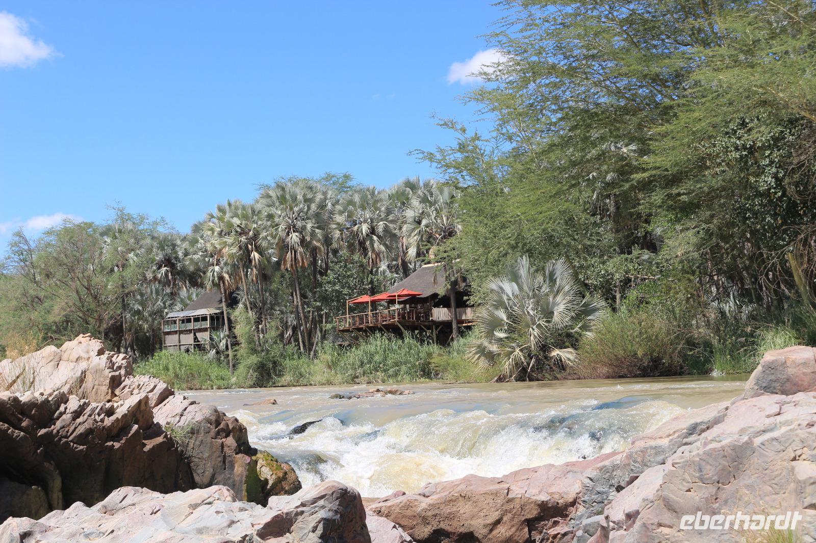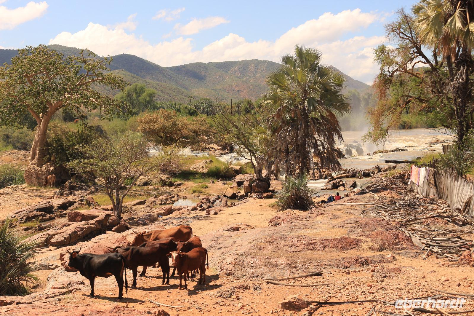Unsere weitere Fahrt führte uns immer weiter in Richtung Norden, über sehr unwegsames Gelände. Gegen Mittag erreichten wir schließlich die Epupa Fälle. Wir klettern ein wenig hinab, um diese besser fotografieren zu können. Dabei war ein kleiner Fluss zu überqueren, was sich als gar nicht so einfach erwies und leider einer Kamera das Leben kostete. Jedoch lohnte sich der Weg, denn von weiter vorn konnten wir tolle Fotos machen und die einmalige Aussicht auf diese unvorstellbaren Gewalten genießen. Anschließend machten wir es uns an einem schattigen Plätzchen bequem und verzehrten unsere überaus reichlichen Lunchpakete, bevor wir den Heimweg antraten. Unterwegs besuchten wir ein zweites Himbadorf. Dies war nun jedoch kein Museum, sondern zeigte eine echte Himbafamilie, wie sie zusammen lebte. Der hiesige Chef hieß uns willkommen und so durften wir nähertreten und unsere Geschenke abgeben. Besonders werden uns dabei die leuchtenden Augen eines kleinen Jungen in Erinnerung bleiben, als er die mitgebrachten Bonbons entdeckte. Wir bekamen wieder einiges zum Leben innerhalb dieser Niederlassung erklärt und durften schließlich auch wieder fotografieren. Immer noch ganz begeistert von dieser nahezu unwirklich wirkenden Welt mussten wir das Dorf schließlich jedoch wieder verlassen, da noch ein weiter Fahrtweg vor uns lag. Es dauerte einige Zeit bis wir in die Nähe von Opuwo gelangten. Während das erste Fahrzeug mit namibischer Pünktlichkeit an der Lodge ankam, war für das zweite Fahrzeug das komplette Afrika-Programm angesagt. In namibischer Gelassenheit war unserem Bus der Sprit ausgegangen, sodass wir nun kurz vor Opuwo in der Wüste standen und auf unsere Rettung in Form eines Benzinkanisters warteten. Doch wir nahmen es gelassen, schließlich ist die afrikanische Mentalität nicht mit der deutschen zu vergleichen und in Afrika kann so etwas nun mal vorkommen. So kamen wir schließlich trotzdem noch rechtzeitig an unserer Lodge an und freuten uns nun sehr auf eine Dusche, um uns von dem Staub zu befreien, mit dem wir heute doch recht intensive Bekanntschaft gemacht haben. Wir genossen ein leckeres Abendessen und ließen den Abend schließlich bei noch angenehmen Temperaturen auf der Terrasse ausklingen.