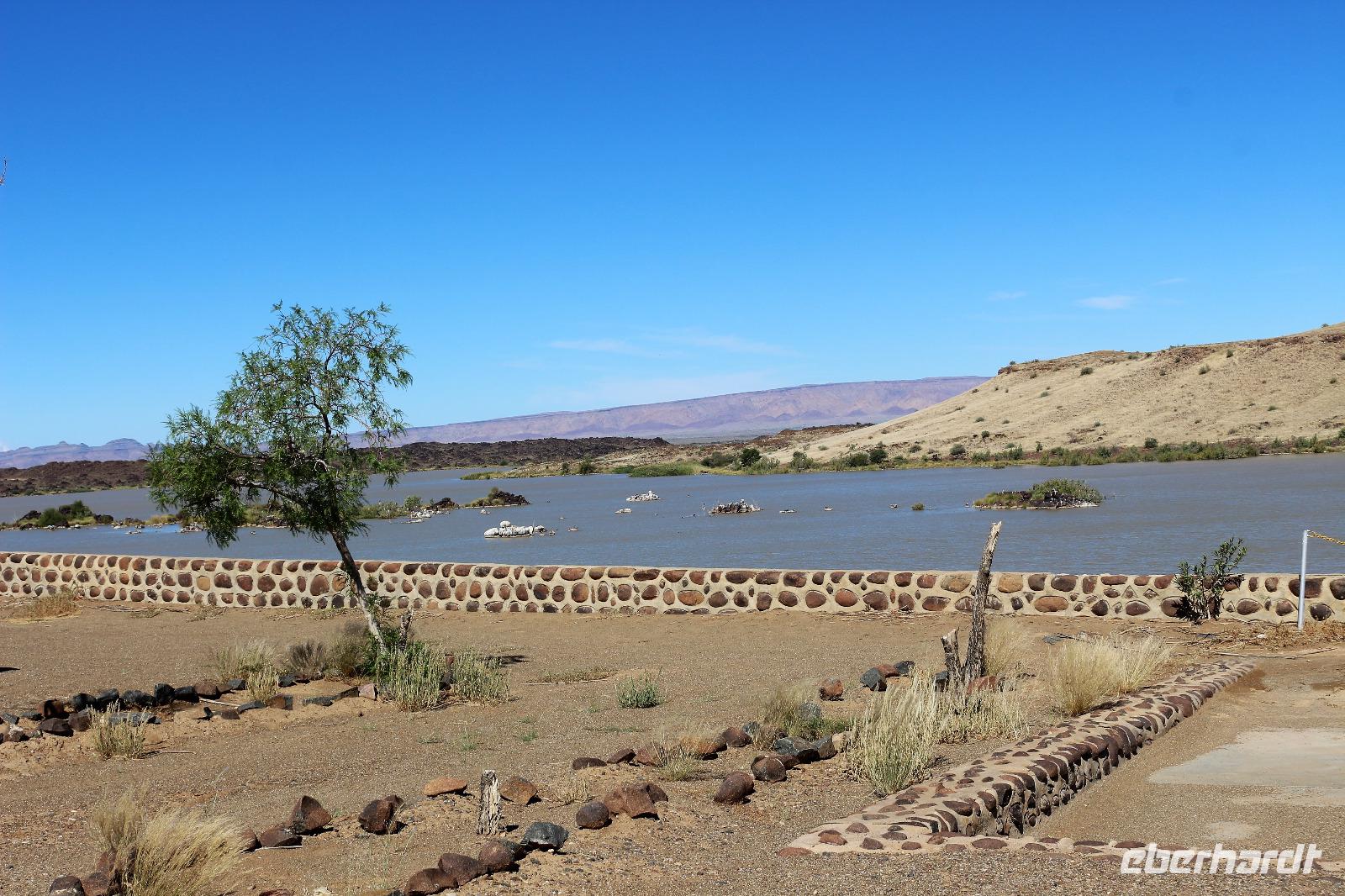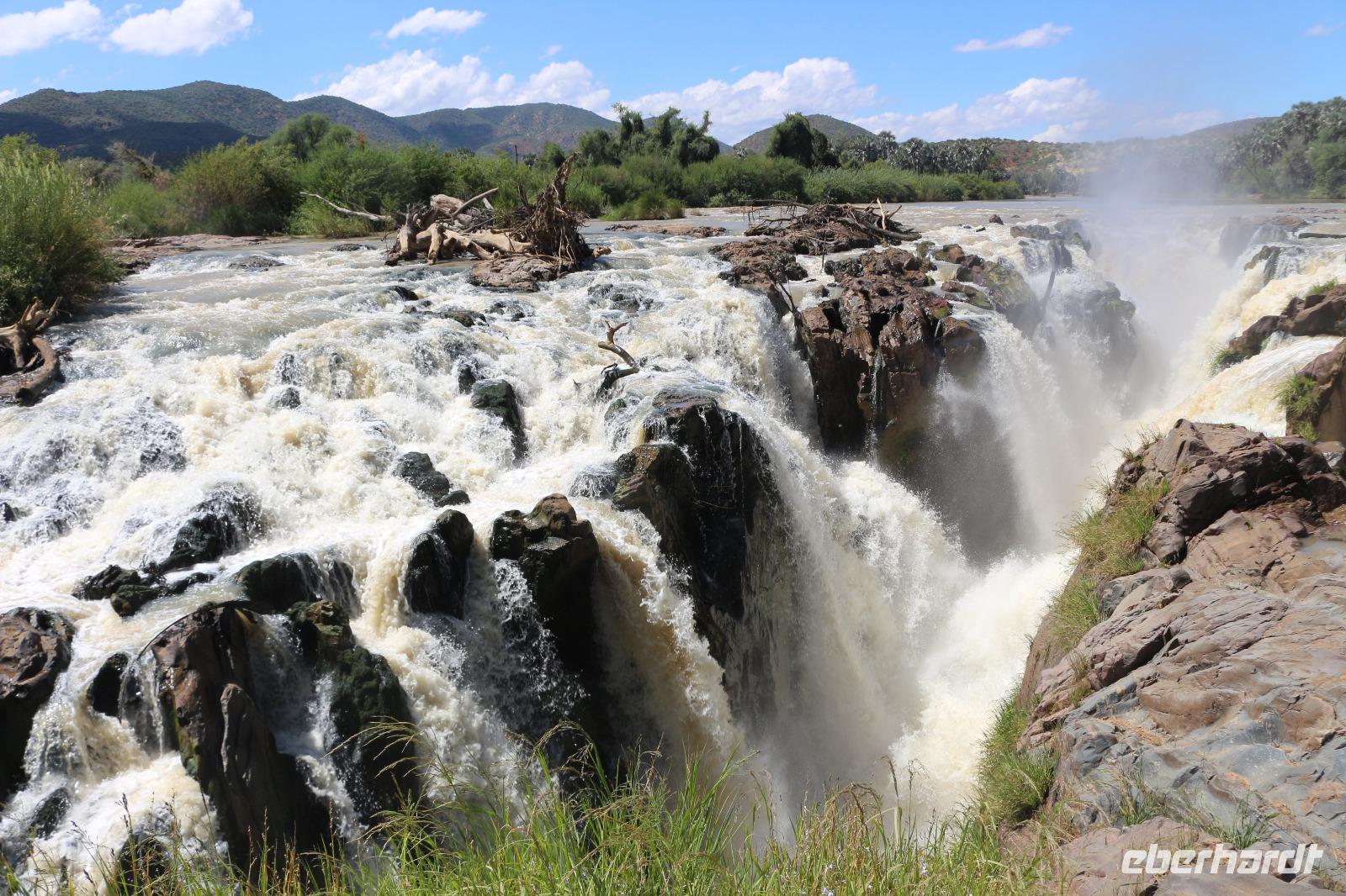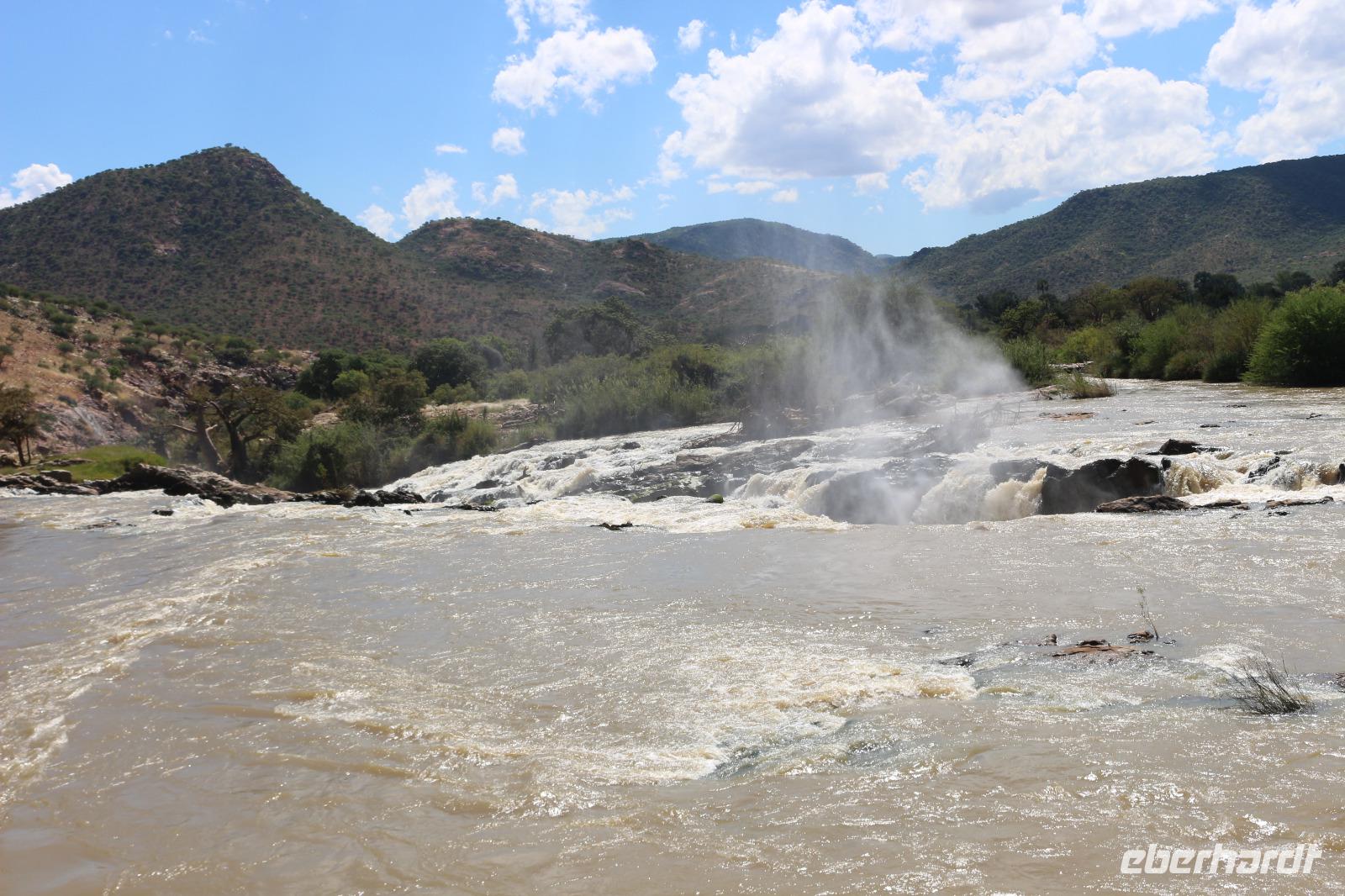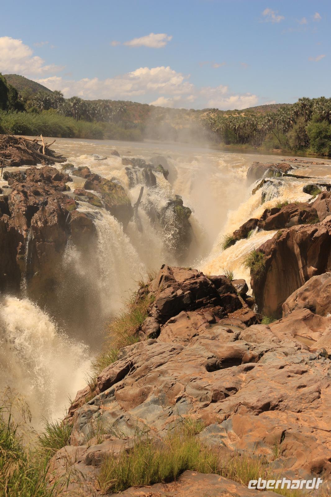 Unsere weitere Fahrt führte uns immer weiter in Richtung Norden, über sehr unwegsames Gelände. Gegen Mittag erreichten wir schließlich die Epupa Fälle. Wir klettern ein wenig hinab, um diese besser fotografieren zu können. Dabei war ein kleiner Fluss zu überqueren, was sich als gar nicht so einfach erwies und leider einer Kamera das Leben kostete. Jedoch lohnte sich der Weg, denn von weiter vorn konnten wir tolle Fotos machen und die einmalige Aussicht auf diese unvorstellbaren Gewalten genießen. Anschließend machten wir es uns an einem schattigen Plätzchen bequem und verzehrten unsere überaus reichlichen Lunchpakete, bevor wir den Heimweg antraten. Unterwegs besuchten wir ein zweites Himbadorf. Dies war nun jedoch kein Museum, sondern zeigte eine echte Himbafamilie, wie sie zusammen lebte. Der hiesige Chef hieß uns willkommen und so durften wir nähertreten und unsere Geschenke abgeben. Besonders werden uns dabei die leuchtenden Augen eines kleinen Jungen in Erinnerung bleiben, als er die mitgebrachten Bonbons entdeckte. Wir bekamen wieder einiges zum Leben innerhalb dieser Niederlassung erklärt und durften schließlich auch wieder fotografieren. Immer noch ganz begeistert von dieser nahezu unwirklich wirkenden Welt mussten wir das Dorf schließlich jedoch wieder verlassen, da noch ein weiter Fahrtweg vor uns lag. Es dauerte einige Zeit bis wir in die Nähe von Opuwo gelangten. Während das erste Fahrzeug mit namibischer Pünktlichkeit an der Lodge ankam, war für das zweite Fahrzeug das komplette Afrika-Programm angesagt. In namibischer Gelassenheit war unserem Bus der Sprit ausgegangen, sodass wir nun kurz vor Opuwo in der Wüste standen und auf unsere Rettung in Form eines Benzinkanisters warteten. Doch wir nahmen es gelassen, schließlich ist die afrikanische Mentalität nicht mit der deutschen zu vergleichen und in Afrika kann so etwas nun mal vorkommen. So kamen wir schließlich trotzdem noch rechtzeitig an unserer Lodge an und freuten uns nun sehr auf eine Dusche, um uns von dem Staub zu befreien, mit dem wir heute doch recht intensive Bekanntschaft gemacht haben. Wir genossen ein leckeres Abendessen und ließen den Abend schließlich bei noch angenehmen Temperaturen auf der Terrasse ausklingen.
