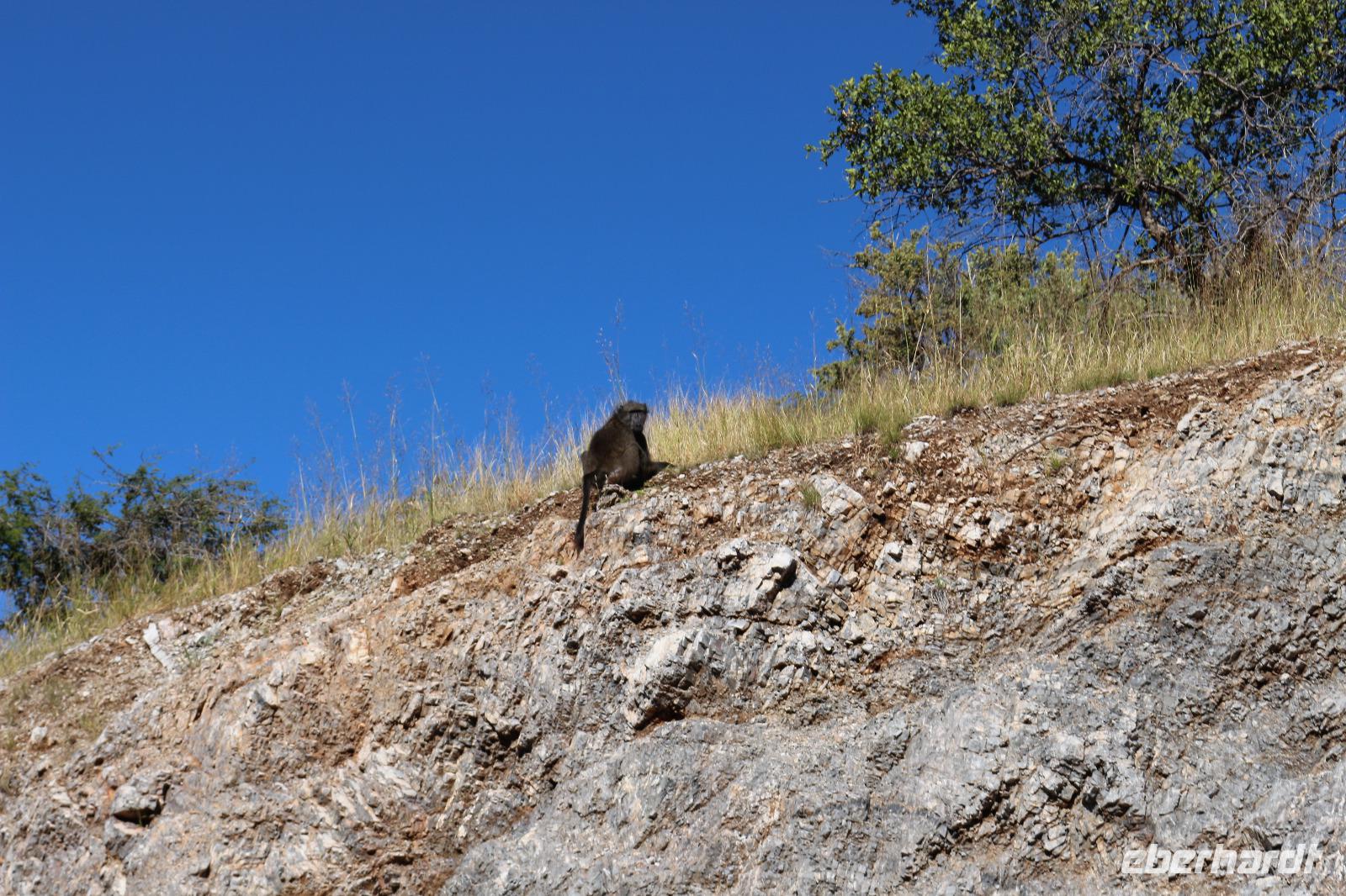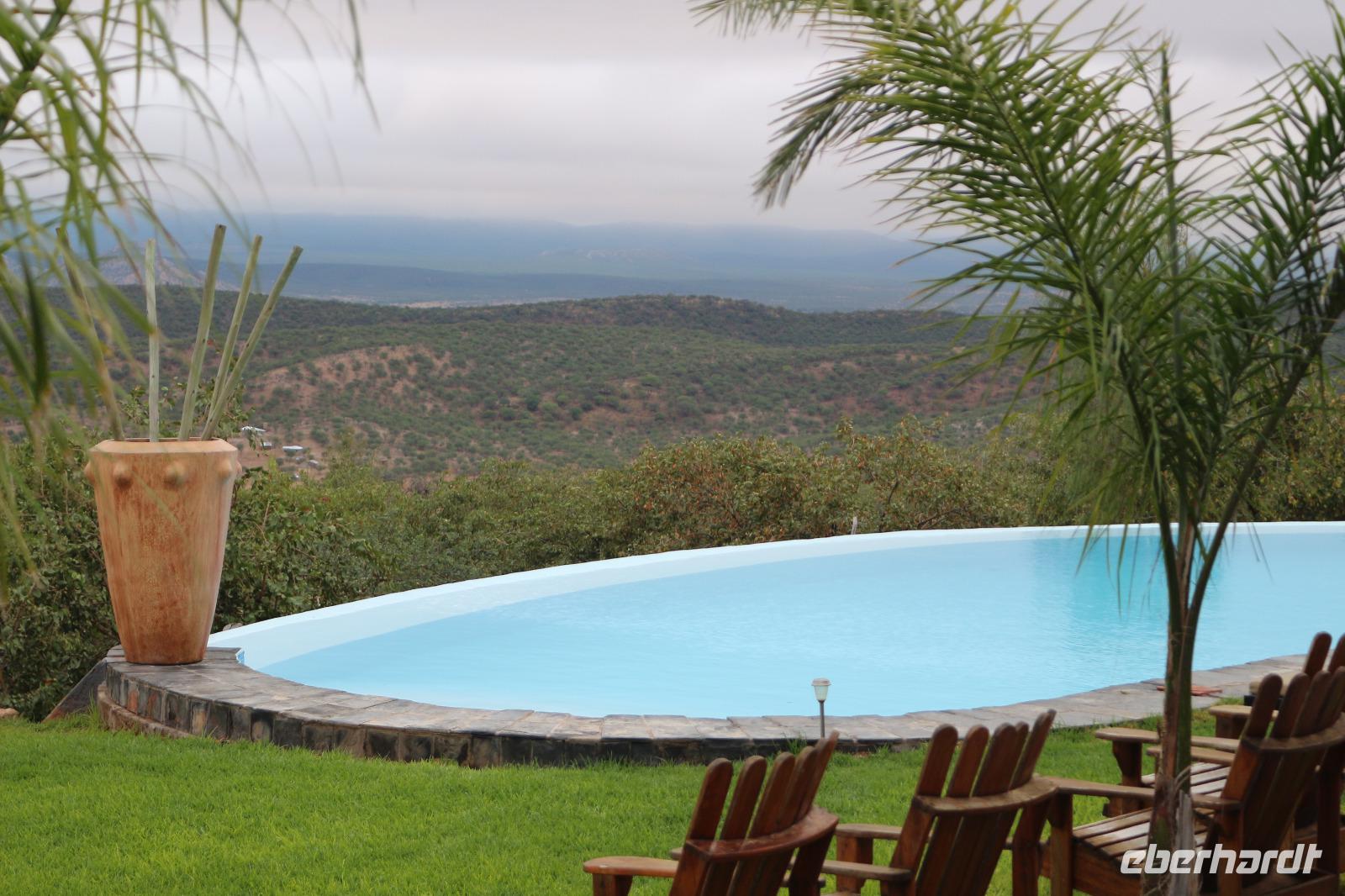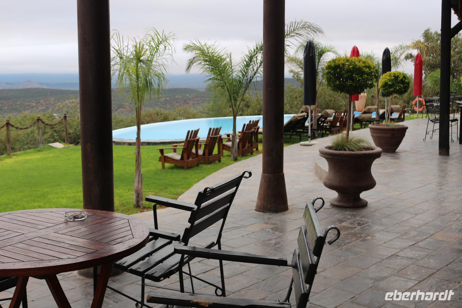 Viele waren heute schon vor dem Frühstück auf den Beinen und waren schon im Pool schwimmen oder begutachteten die individuellen Vorgärten der Häuschen, in welchen Gemüse angebaut war. Dabei entdeckten wir auch einen Papaya-Baum, nicht zu verwechseln mit dem etwas anders aussehenden Mangobaum. Gut gestärkt begannen wir unsere heutige Fahrt. Diese führte uns in Richtung Norden, zunächst weiter durch das Damaraland bis hin in das Himbaland, welches unser heutiges Ziel sein sollte. Die ersten Kilometer bis Kamanjab fuhren wir auf den uns schon bekannten Schotterstraßen, ab da sollte es jedoch ausschließlich auf geteerten Straßen weitergehen. Unterwegs unternahmen wir ein schönes und gemütliches Picknick am Straßenrand und genossen wieder einmal unseren leckeren Salat und belegte Brote. Dabei bekamen wir Besuch von einer Ziege, welche jedoch wenig Interesse an unserem Gemüse zeigte. Auf unserer Weiterfahrt entdeckten wir sowohl Zebras als auch Giraffen, welche wir fotografierten. Auch den einen oder anderen Blick in den Etosha Nationalpark konnten wir schon erhaschen, da wir ein Stück entlang der westlichen Parkbegrenzung fuhren. Je weiter wir nach Norden kamen, desto häufiger zeigten sich uns die kleinen und einfachen Behausungen der hiesigen Ureinwohner und auch die Himbas selbst konnte man des öfteren am Straßenrand entdecken. Als wir schließlich den Ort Opuwo erreichten, kam es uns vor, als wären wir in einer anderen Welt angekommen. Hier erlebten wir das pure Afrika. Wir besuchten einen örtlichen Supermarkt, um Gastgeschenke für die Himbas zu besorgen, die wir morgen besuchen wollten. Henner zeigte uns, welche Lebensmittel dafür besonders geeignet waren. Doch besonders interessant war es hierbei, die anderen Menschen zu beobachten. Traditionell bekleidete Himbas, Hererofrauen und auch Angoler waren hier unterwegs und tätigten ihre Einkäufe. Dabei herrschte ein ganz anderer Geräuschpegel vor als wir diesen kennen. Auch auf dem Parkplatz vor dem Supermarkt herrschte ein reges Treiben und jeder wollte uns seinen selbst hergestellten Schmuck verkaufen. Nachdem wir alle wieder im Bus angekommen waren, fuhren wir direkt zu unserer schönen Lodge, welche sich auf einem Berg befand und uns fantastische Ausblicke auf das Kaokoland bot. Diese erreichten wir heute bereits am frühen Nachmittag. Nachdem wir unsere schönen Zimmer bezogen hatten, zog es die meisten nach und nach auf die wunderschöne Terrasse, von wo aus man den Blick ins Tal bei einem kühlen Getränk genießen konnte. Einen Besuch war auch der große und überaus saubere Überlauf-Pool wert, welcher zum Schwimmen einlud. Nach diesem ruhigen und entspannten Nachmittag trafen wir uns schließlich im Restaurant wieder, um gemeinsam ein leckeres Abendessen zu genießen und diesen Tag damit ausklingen zu lassen.