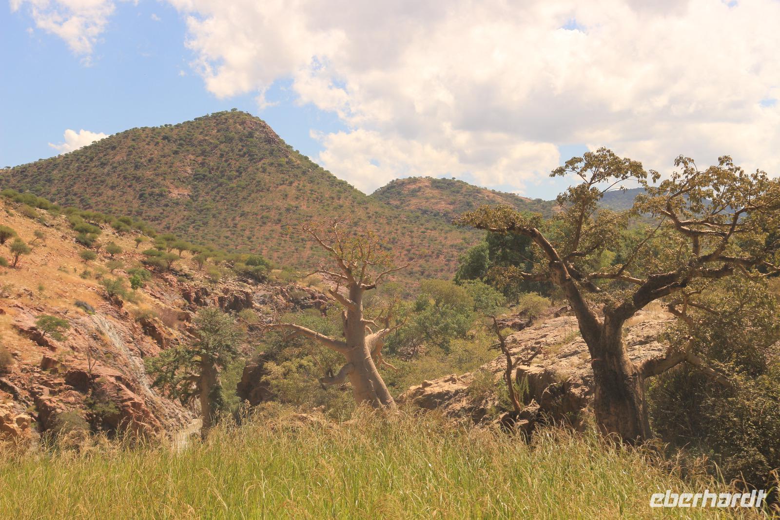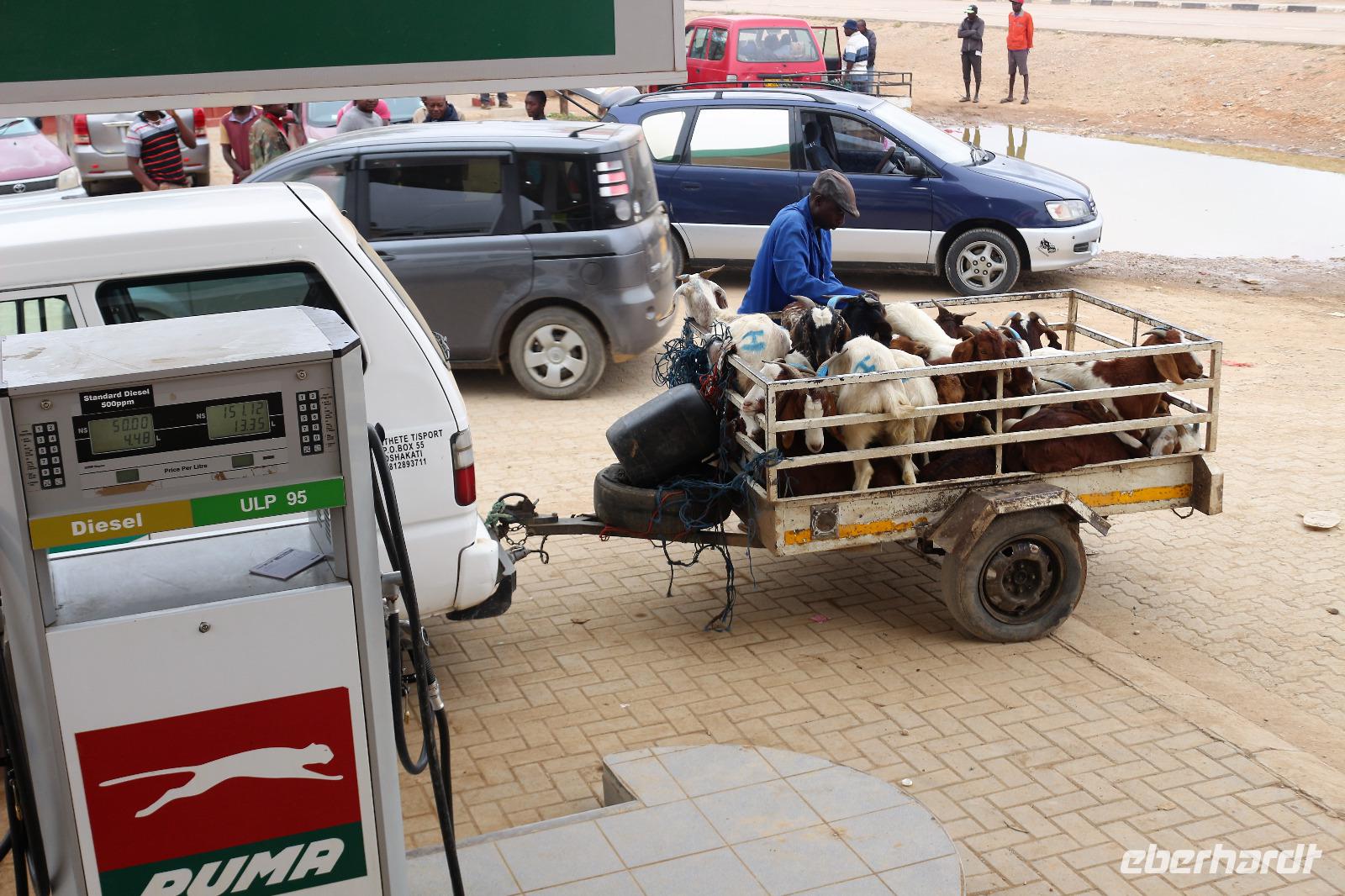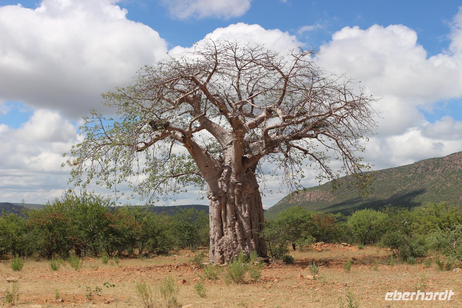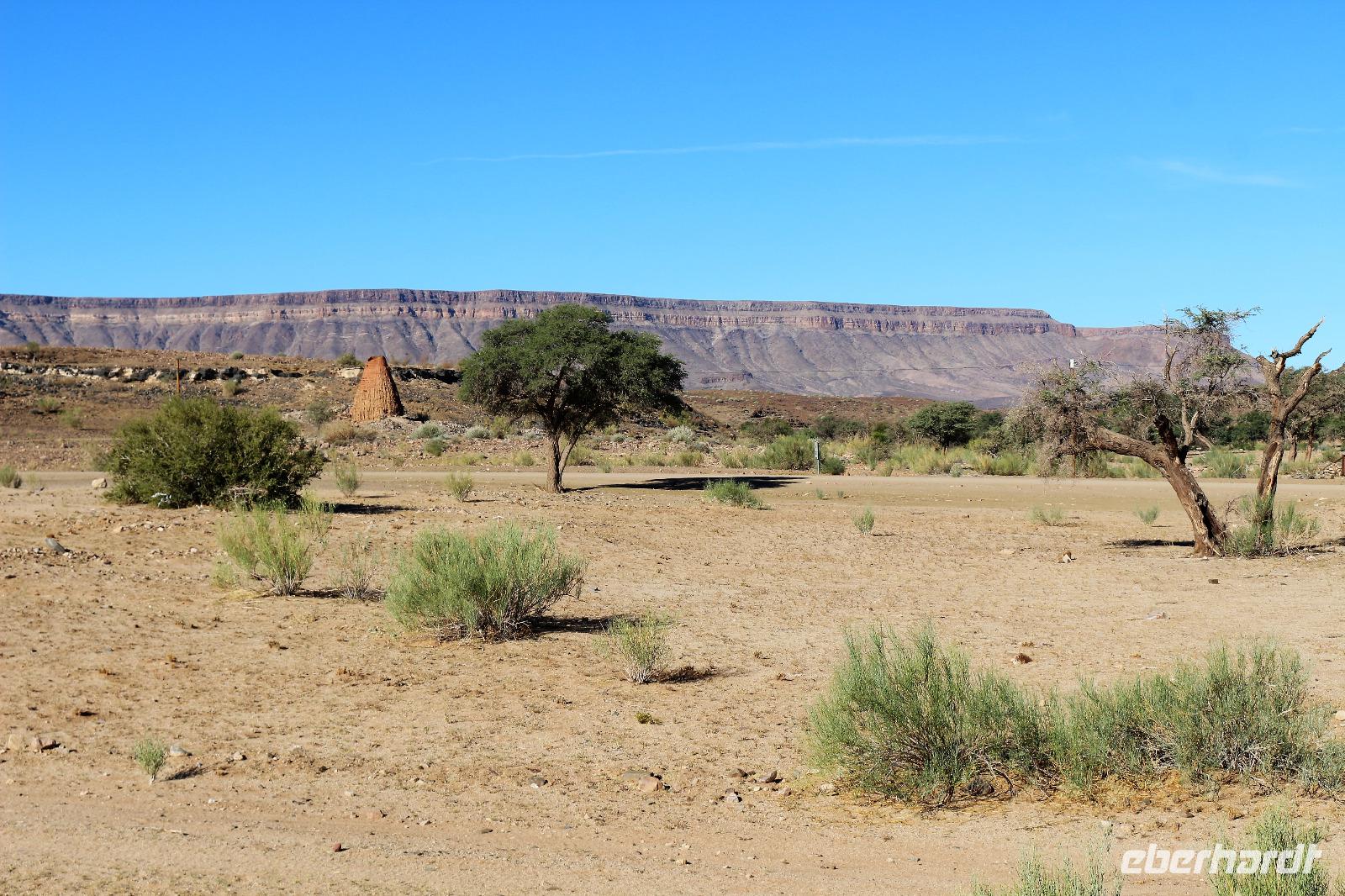 Viele waren heute schon vor dem Frühstück auf den Beinen und waren schon im Pool schwimmen oder begutachteten die individuellen Vorgärten der Häuschen, in welchen Gemüse angebaut war. Dabei entdeckten wir auch einen Papaya-Baum, nicht zu verwechseln mit dem etwas anders aussehenden Mangobaum. Gut gestärkt begannen wir unsere heutige Fahrt. Diese führte uns in Richtung Norden, zunächst weiter durch das Damaraland bis hin in das Himbaland, welches unser heutiges Ziel sein sollte. Die ersten Kilometer bis Kamanjab fuhren wir auf den uns schon bekannten Schotterstraßen, ab da sollte es jedoch ausschließlich auf geteerten Straßen weitergehen. Unterwegs unternahmen wir ein schönes und gemütliches Picknick am Straßenrand und genossen wieder einmal unseren leckeren Salat und belegte Brote. Dabei bekamen wir Besuch von einer Ziege, welche jedoch wenig Interesse an unserem Gemüse zeigte. Auf unserer Weiterfahrt entdeckten wir sowohl Zebras als auch Giraffen, welche wir fotografierten. Auch den einen oder anderen Blick in den Etosha Nationalpark konnten wir schon erhaschen, da wir ein Stück entlang der westlichen Parkbegrenzung fuhren. Je weiter wir nach Norden kamen, desto häufiger zeigten sich uns die kleinen und einfachen Behausungen der hiesigen Ureinwohner und auch die Himbas selbst konnte man des öfteren am Straßenrand entdecken. Als wir schließlich den Ort Opuwo erreichten, kam es uns vor, als wären wir in einer anderen Welt angekommen. Hier erlebten wir das pure Afrika. Wir besuchten einen örtlichen Supermarkt, um Gastgeschenke für die Himbas zu besorgen, die wir morgen besuchen wollten. Henner zeigte uns, welche Lebensmittel dafür besonders geeignet waren. Doch besonders interessant war es hierbei, die anderen Menschen zu beobachten. Traditionell bekleidete Himbas, Hererofrauen und auch Angoler waren hier unterwegs und tätigten ihre Einkäufe. Dabei herrschte ein ganz anderer Geräuschpegel vor als wir diesen kennen. Auch auf dem Parkplatz vor dem Supermarkt herrschte ein reges Treiben und jeder wollte uns seinen selbst hergestellten Schmuck verkaufen. Nachdem wir alle wieder im Bus angekommen waren, fuhren wir direkt zu unserer schönen Lodge, welche sich auf einem Berg befand und uns fantastische Ausblicke auf das Kaokoland bot. Diese erreichten wir heute bereits am frühen Nachmittag. Nachdem wir unsere schönen Zimmer bezogen hatten, zog es die meisten nach und nach auf die wunderschöne Terrasse, von wo aus man den Blick ins Tal bei einem kühlen Getränk genießen konnte. Einen Besuch war auch der große und überaus saubere Überlauf-Pool wert, welcher zum Schwimmen einlud. Nach diesem ruhigen und entspannten Nachmittag trafen wir uns schließlich im Restaurant wieder, um gemeinsam ein leckeres Abendessen zu genießen und diesen Tag damit ausklingen zu lassen.