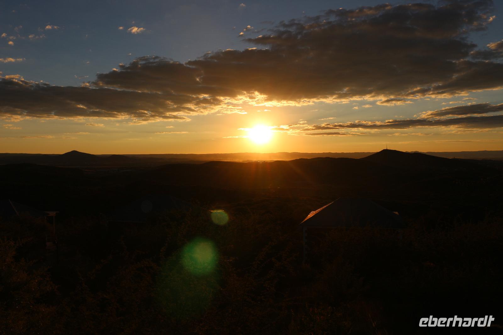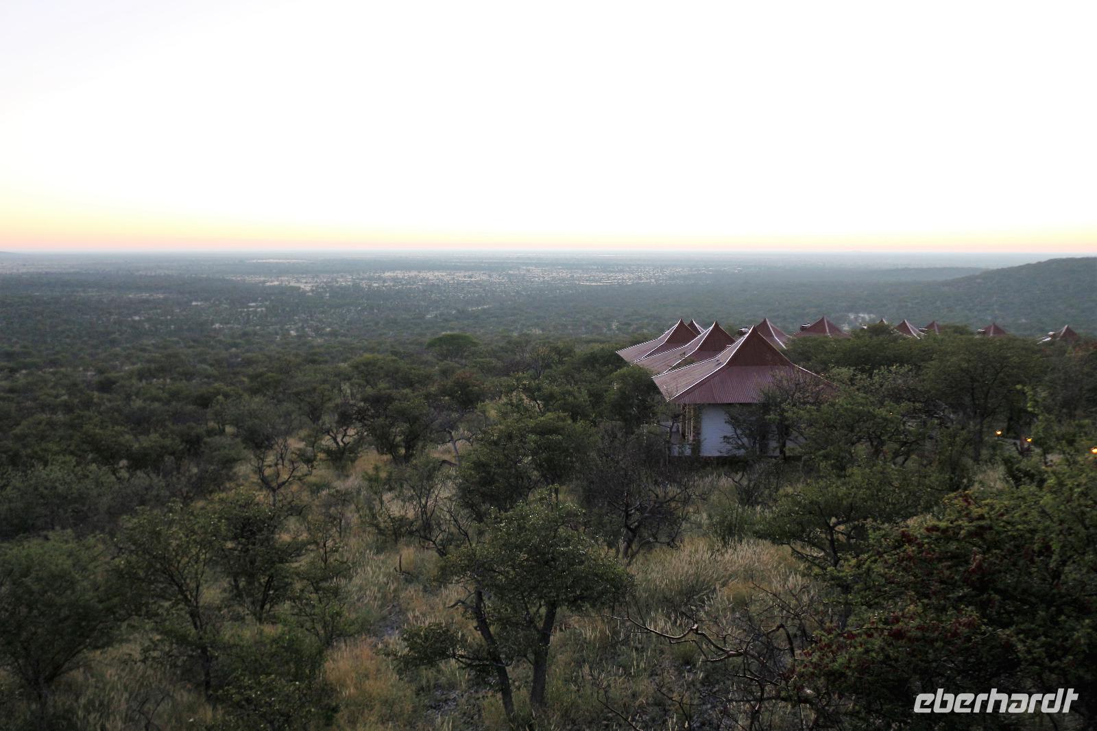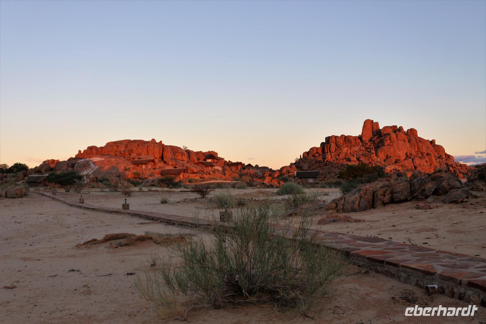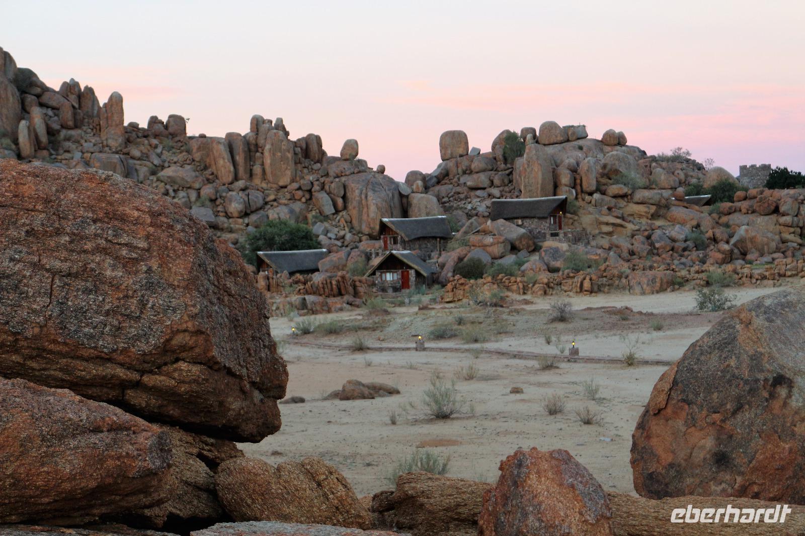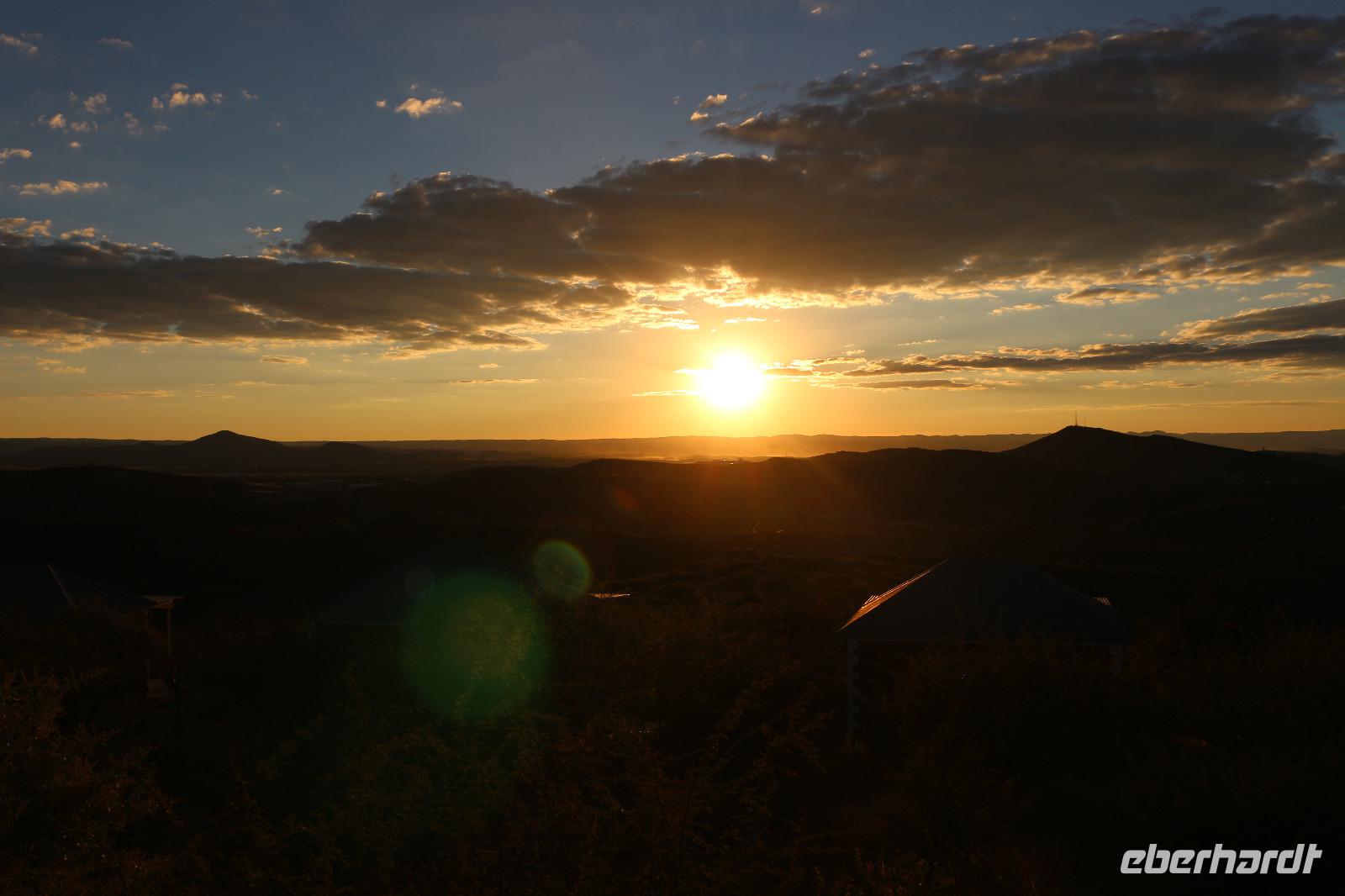 Anschließend ging es mit dem Bus weiter in Richtung unserer Lodge. Unterwegs konnten wir dabei noch den Sonnenuntergang sowie einen Regenbogen bestaunen. Schon im Dunkeln kamen wir schließlich an der Damara Mopane Lodge an. Nachdem wir unsere hübschen kleinen Häuschen bezogen hatten, trafen wir uns auch gleich schon zum gemeinsamen Abendessen. Da wir alle sehr müde und geschafft von diesem langen Tag waren, gingen wir schon recht früh zu Bett.