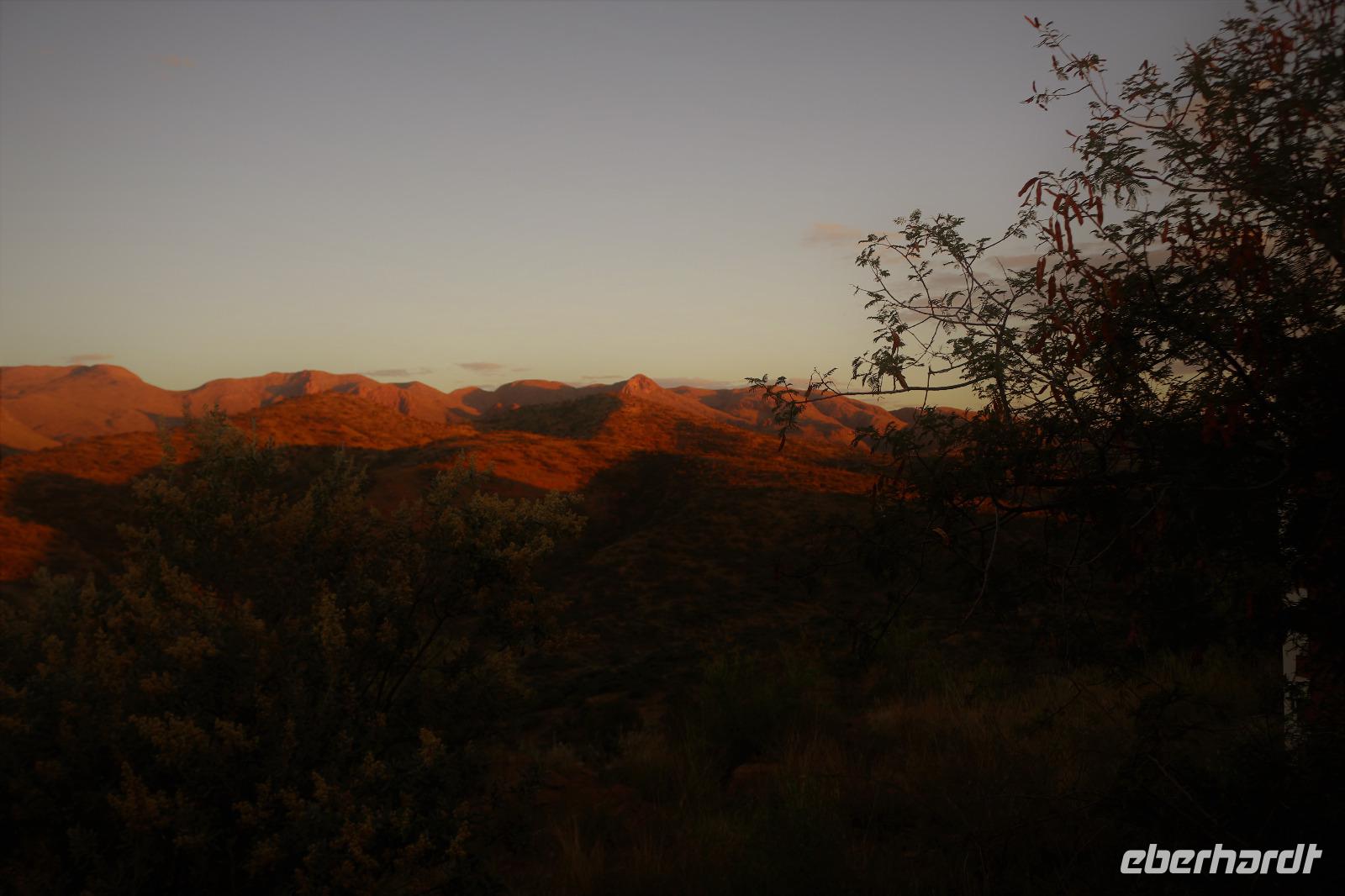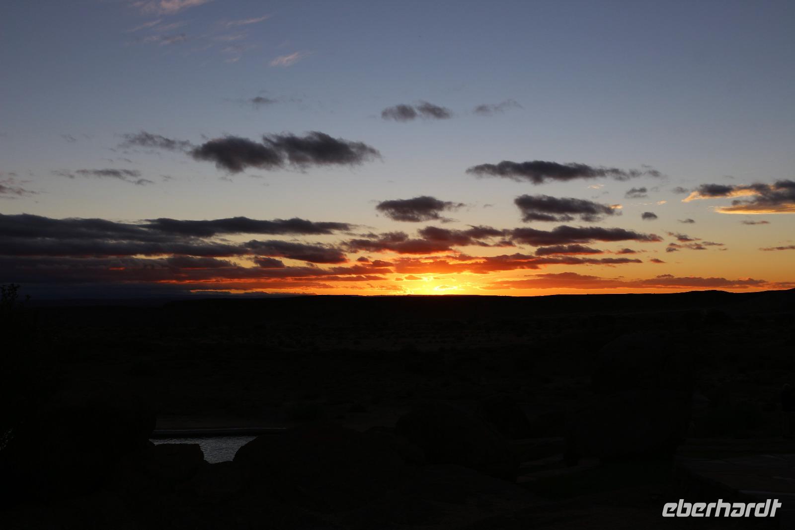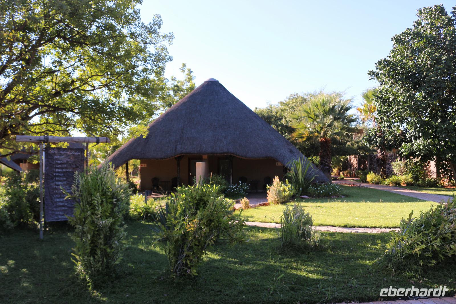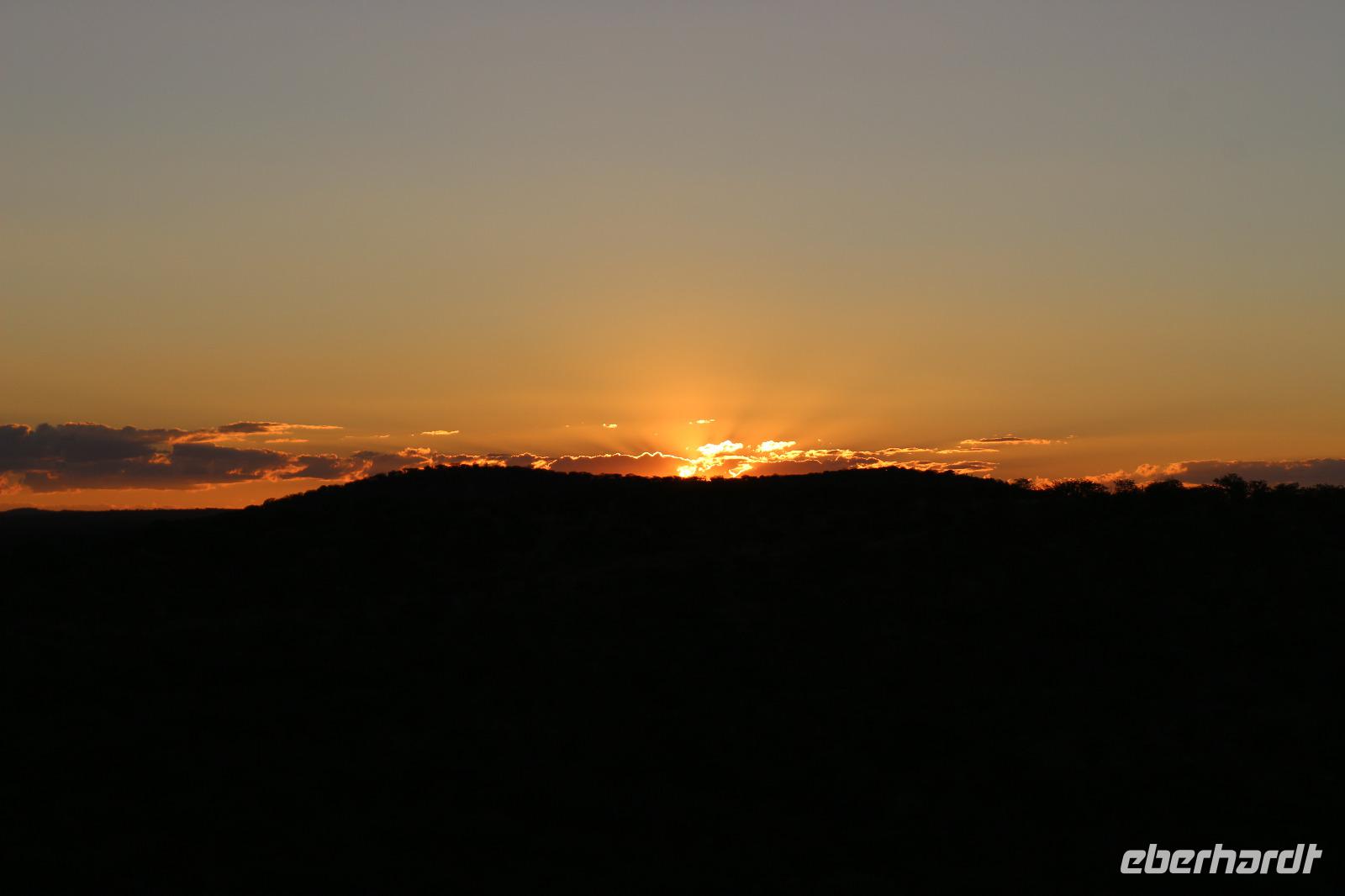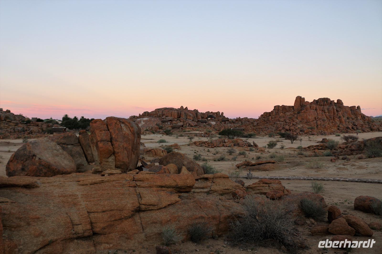 Anschließend ging es mit dem Bus weiter in Richtung unserer Lodge. Unterwegs konnten wir dabei noch den Sonnenuntergang sowie einen Regenbogen bestaunen. Schon im Dunkeln kamen wir schließlich an der Damara Mopane Lodge an. Nachdem wir unsere hübschen kleinen Häuschen bezogen hatten, trafen wir uns auch gleich schon zum gemeinsamen Abendessen. Da wir alle sehr müde und geschafft von diesem langen Tag waren, gingen wir schon recht früh zu Bett.
