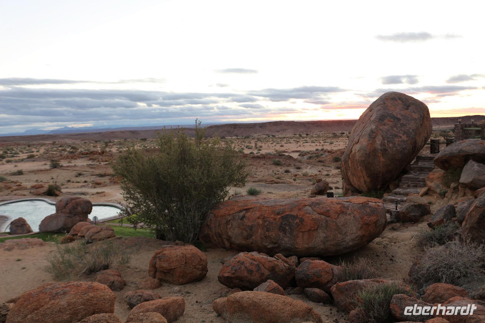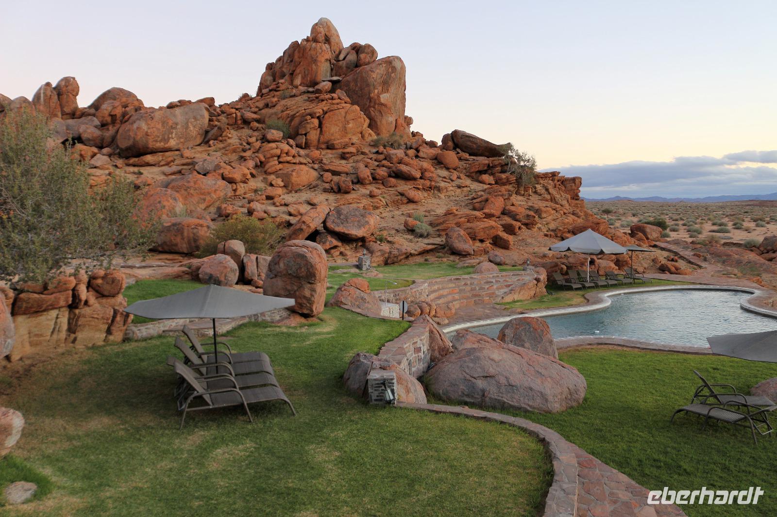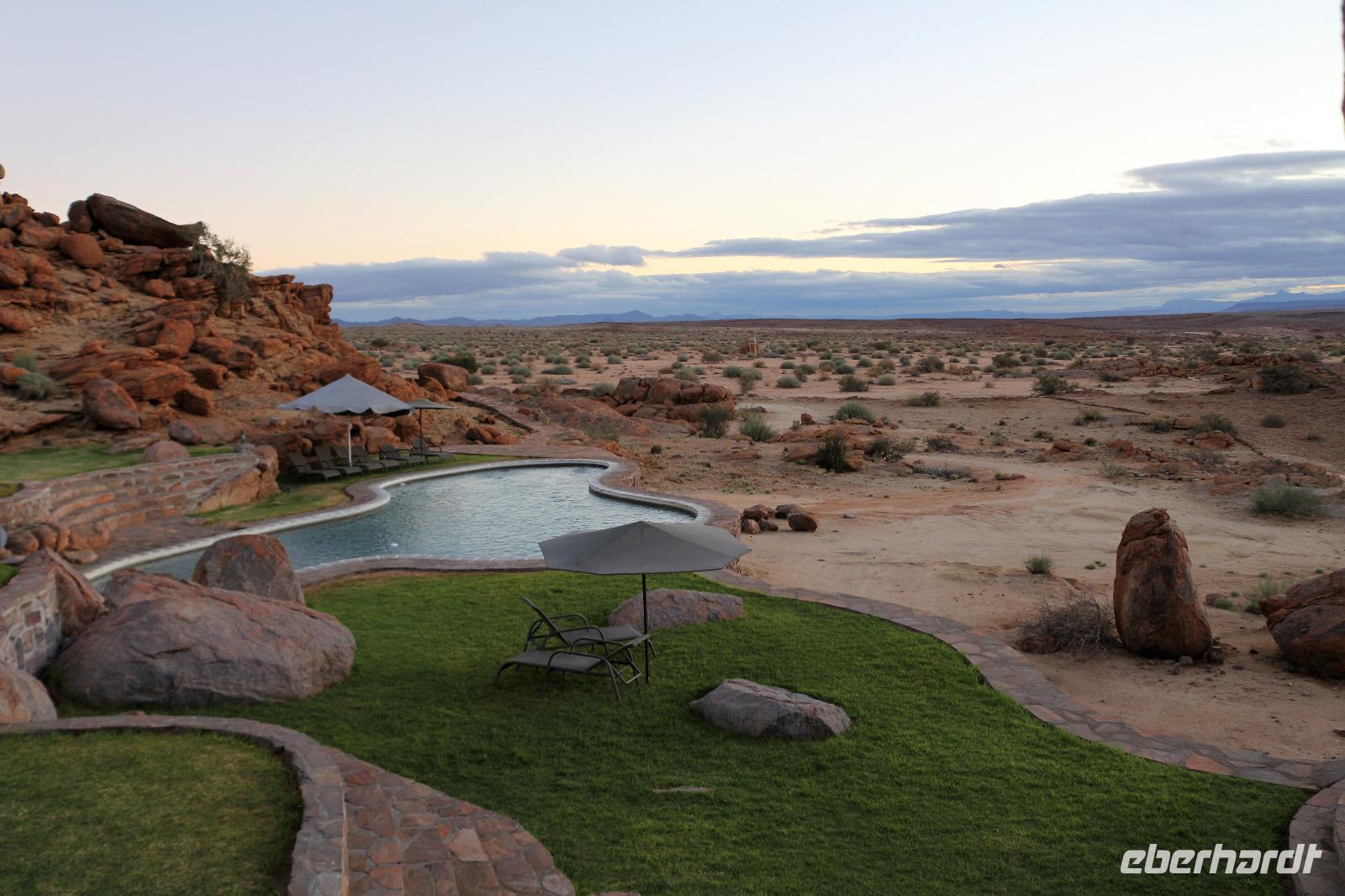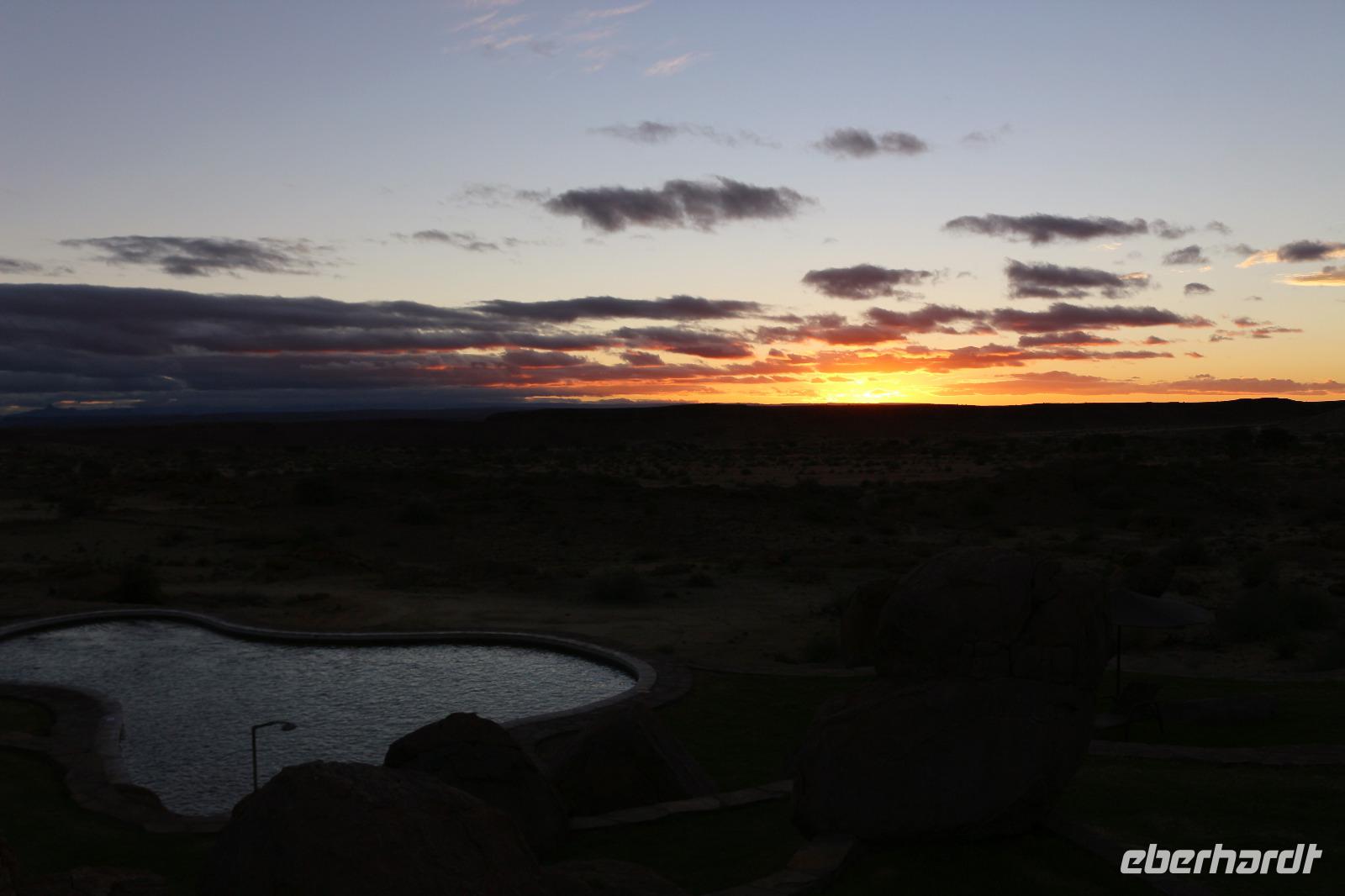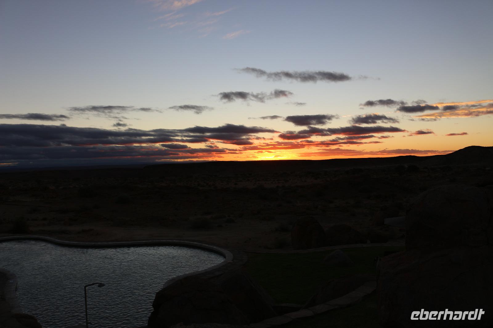 Nach einer langen Fahrt kamen wir schließlich in der Namib Desert Lodge an. Nachdem wir begrüßt worden waren und unsere Zimmer bezogen hatten, trafen wir uns sogleich fast vollständig an einem der beiden Pools wieder, um gemeinsam schwimmen zu gehen. Die Wassertemperatur war hier auch schon wesentlich angenehmer als noch gestern in Lüderitz. Am Abend genossen wir unser Abendessen das erste Mal auf unserer Reise im Freien und stellten begeistert fest, dass es abends einfach nicht kälter wurde und die mitgebrachten Jacken nicht benötigt wurden.