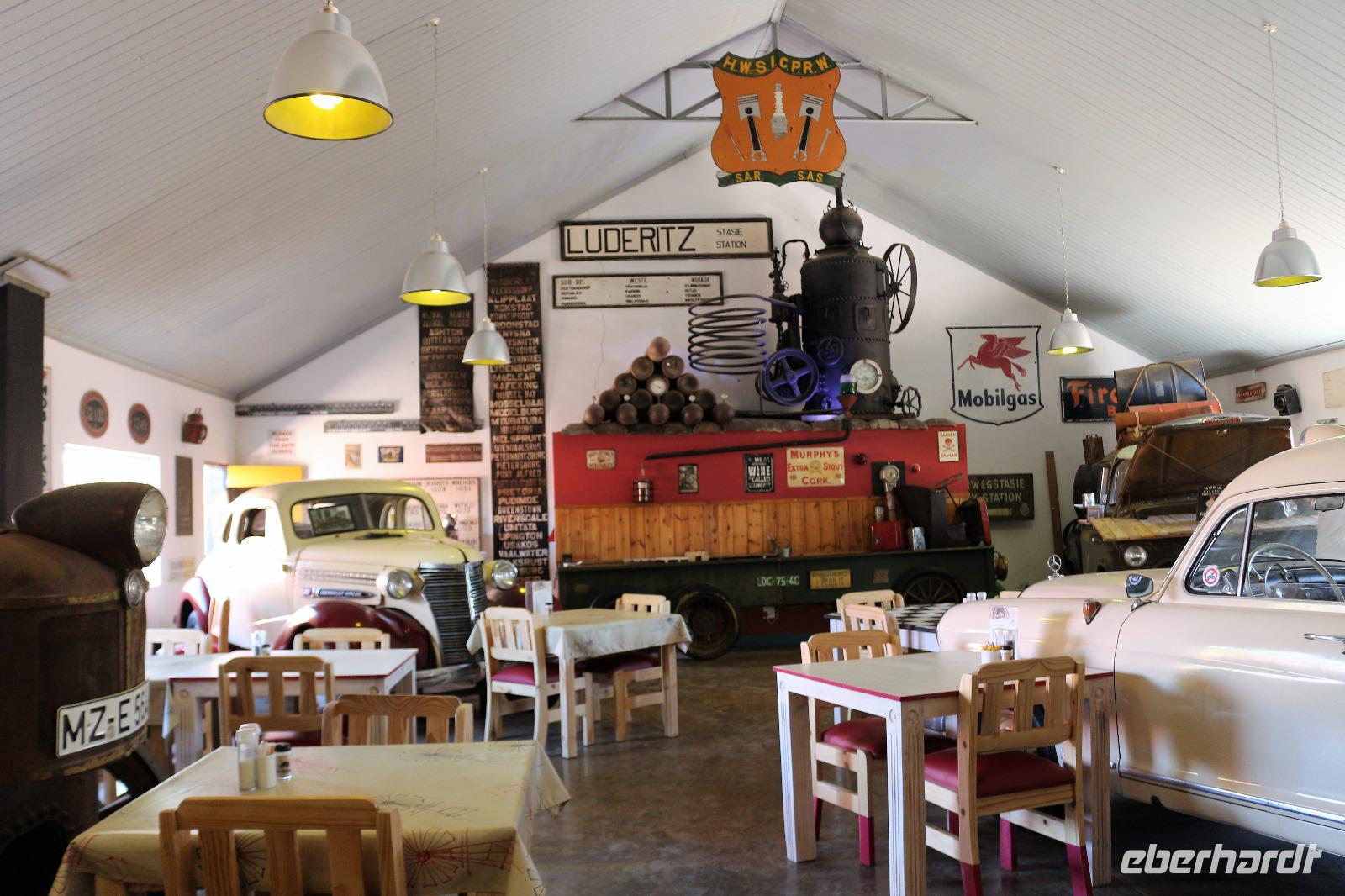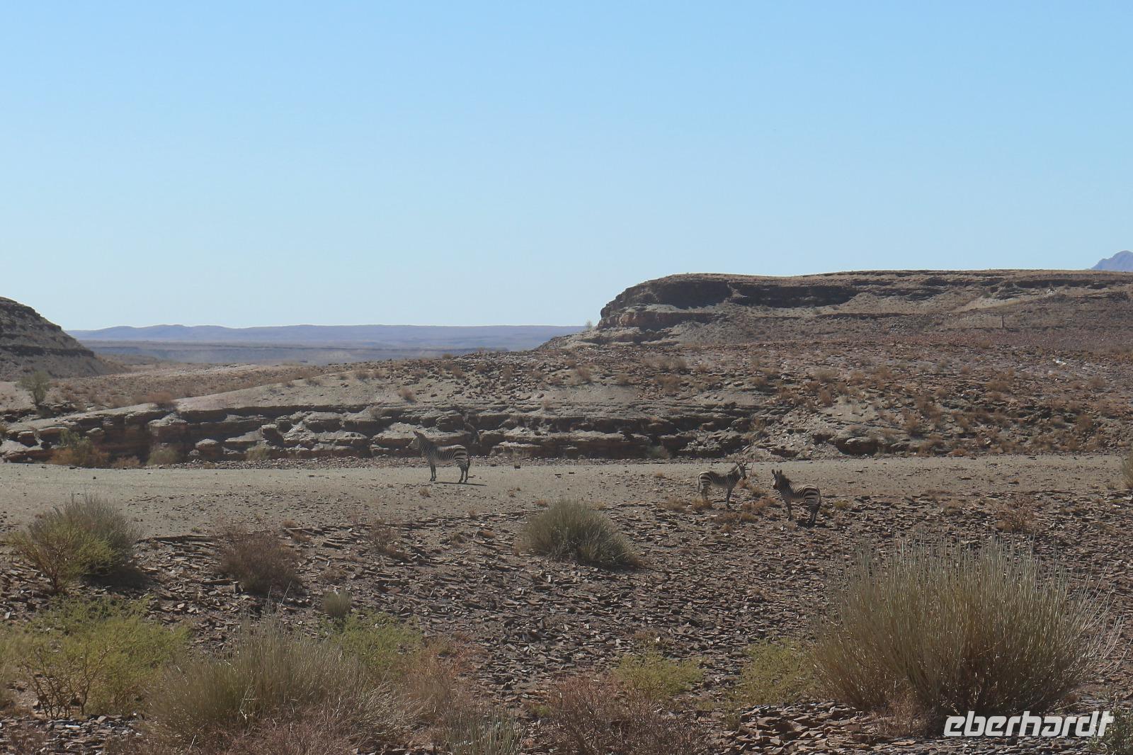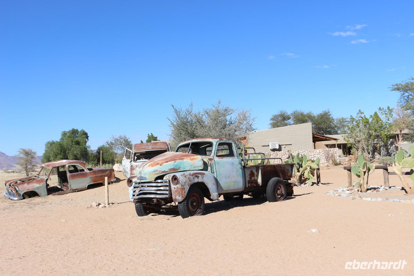 Gut gestärkt vom Frühstück treffen wir uns zur gewohnten Zeit, 8.00 Uhr, am Bus, um die schöne Lodge wieder zu verlassen. Durch eine eindrucksvolle Landschaft fuhren wir bis zum Fish River Canyon, welches der weltweit zweitgrößte seiner Art ist. Wir hielten an verschiedenen Aussichtspunkten, spazierten entlang des Canyons und genossen den traumhaften Ausblick. Unser Reiseleiter Henner hatte ausgefallene Ideen für ganz besondere Fotos für uns parat, welche der eine oder andere auch umsetzte. Nachdem wir auch ein Gruppenfoto geschossen hatten, ging es langsam wieder zurück zum Bus. Zunächst fuhren wir zum Canon Roadhouse, einer Lodge, welche unter dem Motto der Autos gestaltet wurde. Wir bestaunten die außergewöhnliche Gestaltung und der ein oder andere genoss ein kühles Bier oder einen leckeren Cappuccino an der Bar oder auf der Terrasse. Im Anschluss fuhren wir wenige Meter weiter zum dazu gehörigen Campingplatz. Hier bauten wir wieder ein Picknick auf und ließen es uns gemeinsam schmecken. Gut gestärkt erwartet uns nun eine relativ lange Busfahrt, auf welcher wir Zebras, Oryx und Strauße entdeckten. Am späten Nachmittag kamen wir schließlich im Klein Aus Vista an, wo uns wieder ein Willkommensdrink serviert wurde. Nachdem alle Zimmer bezogen waren, konnte man den erst neu gebauten Swimmingpool austesten oder den Sonnenuntergang von der Terrasse der einzelnen Bungalows genießen. Am Abend trafen wir uns alle wieder zu einem ausgezeichneten Abendessen. Nachdem das Programm für den nächsten Tag besprochen war, ließen wir den Abend gemeinsam in gemütlicher Runde an der urigen Bar ausklingen.