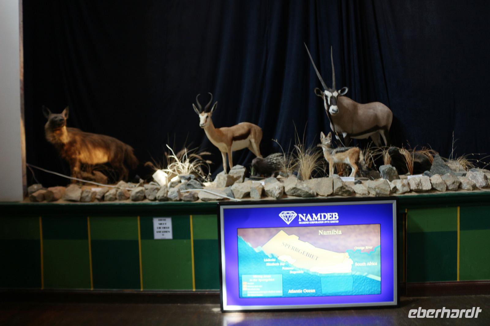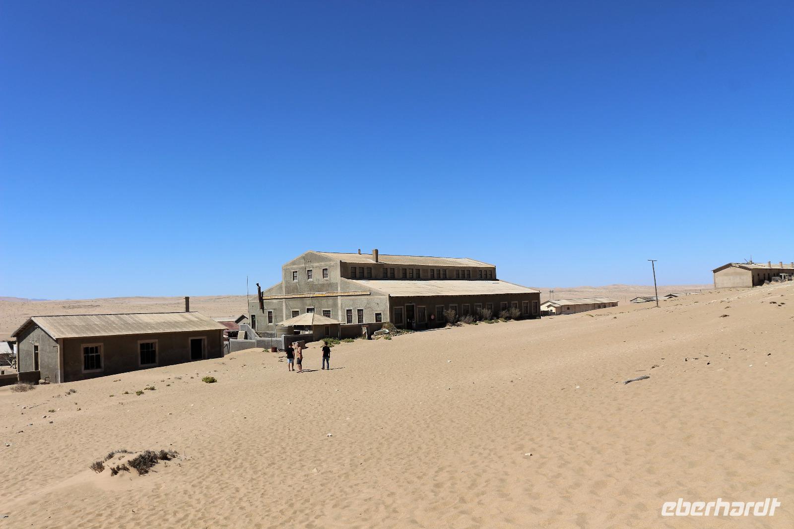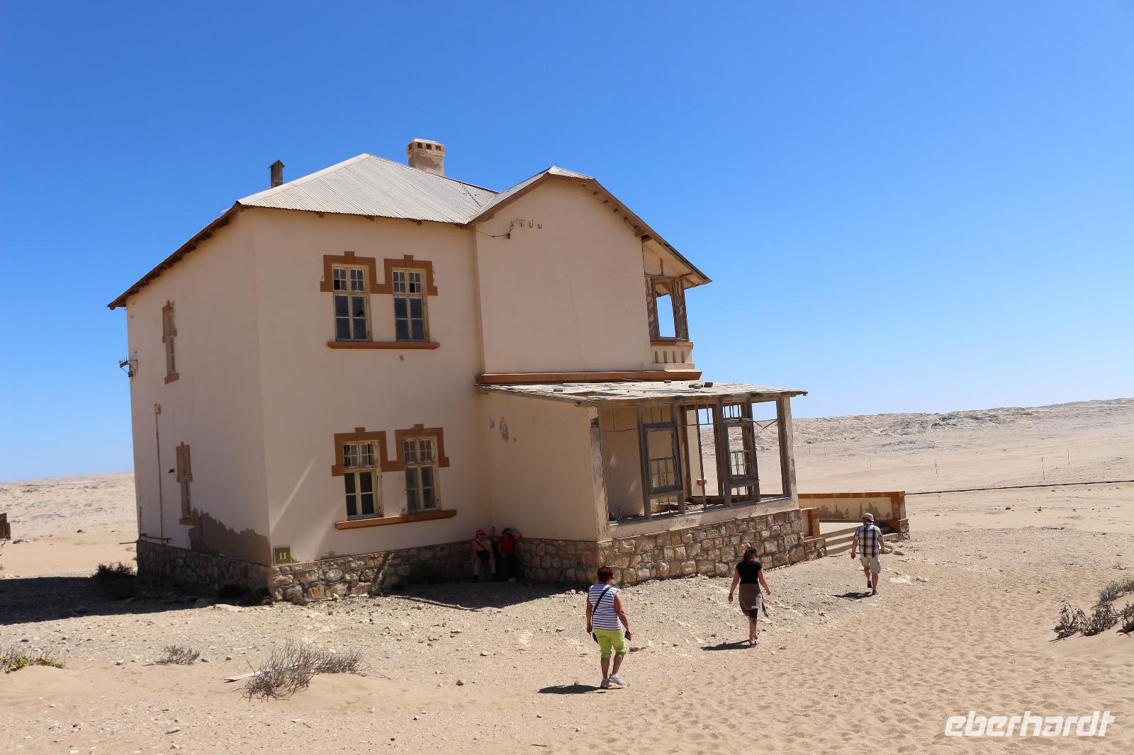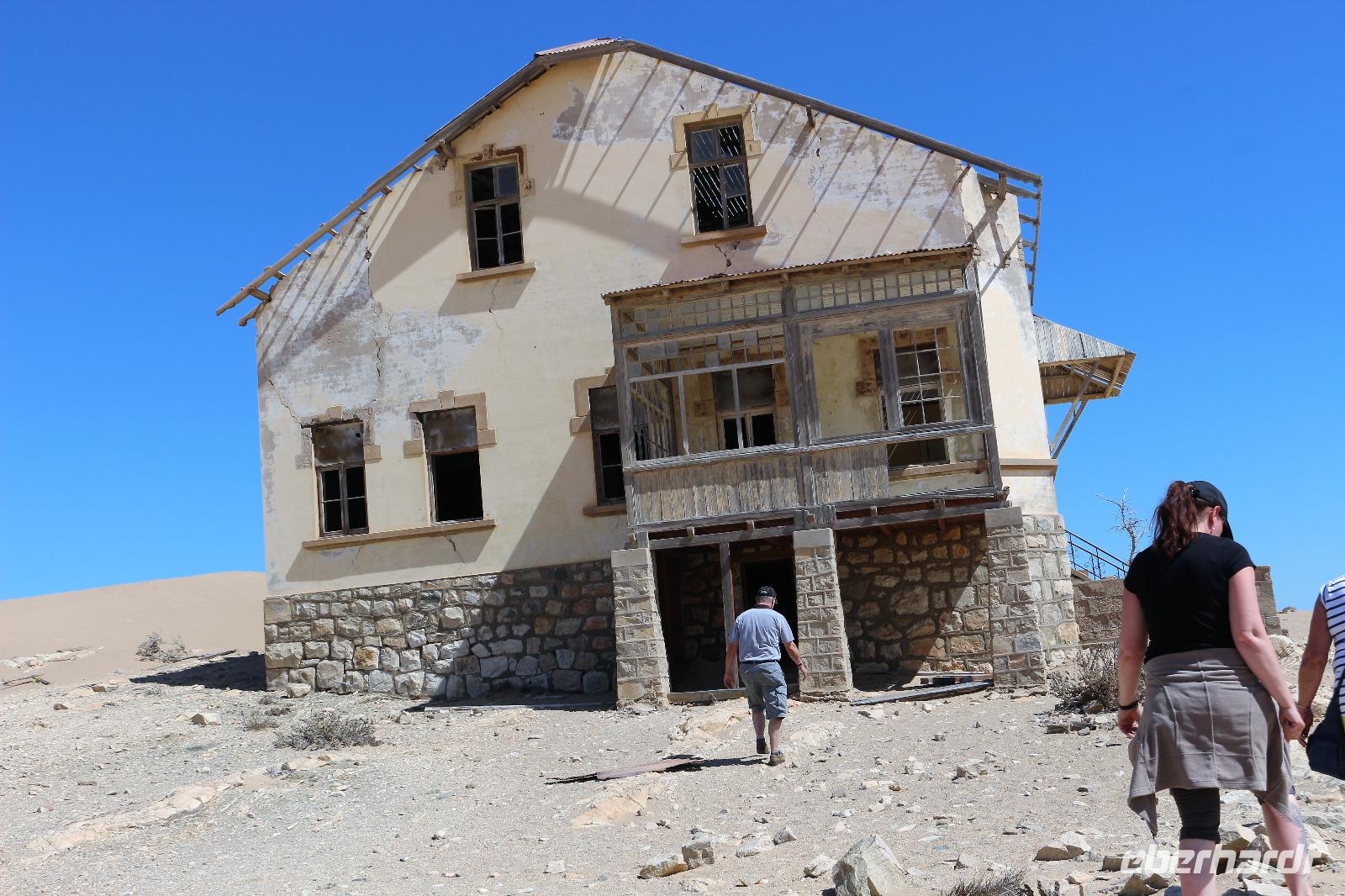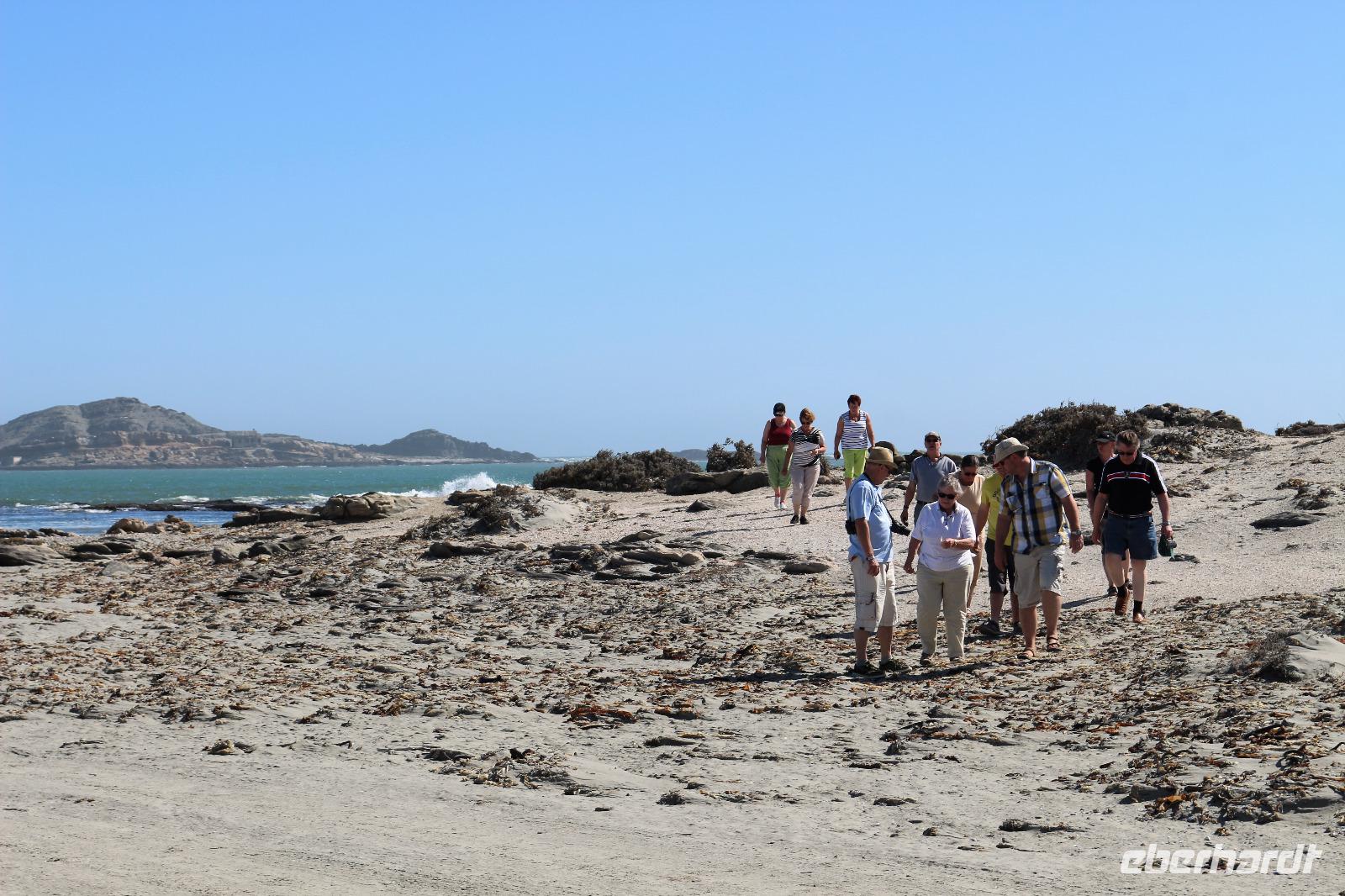 Heute konnten wir etwas länger schlafen und ausgiebig frühstücken, denn statt der bisher gewohnten Zeit starteten wir unsere Tour heute erst 8.45 Uhr. Pünktlich verließen wir das Hotel in Richtung Lüderitz. Unterwegs begegneten uns plötzlich Wildpferde mitten auf der Straße, welche offensichtlich auf der Suche nach Nahrung waren. Wir fotografierten diese, bevor wir langsam weiter fuhren. Schließlich kamen wir in der Geisterstadt Kolmanskop an, welche sich inmitten der Wüste befindet. Zunächst hatten wir noch etwas Zeit, durch den Souvenirladen zu schlendern sowie schon die ersten Räumlichkeiten zu erkunden. Schließlich erlebten wir eine einstündige Führung über das Gelände, wobei wir viel über die Geschichte des Ortes und den Abbau der Diamanten erfuhren. Obwohl es im Sand oftmals glitzerte, fanden wir leider keine Diamanten. Uns wurden verschiedene der alten und oftmals noch sehr gut erhaltenen Häuser gezeigt sowie deren Funktion erläutert. Anschließend blieb Zeit für individuelle Erkundungen der noch nicht besichtigten Gebäude. Wem dies bei der vorherrschenden Hitze in der überaus schattenlosen Gegend zu anstrengend war, konnte im Café ein kühles Getränk oder einen kleinen Mittagssnack genießen.