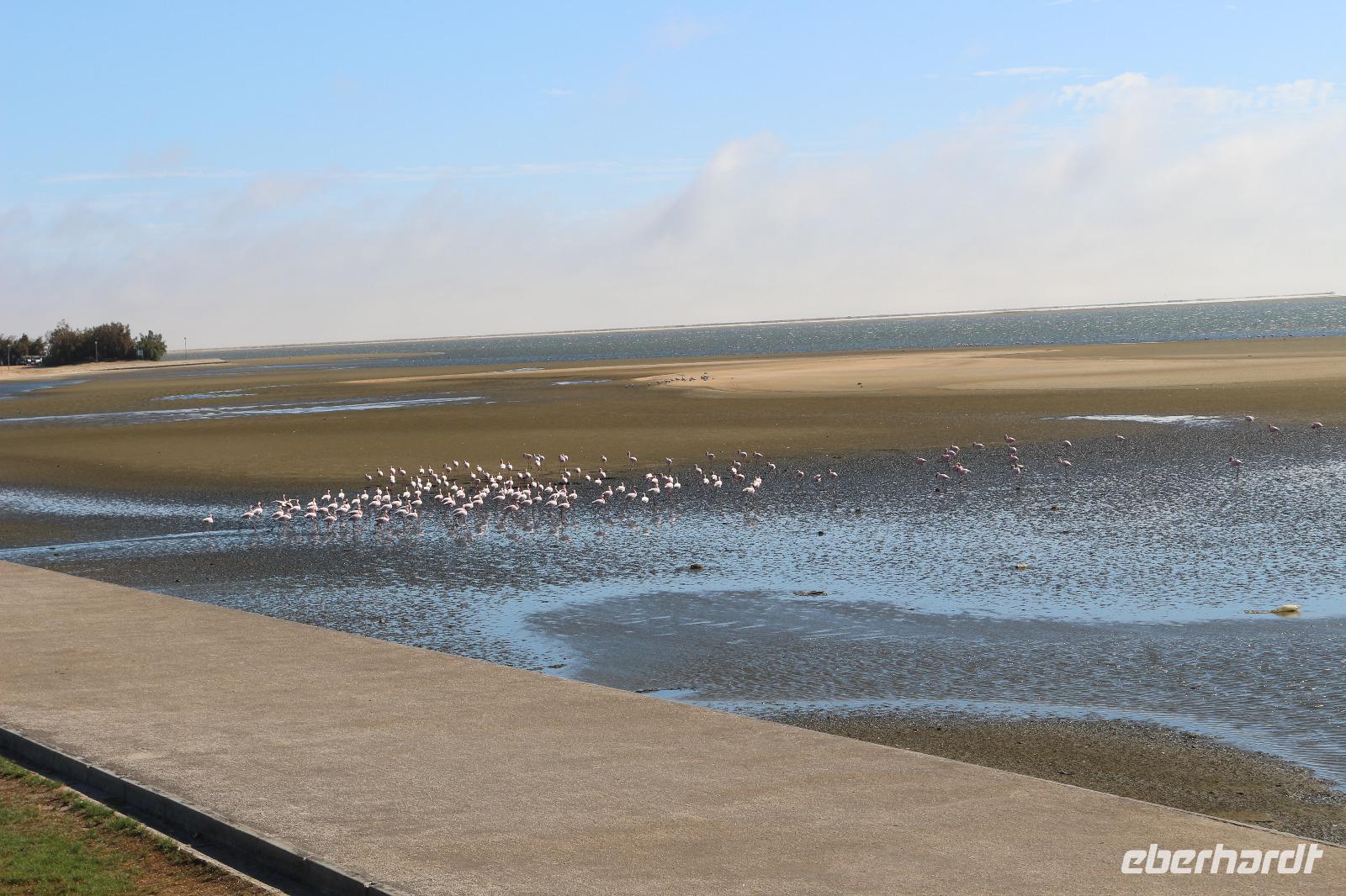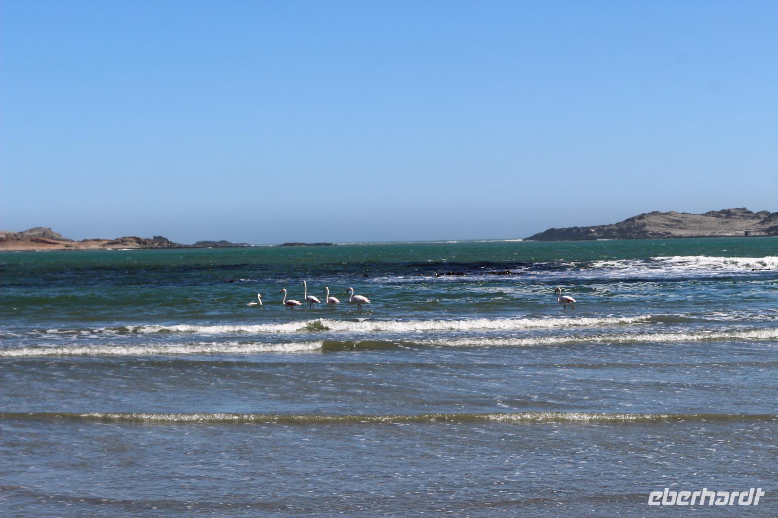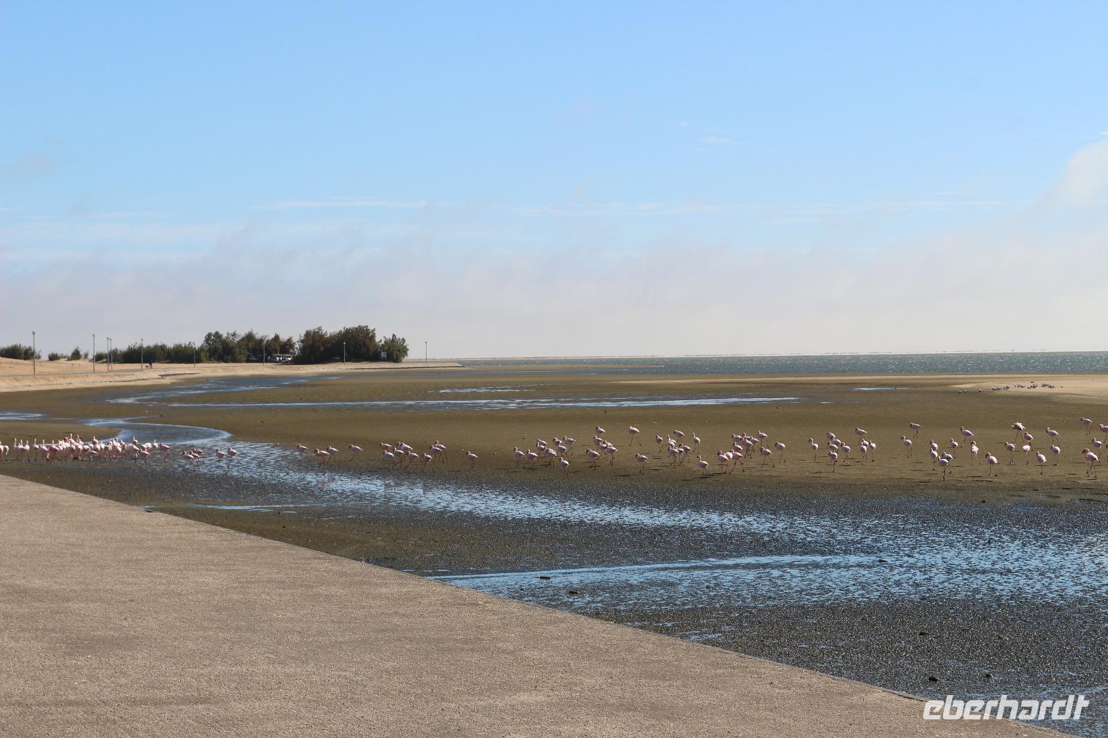 Weiter ging es durch eine karge Wüstenlandschaft bis an die Küste. Hier wurde es schlagartig kühler, da ein sehr frischer Wind wehte. Zunächst führte uns unsere Reise nach Walvis Bay, wo wir unsere Mittagspause in einem sehr gemütlichen Restaurant am Hafen verbrachten. Anschließend fotografierten wir die Flamingos, welche von unserer Anwesenheit jedoch nicht allzu begeistert schienen. Wenig später erreichten wir auch schon die Hafenstadt Swakopmund, welche unser heutiges Tagesziel sein sollte. Nach einer kurzen orientierenden Stadtrundfahrt checkten wir im Hansa Hotel ein und bezogen nach einem Begrüßungssekt unsere Zimmer. Anschließend war Zeit für eine kleine individuelle Erkundungstour in der Stadt oder für die Erledigung von Bankgeschäften. Am Abend trafen wir uns im Hotelrestaurant, wo wir ein exzellentes Abendessen in angenehmer Atmosphäre genossen. Besonderer Höhepunkt war die unterhaltsame Zubereitung der Hausspezialität, des „Kolonial-Kaffees", ein Getränk bestehend aus Kaffee, Eierlikör, Kaffeelikör und Weinbrand mit Sahne, welches einen besonders guten Schlaf ermöglichen sollte.