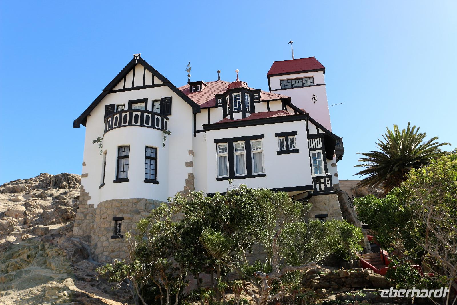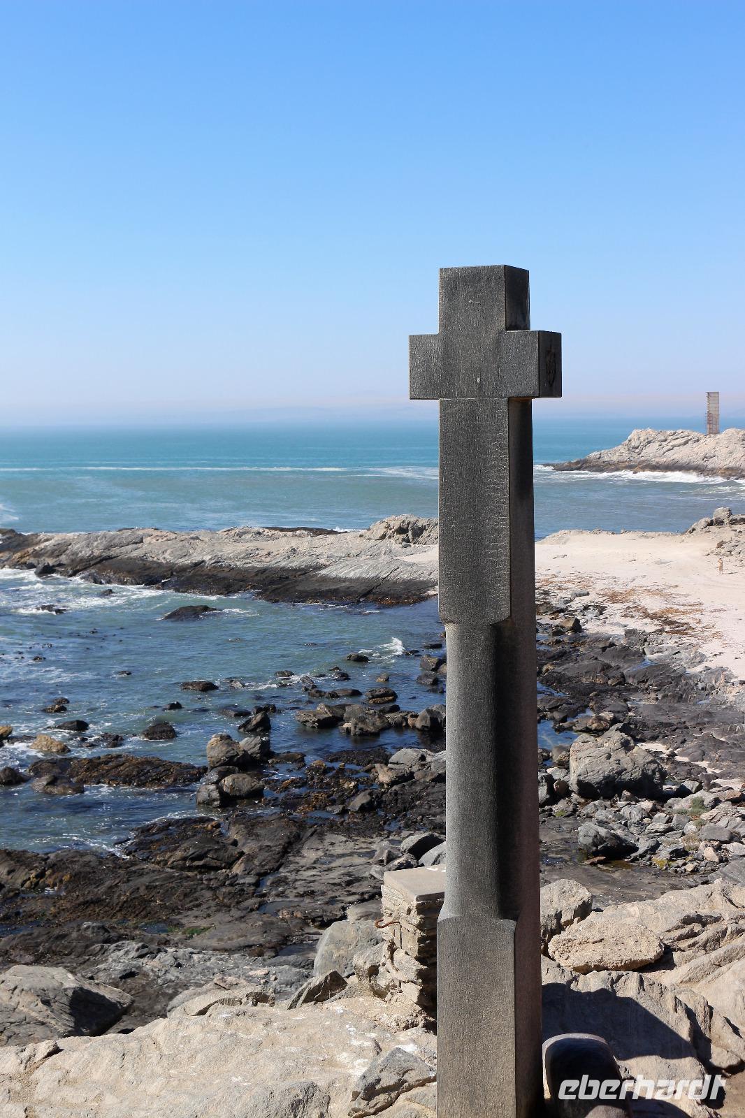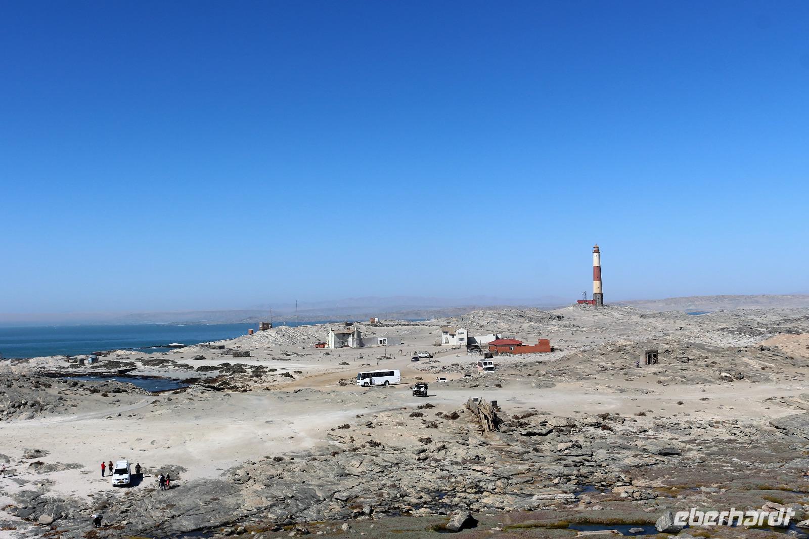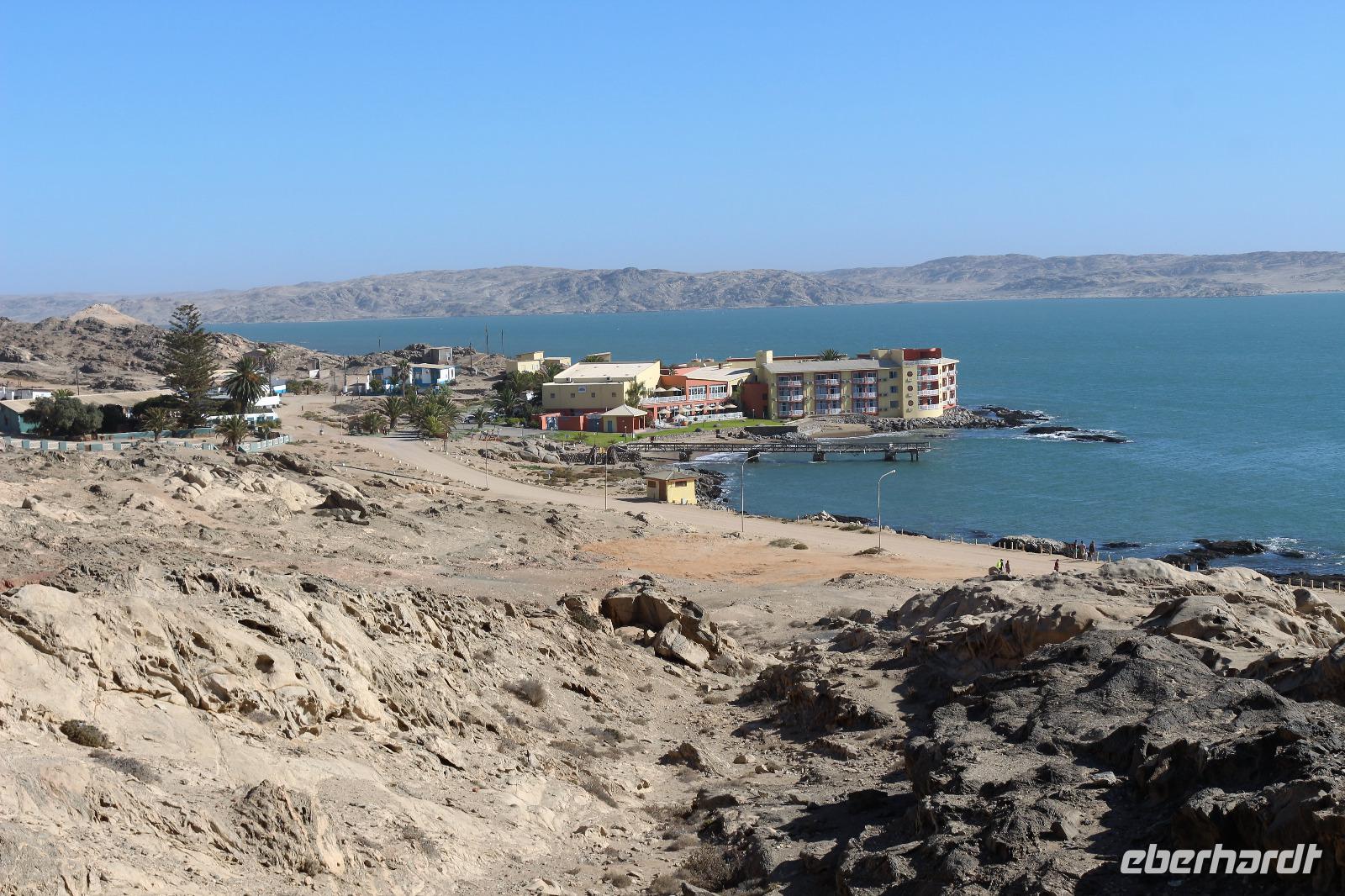 Schließlich setzten wir unsere Fahrt in Richtung Lüderitz fort. Dabei durchquerten wir eine äußerst ungewöhnliche und beeindruckende Landschaft, welche ohne die Stromleitungen auch glatt als Mondlandschaft durchgehen könnte. Am frühen Nachmittag erreichten wir Lüderitz und unternahmen zunächst eine Buchtenrundfahrt. Dabei spazierten wir etwas am Atlantikstrand entlang und fotografierten die Flamingos bis uns diese leider verließen. Außerdem sammelte der eine oder andere wunderschöne Muscheln und Steine und wir genossen dabei die angenehm frische Atlantikbrise. Nach einer kurzen Fahrt erreichten wir das bekannte Diaz-Kreuz. Da die Brücke leider vor einiger Zeit zerstört worden war, waren ein wenig Kletterkünste gefragt, um auf den Felsen mit dem Kreuz zu gelangen. Wir fotografierten dieses fleißig und genossen dabei auch den herrlichen Ausblick auf die gewaltigen Wellen des Atlantiks. Auch den Leuchtturm begutachteten wir, wenn auch aus der Ferne. Wenig später erreichten wir auch schon Lüderitz, wo wir eine kleine Stadtrundfahrt unternahmen und dabei die Felsenkirche sowie das Woermann Haus und das Goerke-Haus fleißig fotografieren konnten. Anschließend ging es zum Lüderitzer Hafen mit einer kleinen Promenade. Wir staunten jedoch, wie wenig Touristen und Einheimische hier zu sehen waren und stellten fest, dass die Stadt wie ausgestorben wirkte. Schon am Nachmittag erreichten wir auch unser Hotel und bezogen unsere Zimmer. Auch wenn zuvor die Vorfreude auf ein Bad im Atlantik noch groß gewesen war, trauten sich nun die allerwenigsten in die eiskalten Fluten (16°C). Die meisten zogen stattdessen den hoteleigenen Pool im Innenhof vor, wo man zugleich Zuschauer eines Hochzeits-Fotoshootings wurde. Später trafen wir uns im Hotelrestaurant zum Abendessen wieder. Hier gab es, wie sollte es an der Küste auch anders sein, unter anderem auch Fisch und Meeresfrüchte, welche direkt vor unseren Augen frisch zubereitet wurden. Wir genossen das gute Essen und ein Teil der Gruppe ließ den Abend noch gemütlich an der Hotelbar ausklingen.