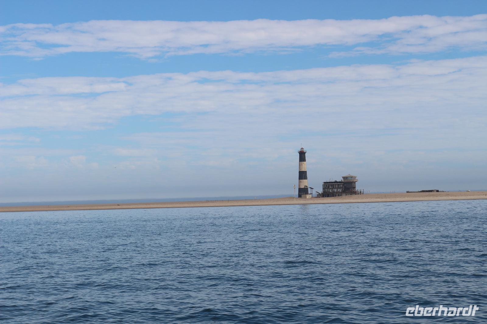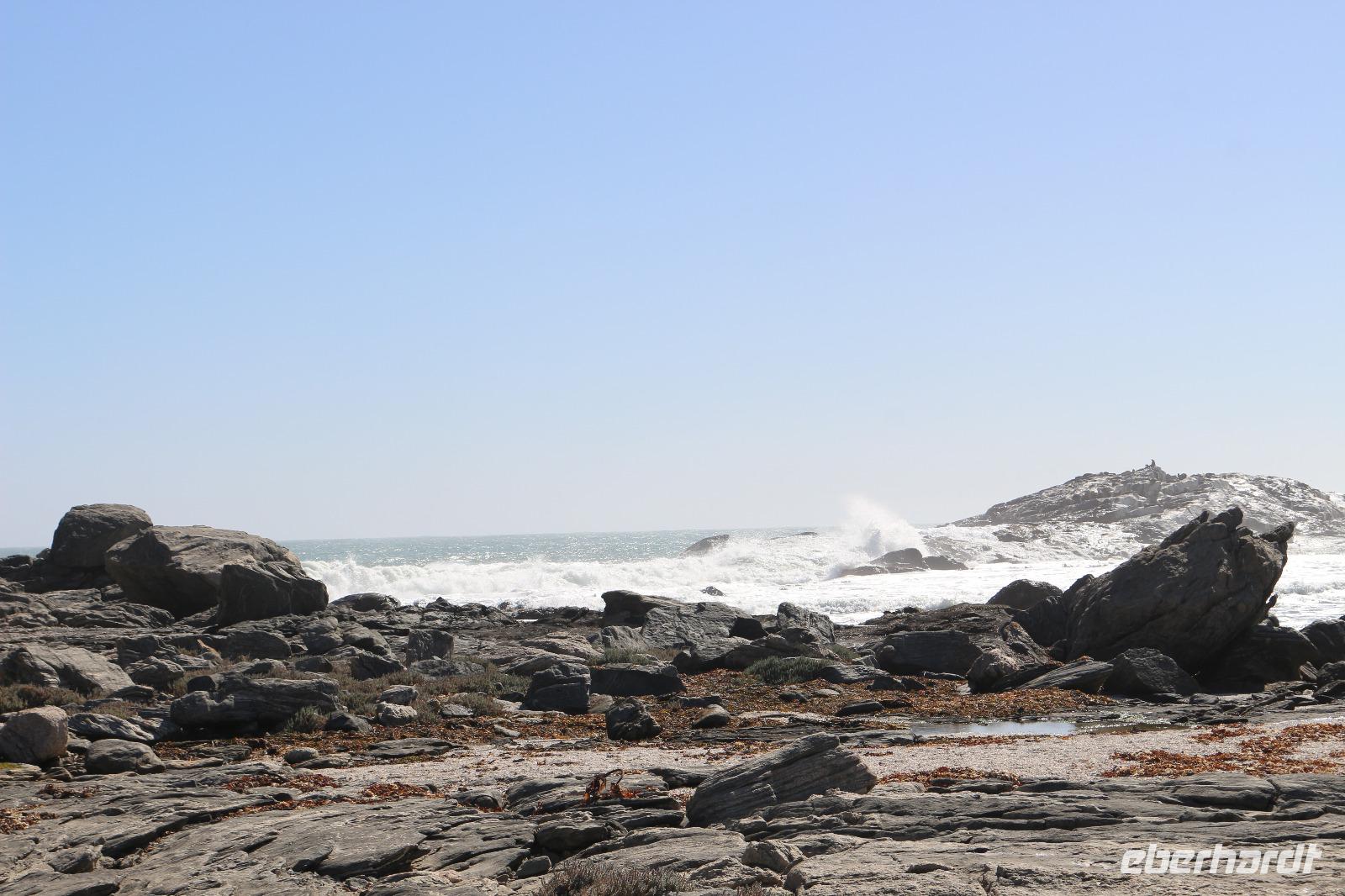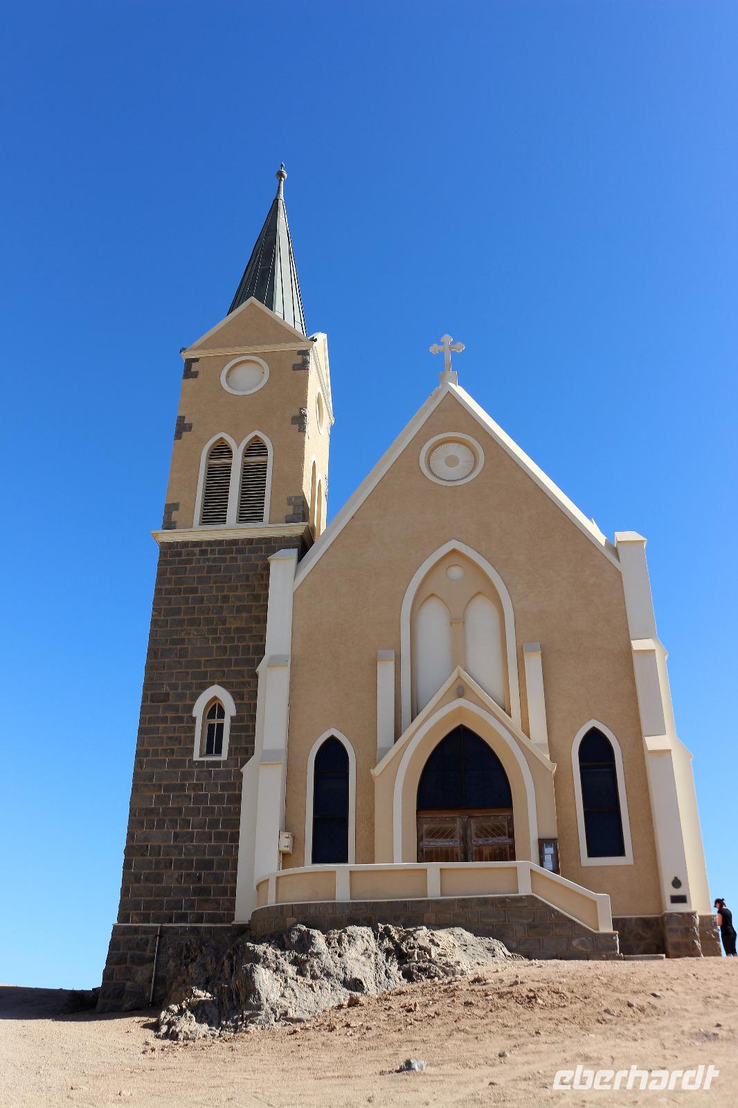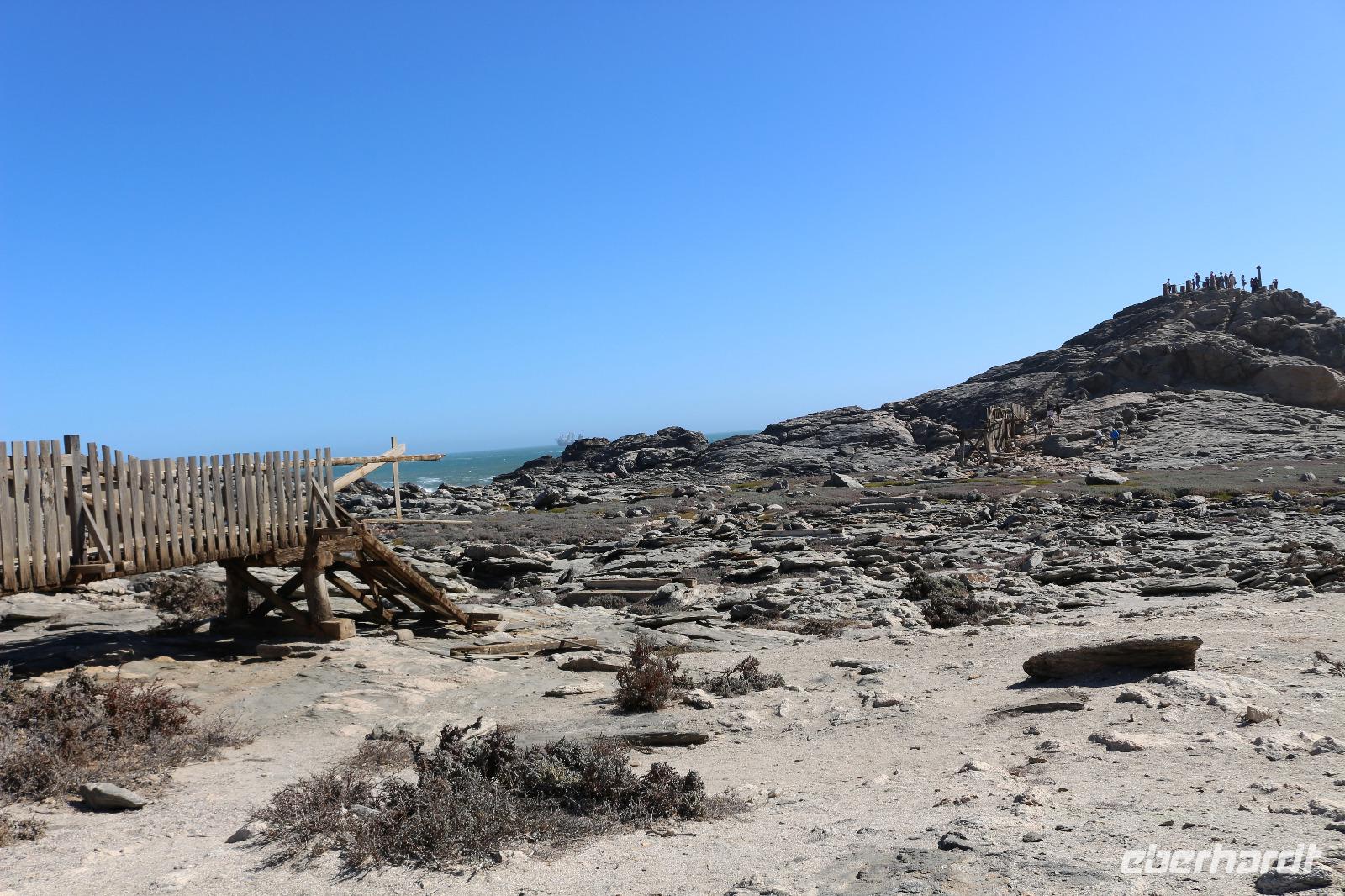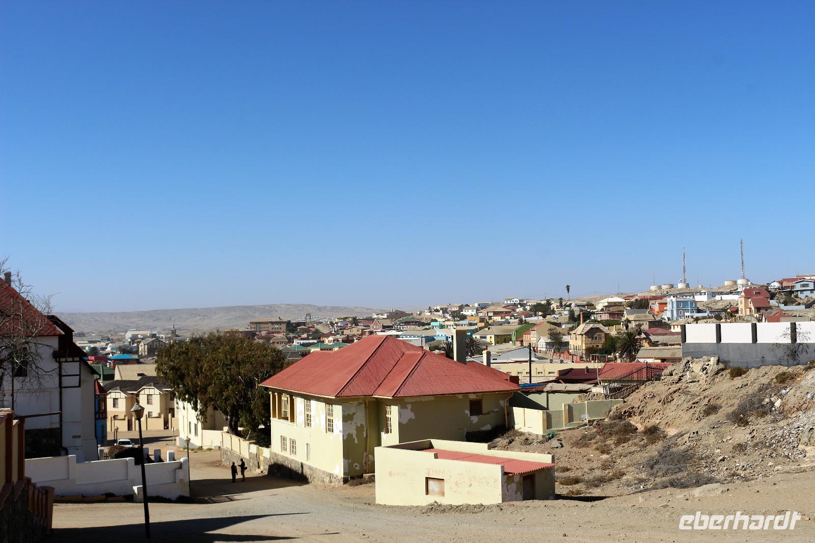 Schließlich setzten wir unsere Fahrt in Richtung Lüderitz fort. Dabei durchquerten wir eine äußerst ungewöhnliche und beeindruckende Landschaft, welche ohne die Stromleitungen auch glatt als Mondlandschaft durchgehen könnte. Am frühen Nachmittag erreichten wir Lüderitz und unternahmen zunächst eine Buchtenrundfahrt. Dabei spazierten wir etwas am Atlantikstrand entlang und fotografierten die Flamingos bis uns diese leider verließen. Außerdem sammelte der eine oder andere wunderschöne Muscheln und Steine und wir genossen dabei die angenehm frische Atlantikbrise. Nach einer kurzen Fahrt erreichten wir das bekannte Diaz-Kreuz. Da die Brücke leider vor einiger Zeit zerstört worden war, waren ein wenig Kletterkünste gefragt, um auf den Felsen mit dem Kreuz zu gelangen. Wir fotografierten dieses fleißig und genossen dabei auch den herrlichen Ausblick auf die gewaltigen Wellen des Atlantiks. Auch den Leuchtturm begutachteten wir, wenn auch aus der Ferne. Wenig später erreichten wir auch schon Lüderitz, wo wir eine kleine Stadtrundfahrt unternahmen und dabei die Felsenkirche sowie das Woermann Haus und das Goerke-Haus fleißig fotografieren konnten. Anschließend ging es zum Lüderitzer Hafen mit einer kleinen Promenade. Wir staunten jedoch, wie wenig Touristen und Einheimische hier zu sehen waren und stellten fest, dass die Stadt wie ausgestorben wirkte. Schon am Nachmittag erreichten wir auch unser Hotel und bezogen unsere Zimmer. Auch wenn zuvor die Vorfreude auf ein Bad im Atlantik noch groß gewesen war, trauten sich nun die allerwenigsten in die eiskalten Fluten (16°C). Die meisten zogen stattdessen den hoteleigenen Pool im Innenhof vor, wo man zugleich Zuschauer eines Hochzeits-Fotoshootings wurde. Später trafen wir uns im Hotelrestaurant zum Abendessen wieder. Hier gab es, wie sollte es an der Küste auch anders sein, unter anderem auch Fisch und Meeresfrüchte, welche direkt vor unseren Augen frisch zubereitet wurden. Wir genossen das gute Essen und ein Teil der Gruppe ließ den Abend noch gemütlich an der Hotelbar ausklingen.