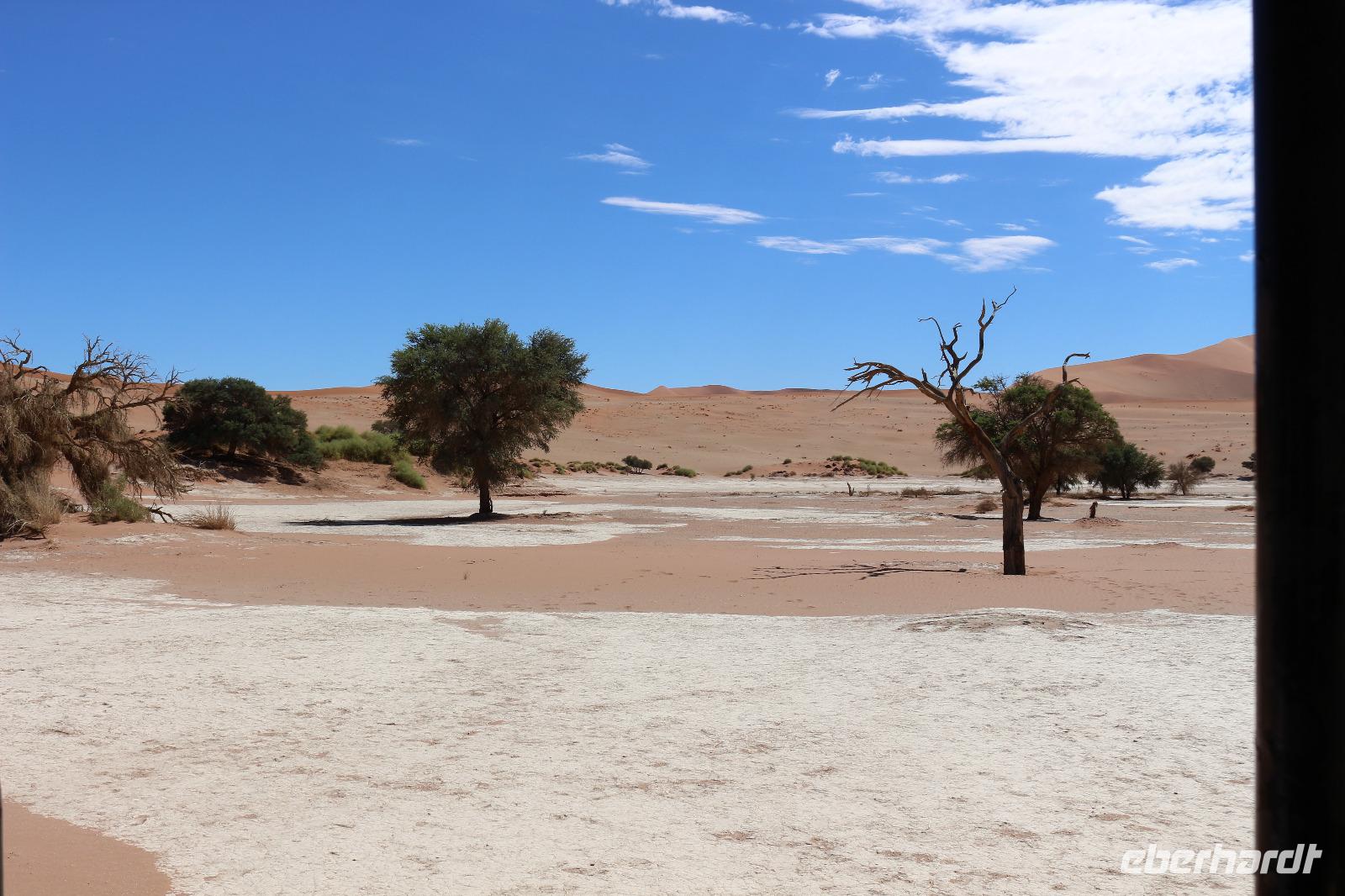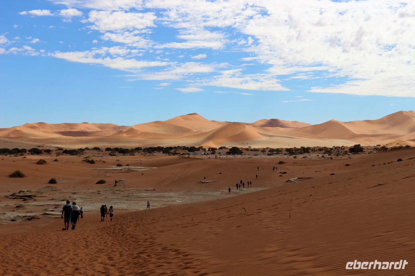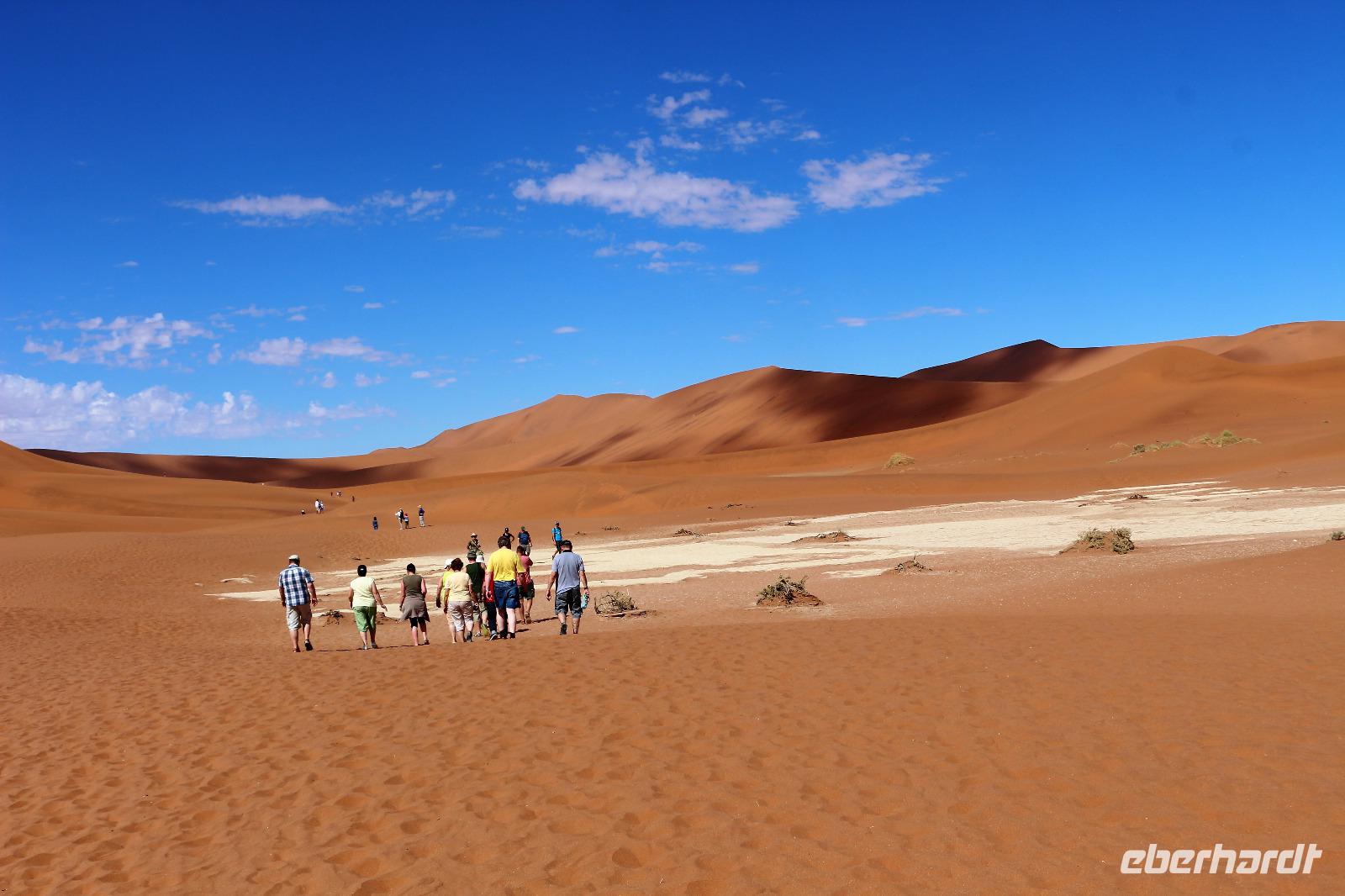 Als alle wieder gestärkt waren, fuhren wir noch wenige Minuten, bis wir den Parkplatz und damit unsere Umstiegsstelle vom Bus in kleinere Allradfahrzeuge erreichten. Mit diesen Fahrzeugen fuhren wir weiter in den Park hinein, wobei der Sand immer dichter wurde. Dort angekommen, stand schon die nächste Wanderung auf dem Programm: eine Wanderung bis hinein in das Dead Vlei, wobei eine Strecke ca. 1 Kilometer beträgt. Gut ausgerüstet mit Sonnenschutz und Trinkwasser marschierten wir los. Die so harmlos klingende Entfernung entpuppte sich jedoch als echte Herausforderung, da ein Vorwärtskommen im Sand gar nicht so einfach war und Temperaturen von 37°C dies nicht gerade erleichterten. Jedoch war der Weg die Strapazen wert gewesen, denn es boten sich uns einmalige Ausblicke auf die herrliche Dünenlandschaft. Sehr geschafft und verschwitzt kamen wir ungefähr eine Stunde später wieder am Parkplatz an, wo wir wieder in die Allradfahrzeuge stiegen. Diese brachten uns zunächst zum Sossusvlei, wo wir einen Fotostop einlegten und schließlich auch wieder bis zu unserem Bus. Nun konnten wir während der Fahrt zurück zum Ausgang des Parks zunächst etwas verschnaufen. Dort angekommen genossen wir unsere lang herbeigesehnten Kaltgetränke, um uns vollends zu erholen.