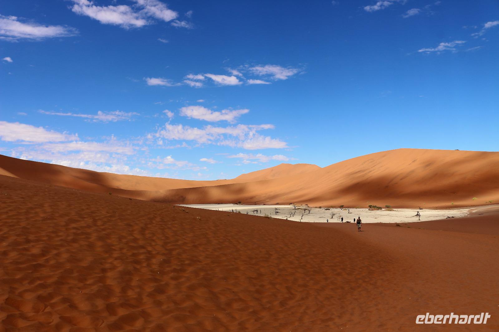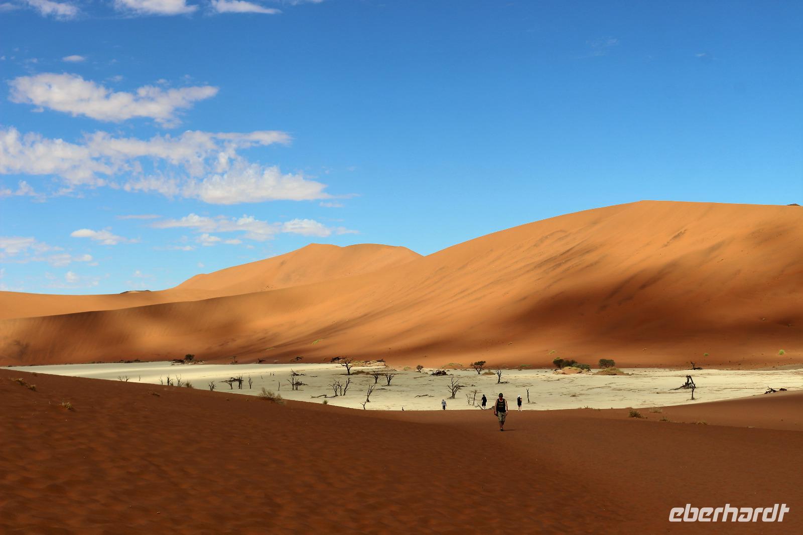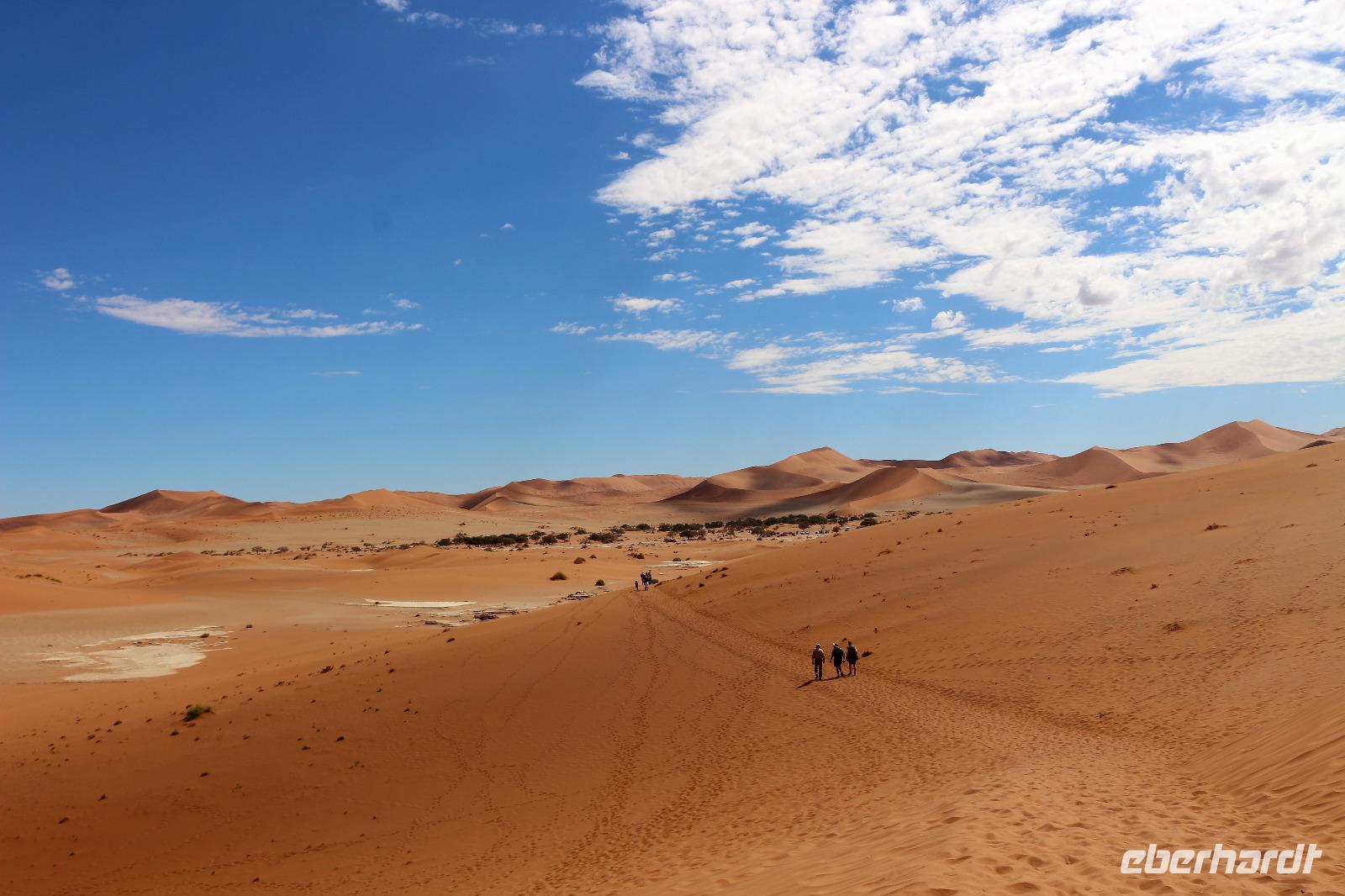 Als alle wieder gestärkt waren, fuhren wir noch wenige Minuten, bis wir den Parkplatz und damit unsere Umstiegsstelle vom Bus in kleinere Allradfahrzeuge erreichten. Mit diesen Fahrzeugen fuhren wir weiter in den Park hinein, wobei der Sand immer dichter wurde. Dort angekommen, stand schon die nächste Wanderung auf dem Programm: eine Wanderung bis hinein in das Dead Vlei, wobei eine Strecke ca. 1 Kilometer beträgt. Gut ausgerüstet mit Sonnenschutz und Trinkwasser marschierten wir los. Die so harmlos klingende Entfernung entpuppte sich jedoch als echte Herausforderung, da ein Vorwärtskommen im Sand gar nicht so einfach war und Temperaturen von 37°C dies nicht gerade erleichterten. Jedoch war der Weg die Strapazen wert gewesen, denn es boten sich uns einmalige Ausblicke auf die herrliche Dünenlandschaft. Sehr geschafft und verschwitzt kamen wir ungefähr eine Stunde später wieder am Parkplatz an, wo wir wieder in die Allradfahrzeuge stiegen. Diese brachten uns zunächst zum Sossusvlei, wo wir einen Fotostop einlegten und schließlich auch wieder bis zu unserem Bus. Nun konnten wir während der Fahrt zurück zum Ausgang des Parks zunächst etwas verschnaufen. Dort angekommen genossen wir unsere lang herbeigesehnten Kaltgetränke, um uns vollends zu erholen.