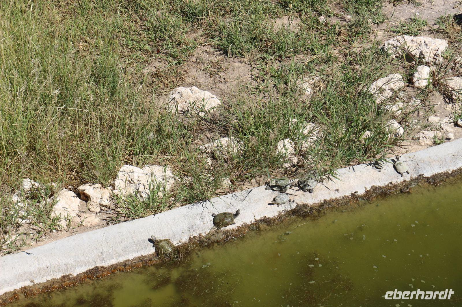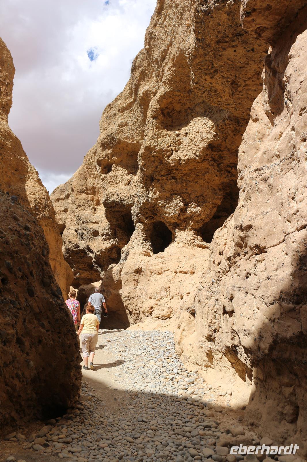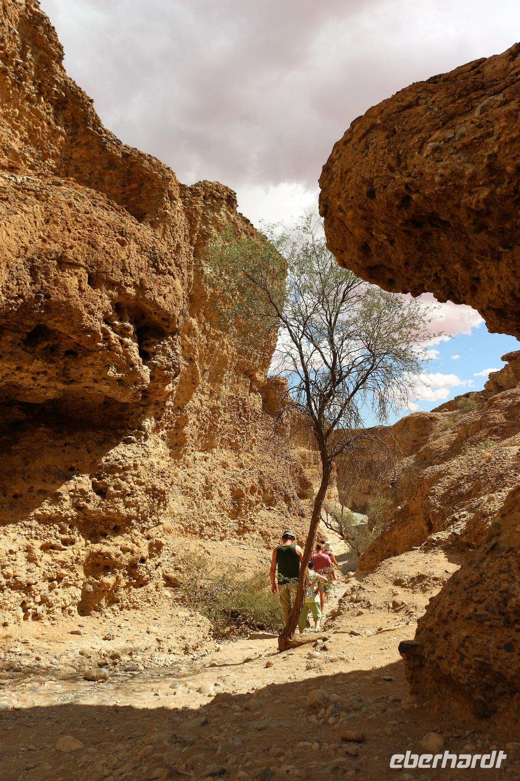 Der nächste Programmpunkt des Tages war nun noch der Sesriem Canyon. Diesen konnten wir von oben sehr schön fotografieren. Ein besonders mutiger Teil der Reisegruppe setzte unseren Aktivtag mit einer kleinen Wanderung hinunter in den Canyon fort. Der Weg hier gestaltete sich aufgrund der steinigen Wege und des Schattens unten im Canyon als äußerst angenehm und brachte uns nun mittlerweile erfahrene Wüstenwanderer nicht in Schwierigkeiten. Zur Belohnung und zur Feier des Osterfestes wurden wir am Ende der kurzen Wanderung mit einem Amarula am Bus begrüßt. Nachdem wir gemeinsam angestoßen hatten und alle Gläser geleert waren, fuhren wir zurück zu unserer Lodge, in welcher wir bereits eine Nacht verbracht hatten. Hier zog es die meisten zunächst zum Pool, um sich zu erfrischen nach diesem anstrengenden Tag.