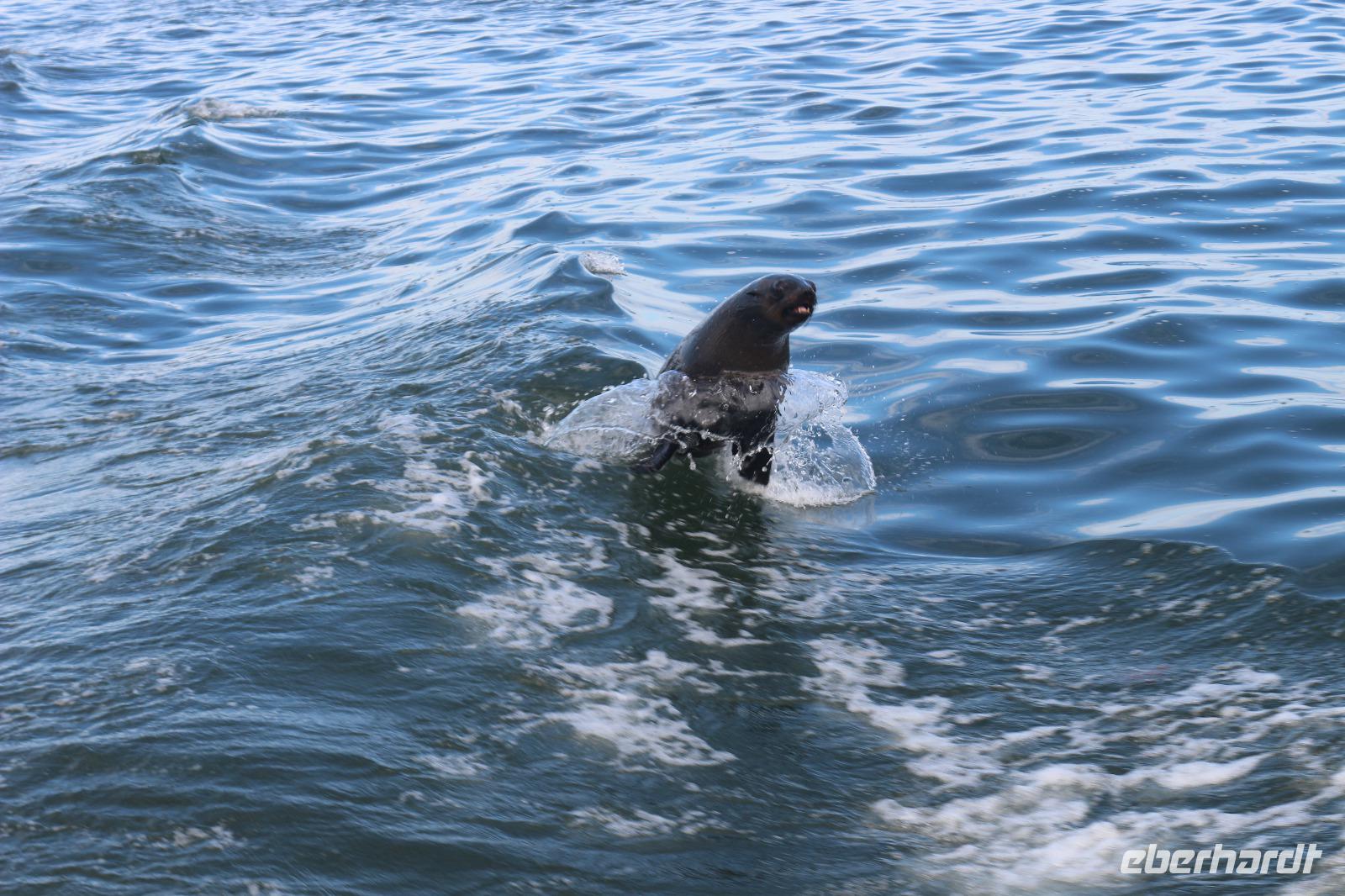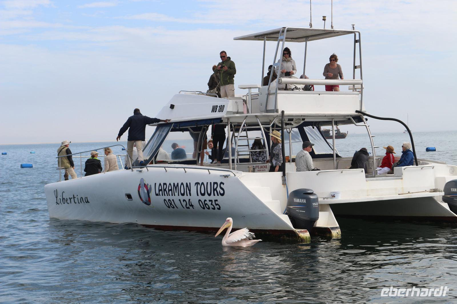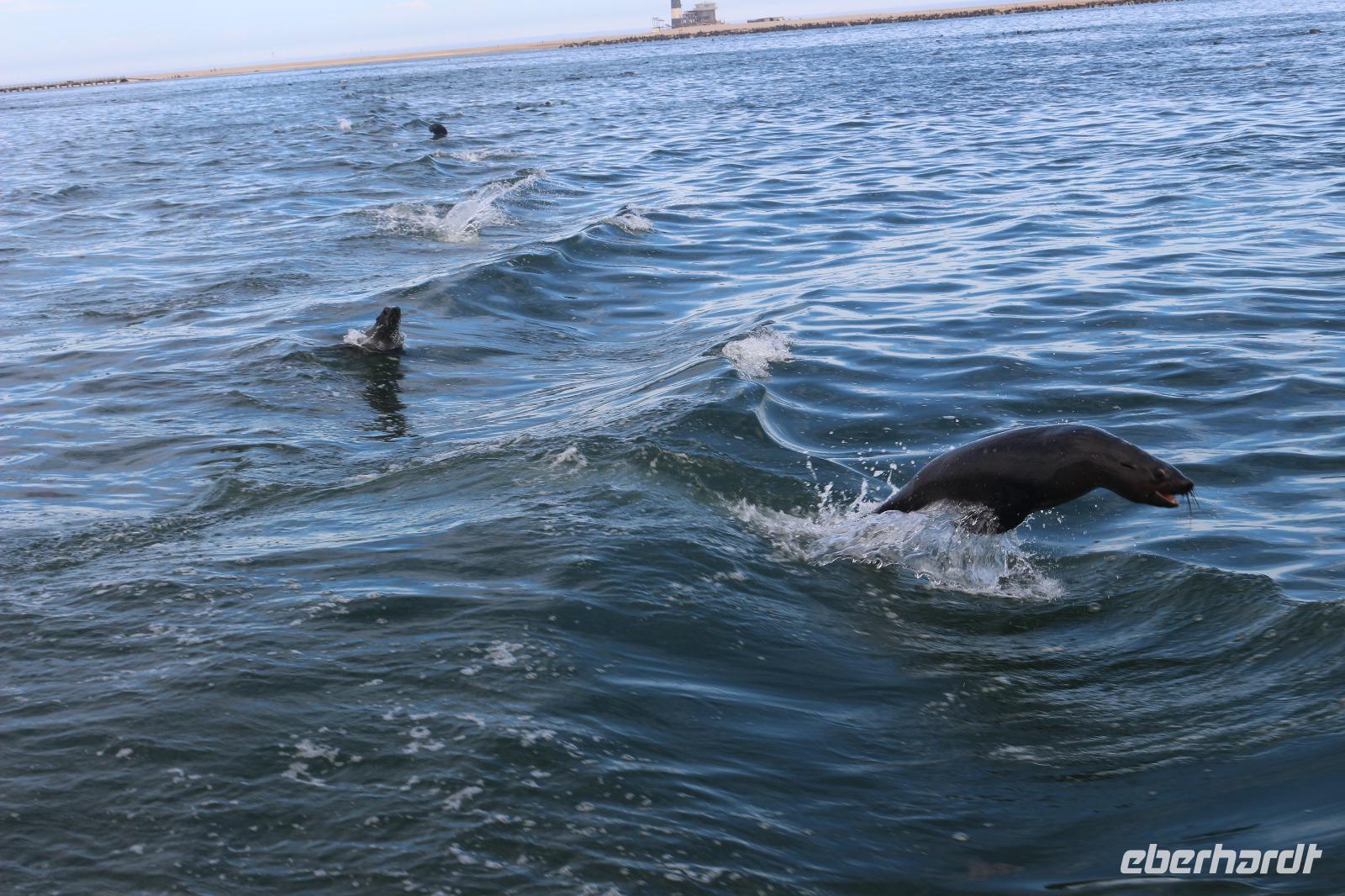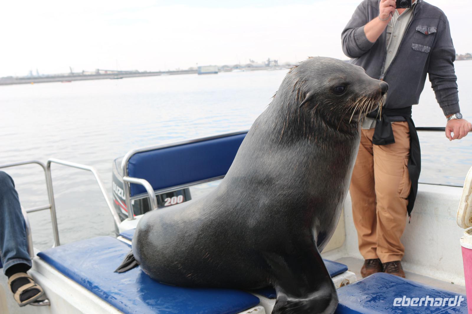 Nach einem stärkenden Frühstück fuhren wir alle gemeinsam heute wieder zurück nach Walvis Bay, wo wir auch gestern schon eine kurze Rundfahrt mit dem Bus unternommen hatten. Heute fuhren wir allerdings direkt zum Hafen, wo wir kurz darauf an Bord eines Katamarans gingen. Hier wurden wir sogleich vom Kapitän in deutscher Sprache herzlich begrüßt. Schon nach wenigen Minuten bekamen wir Besuch von der Robbe Eddi, welche noch recht jung ist. Sie ließ sich gern von uns füttern und posierte für unsere Fotos, bevor sie den Weg zurück ins Meer suchte. Kurze Spät später erreichten wir die Austernbänke, worüber uns viel Wissenswertes erzählt wurde. Auch die Bohrinseln und die dazugehörigen Schiffe, welche inmitten des Meeres parkten und auf den Anstieg des Ölpreises warteten, passierten wir. Nachdem auch eine Qualle den Weg an Bord gefunden hatte, war plötzlich ein schwarzer Küstenstreifen in der Ferne erkennbar. Hierbei handelte es sich um eine Robbenkolonie, sodass wir uns schon kurz darauf inmitten dieser Tiere befanden. Sie besiedelten die ganze Sandbank und sprangen auf beiden Seiten des Bootes durch die Lüfte. Wir alle waren ganz begeistert und wussten gar nicht, wo wir zuerst hinschauen sollten. Viel zu schnell ließen wir diese wunderbaren Tiere hinter uns und entdeckten stattdessen aber Delphine, genauer gesagt Benguela Delphine. Diese zeigten sich uns jedoch nur aus der Ferne. Während wir unsere Seefahrt genossen, bereitete die aus 2 Männern bestehende Crew schon unseren Mittagssnack vor. Mit einem Glas Sekt stießen wir zunächst auf das heutige Bergfest unserer wunderschönen Reise an. Schließlich verkosteten wir die frischen Austern, welche die besten der Welt sein sollen. Der eine oder andere schmeckte dabei auch tatsächlich den Unterschied zu den in anderen Ländern verzehrten Austern. Weiterhin gab es eine vielfältige Auswahl verschiedenster Leckereien für uns. Kurz bevor wir wieder im Hafen ankamen, besuchte uns eine weitere Robbe. Diese ließ sich gern von uns streicheln und der eine oder andere hatte auch die Möglichkeit, dieses Tier für einen Moment auf dem Schoß zu haben. Was für ein Erlebnis!