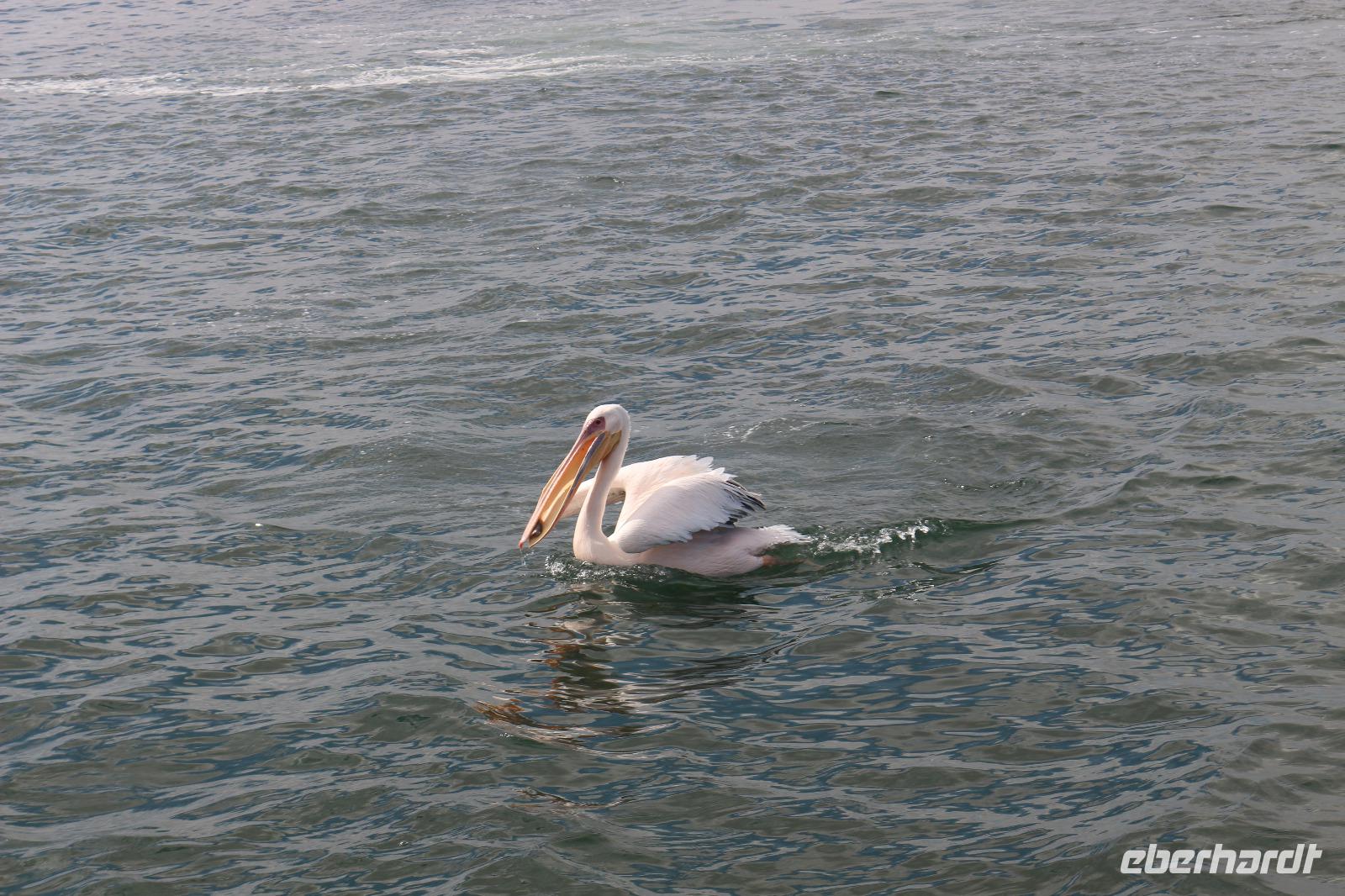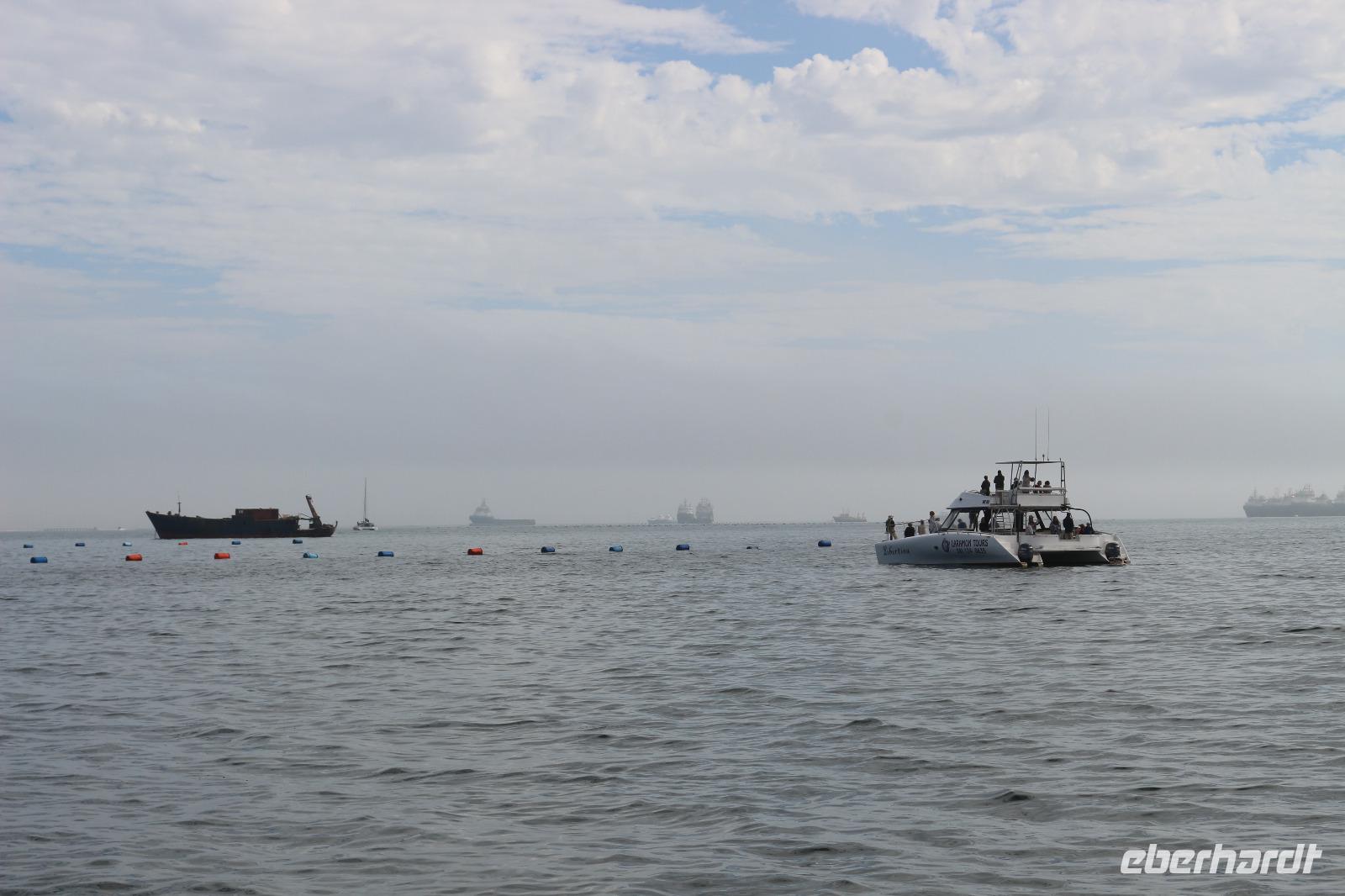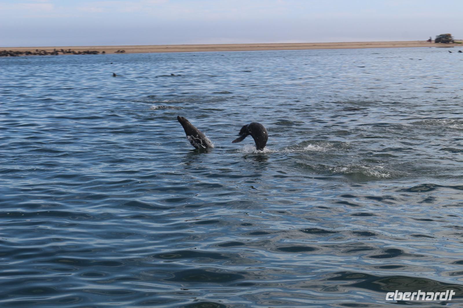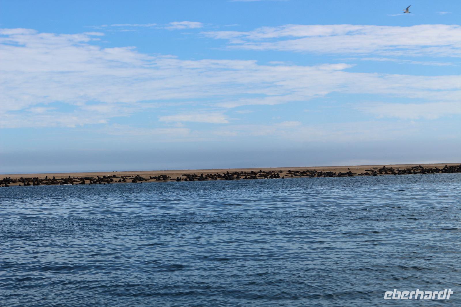 Nach einem stärkenden Frühstück fuhren wir alle gemeinsam heute wieder zurück nach Walvis Bay, wo wir auch gestern schon eine kurze Rundfahrt mit dem Bus unternommen hatten. Heute fuhren wir allerdings direkt zum Hafen, wo wir kurz darauf an Bord eines Katamarans gingen. Hier wurden wir sogleich vom Kapitän in deutscher Sprache herzlich begrüßt. Schon nach wenigen Minuten bekamen wir Besuch von der Robbe Eddi, welche noch recht jung ist. Sie ließ sich gern von uns füttern und posierte für unsere Fotos, bevor sie den Weg zurück ins Meer suchte. Kurze Spät später erreichten wir die Austernbänke, worüber uns viel Wissenswertes erzählt wurde. Auch die Bohrinseln und die dazugehörigen Schiffe, welche inmitten des Meeres parkten und auf den Anstieg des Ölpreises warteten, passierten wir. Nachdem auch eine Qualle den Weg an Bord gefunden hatte, war plötzlich ein schwarzer Küstenstreifen in der Ferne erkennbar. Hierbei handelte es sich um eine Robbenkolonie, sodass wir uns schon kurz darauf inmitten dieser Tiere befanden. Sie besiedelten die ganze Sandbank und sprangen auf beiden Seiten des Bootes durch die Lüfte. Wir alle waren ganz begeistert und wussten gar nicht, wo wir zuerst hinschauen sollten. Viel zu schnell ließen wir diese wunderbaren Tiere hinter uns und entdeckten stattdessen aber Delphine, genauer gesagt Benguela Delphine. Diese zeigten sich uns jedoch nur aus der Ferne. Während wir unsere Seefahrt genossen, bereitete die aus 2 Männern bestehende Crew schon unseren Mittagssnack vor. Mit einem Glas Sekt stießen wir zunächst auf das heutige Bergfest unserer wunderschönen Reise an. Schließlich verkosteten wir die frischen Austern, welche die besten der Welt sein sollen. Der eine oder andere schmeckte dabei auch tatsächlich den Unterschied zu den in anderen Ländern verzehrten Austern. Weiterhin gab es eine vielfältige Auswahl verschiedenster Leckereien für uns. Kurz bevor wir wieder im Hafen ankamen, besuchte uns eine weitere Robbe. Diese ließ sich gern von uns streicheln und der eine oder andere hatte auch die Möglichkeit, dieses Tier für einen Moment auf dem Schoß zu haben. Was für ein Erlebnis!