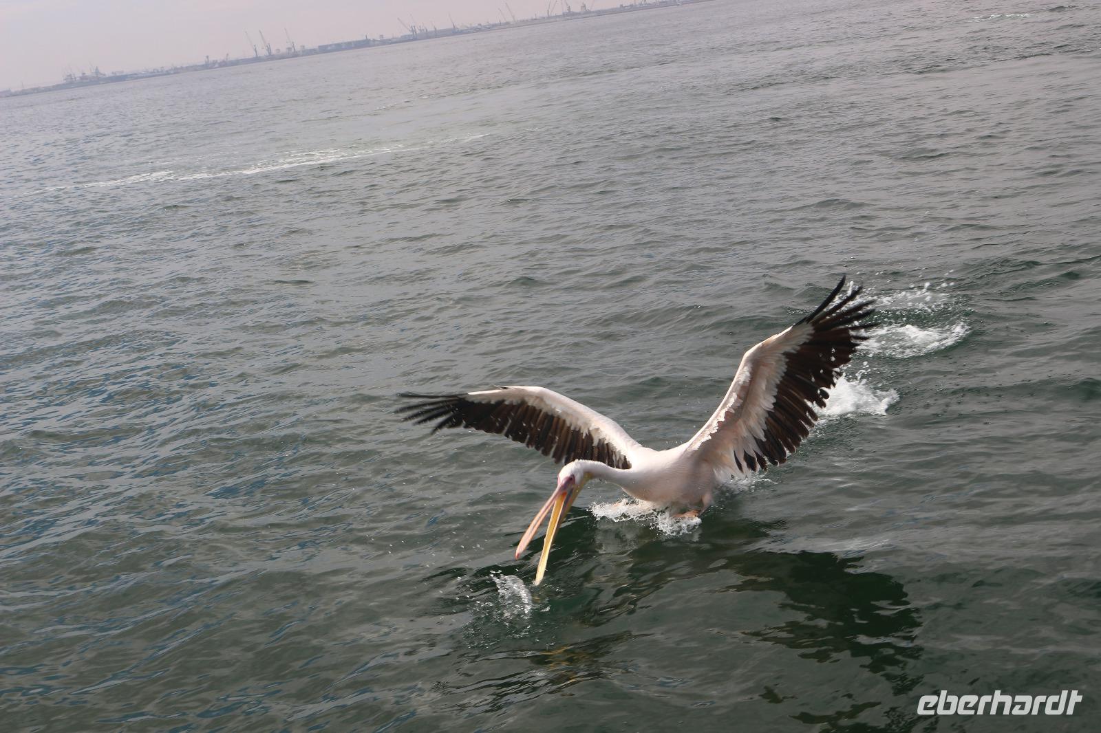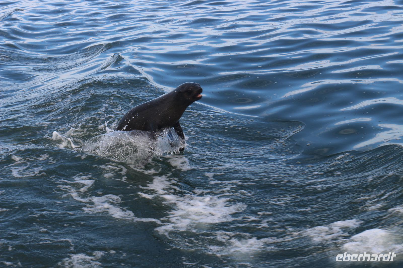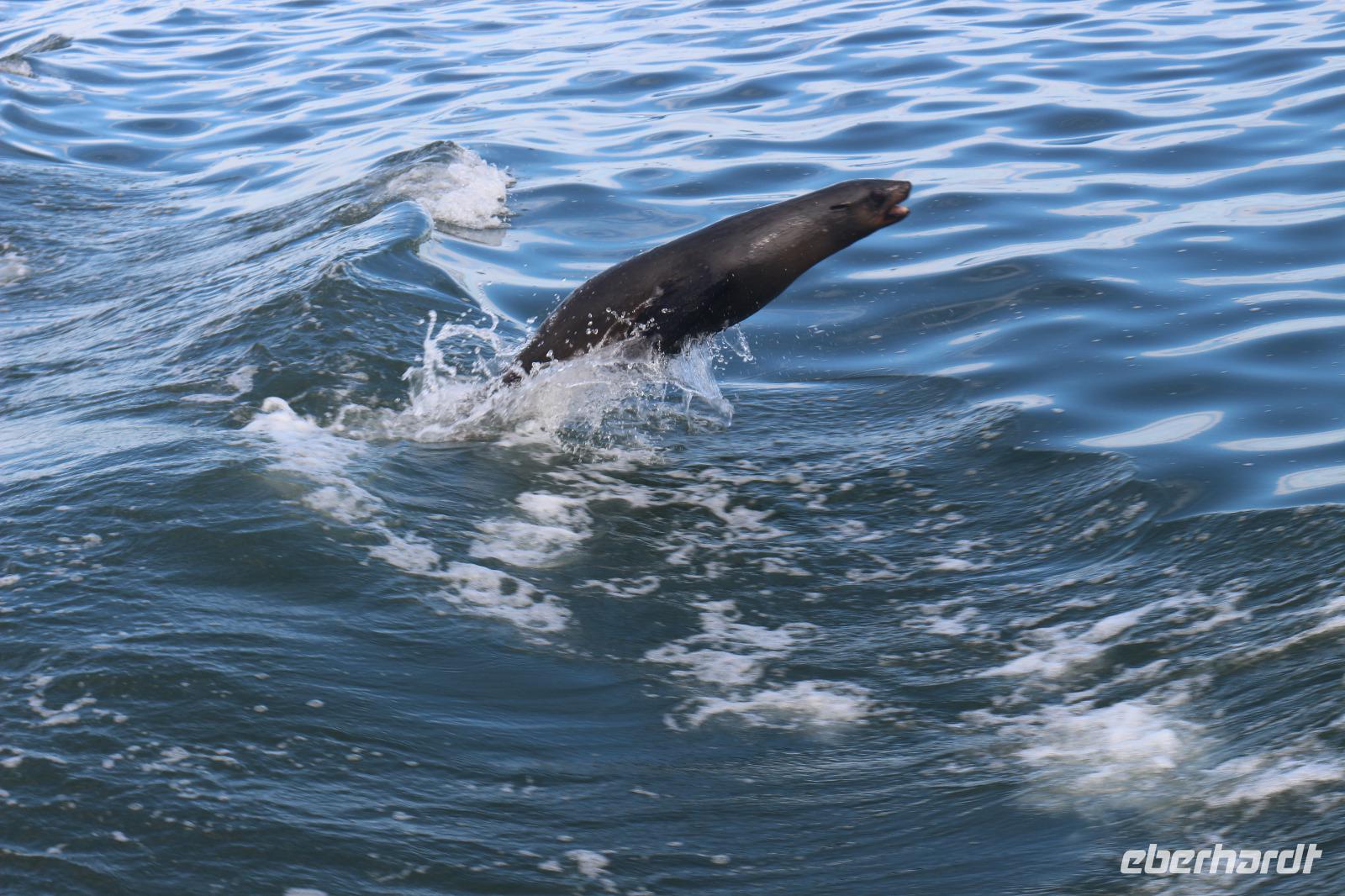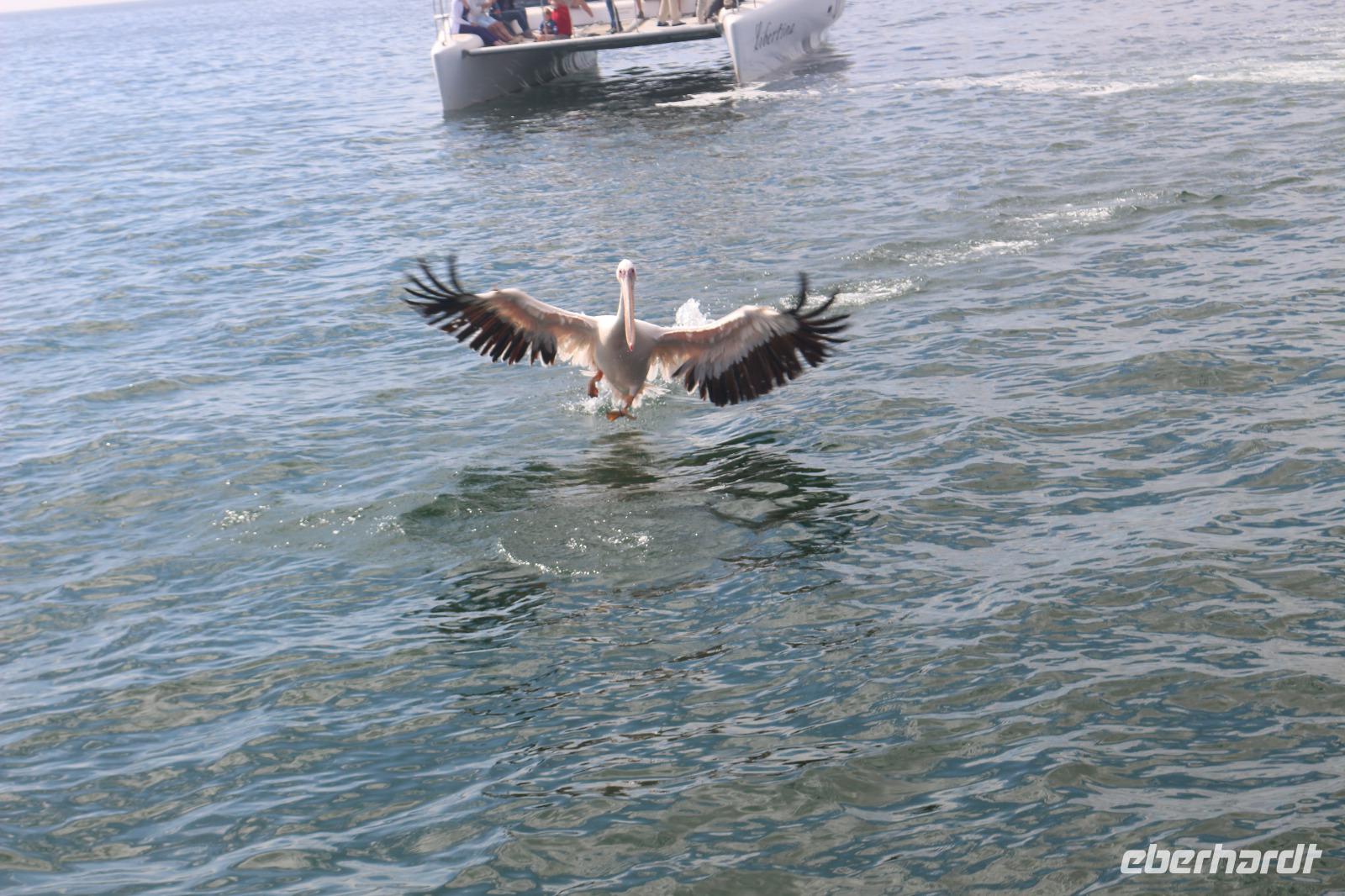 Nach einem stärkenden Frühstück fuhren wir alle gemeinsam heute wieder zurück nach Walvis Bay, wo wir auch gestern schon eine kurze Rundfahrt mit dem Bus unternommen hatten. Heute fuhren wir allerdings direkt zum Hafen, wo wir kurz darauf an Bord eines Katamarans gingen. Hier wurden wir sogleich vom Kapitän in deutscher Sprache herzlich begrüßt. Schon nach wenigen Minuten bekamen wir Besuch von der Robbe Eddi, welche noch recht jung ist. Sie ließ sich gern von uns füttern und posierte für unsere Fotos, bevor sie den Weg zurück ins Meer suchte. Kurze Spät später erreichten wir die Austernbänke, worüber uns viel Wissenswertes erzählt wurde. Auch die Bohrinseln und die dazugehörigen Schiffe, welche inmitten des Meeres parkten und auf den Anstieg des Ölpreises warteten, passierten wir. Nachdem auch eine Qualle den Weg an Bord gefunden hatte, war plötzlich ein schwarzer Küstenstreifen in der Ferne erkennbar. Hierbei handelte es sich um eine Robbenkolonie, sodass wir uns schon kurz darauf inmitten dieser Tiere befanden. Sie besiedelten die ganze Sandbank und sprangen auf beiden Seiten des Bootes durch die Lüfte. Wir alle waren ganz begeistert und wussten gar nicht, wo wir zuerst hinschauen sollten. Viel zu schnell ließen wir diese wunderbaren Tiere hinter uns und entdeckten stattdessen aber Delphine, genauer gesagt Benguela Delphine. Diese zeigten sich uns jedoch nur aus der Ferne. Während wir unsere Seefahrt genossen, bereitete die aus 2 Männern bestehende Crew schon unseren Mittagssnack vor. Mit einem Glas Sekt stießen wir zunächst auf das heutige Bergfest unserer wunderschönen Reise an. Schließlich verkosteten wir die frischen Austern, welche die besten der Welt sein sollen. Der eine oder andere schmeckte dabei auch tatsächlich den Unterschied zu den in anderen Ländern verzehrten Austern. Weiterhin gab es eine vielfältige Auswahl verschiedenster Leckereien für uns. Kurz bevor wir wieder im Hafen ankamen, besuchte uns eine weitere Robbe. Diese ließ sich gern von uns streicheln und der eine oder andere hatte auch die Möglichkeit, dieses Tier für einen Moment auf dem Schoß zu haben. Was für ein Erlebnis!