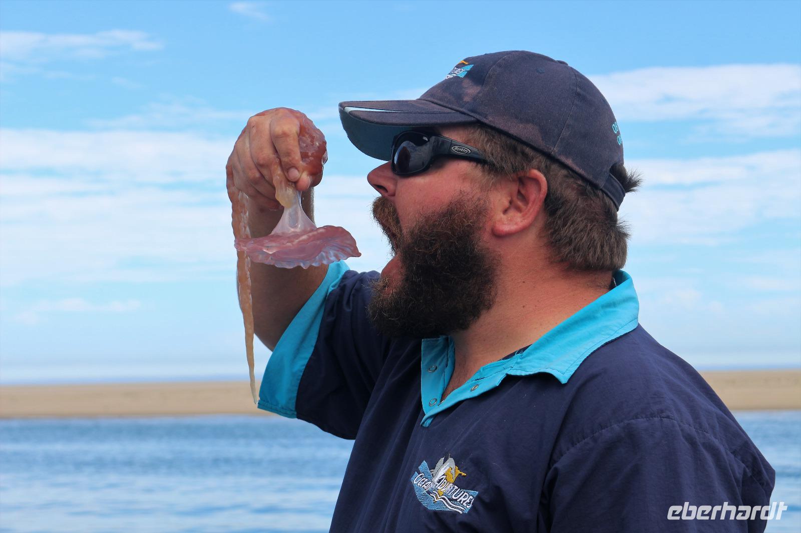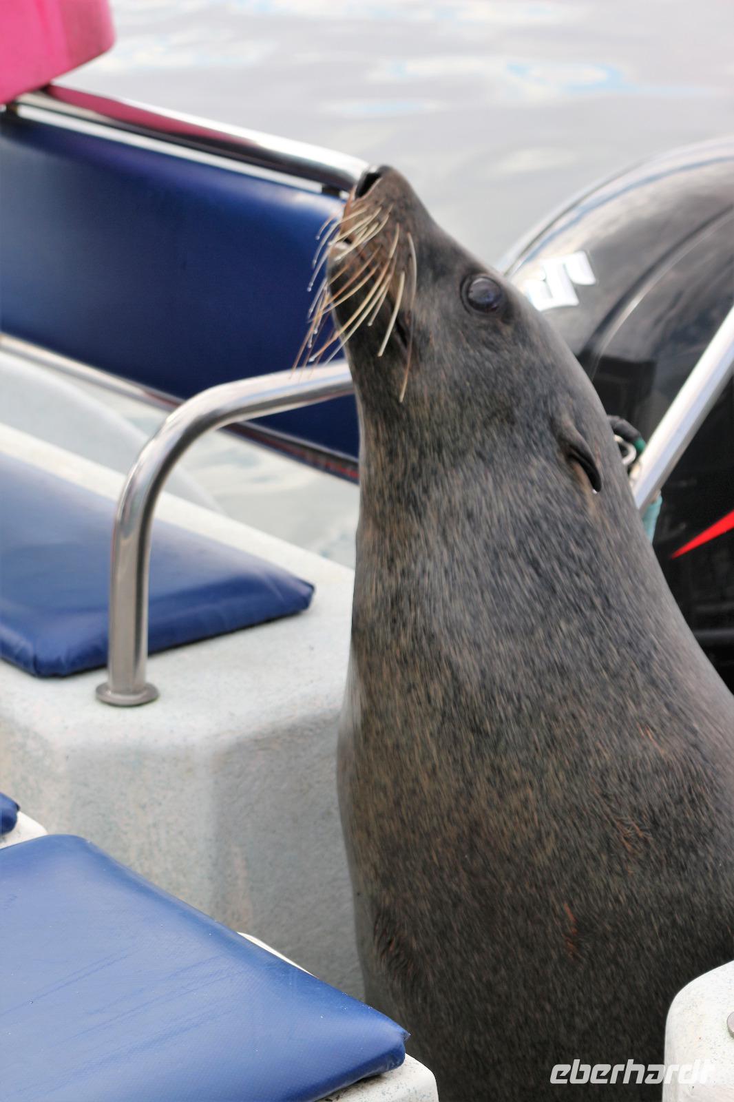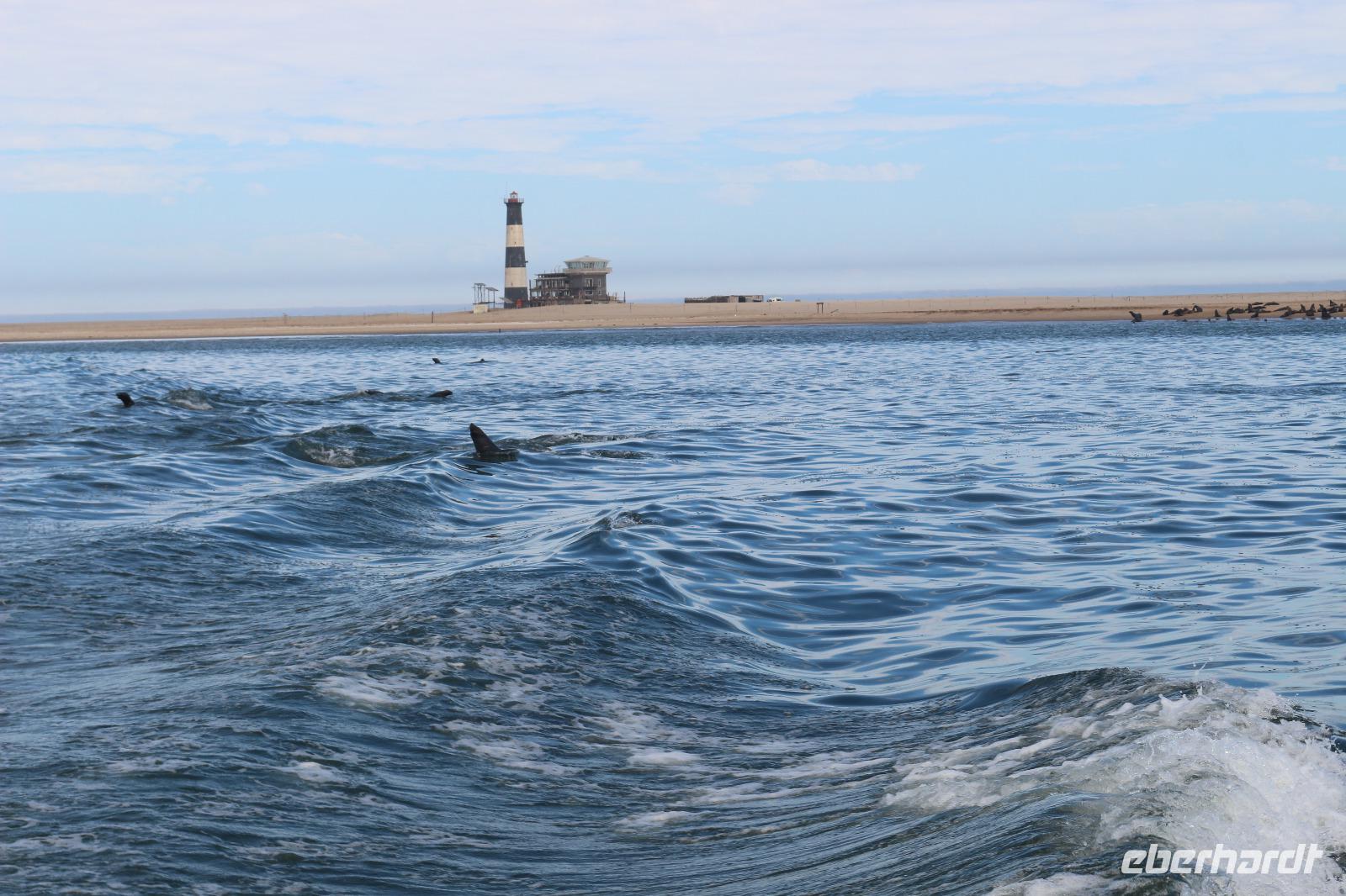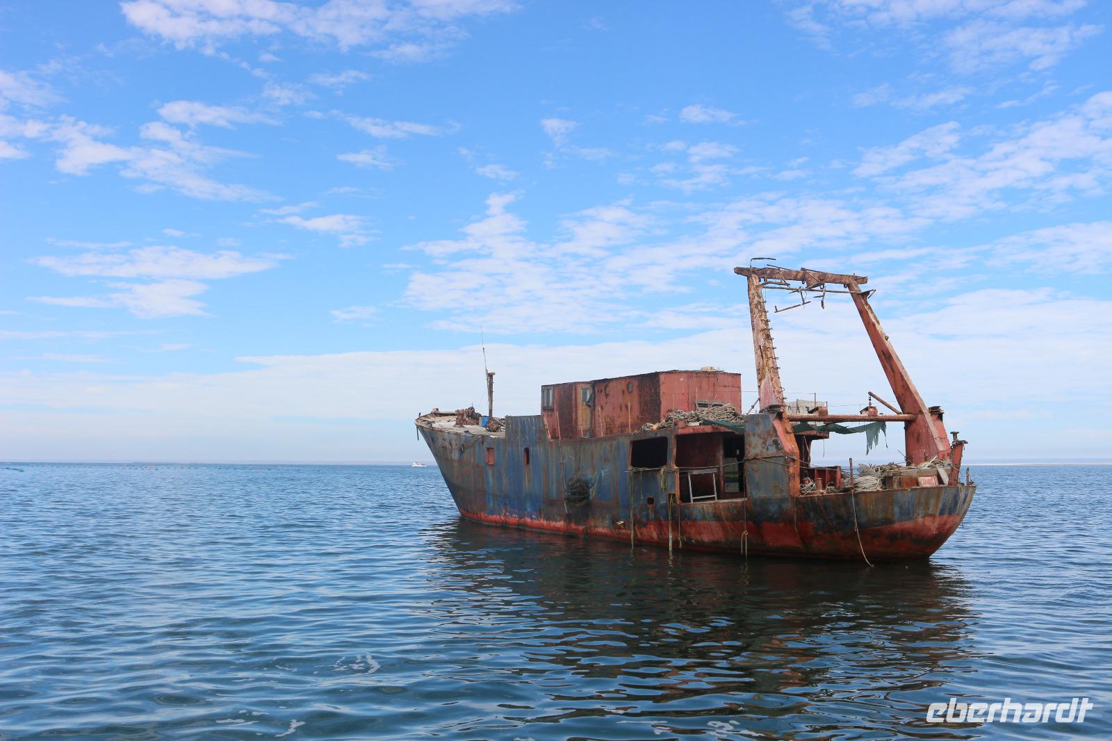 Nach einem stärkenden Frühstück fuhren wir alle gemeinsam heute wieder zurück nach Walvis Bay, wo wir auch gestern schon eine kurze Rundfahrt mit dem Bus unternommen hatten. Heute fuhren wir allerdings direkt zum Hafen, wo wir kurz darauf an Bord eines Katamarans gingen. Hier wurden wir sogleich vom Kapitän in deutscher Sprache herzlich begrüßt. Schon nach wenigen Minuten bekamen wir Besuch von der Robbe Eddi, welche noch recht jung ist. Sie ließ sich gern von uns füttern und posierte für unsere Fotos, bevor sie den Weg zurück ins Meer suchte. Kurze Spät später erreichten wir die Austernbänke, worüber uns viel Wissenswertes erzählt wurde. Auch die Bohrinseln und die dazugehörigen Schiffe, welche inmitten des Meeres parkten und auf den Anstieg des Ölpreises warteten, passierten wir. Nachdem auch eine Qualle den Weg an Bord gefunden hatte, war plötzlich ein schwarzer Küstenstreifen in der Ferne erkennbar. Hierbei handelte es sich um eine Robbenkolonie, sodass wir uns schon kurz darauf inmitten dieser Tiere befanden. Sie besiedelten die ganze Sandbank und sprangen auf beiden Seiten des Bootes durch die Lüfte. Wir alle waren ganz begeistert und wussten gar nicht, wo wir zuerst hinschauen sollten. Viel zu schnell ließen wir diese wunderbaren Tiere hinter uns und entdeckten stattdessen aber Delphine, genauer gesagt Benguela Delphine. Diese zeigten sich uns jedoch nur aus der Ferne. Während wir unsere Seefahrt genossen, bereitete die aus 2 Männern bestehende Crew schon unseren Mittagssnack vor. Mit einem Glas Sekt stießen wir zunächst auf das heutige Bergfest unserer wunderschönen Reise an. Schließlich verkosteten wir die frischen Austern, welche die besten der Welt sein sollen. Der eine oder andere schmeckte dabei auch tatsächlich den Unterschied zu den in anderen Ländern verzehrten Austern. Weiterhin gab es eine vielfältige Auswahl verschiedenster Leckereien für uns. Kurz bevor wir wieder im Hafen ankamen, besuchte uns eine weitere Robbe. Diese ließ sich gern von uns streicheln und der eine oder andere hatte auch die Möglichkeit, dieses Tier für einen Moment auf dem Schoß zu haben. Was für ein Erlebnis!