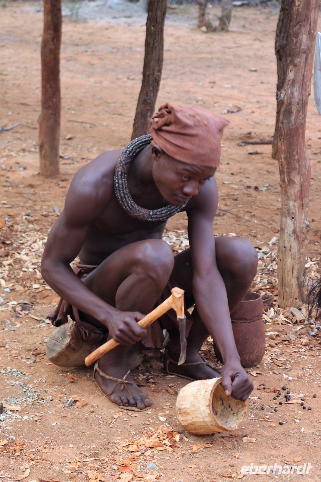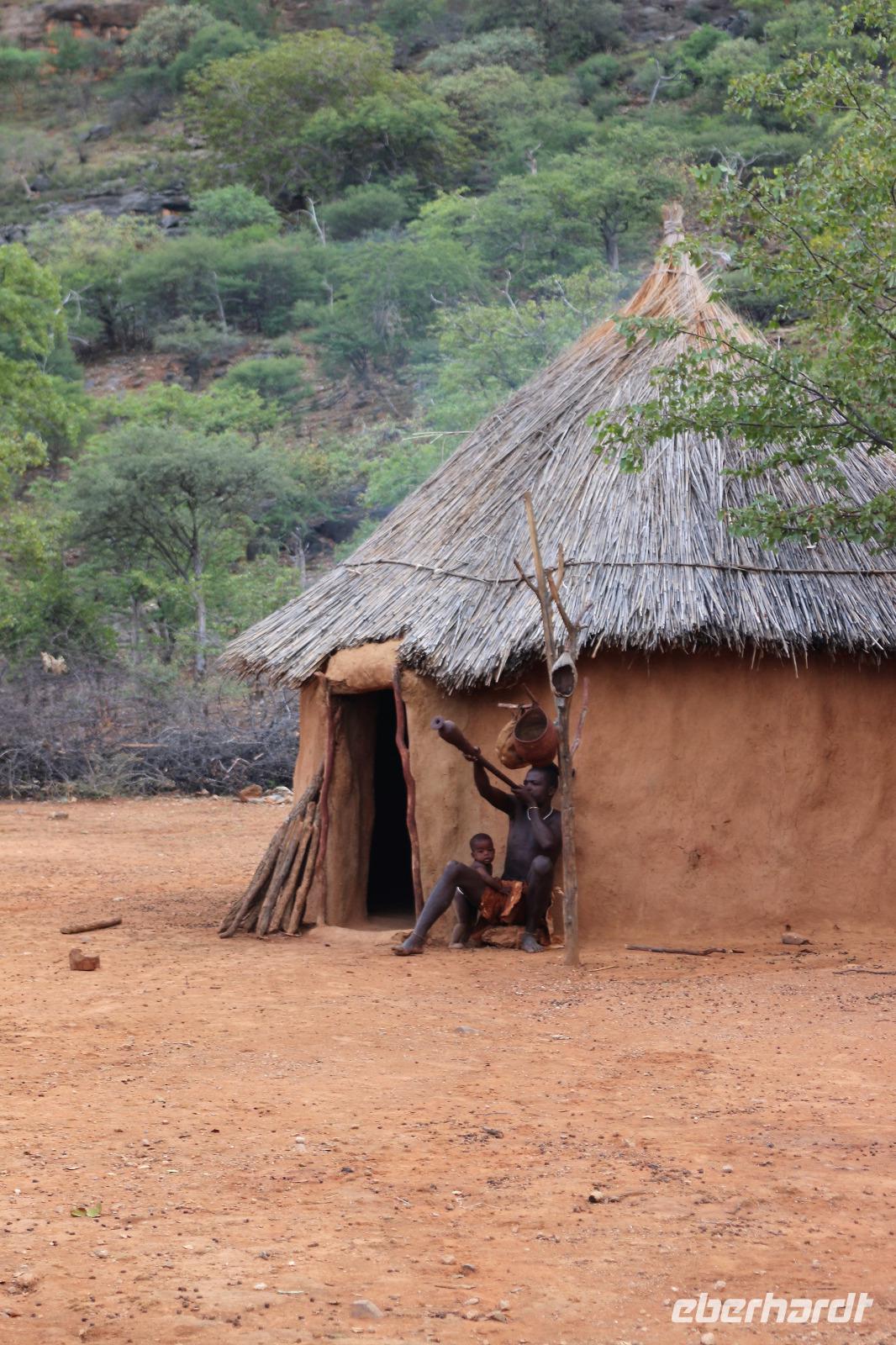 Heute gab es für uns schon etwas eher als gewohnt Frühstück und eine halbe Stunde eher als sonst verließen wir unsere Lodge, in die wir am Abend jedoch zurückkehren würden. Unser Fahrer und Reiseleiter Henner hatte heute deutlich weniger zu tun als sonst, denn der Ausflug war von der Lodge organisiert und so fuhren wir mit Fahrzeugen der Lodge mit ihren eigenen Fahrern. Wir verteilten uns nach einer kurzen Einweisung in die Traditionen der Himbas auf zwei Fahrzeuge und fuhren in Richtung Norden. Schon bald erreichten wir das Himbadorf, welches ein lebendes Museum ist. Die ansässigen Himbas zeigten uns ihre Hütten und wir bekamen viel Wissenswertes dazu erklärt. Auch durften wir ins Innere einer Hütte eintreten und sogar ein traditionelles Himba-Musikinstrument ausprobieren. Wir waren beeindruckt von dieser Kultur und wie zufrieden die Menschen schienen, obwohl sie in für uns unvorstellbaren Verhältnissen lebten. Anschließend wurde für uns ein traditioneller Tanz aufgeführt und wir bekamen Demonstrationen von Jagd- und Kampfszenen. Besonderer Höhepunkt bei der Vorführung der Jagdszene war der Löwe in Form eines kleinen und unglaublich niedlichen Kindes, welches wir alle sofort ins Herz geschlossen hatten. Mit vielen neuen Eindrücken verließen wir das Dorf wieder und ließen schließlich auch einen Teil unserer mitgebrachten Gastgeschenke hier.