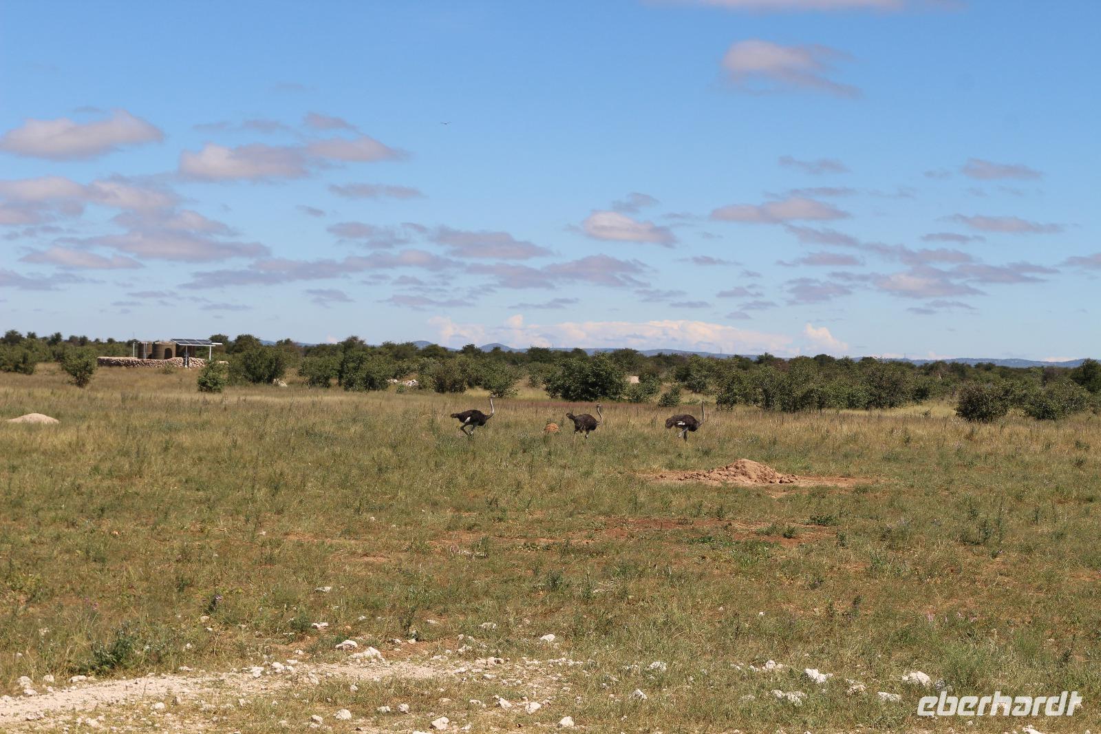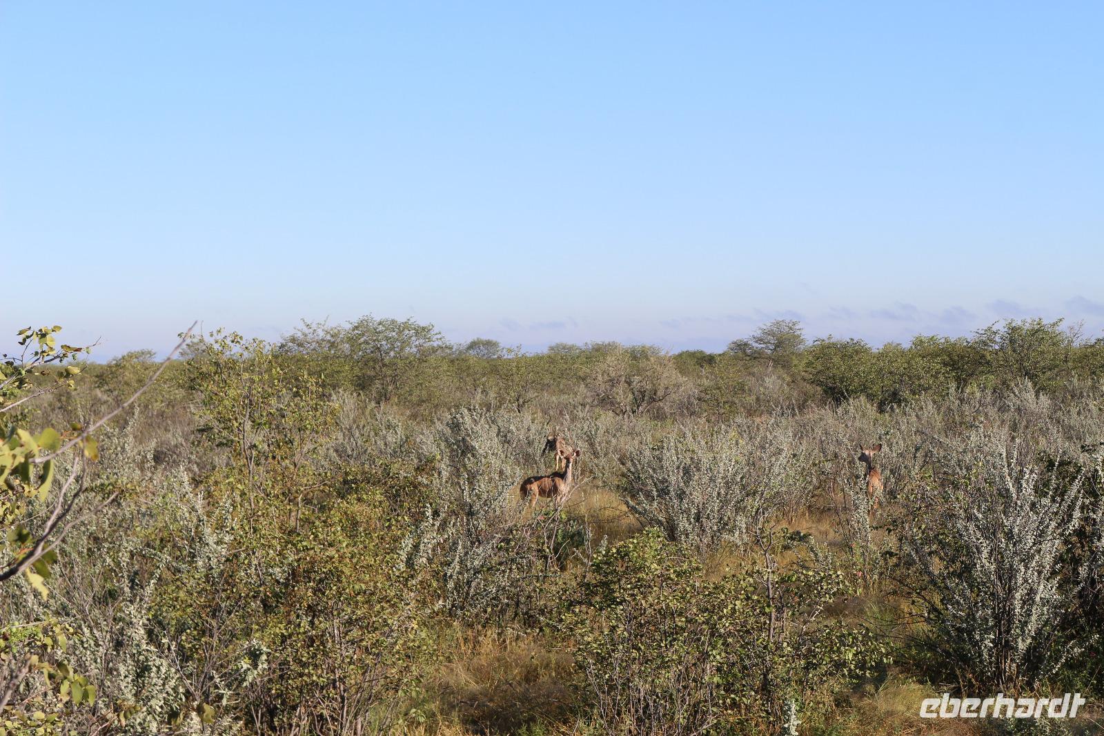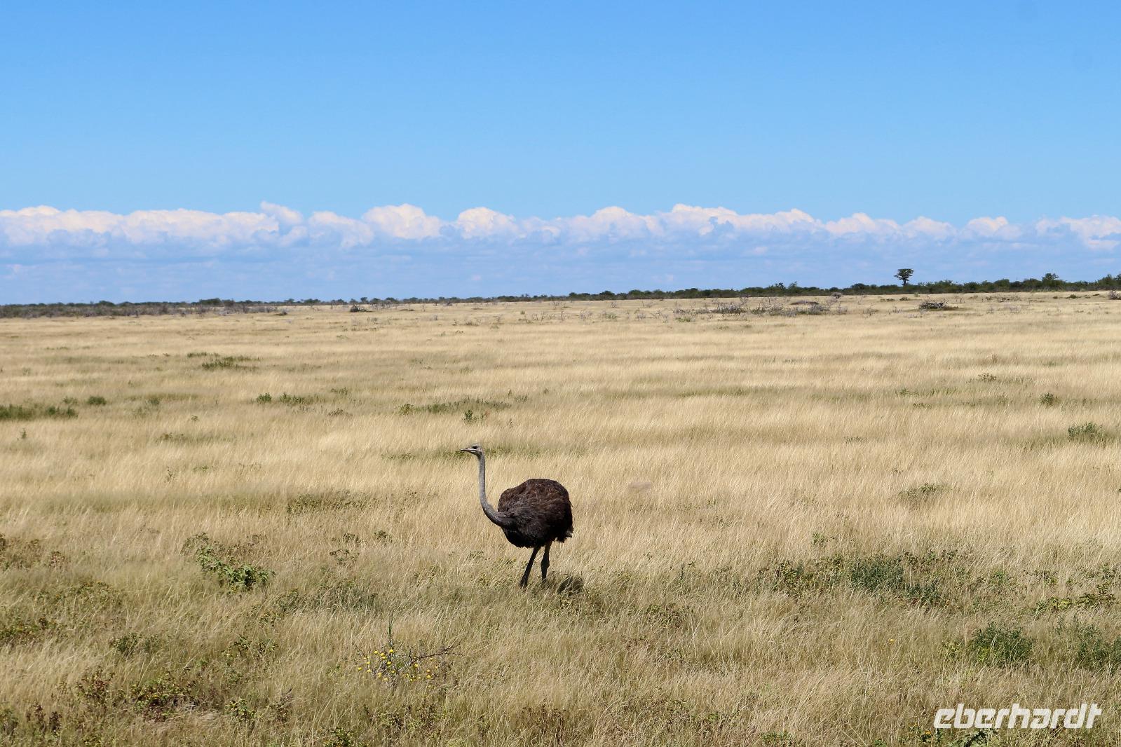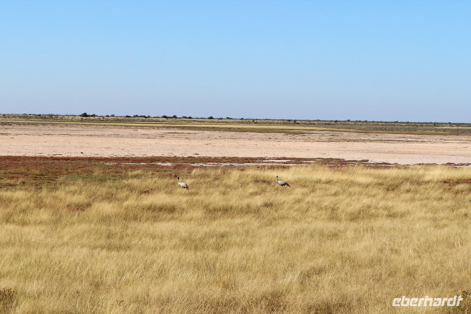 Heute gab es für uns schon 6.00 Uhr Frühstück, sodass wir uns direkt 7.00 Uhr auf den Weg in den Etosha Nationalpark machen konnten. Voller Erwartungen passierten wir das Anderson Gate. Schon wenig später fanden wir die ersten noch ganz frischen Spuren von Elefanten und Nashörnern, kurz darauf auch von Leoparden. Doch trotz intensiver Bemühungen konnten wir die dazugehörigen Tiere nicht erspähen. Stattdessen zeigten sich uns Warzenschweine, Kudus, Schakale und verschiedene Vögel, wie beispielsweise Riesentrappe, Gackeltrappe und Paradieskranich. Nach einer ersten kurzen Pause im Okaukuejo Resort fuhren wir in den östlicheren Teil des Parkes, in der Hoffnung dort die eine oder andere große Katze vorzufinden. Jedoch war dies wenig erfolgreich, sodass uns nur Springböcke, Oryx und Impalas vor die Linse liefen. So beschlossen wir nach unserer Mittagspause im Okaukuejo Resort wieder in den westlicheren Teil des Nationalparkes zu fahren, wo wir gestern recht erfolgreich gewesen waren. Doch heute war das Glück nicht auf unserer Seite, sodass wir nur Zebras und Giraffen entdecken konnten. Ohne die erhofften großen Erfolge fuhren wir zurück zu unserer Lodge. Unsere gute Laune ließen wir uns jedoch keinesfalls verderben und so genossen wir ein kühles Bier bei bester Aussicht auf der Terrasse oder unternahmen den einen oder anderen Spaziergang durch die weitläufige Anlage. Nach einem sehr guten Abendessen ließen wir den Tag noch gemeinsam an der Bar ausklingen.