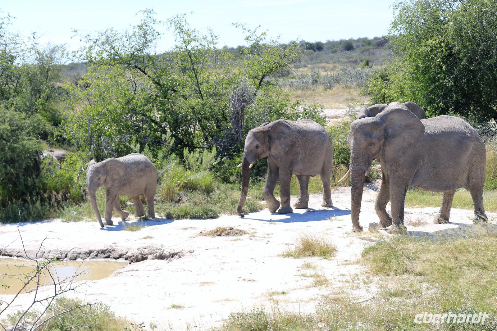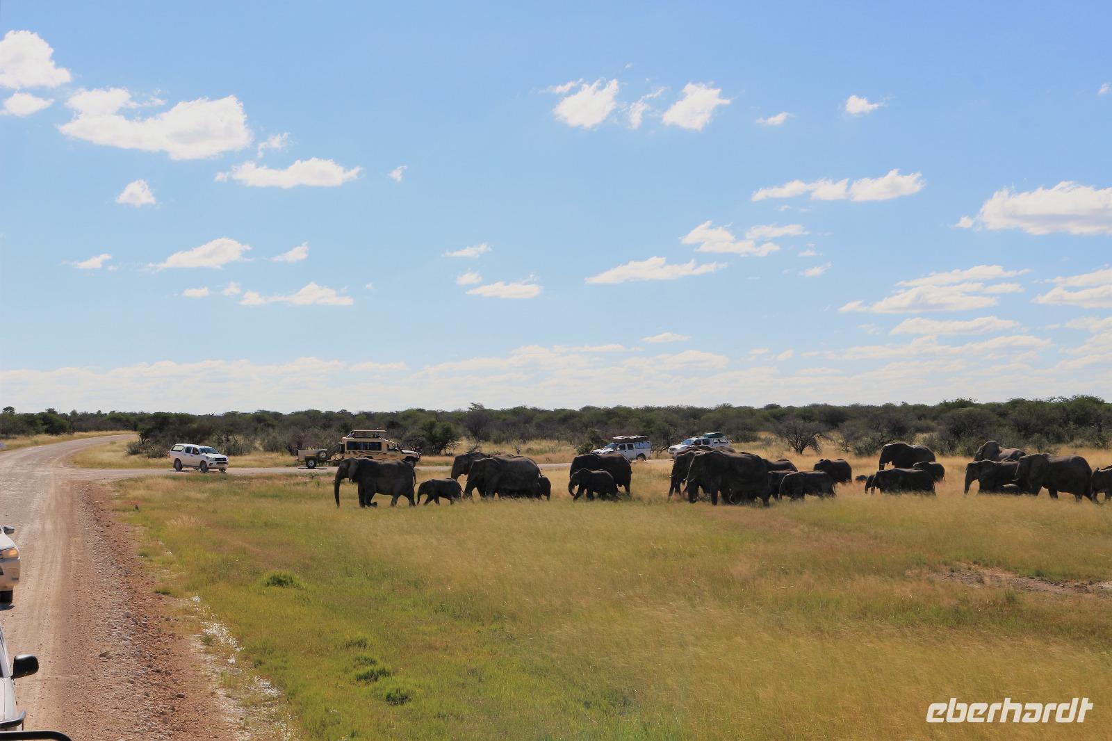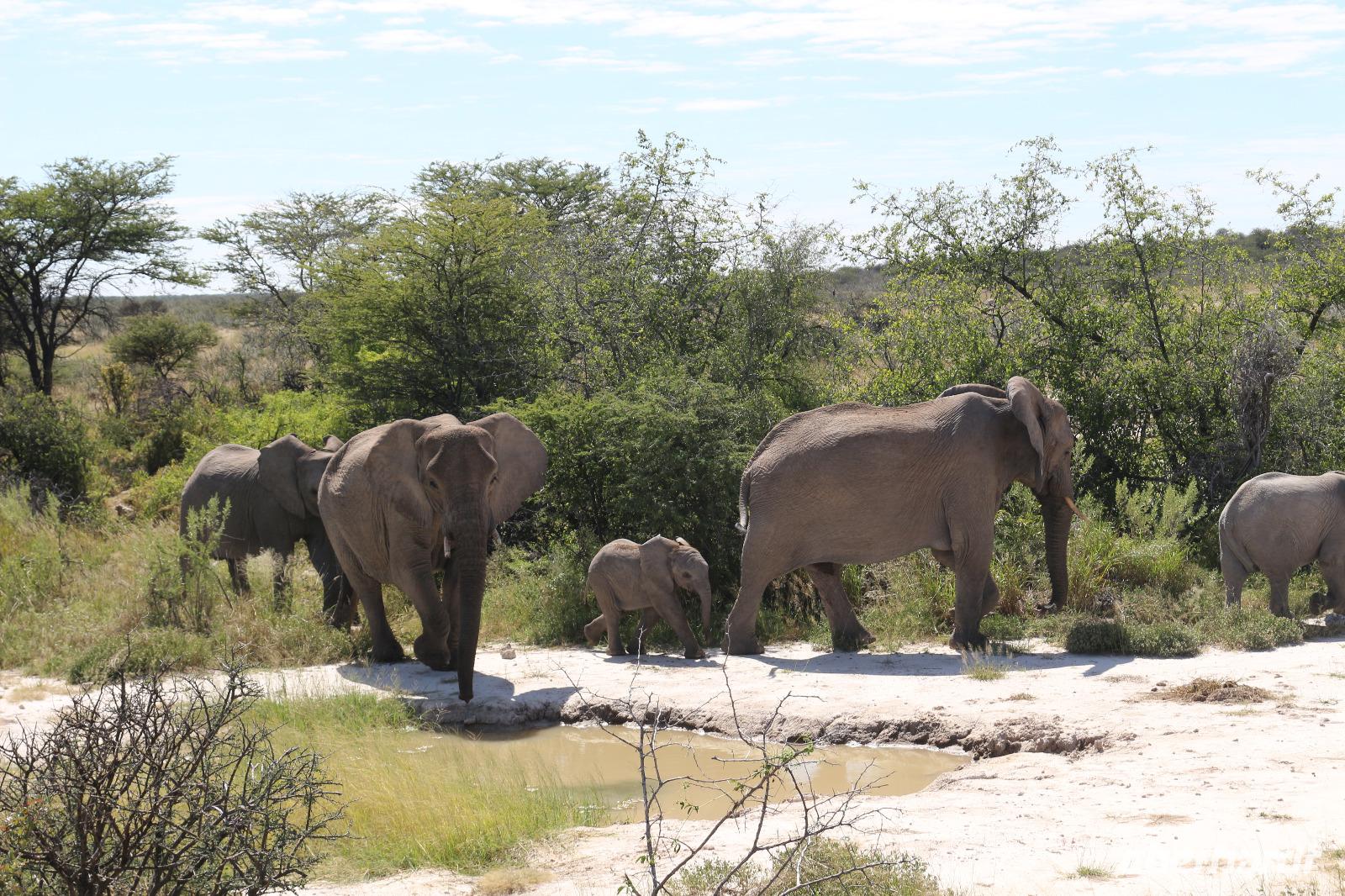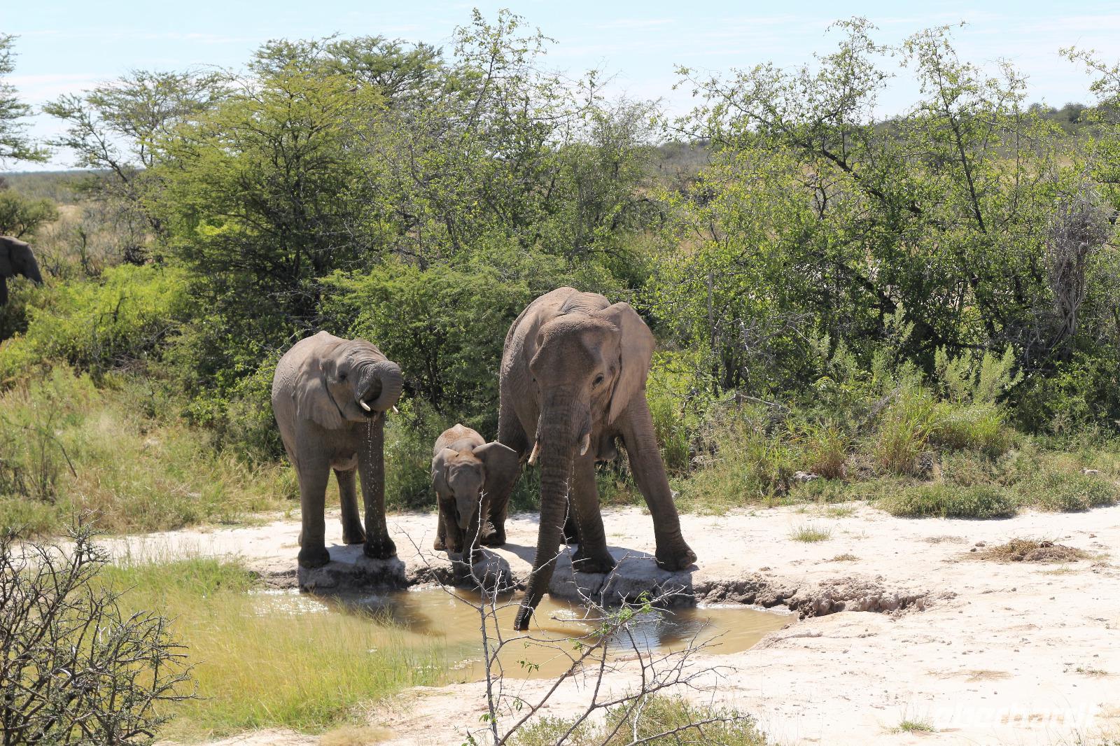Heute verließen wir Okaukuejo schon am frühen Morgen und fuhren in Richtung Osten. Trotz der weniger erfolgreichen letzten Tage waren wir guter Dinge und gespannt auf das, was uns heute erwarten würde. Schon nach einigen Minuten entdeckten wir eine Tüpfelhyäne sowie einige Schabrackenschakale, was uns optimistisch stimmte. Auf unserem Weg nach Namutoni zeigten sich uns schließlich auch vier Löwen unweit der Straße, welche wir voller Freude beobachteten und fotografierten. Nach einem kurzen Stop in Namutoni verließen wir das Camp vorerst wieder und fuhren in Richtung Norden, in der Hoffnung, dort Elefanten anzutreffen. Doch zuvor zeigte sich uns an einem Wasserloch das lang herbeigesehnte Nashorn, auf welches wir gestern Abend vergeblich gewartet hatten. Doch auch die Elefanten ließen nicht lang auf sich warten und schon wenige Minuten später fanden wir eine große Herde am Straßenrand vor. Begeistert beobachteten wir, wie ein Elefant nach dem anderen direkt vor unserem Bus die Straße überquerte, um sich dort im Schlamm zu suhlen und Wasser aus einer großen Pfütze zu trinken. Besonders putzig waren die kleinen Elefantenbabys, welche gerade mal ein halbes Jahr alt waren. Wir konnten uns gar nicht satt sehen an diesen Tieren, welche uns unsere bisher vergeblichen Pirschfahrten schnell vergessen ließen. Auf dem Weg zurück nach Namutoni begegneten wir den Elefanten wieder. Dabei fanden wir sie auf der Straße vor, wo sie uns den Weg versperrten und uns damit zum Anhalten zwangen. Doch dies war eine sehr willkommene Pause und nur zu gern beobachteten wir die gewaltigen Tiere. Ein besonders temperamentvoller Halbstarker erregte dabei unsere Aufmerksamkeit, als dieser ganz wild und mit lautem Trompeten durch das Gebüsch sprang. Auch zwei Nashörner zeigten sich uns schließlich. Nach einiger Zeit überlegten sich die Elefanten, die Straße nun doch wieder zu verlassen und retteten uns damit unser Mittagessen.