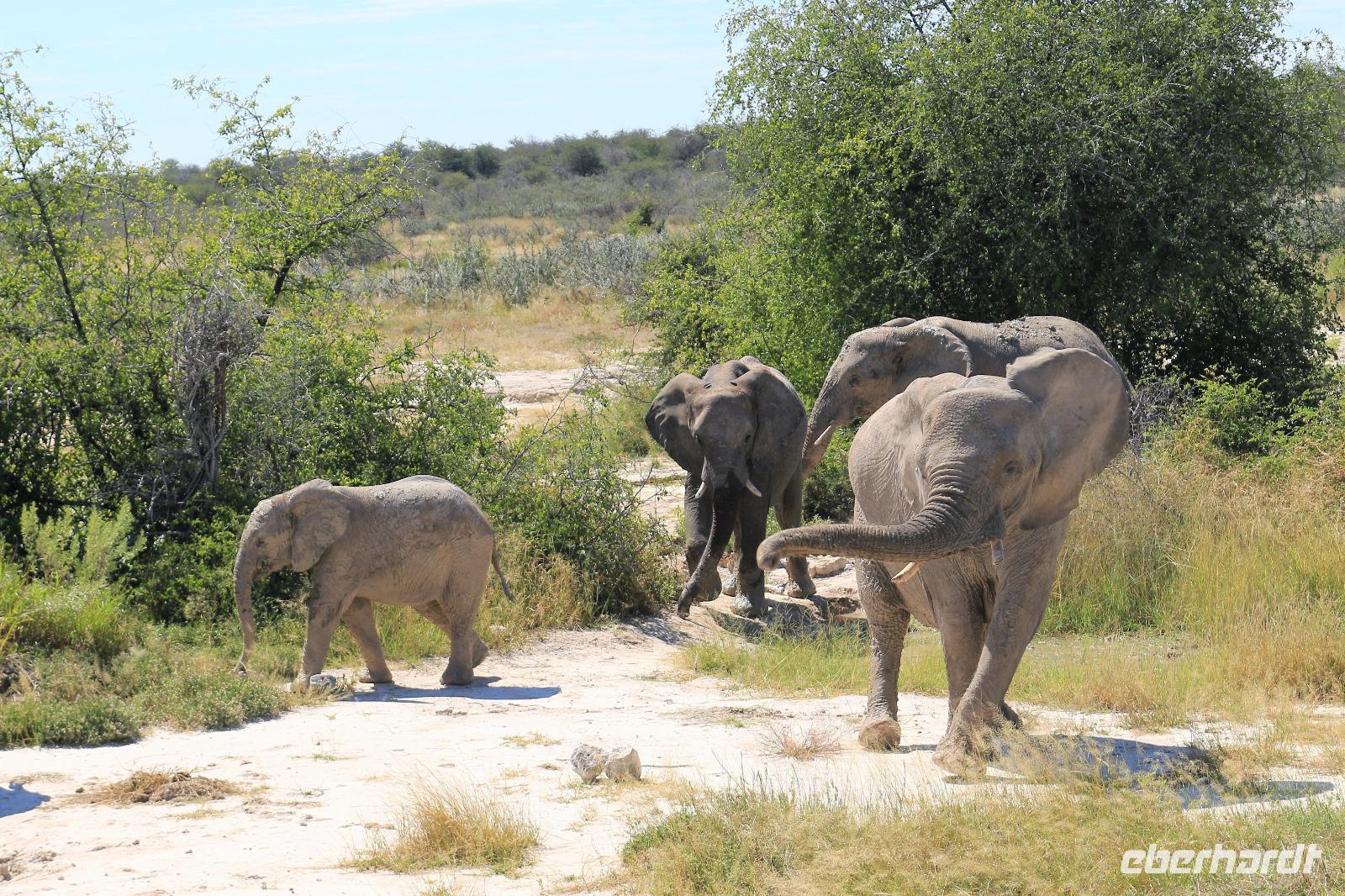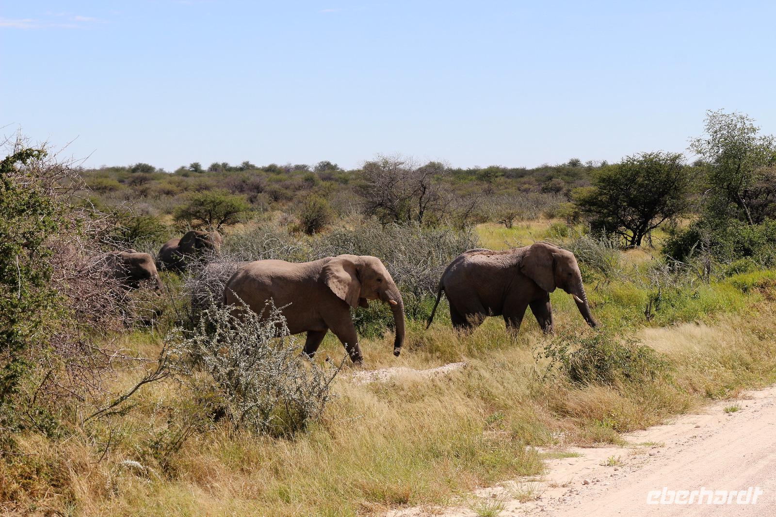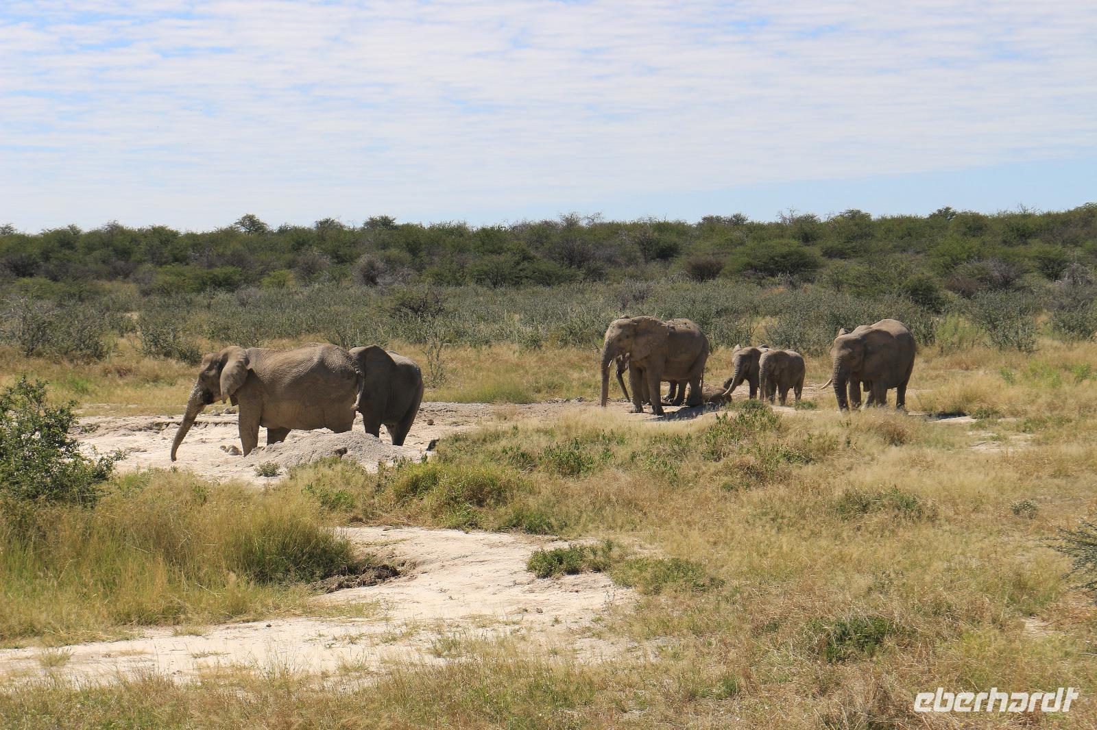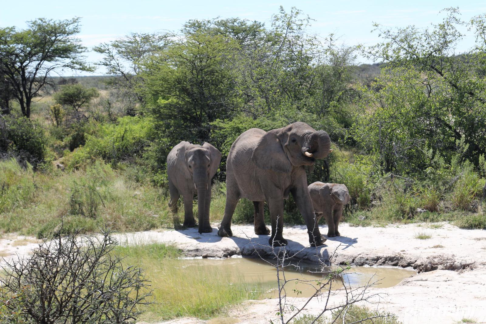 Heute verließen wir Okaukuejo schon am frühen Morgen und fuhren in Richtung Osten. Trotz der weniger erfolgreichen letzten Tage waren wir guter Dinge und gespannt auf das, was uns heute erwarten würde. Schon nach einigen Minuten entdeckten wir eine Tüpfelhyäne sowie einige Schabrackenschakale, was uns optimistisch stimmte. Auf unserem Weg nach Namutoni zeigten sich uns schließlich auch vier Löwen unweit der Straße, welche wir voller Freude beobachteten und fotografierten. Nach einem kurzen Stop in Namutoni verließen wir das Camp vorerst wieder und fuhren in Richtung Norden, in der Hoffnung, dort Elefanten anzutreffen. Doch zuvor zeigte sich uns an einem Wasserloch das lang herbeigesehnte Nashorn, auf welches wir gestern Abend vergeblich gewartet hatten. Doch auch die Elefanten ließen nicht lang auf sich warten und schon wenige Minuten später fanden wir eine große Herde am Straßenrand vor. Begeistert beobachteten wir, wie ein Elefant nach dem anderen direkt vor unserem Bus die Straße überquerte, um sich dort im Schlamm zu suhlen und Wasser aus einer großen Pfütze zu trinken. Besonders putzig waren die kleinen Elefantenbabys, welche gerade mal ein halbes Jahr alt waren. Wir konnten uns gar nicht satt sehen an diesen Tieren, welche uns unsere bisher vergeblichen Pirschfahrten schnell vergessen ließen. Auf dem Weg zurück nach Namutoni begegneten wir den Elefanten wieder. Dabei fanden wir sie auf der Straße vor, wo sie uns den Weg versperrten und uns damit zum Anhalten zwangen. Doch dies war eine sehr willkommene Pause und nur zu gern beobachteten wir die gewaltigen Tiere. Ein besonders temperamentvoller Halbstarker erregte dabei unsere Aufmerksamkeit, als dieser ganz wild und mit lautem Trompeten durch das Gebüsch sprang. Auch zwei Nashörner zeigten sich uns schließlich. Nach einiger Zeit überlegten sich die Elefanten, die Straße nun doch wieder zu verlassen und retteten uns damit unser Mittagessen.