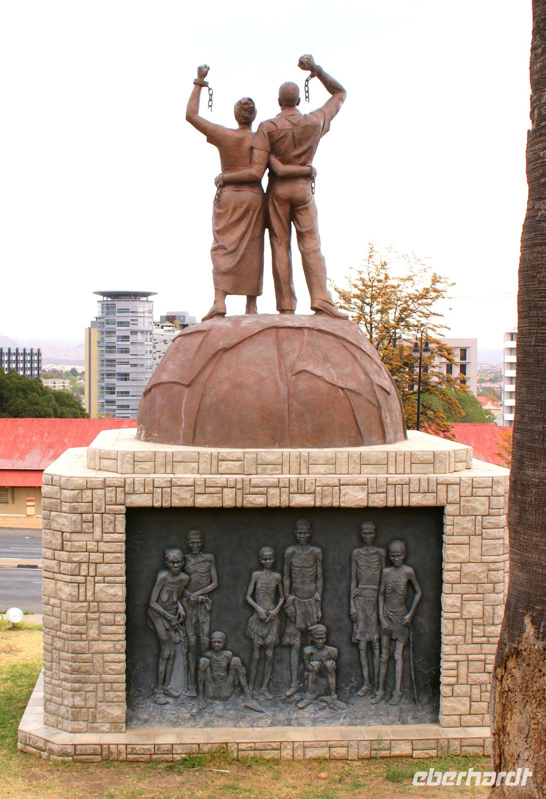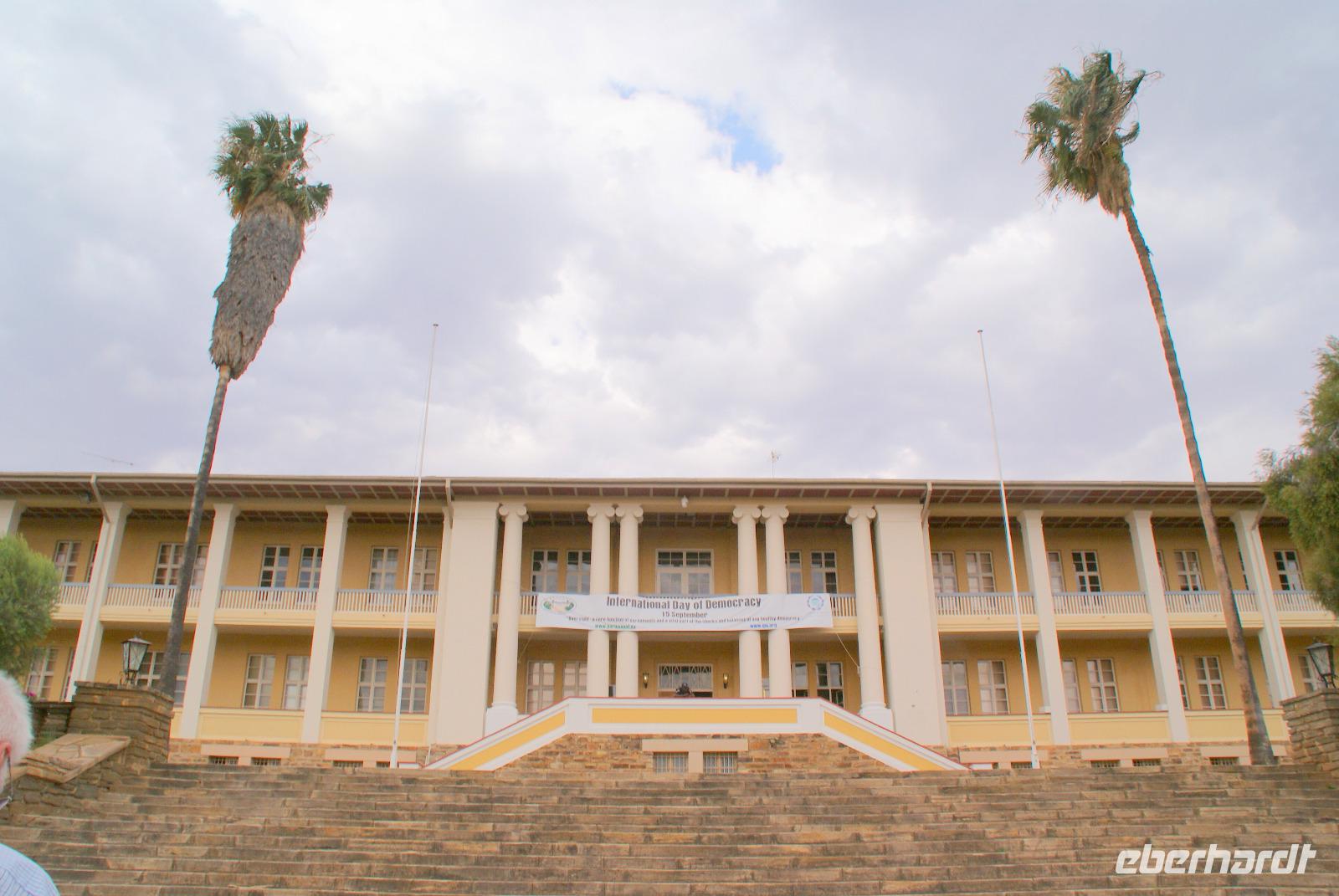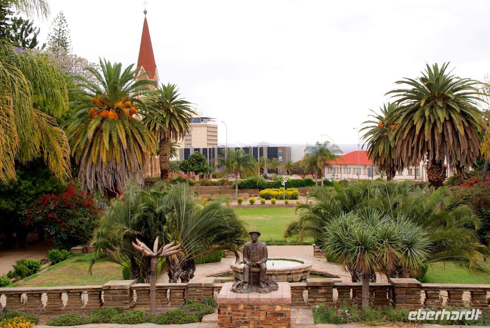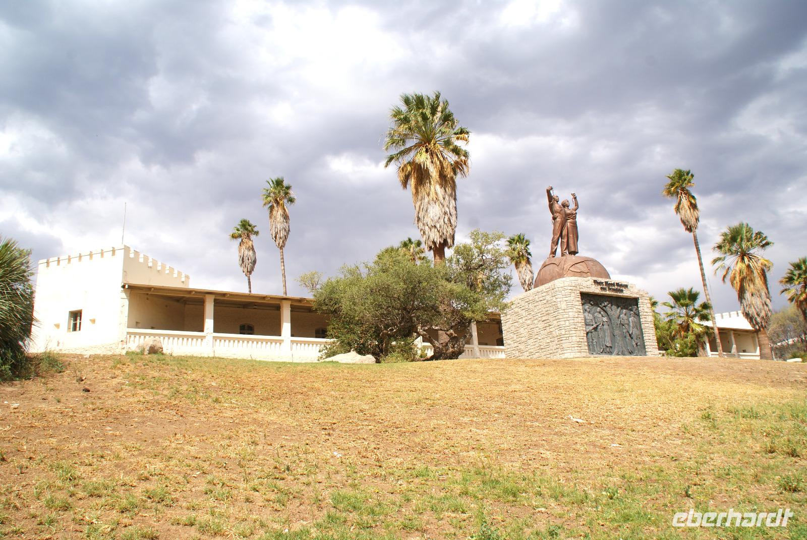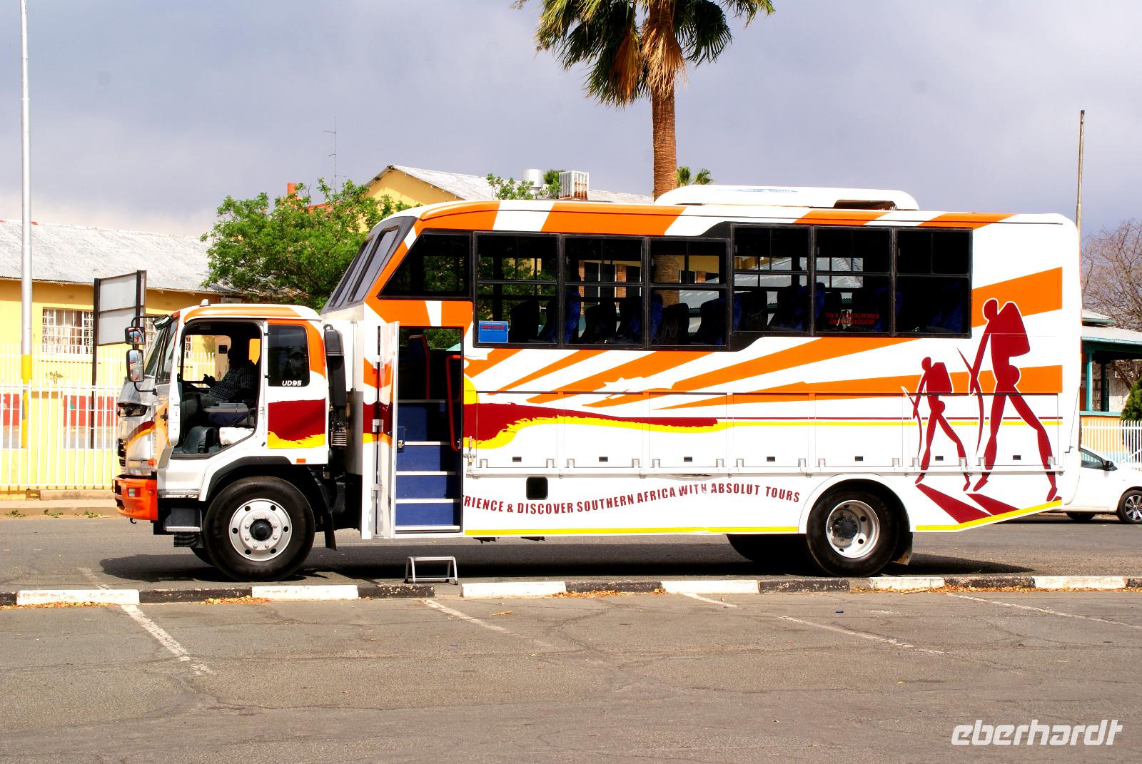 An einem wunderbaren Herbsttag macht sich unsere Reisegruppe aus den verschiedensten Winkeln Deutschlands auf um über Johannesburg nach Namibia -ins Land der Farben zu fliegen. Alles klappt wie am Schnürchen und wohlbehalten mit allen Koffern landen wir in Windhoek, der Hauptstadt Namibias. Dort werden wir herzlich von unserer örtlichen Reiseleiterin Dagmar Krause und Safaritruckfahrer Jonas begrüßt. Schnell noch Geldwechseln und schon ziehen wir zu ersten Besorgungen in die Stadt, wo wir uns mit dem noch Notwendigen für unsere Reise eindecken. Eine schöne orientierende Stadtrundfahrt erfolgt und wir schlendern entlang der malerischen evangelischen Christuskirche, die 1907 erbaut wurde, weiter zur Alten Feste. Die Alte Feste wurde 1890 zur Sicherung des Friedens errichtet. Es weht ein angenehmer Wind und wir hören, dass der Name Windhoek „Windecke" bedeutet (in der Nacht wird sich dies noch eindrucksvoll bestätigen...) Wir lassen erste Eindrücke auf uns wirken, sehen bereits imposante Jacarandabäume in voller Blüte und staunen über den schönen Park gegenüber des sogenannten Tintenpalasts. Vorbei am Völkerkundemuseum und der Kunstgalerie, fahren wir zum historischen Bahnhof, wo wir eine alte Dampflok und das schöne Interieur des Gebäudes bestaunen. Nach der längeren Anreise in den Knochen freuen wir uns über einen baldigen Check-in im schönen Hotel Thule, welches malerisch auf einem Hügel mit tollem Blick über die Stadt gelegen ist. Wir werden mit einem Glas Sekt empfangen und gerne stoßen wir auf unser bevorstehendes Abenteuer Namibia an. Den Abend rundet ein leckeres Essen im bekannten Joes's Beerhouse ab und bei Kudu und Co. lernen wir uns näher kennen.