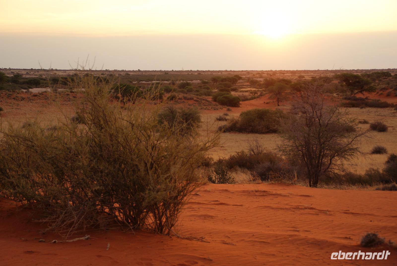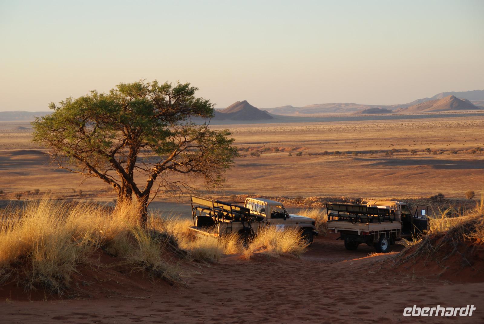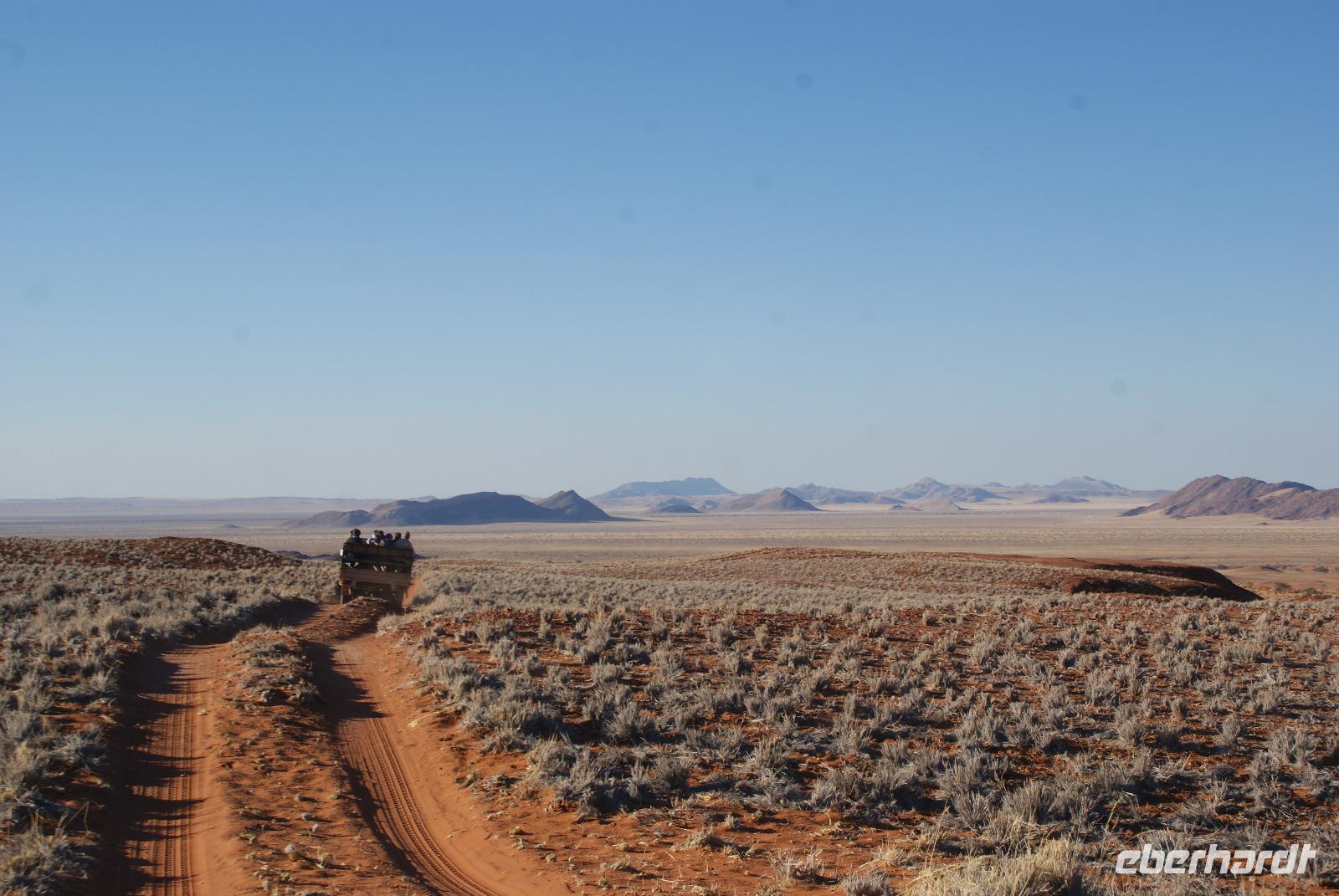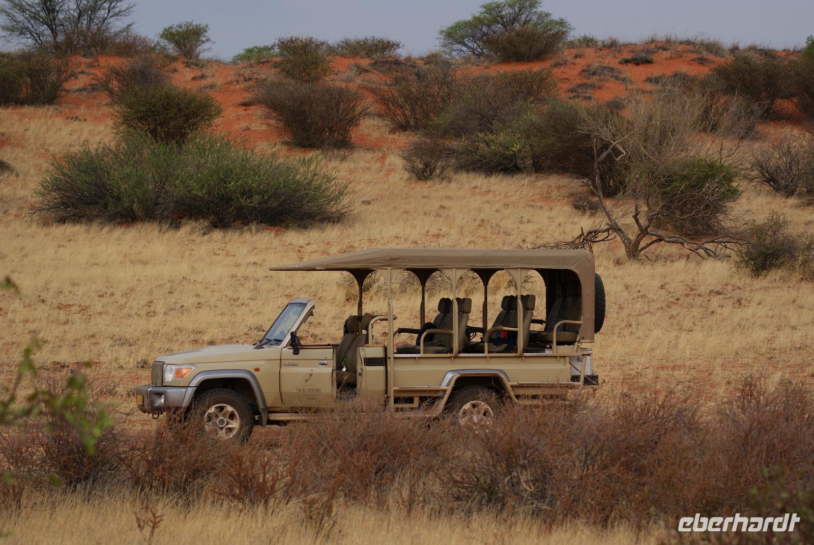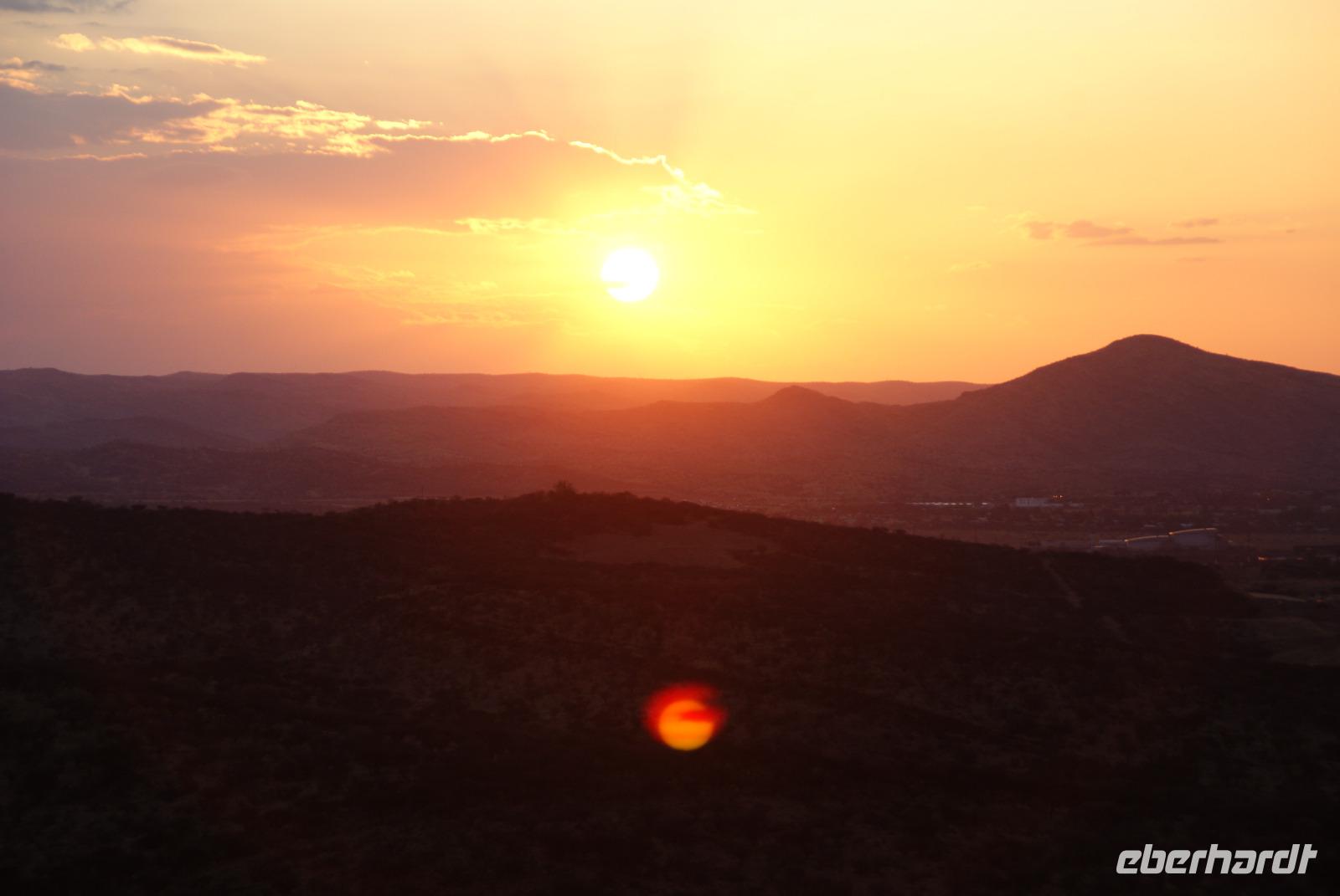 Mit viel Wind in den Ohren haben wir herrlich geschlafen und sehen uns ausgeruht und guter Dinge zum ersten Frühstück in Namibia wieder. Ein leckeres Buffet mit grandioser Aussicht auf das unter uns liegende Windhoek empfängt uns. Nachdem alle Koffer wieder verladen sind, verlassen wir die Stadt und machen uns auf Richtung Kalahari mit dem heutigen Tagesziel der Kalahari Anib Lodge. Vorbei am sogenannten „Heldenacker" mit imposantem Obelisk, welcher an den Freiheitskampf 1966 erinnern soll, fahren wir weiter und lassen die Weiten Namibias auf uns wirken. Zahlreiche Bärenpaviane säumen unsere Strecke und graben nach schmackhaften Wurzeln. Reiseleiterin Dagmar gibt uns eine schöne Einführung über viel Nützliches und Wissenswertes, was wir für unseren Aufenthalt in Namibia benötigen werden. Am frühen Nachmittag erreichen wir unsere Lodge und haben die nächsten Stunden Zeit, die jeder nach Lust und Laune mit relaxen, schwimmen im Pool oder einer Wanderung auf dem Gelände verbringen kann. Gegen 16.30 Uhr treffen sich alle zur gebuchten Sundowner Fahrt mit offenen Jeeps wieder. Unsere beiden Guides Jürgen und Levis begleiten uns auf dieser Tour und so fahren zwei Jeeps exklusiv für die Eberhardt Gäste los, um die Kalahari mit Flora, Fauna und vor allem schon den ersten Tieren kennenzulernen. Unser lustiger Guide Jürgen zeigt uns neben Termitenhügeln, Kameldornakazien auch lustige Dinge, wie den Kot des Gefängnisesels (Zebra) und auch auf eine Gruppe homo touristicos (andere Gäste) treffen wir....Spaß bei Seite...wir sehen Löcher im Boden, die sich sogenannte Erdferkel gegraben haben, halten an einer imposanten Webervogelkolonie mit unzähligen Nestern. Dort entdecken wir (also Jürgen) einen Flecken-Uhu und beobachten das Treiben der unzähligen Vögel der Kolonie. Wunderschöne Kudus stehen im Dickicht selbst die stolzen Oryx Antilopen, das Nationaltier Südafrikas bekommen wir zu sehen. Unseren Weg kreuzt ein Warzenschwein, welches auch scherzhaft Buschradio (Antenne, also der Schwanz bei Flucht nach oben) genannt wird. Ein leckeres Getränk in Form von Gin Tonic, Wein, Bier oder Softgetränk versüßt uns den herrlichen Sonnenuntergang in der Kalahari und so gut gestärkt verläuft die Rückfahrt nochmal so fröhlich. Nach so vielen schönen Eindrücken treibt uns der Hunger ans reichhaltige Buffet und in geselliger Runde lassen wir uns ein köstliches Abendessen besonders gut schmecken.