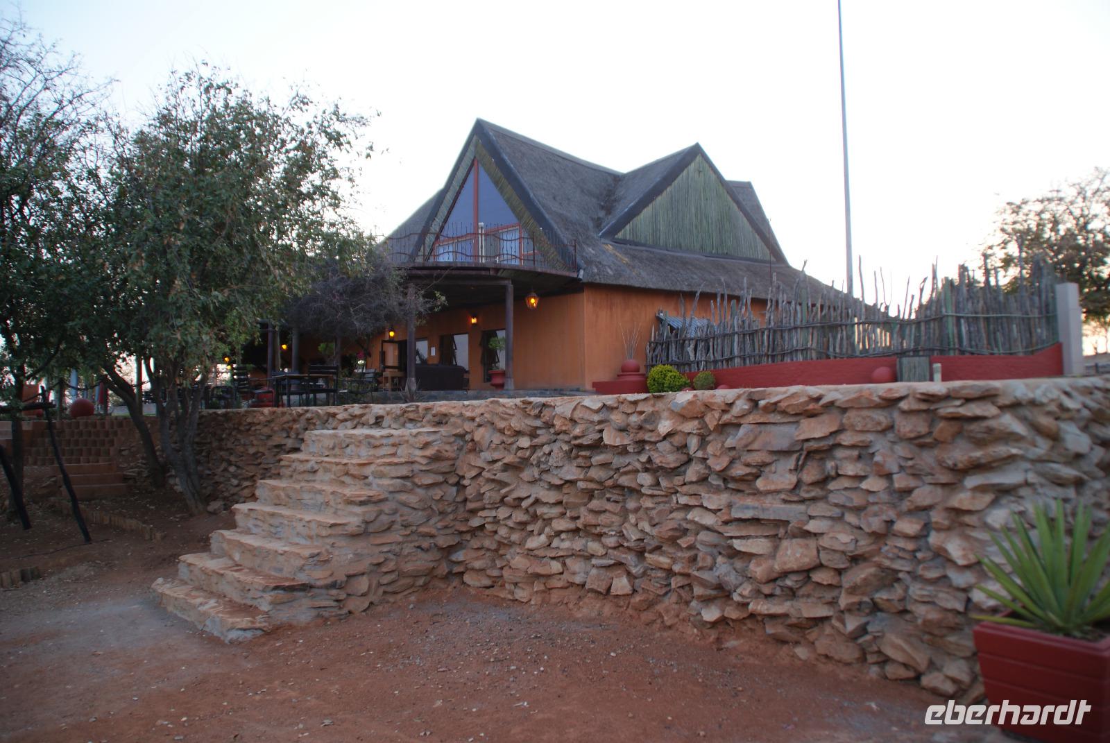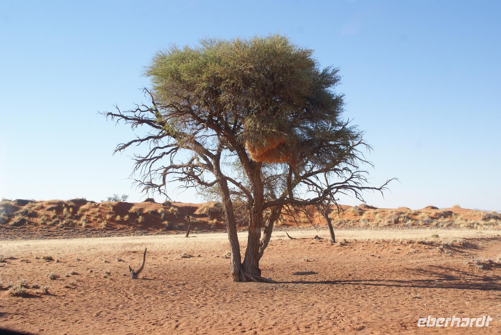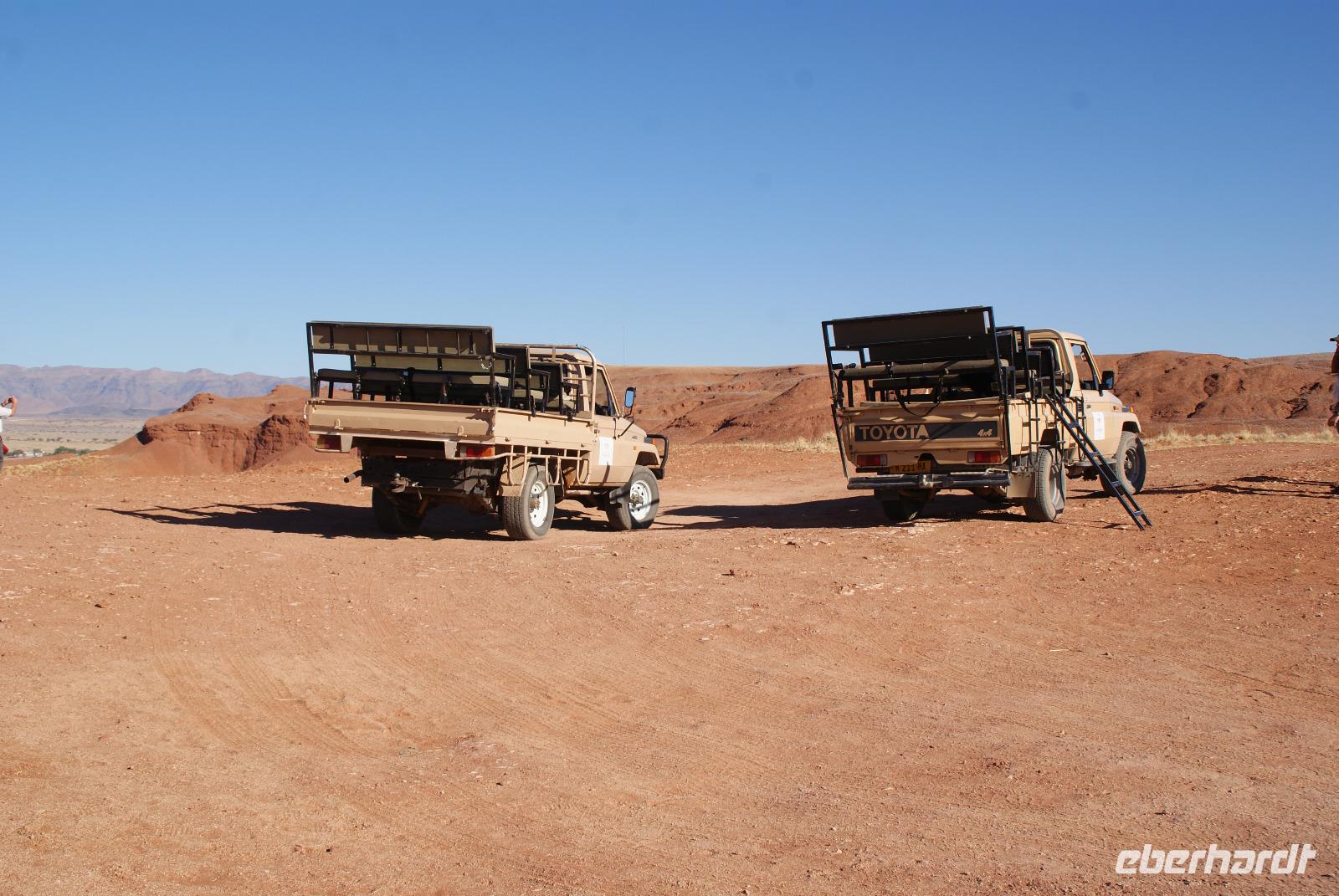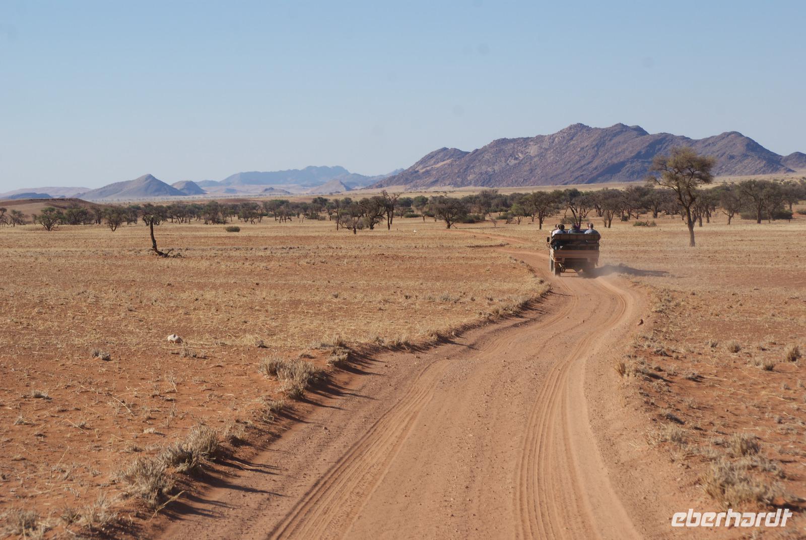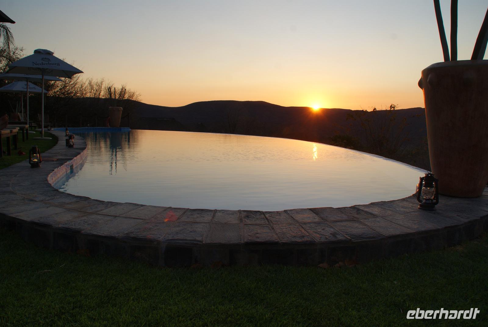 Mit viel Wind in den Ohren haben wir herrlich geschlafen und sehen uns ausgeruht und guter Dinge zum ersten Frühstück in Namibia wieder. Ein leckeres Buffet mit grandioser Aussicht auf das unter uns liegende Windhoek empfängt uns. Nachdem alle Koffer wieder verladen sind, verlassen wir die Stadt und machen uns auf Richtung Kalahari mit dem heutigen Tagesziel der Kalahari Anib Lodge. Vorbei am sogenannten „Heldenacker" mit imposantem Obelisk, welcher an den Freiheitskampf 1966 erinnern soll, fahren wir weiter und lassen die Weiten Namibias auf uns wirken. Zahlreiche Bärenpaviane säumen unsere Strecke und graben nach schmackhaften Wurzeln. Reiseleiterin Dagmar gibt uns eine schöne Einführung über viel Nützliches und Wissenswertes, was wir für unseren Aufenthalt in Namibia benötigen werden. Am frühen Nachmittag erreichen wir unsere Lodge und haben die nächsten Stunden Zeit, die jeder nach Lust und Laune mit relaxen, schwimmen im Pool oder einer Wanderung auf dem Gelände verbringen kann. Gegen 16.30 Uhr treffen sich alle zur gebuchten Sundowner Fahrt mit offenen Jeeps wieder. Unsere beiden Guides Jürgen und Levis begleiten uns auf dieser Tour und so fahren zwei Jeeps exklusiv für die Eberhardt Gäste los, um die Kalahari mit Flora, Fauna und vor allem schon den ersten Tieren kennenzulernen. Unser lustiger Guide Jürgen zeigt uns neben Termitenhügeln, Kameldornakazien auch lustige Dinge, wie den Kot des Gefängnisesels (Zebra) und auch auf eine Gruppe homo touristicos (andere Gäste) treffen wir....Spaß bei Seite...wir sehen Löcher im Boden, die sich sogenannte Erdferkel gegraben haben, halten an einer imposanten Webervogelkolonie mit unzähligen Nestern. Dort entdecken wir (also Jürgen) einen Flecken-Uhu und beobachten das Treiben der unzähligen Vögel der Kolonie. Wunderschöne Kudus stehen im Dickicht selbst die stolzen Oryx Antilopen, das Nationaltier Südafrikas bekommen wir zu sehen. Unseren Weg kreuzt ein Warzenschwein, welches auch scherzhaft Buschradio (Antenne, also der Schwanz bei Flucht nach oben) genannt wird. Ein leckeres Getränk in Form von Gin Tonic, Wein, Bier oder Softgetränk versüßt uns den herrlichen Sonnenuntergang in der Kalahari und so gut gestärkt verläuft die Rückfahrt nochmal so fröhlich. Nach so vielen schönen Eindrücken treibt uns der Hunger ans reichhaltige Buffet und in geselliger Runde lassen wir uns ein köstliches Abendessen besonders gut schmecken.