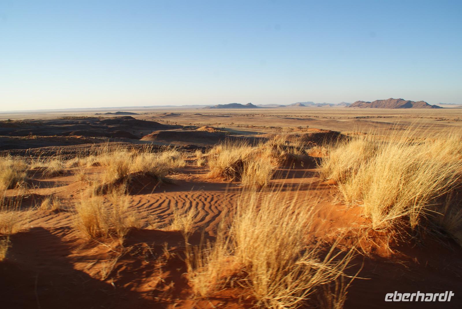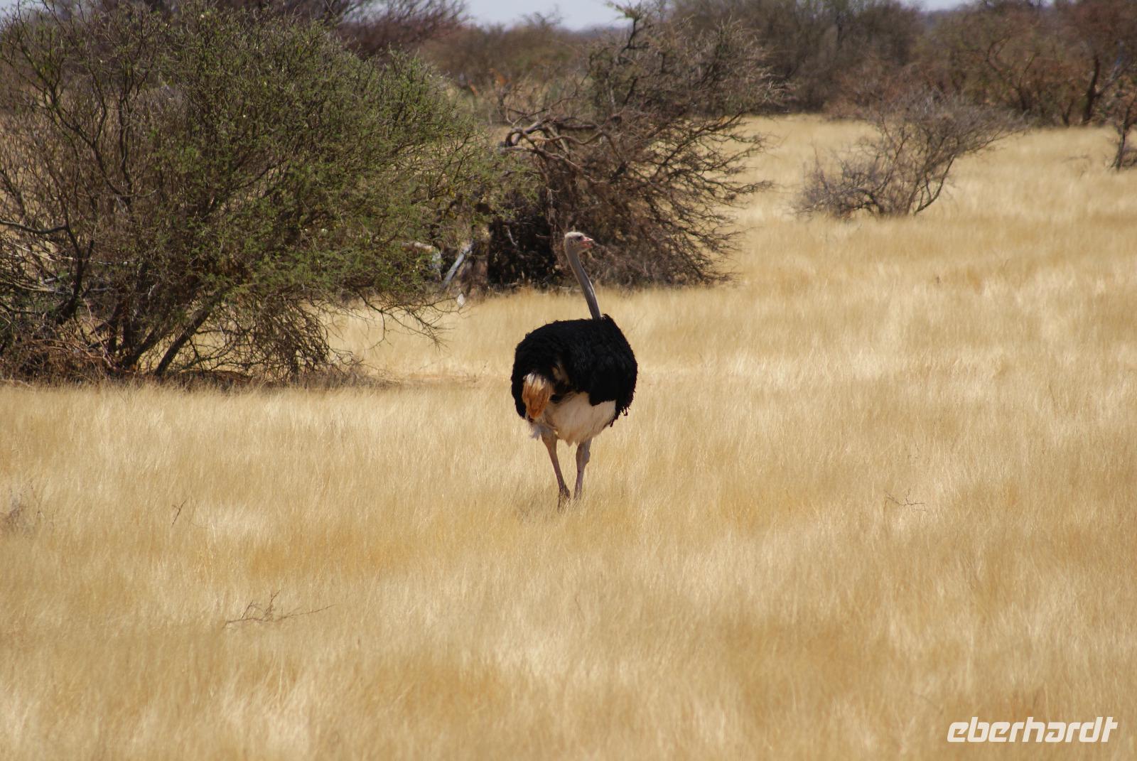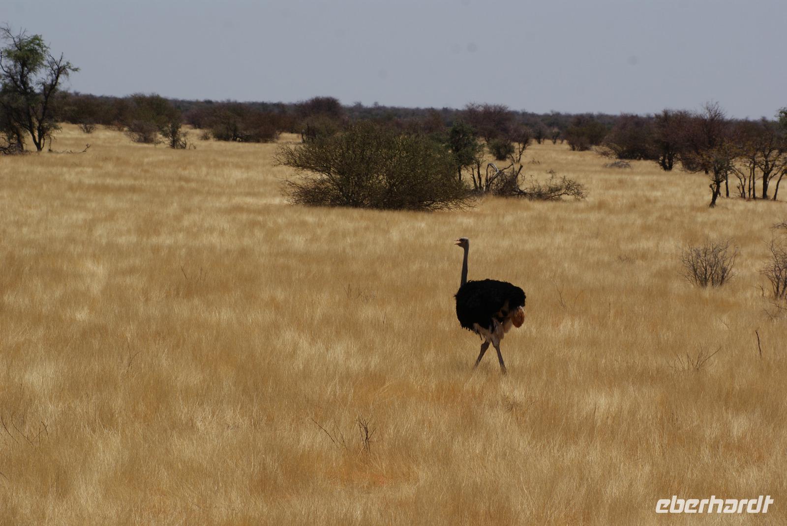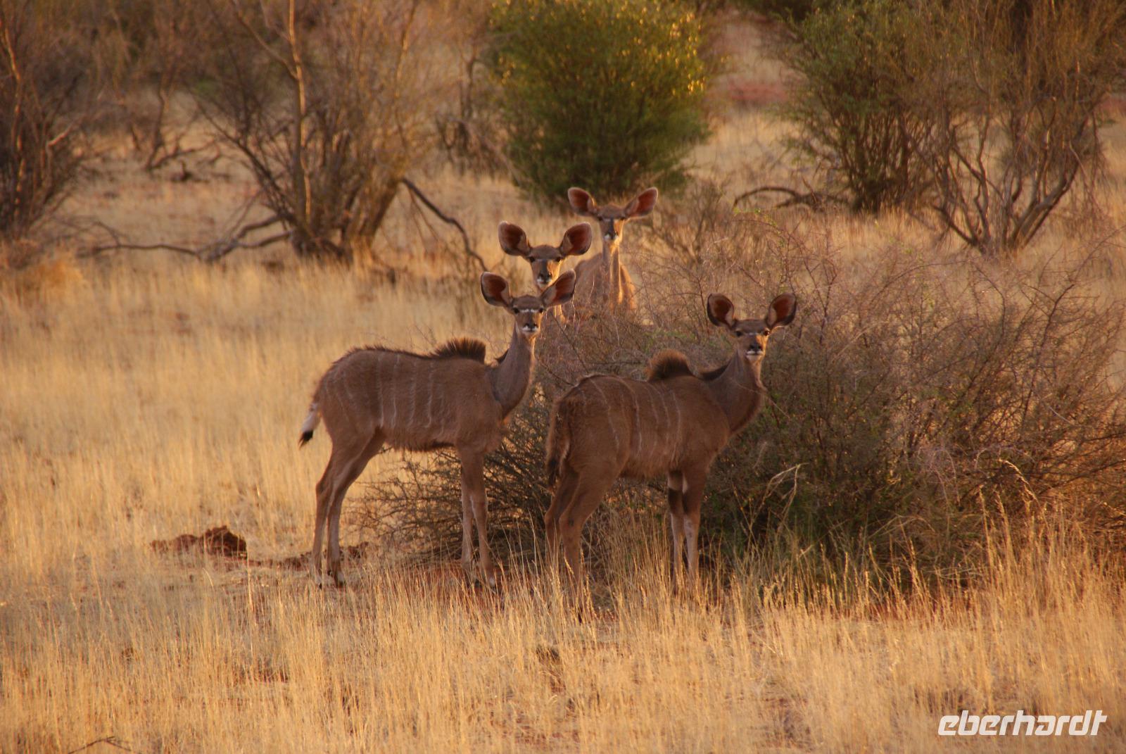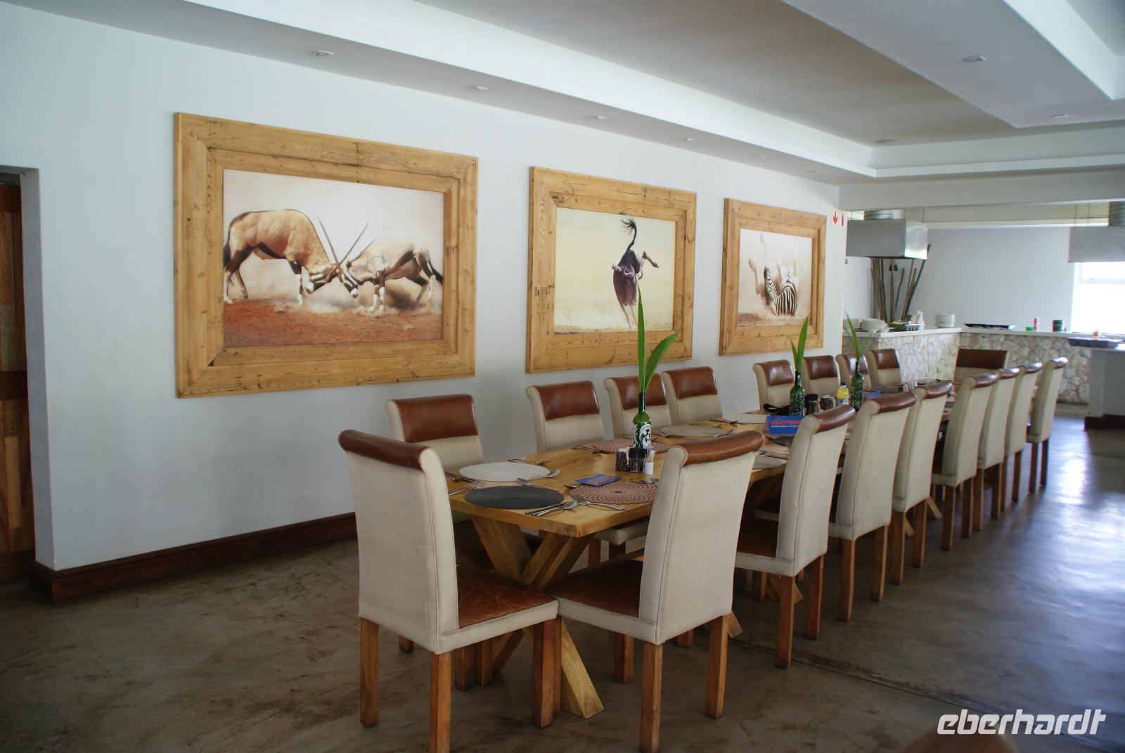 Mit viel Wind in den Ohren haben wir herrlich geschlafen und sehen uns ausgeruht und guter Dinge zum ersten Frühstück in Namibia wieder. Ein leckeres Buffet mit grandioser Aussicht auf das unter uns liegende Windhoek empfängt uns. Nachdem alle Koffer wieder verladen sind, verlassen wir die Stadt und machen uns auf Richtung Kalahari mit dem heutigen Tagesziel der Kalahari Anib Lodge. Vorbei am sogenannten „Heldenacker" mit imposantem Obelisk, welcher an den Freiheitskampf 1966 erinnern soll, fahren wir weiter und lassen die Weiten Namibias auf uns wirken. Zahlreiche Bärenpaviane säumen unsere Strecke und graben nach schmackhaften Wurzeln. Reiseleiterin Dagmar gibt uns eine schöne Einführung über viel Nützliches und Wissenswertes, was wir für unseren Aufenthalt in Namibia benötigen werden. Am frühen Nachmittag erreichen wir unsere Lodge und haben die nächsten Stunden Zeit, die jeder nach Lust und Laune mit relaxen, schwimmen im Pool oder einer Wanderung auf dem Gelände verbringen kann. Gegen 16.30 Uhr treffen sich alle zur gebuchten Sundowner Fahrt mit offenen Jeeps wieder. Unsere beiden Guides Jürgen und Levis begleiten uns auf dieser Tour und so fahren zwei Jeeps exklusiv für die Eberhardt Gäste los, um die Kalahari mit Flora, Fauna und vor allem schon den ersten Tieren kennenzulernen. Unser lustiger Guide Jürgen zeigt uns neben Termitenhügeln, Kameldornakazien auch lustige Dinge, wie den Kot des Gefängnisesels (Zebra) und auch auf eine Gruppe homo touristicos (andere Gäste) treffen wir....Spaß bei Seite...wir sehen Löcher im Boden, die sich sogenannte Erdferkel gegraben haben, halten an einer imposanten Webervogelkolonie mit unzähligen Nestern. Dort entdecken wir (also Jürgen) einen Flecken-Uhu und beobachten das Treiben der unzähligen Vögel der Kolonie. Wunderschöne Kudus stehen im Dickicht selbst die stolzen Oryx Antilopen, das Nationaltier Südafrikas bekommen wir zu sehen. Unseren Weg kreuzt ein Warzenschwein, welches auch scherzhaft Buschradio (Antenne, also der Schwanz bei Flucht nach oben) genannt wird. Ein leckeres Getränk in Form von Gin Tonic, Wein, Bier oder Softgetränk versüßt uns den herrlichen Sonnenuntergang in der Kalahari und so gut gestärkt verläuft die Rückfahrt nochmal so fröhlich. Nach so vielen schönen Eindrücken treibt uns der Hunger ans reichhaltige Buffet und in geselliger Runde lassen wir uns ein köstliches Abendessen besonders gut schmecken.