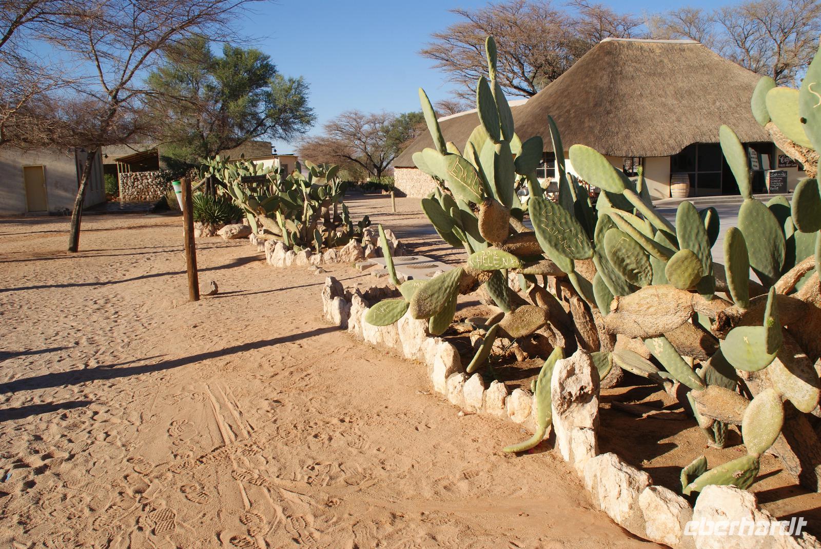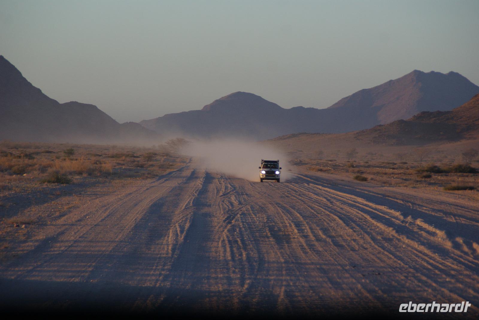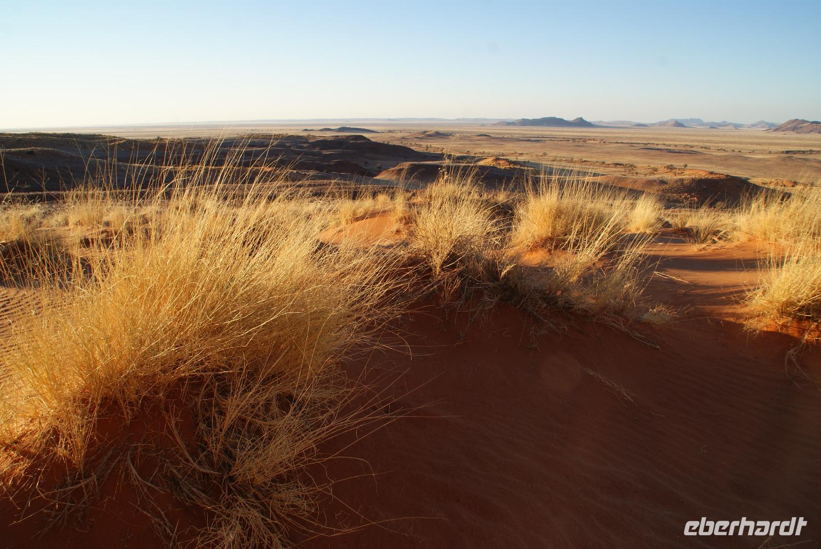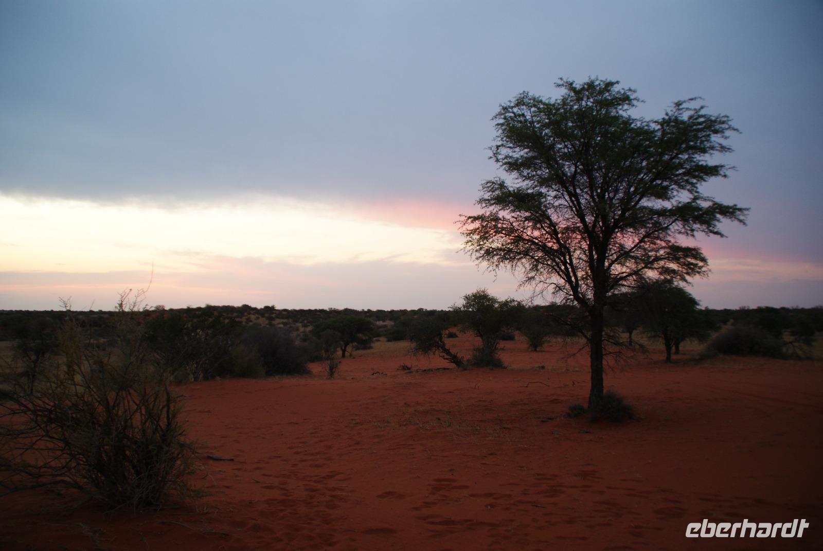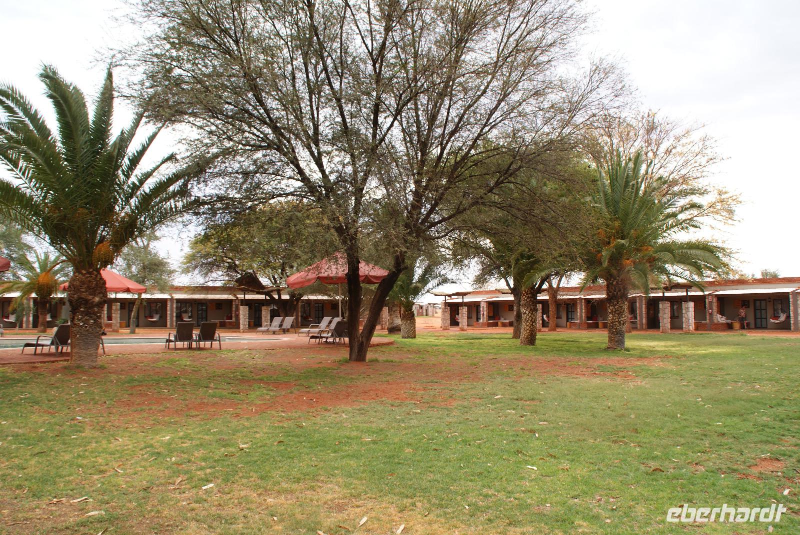 Mit viel Wind in den Ohren haben wir herrlich geschlafen und sehen uns ausgeruht und guter Dinge zum ersten Frühstück in Namibia wieder. Ein leckeres Buffet mit grandioser Aussicht auf das unter uns liegende Windhoek empfängt uns. Nachdem alle Koffer wieder verladen sind, verlassen wir die Stadt und machen uns auf Richtung Kalahari mit dem heutigen Tagesziel der Kalahari Anib Lodge. Vorbei am sogenannten „Heldenacker" mit imposantem Obelisk, welcher an den Freiheitskampf 1966 erinnern soll, fahren wir weiter und lassen die Weiten Namibias auf uns wirken. Zahlreiche Bärenpaviane säumen unsere Strecke und graben nach schmackhaften Wurzeln. Reiseleiterin Dagmar gibt uns eine schöne Einführung über viel Nützliches und Wissenswertes, was wir für unseren Aufenthalt in Namibia benötigen werden. Am frühen Nachmittag erreichen wir unsere Lodge und haben die nächsten Stunden Zeit, die jeder nach Lust und Laune mit relaxen, schwimmen im Pool oder einer Wanderung auf dem Gelände verbringen kann. Gegen 16.30 Uhr treffen sich alle zur gebuchten Sundowner Fahrt mit offenen Jeeps wieder. Unsere beiden Guides Jürgen und Levis begleiten uns auf dieser Tour und so fahren zwei Jeeps exklusiv für die Eberhardt Gäste los, um die Kalahari mit Flora, Fauna und vor allem schon den ersten Tieren kennenzulernen. Unser lustiger Guide Jürgen zeigt uns neben Termitenhügeln, Kameldornakazien auch lustige Dinge, wie den Kot des Gefängnisesels (Zebra) und auch auf eine Gruppe homo touristicos (andere Gäste) treffen wir....Spaß bei Seite...wir sehen Löcher im Boden, die sich sogenannte Erdferkel gegraben haben, halten an einer imposanten Webervogelkolonie mit unzähligen Nestern. Dort entdecken wir (also Jürgen) einen Flecken-Uhu und beobachten das Treiben der unzähligen Vögel der Kolonie. Wunderschöne Kudus stehen im Dickicht selbst die stolzen Oryx Antilopen, das Nationaltier Südafrikas bekommen wir zu sehen. Unseren Weg kreuzt ein Warzenschwein, welches auch scherzhaft Buschradio (Antenne, also der Schwanz bei Flucht nach oben) genannt wird. Ein leckeres Getränk in Form von Gin Tonic, Wein, Bier oder Softgetränk versüßt uns den herrlichen Sonnenuntergang in der Kalahari und so gut gestärkt verläuft die Rückfahrt nochmal so fröhlich. Nach so vielen schönen Eindrücken treibt uns der Hunger ans reichhaltige Buffet und in geselliger Runde lassen wir uns ein köstliches Abendessen besonders gut schmecken.