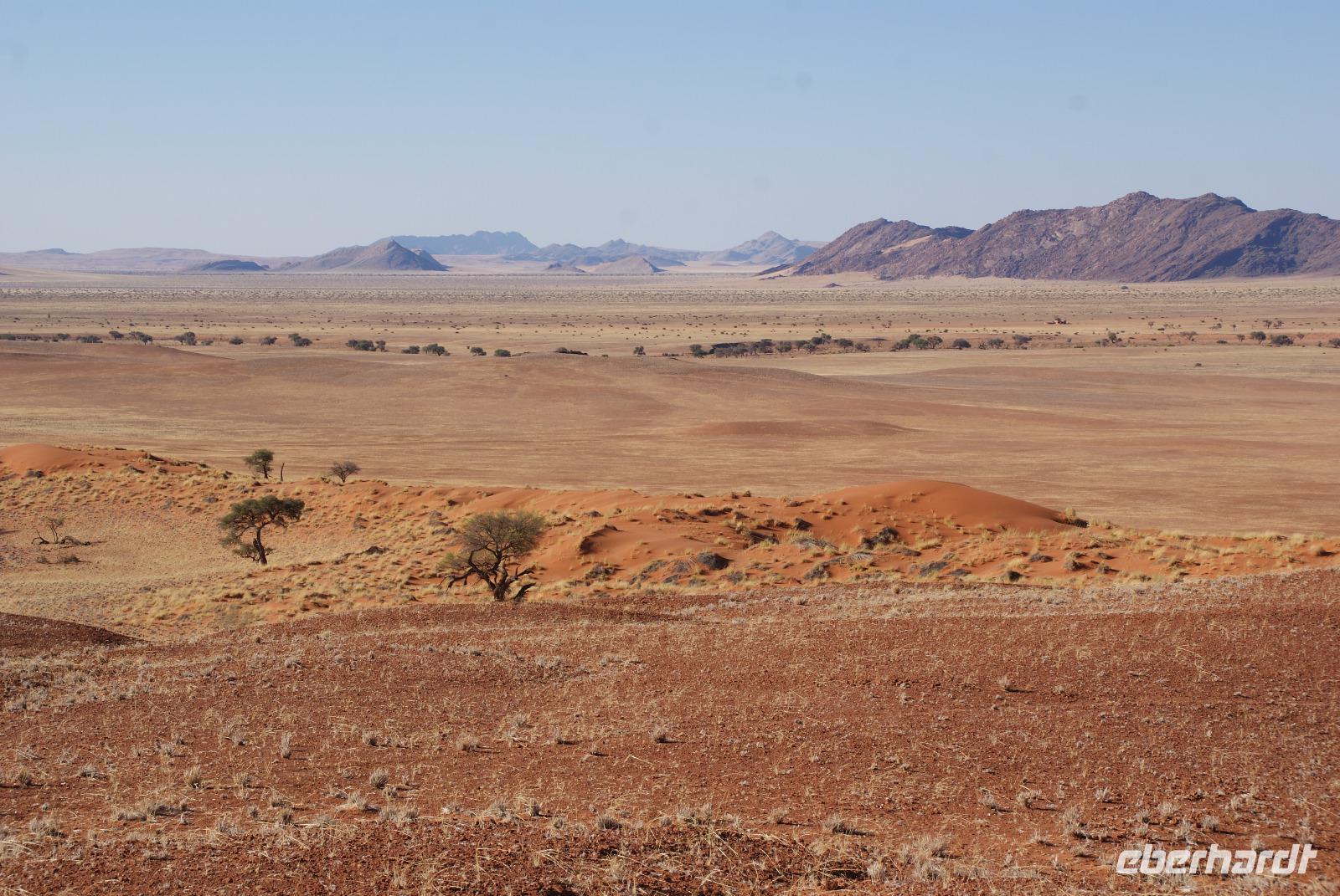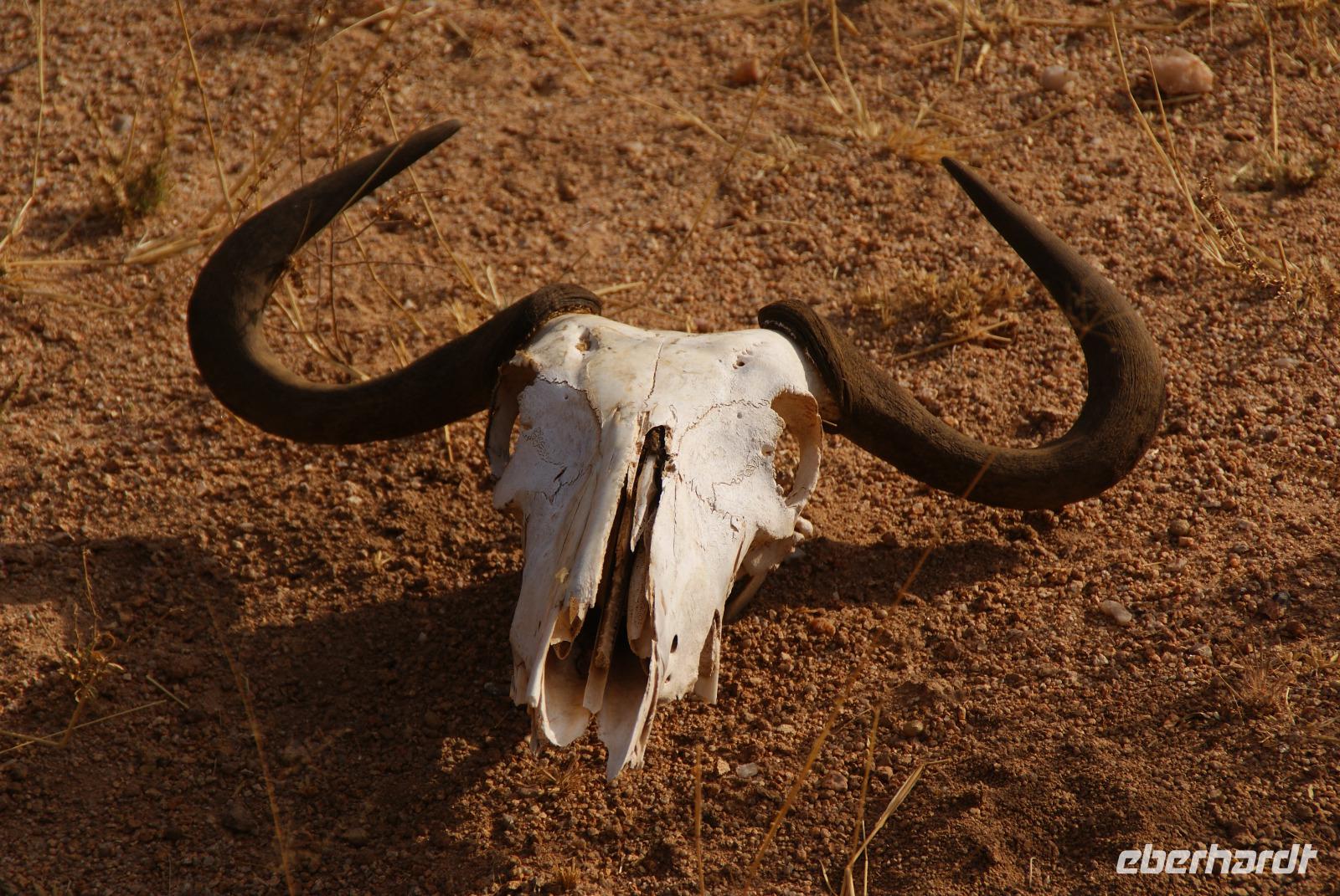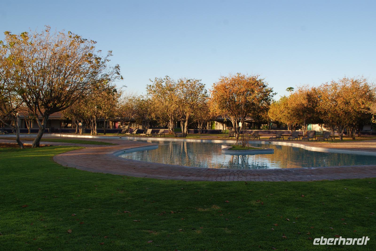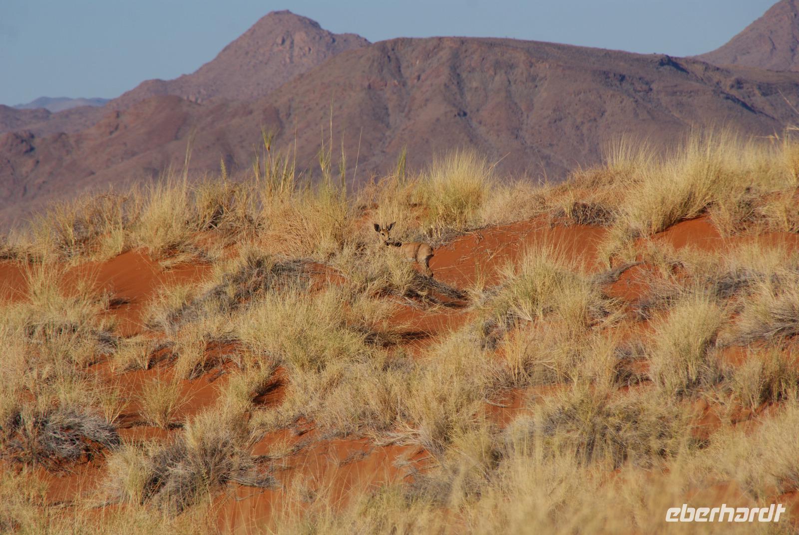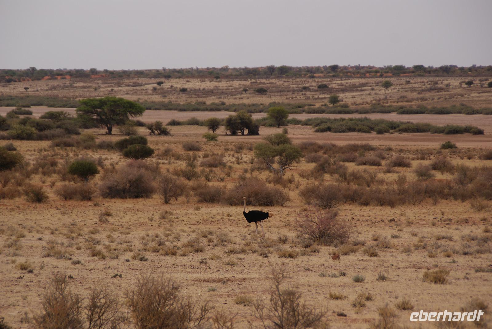 Mit viel Wind in den Ohren haben wir herrlich geschlafen und sehen uns ausgeruht und guter Dinge zum ersten Frühstück in Namibia wieder. Ein leckeres Buffet mit grandioser Aussicht auf das unter uns liegende Windhoek empfängt uns. Nachdem alle Koffer wieder verladen sind, verlassen wir die Stadt und machen uns auf Richtung Kalahari mit dem heutigen Tagesziel der Kalahari Anib Lodge. Vorbei am sogenannten „Heldenacker" mit imposantem Obelisk, welcher an den Freiheitskampf 1966 erinnern soll, fahren wir weiter und lassen die Weiten Namibias auf uns wirken. Zahlreiche Bärenpaviane säumen unsere Strecke und graben nach schmackhaften Wurzeln. Reiseleiterin Dagmar gibt uns eine schöne Einführung über viel Nützliches und Wissenswertes, was wir für unseren Aufenthalt in Namibia benötigen werden. Am frühen Nachmittag erreichen wir unsere Lodge und haben die nächsten Stunden Zeit, die jeder nach Lust und Laune mit relaxen, schwimmen im Pool oder einer Wanderung auf dem Gelände verbringen kann. Gegen 16.30 Uhr treffen sich alle zur gebuchten Sundowner Fahrt mit offenen Jeeps wieder. Unsere beiden Guides Jürgen und Levis begleiten uns auf dieser Tour und so fahren zwei Jeeps exklusiv für die Eberhardt Gäste los, um die Kalahari mit Flora, Fauna und vor allem schon den ersten Tieren kennenzulernen. Unser lustiger Guide Jürgen zeigt uns neben Termitenhügeln, Kameldornakazien auch lustige Dinge, wie den Kot des Gefängnisesels (Zebra) und auch auf eine Gruppe homo touristicos (andere Gäste) treffen wir....Spaß bei Seite...wir sehen Löcher im Boden, die sich sogenannte Erdferkel gegraben haben, halten an einer imposanten Webervogelkolonie mit unzähligen Nestern. Dort entdecken wir (also Jürgen) einen Flecken-Uhu und beobachten das Treiben der unzähligen Vögel der Kolonie. Wunderschöne Kudus stehen im Dickicht selbst die stolzen Oryx Antilopen, das Nationaltier Südafrikas bekommen wir zu sehen. Unseren Weg kreuzt ein Warzenschwein, welches auch scherzhaft Buschradio (Antenne, also der Schwanz bei Flucht nach oben) genannt wird. Ein leckeres Getränk in Form von Gin Tonic, Wein, Bier oder Softgetränk versüßt uns den herrlichen Sonnenuntergang in der Kalahari und so gut gestärkt verläuft die Rückfahrt nochmal so fröhlich. Nach so vielen schönen Eindrücken treibt uns der Hunger ans reichhaltige Buffet und in geselliger Runde lassen wir uns ein köstliches Abendessen besonders gut schmecken.