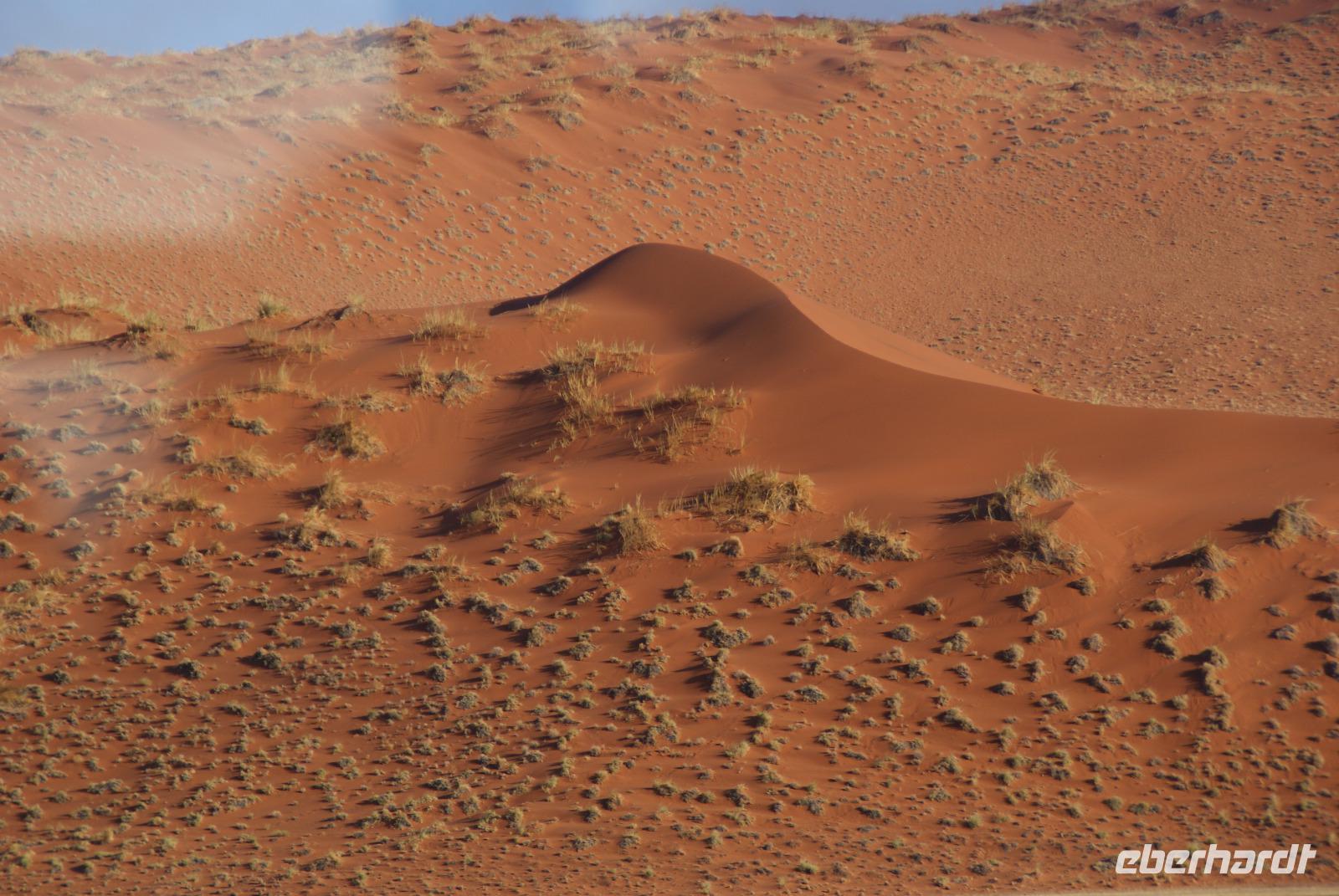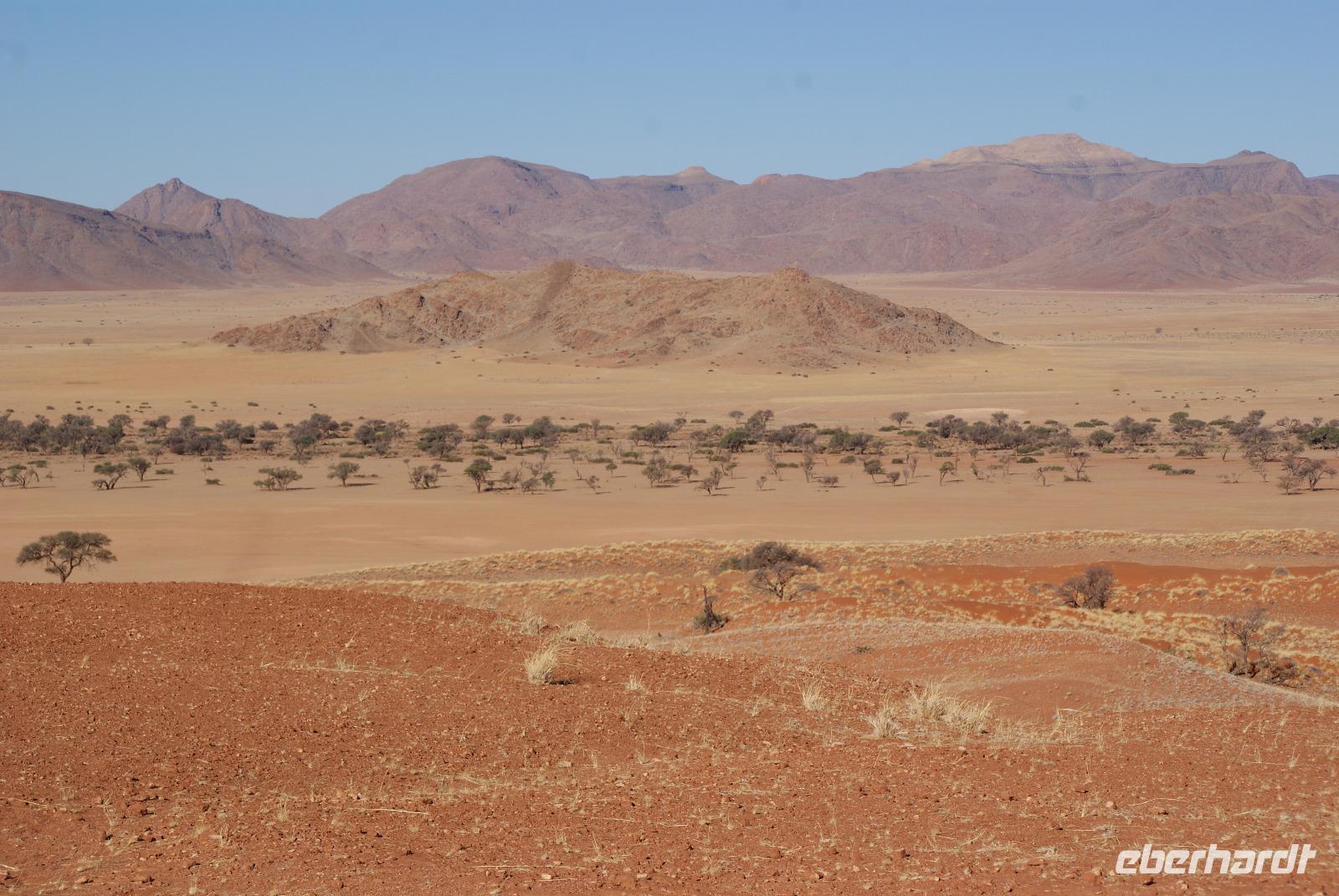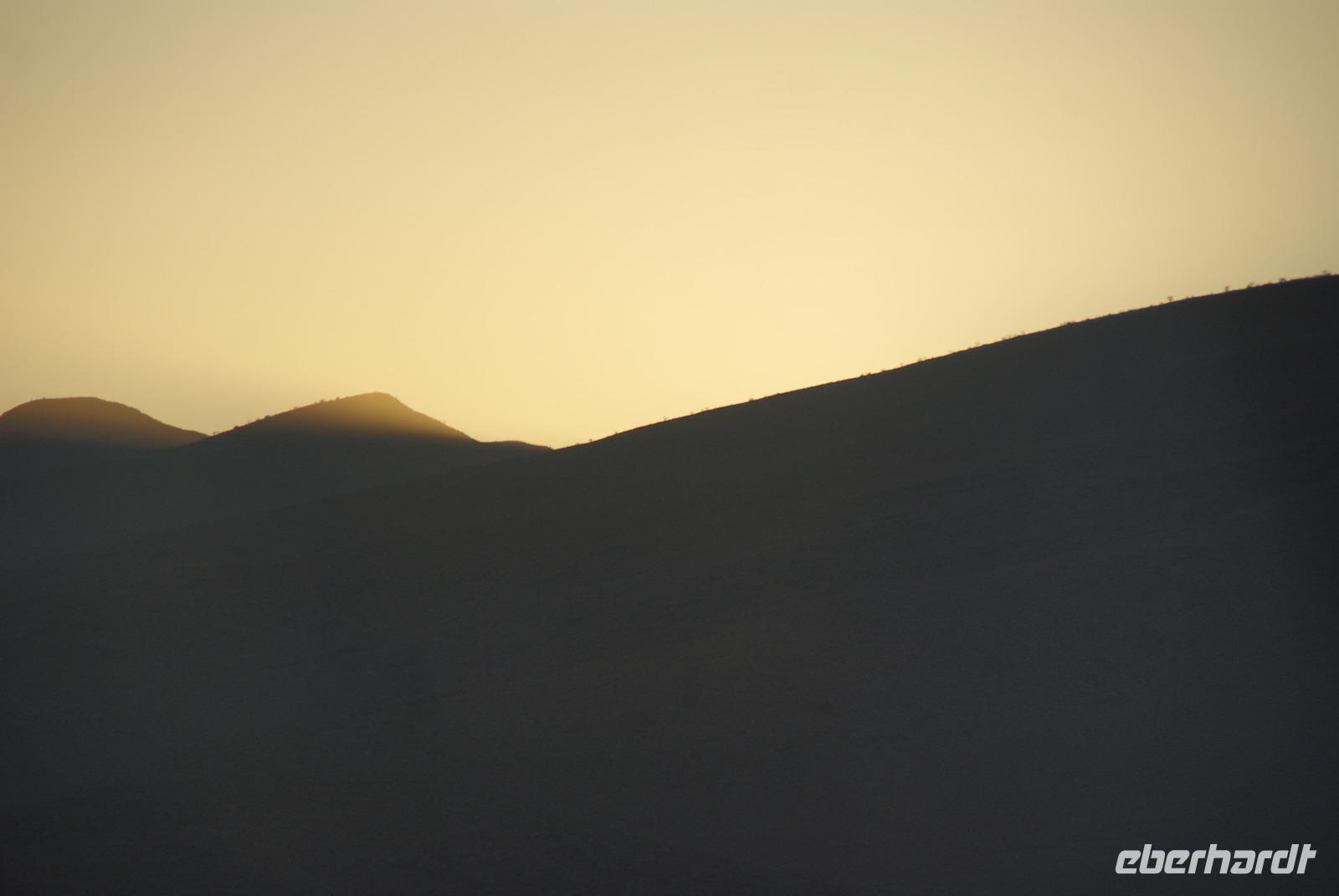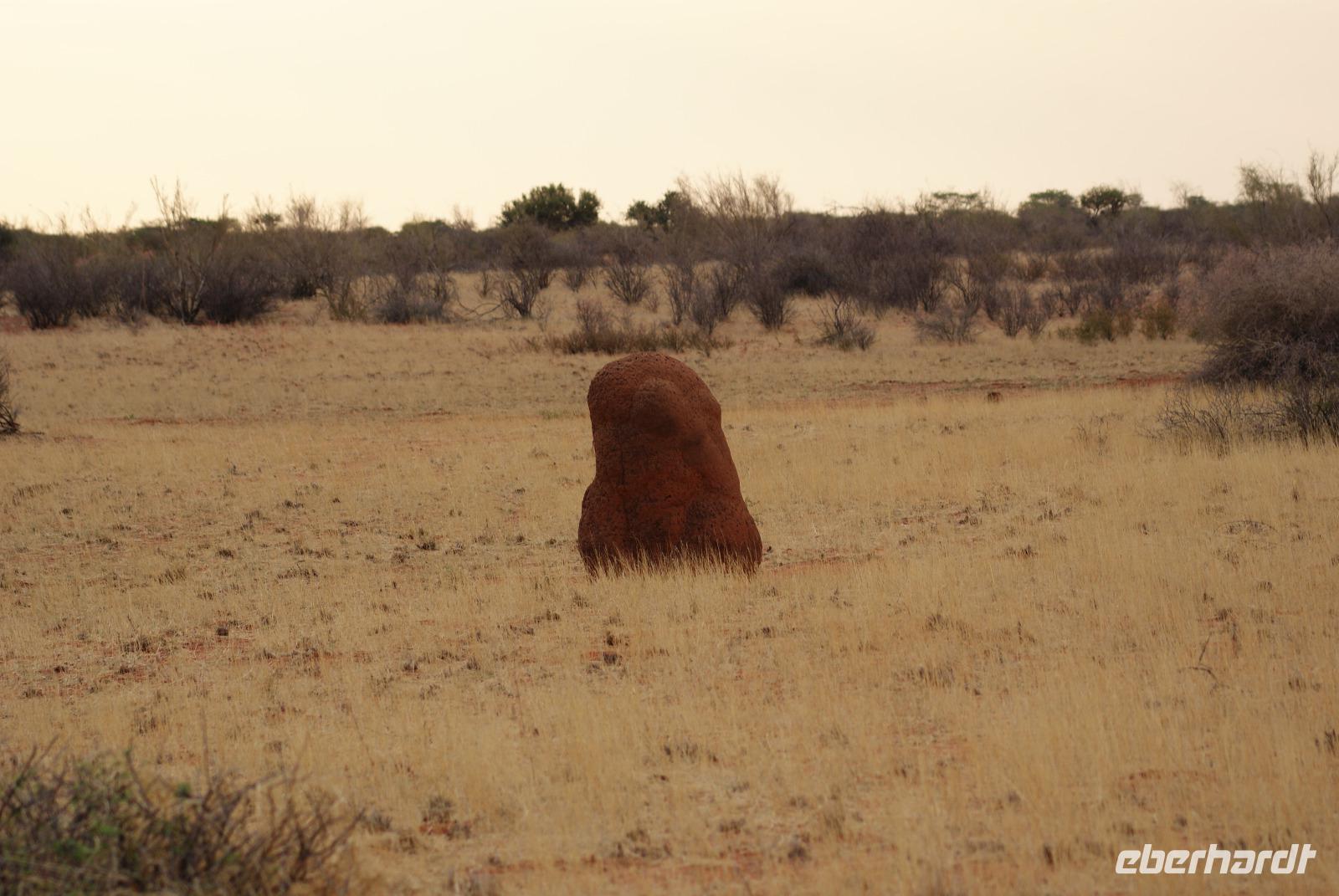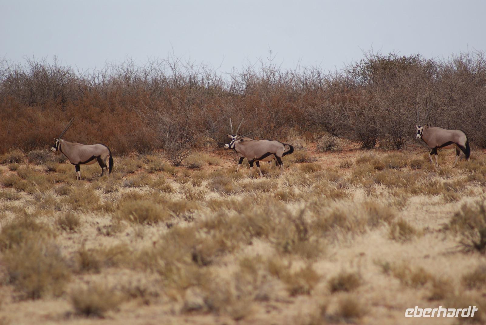 Mit viel Wind in den Ohren haben wir herrlich geschlafen und sehen uns ausgeruht und guter Dinge zum ersten Frühstück in Namibia wieder. Ein leckeres Buffet mit grandioser Aussicht auf das unter uns liegende Windhoek empfängt uns. Nachdem alle Koffer wieder verladen sind, verlassen wir die Stadt und machen uns auf Richtung Kalahari mit dem heutigen Tagesziel der Kalahari Anib Lodge. Vorbei am sogenannten „Heldenacker" mit imposantem Obelisk, welcher an den Freiheitskampf 1966 erinnern soll, fahren wir weiter und lassen die Weiten Namibias auf uns wirken. Zahlreiche Bärenpaviane säumen unsere Strecke und graben nach schmackhaften Wurzeln. Reiseleiterin Dagmar gibt uns eine schöne Einführung über viel Nützliches und Wissenswertes, was wir für unseren Aufenthalt in Namibia benötigen werden. Am frühen Nachmittag erreichen wir unsere Lodge und haben die nächsten Stunden Zeit, die jeder nach Lust und Laune mit relaxen, schwimmen im Pool oder einer Wanderung auf dem Gelände verbringen kann. Gegen 16.30 Uhr treffen sich alle zur gebuchten Sundowner Fahrt mit offenen Jeeps wieder. Unsere beiden Guides Jürgen und Levis begleiten uns auf dieser Tour und so fahren zwei Jeeps exklusiv für die Eberhardt Gäste los, um die Kalahari mit Flora, Fauna und vor allem schon den ersten Tieren kennenzulernen. Unser lustiger Guide Jürgen zeigt uns neben Termitenhügeln, Kameldornakazien auch lustige Dinge, wie den Kot des Gefängnisesels (Zebra) und auch auf eine Gruppe homo touristicos (andere Gäste) treffen wir....Spaß bei Seite...wir sehen Löcher im Boden, die sich sogenannte Erdferkel gegraben haben, halten an einer imposanten Webervogelkolonie mit unzähligen Nestern. Dort entdecken wir (also Jürgen) einen Flecken-Uhu und beobachten das Treiben der unzähligen Vögel der Kolonie. Wunderschöne Kudus stehen im Dickicht selbst die stolzen Oryx Antilopen, das Nationaltier Südafrikas bekommen wir zu sehen. Unseren Weg kreuzt ein Warzenschwein, welches auch scherzhaft Buschradio (Antenne, also der Schwanz bei Flucht nach oben) genannt wird. Ein leckeres Getränk in Form von Gin Tonic, Wein, Bier oder Softgetränk versüßt uns den herrlichen Sonnenuntergang in der Kalahari und so gut gestärkt verläuft die Rückfahrt nochmal so fröhlich. Nach so vielen schönen Eindrücken treibt uns der Hunger ans reichhaltige Buffet und in geselliger Runde lassen wir uns ein köstliches Abendessen besonders gut schmecken.
