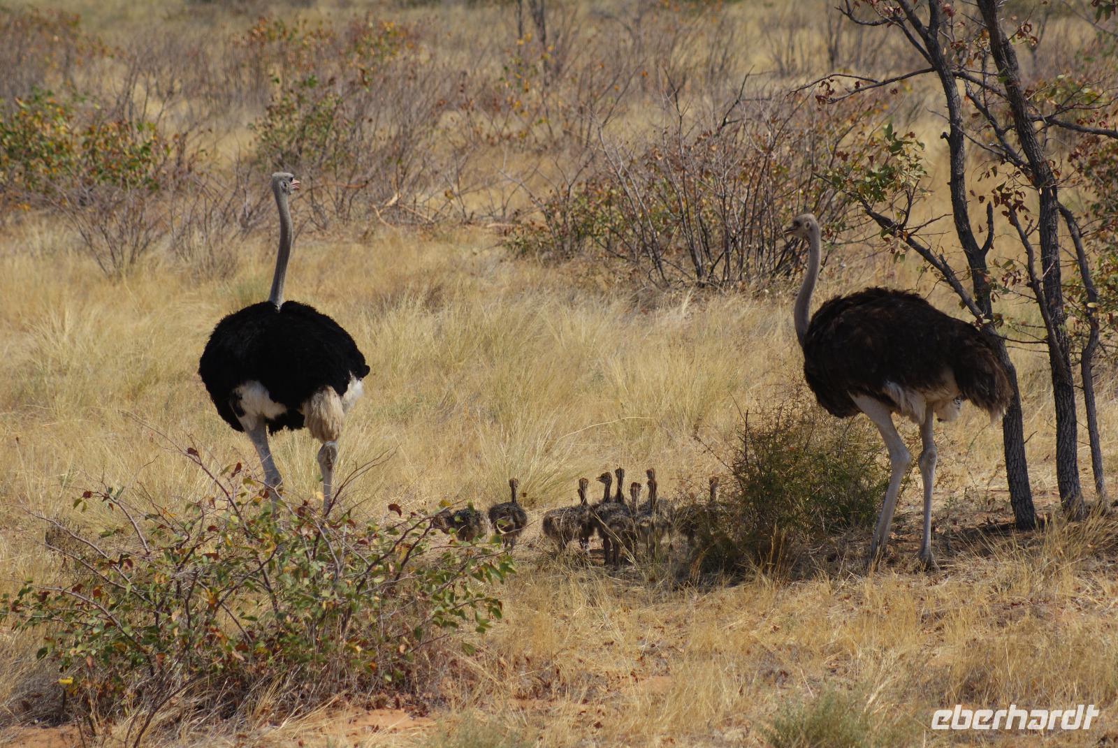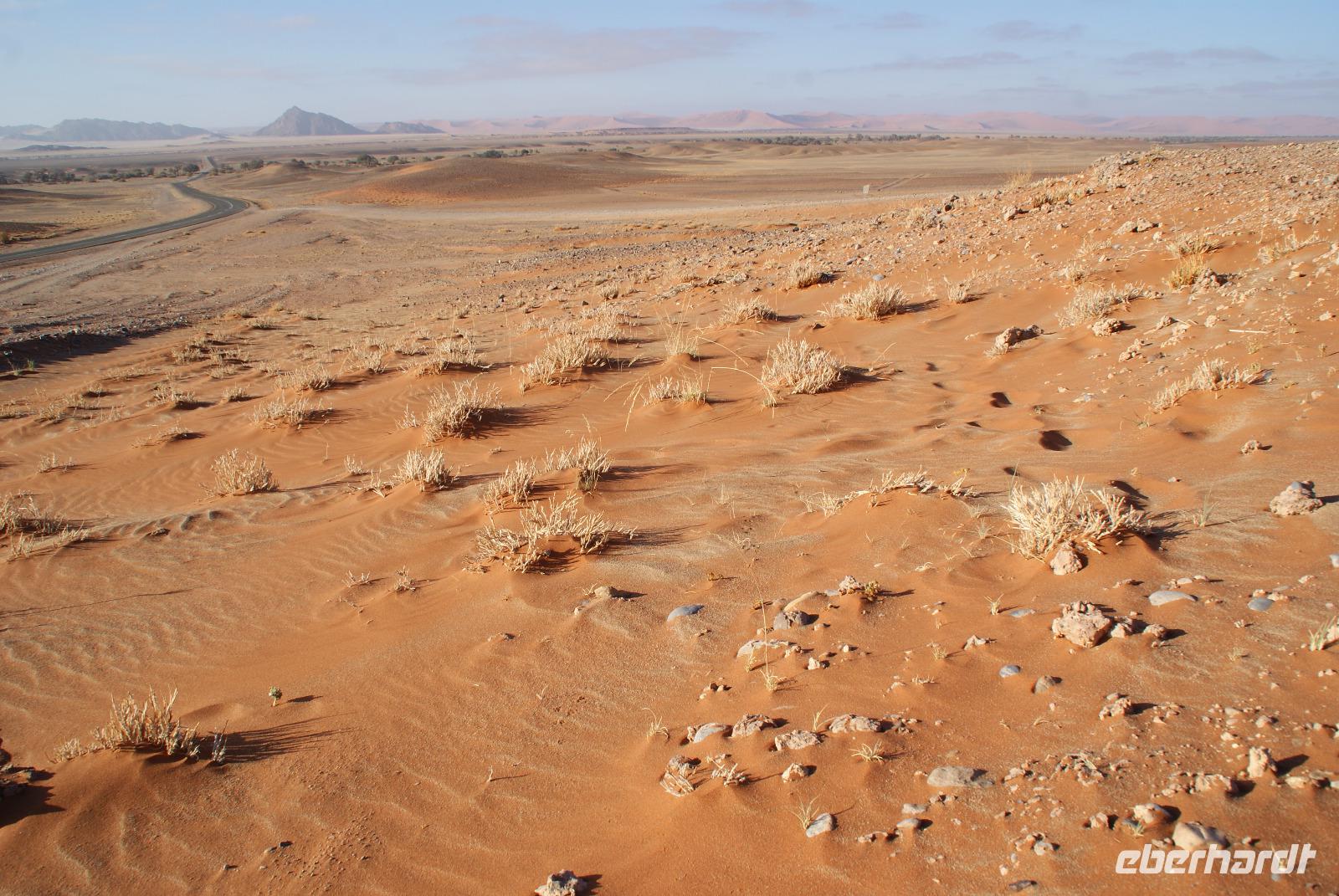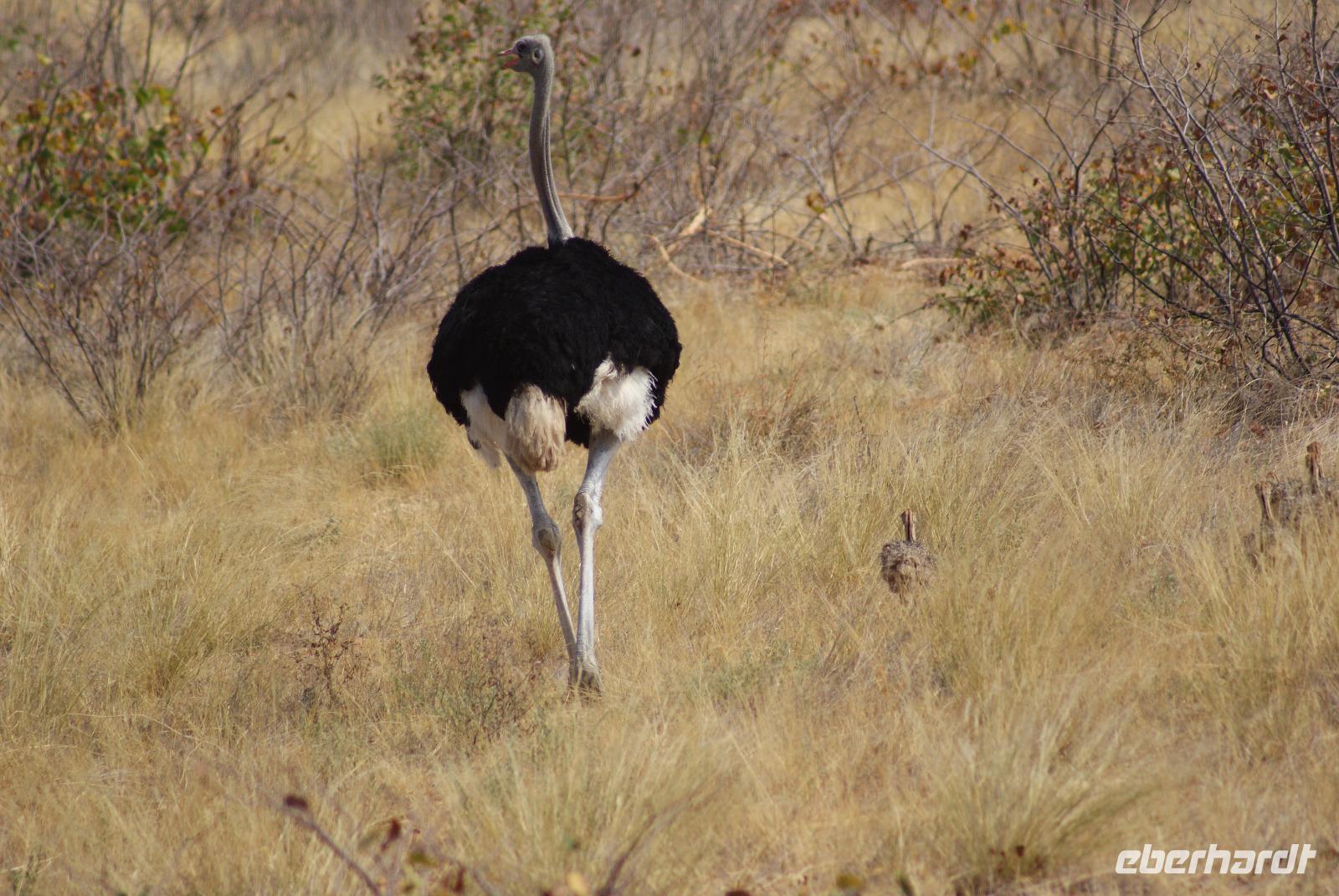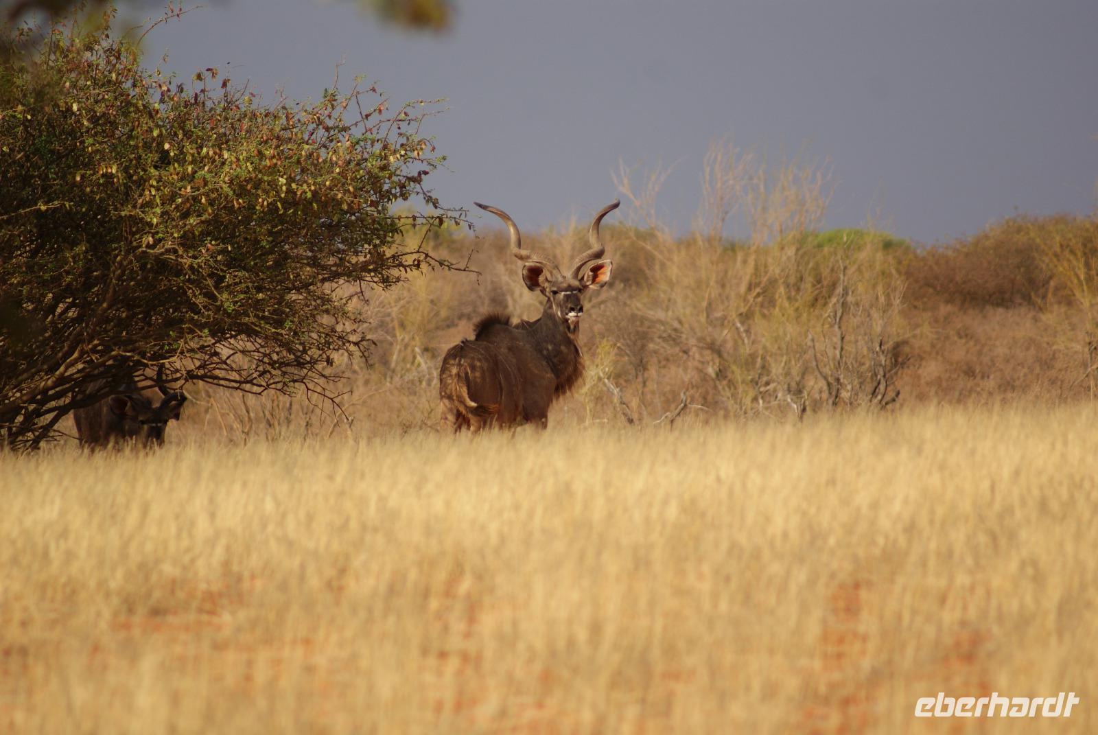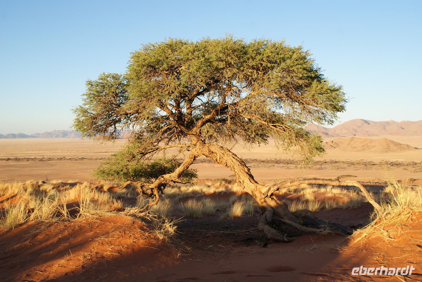 Mit viel Wind in den Ohren haben wir herrlich geschlafen und sehen uns ausgeruht und guter Dinge zum ersten Frühstück in Namibia wieder. Ein leckeres Buffet mit grandioser Aussicht auf das unter uns liegende Windhoek empfängt uns. Nachdem alle Koffer wieder verladen sind, verlassen wir die Stadt und machen uns auf Richtung Kalahari mit dem heutigen Tagesziel der Kalahari Anib Lodge. Vorbei am sogenannten „Heldenacker" mit imposantem Obelisk, welcher an den Freiheitskampf 1966 erinnern soll, fahren wir weiter und lassen die Weiten Namibias auf uns wirken. Zahlreiche Bärenpaviane säumen unsere Strecke und graben nach schmackhaften Wurzeln. Reiseleiterin Dagmar gibt uns eine schöne Einführung über viel Nützliches und Wissenswertes, was wir für unseren Aufenthalt in Namibia benötigen werden. Am frühen Nachmittag erreichen wir unsere Lodge und haben die nächsten Stunden Zeit, die jeder nach Lust und Laune mit relaxen, schwimmen im Pool oder einer Wanderung auf dem Gelände verbringen kann. Gegen 16.30 Uhr treffen sich alle zur gebuchten Sundowner Fahrt mit offenen Jeeps wieder. Unsere beiden Guides Jürgen und Levis begleiten uns auf dieser Tour und so fahren zwei Jeeps exklusiv für die Eberhardt Gäste los, um die Kalahari mit Flora, Fauna und vor allem schon den ersten Tieren kennenzulernen. Unser lustiger Guide Jürgen zeigt uns neben Termitenhügeln, Kameldornakazien auch lustige Dinge, wie den Kot des Gefängnisesels (Zebra) und auch auf eine Gruppe homo touristicos (andere Gäste) treffen wir....Spaß bei Seite...wir sehen Löcher im Boden, die sich sogenannte Erdferkel gegraben haben, halten an einer imposanten Webervogelkolonie mit unzähligen Nestern. Dort entdecken wir (also Jürgen) einen Flecken-Uhu und beobachten das Treiben der unzähligen Vögel der Kolonie. Wunderschöne Kudus stehen im Dickicht selbst die stolzen Oryx Antilopen, das Nationaltier Südafrikas bekommen wir zu sehen. Unseren Weg kreuzt ein Warzenschwein, welches auch scherzhaft Buschradio (Antenne, also der Schwanz bei Flucht nach oben) genannt wird. Ein leckeres Getränk in Form von Gin Tonic, Wein, Bier oder Softgetränk versüßt uns den herrlichen Sonnenuntergang in der Kalahari und so gut gestärkt verläuft die Rückfahrt nochmal so fröhlich. Nach so vielen schönen Eindrücken treibt uns der Hunger ans reichhaltige Buffet und in geselliger Runde lassen wir uns ein köstliches Abendessen besonders gut schmecken.