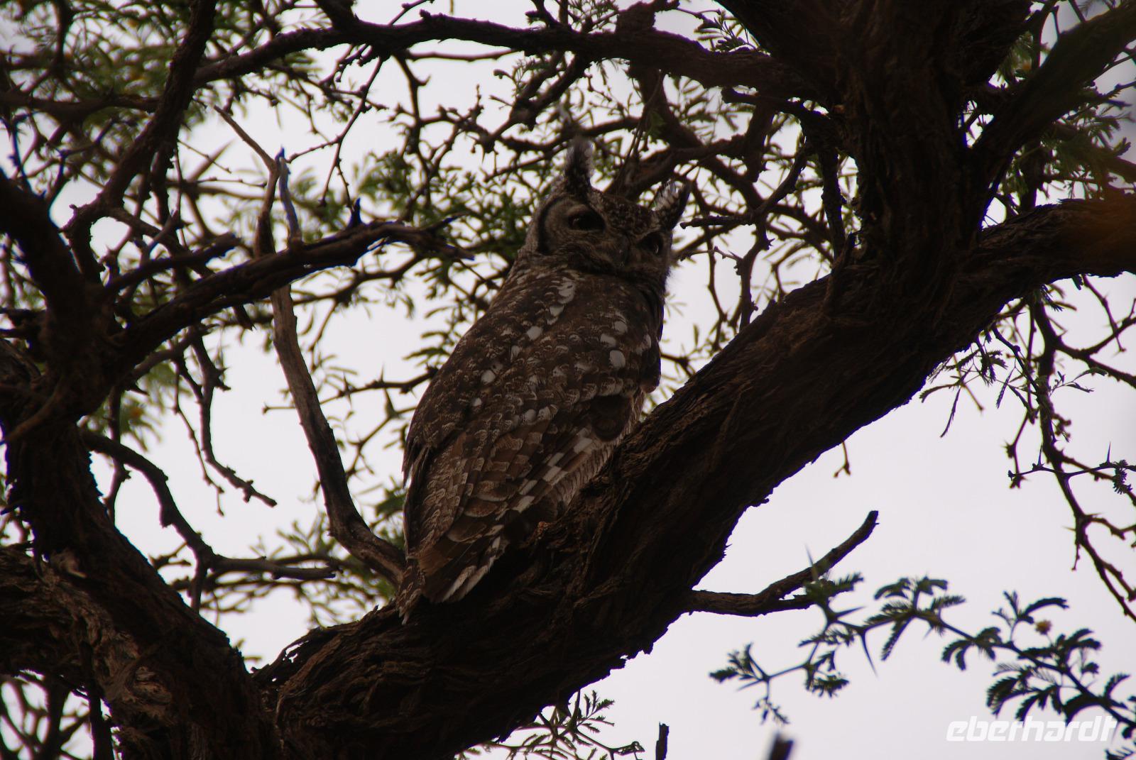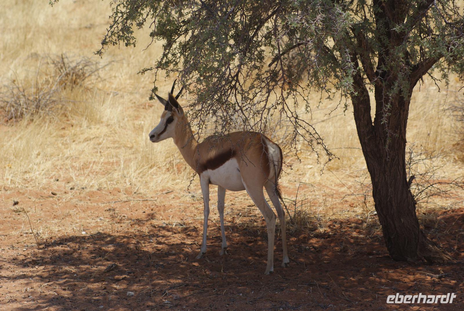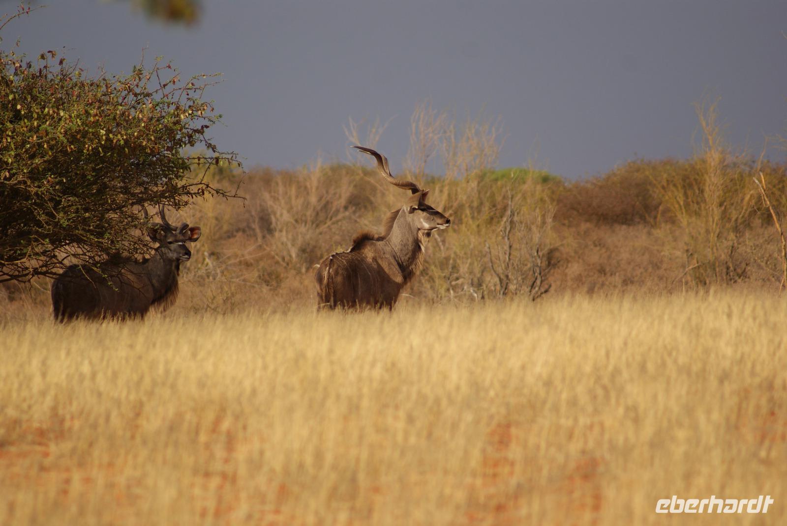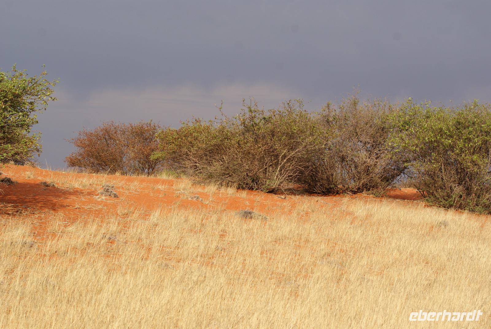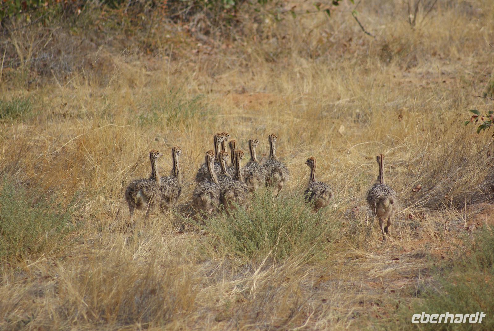 Mit viel Wind in den Ohren haben wir herrlich geschlafen und sehen uns ausgeruht und guter Dinge zum ersten Frühstück in Namibia wieder. Ein leckeres Buffet mit grandioser Aussicht auf das unter uns liegende Windhoek empfängt uns. Nachdem alle Koffer wieder verladen sind, verlassen wir die Stadt und machen uns auf Richtung Kalahari mit dem heutigen Tagesziel der Kalahari Anib Lodge. Vorbei am sogenannten „Heldenacker" mit imposantem Obelisk, welcher an den Freiheitskampf 1966 erinnern soll, fahren wir weiter und lassen die Weiten Namibias auf uns wirken. Zahlreiche Bärenpaviane säumen unsere Strecke und graben nach schmackhaften Wurzeln. Reiseleiterin Dagmar gibt uns eine schöne Einführung über viel Nützliches und Wissenswertes, was wir für unseren Aufenthalt in Namibia benötigen werden. Am frühen Nachmittag erreichen wir unsere Lodge und haben die nächsten Stunden Zeit, die jeder nach Lust und Laune mit relaxen, schwimmen im Pool oder einer Wanderung auf dem Gelände verbringen kann. Gegen 16.30 Uhr treffen sich alle zur gebuchten Sundowner Fahrt mit offenen Jeeps wieder. Unsere beiden Guides Jürgen und Levis begleiten uns auf dieser Tour und so fahren zwei Jeeps exklusiv für die Eberhardt Gäste los, um die Kalahari mit Flora, Fauna und vor allem schon den ersten Tieren kennenzulernen. Unser lustiger Guide Jürgen zeigt uns neben Termitenhügeln, Kameldornakazien auch lustige Dinge, wie den Kot des Gefängnisesels (Zebra) und auch auf eine Gruppe homo touristicos (andere Gäste) treffen wir....Spaß bei Seite...wir sehen Löcher im Boden, die sich sogenannte Erdferkel gegraben haben, halten an einer imposanten Webervogelkolonie mit unzähligen Nestern. Dort entdecken wir (also Jürgen) einen Flecken-Uhu und beobachten das Treiben der unzähligen Vögel der Kolonie. Wunderschöne Kudus stehen im Dickicht selbst die stolzen Oryx Antilopen, das Nationaltier Südafrikas bekommen wir zu sehen. Unseren Weg kreuzt ein Warzenschwein, welches auch scherzhaft Buschradio (Antenne, also der Schwanz bei Flucht nach oben) genannt wird. Ein leckeres Getränk in Form von Gin Tonic, Wein, Bier oder Softgetränk versüßt uns den herrlichen Sonnenuntergang in der Kalahari und so gut gestärkt verläuft die Rückfahrt nochmal so fröhlich. Nach so vielen schönen Eindrücken treibt uns der Hunger ans reichhaltige Buffet und in geselliger Runde lassen wir uns ein köstliches Abendessen besonders gut schmecken.