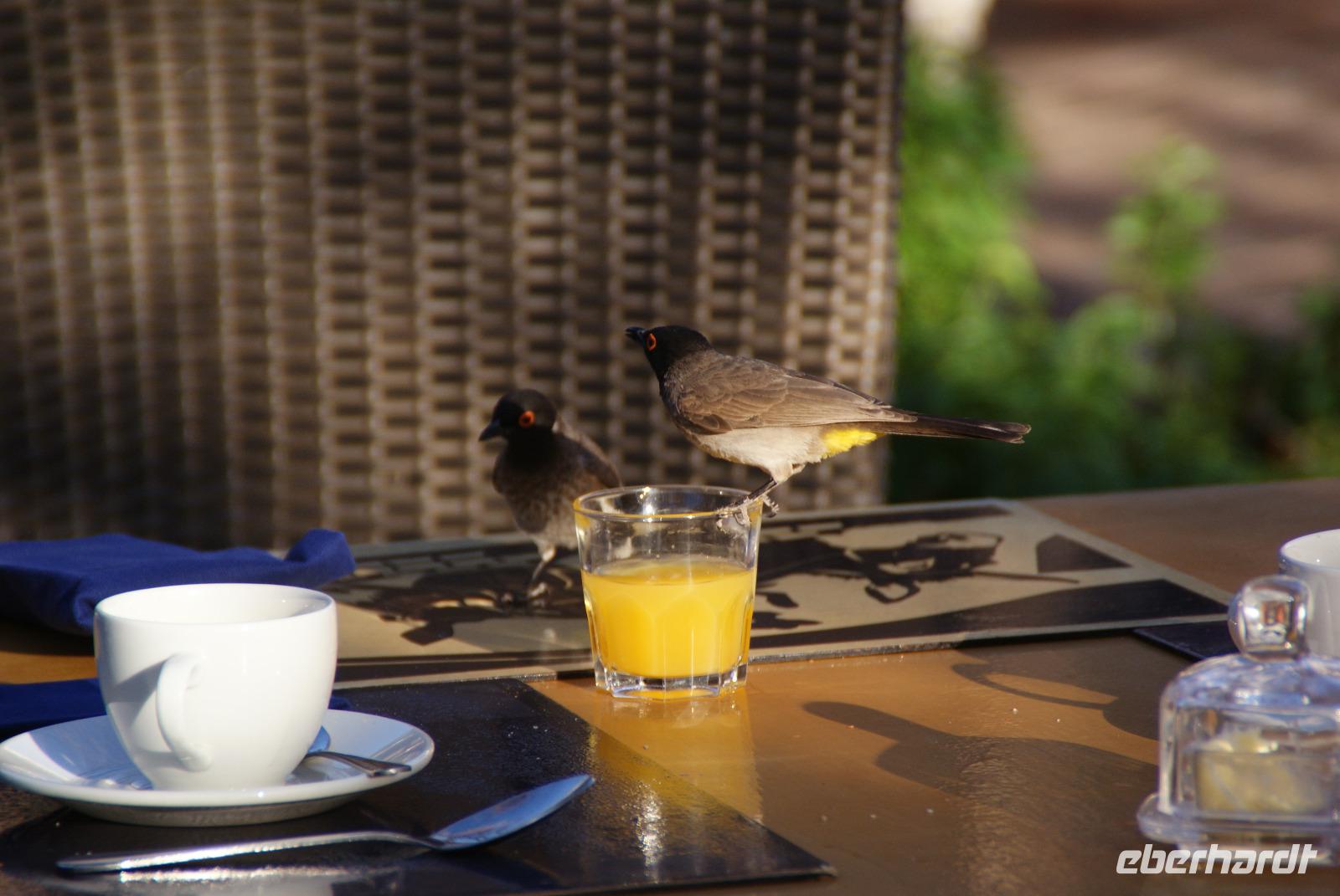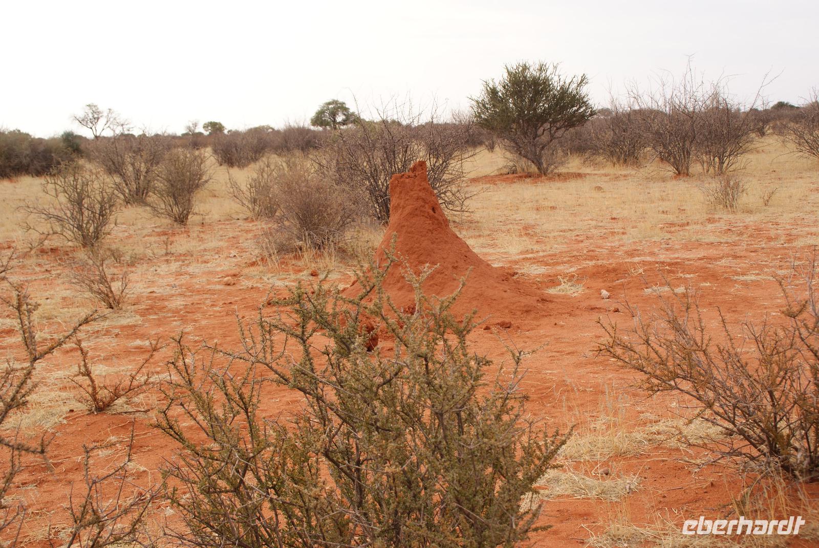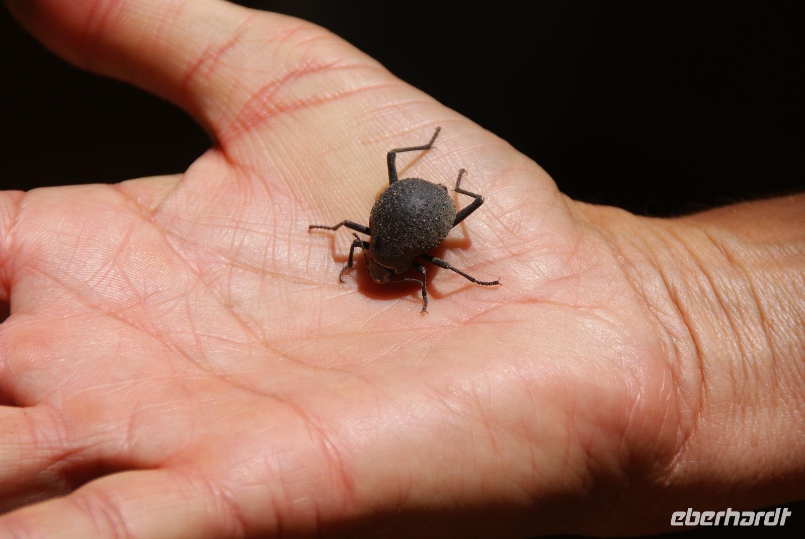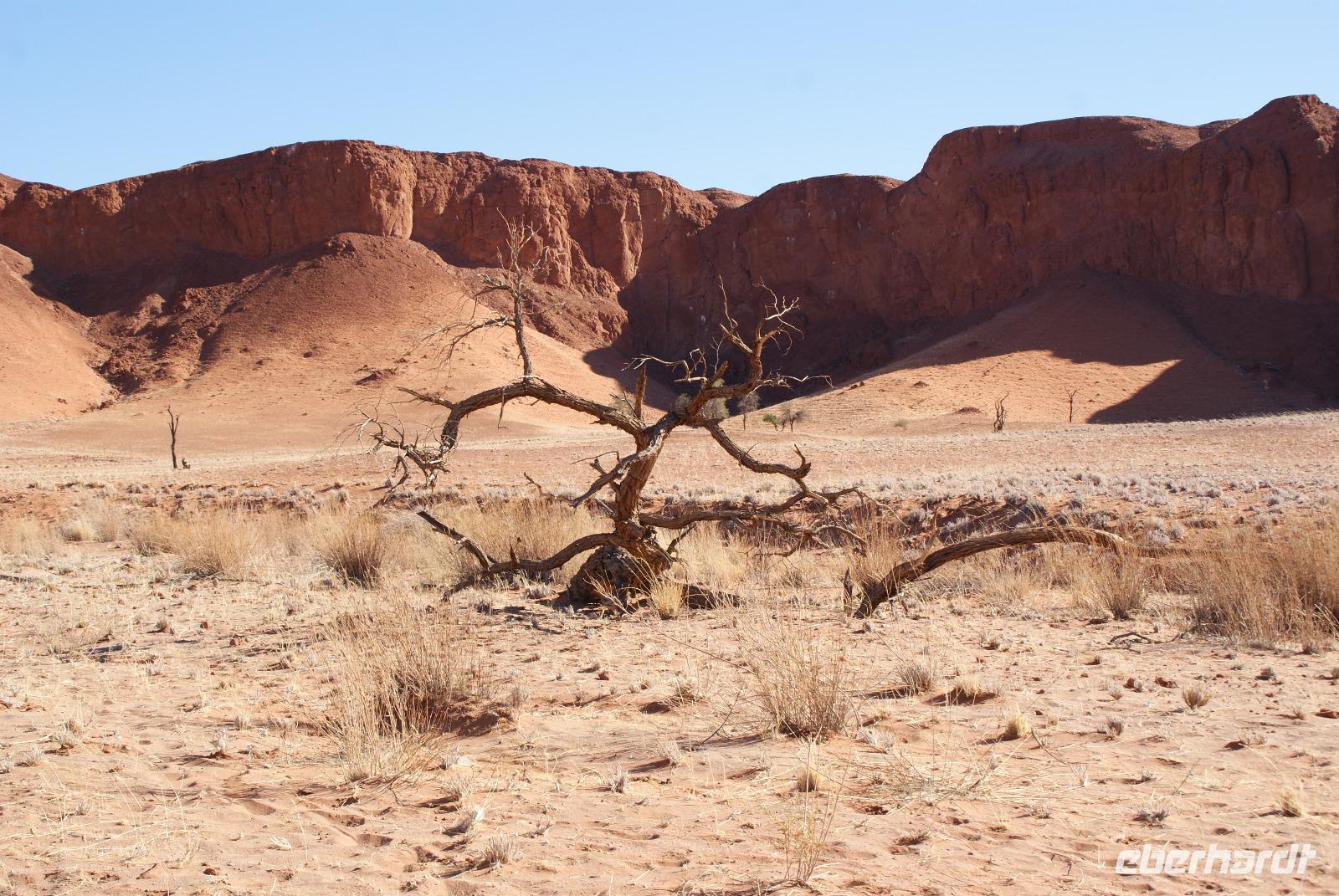 Mit viel Wind in den Ohren haben wir herrlich geschlafen und sehen uns ausgeruht und guter Dinge zum ersten Frühstück in Namibia wieder. Ein leckeres Buffet mit grandioser Aussicht auf das unter uns liegende Windhoek empfängt uns. Nachdem alle Koffer wieder verladen sind, verlassen wir die Stadt und machen uns auf Richtung Kalahari mit dem heutigen Tagesziel der Kalahari Anib Lodge. Vorbei am sogenannten „Heldenacker" mit imposantem Obelisk, welcher an den Freiheitskampf 1966 erinnern soll, fahren wir weiter und lassen die Weiten Namibias auf uns wirken. Zahlreiche Bärenpaviane säumen unsere Strecke und graben nach schmackhaften Wurzeln. Reiseleiterin Dagmar gibt uns eine schöne Einführung über viel Nützliches und Wissenswertes, was wir für unseren Aufenthalt in Namibia benötigen werden. Am frühen Nachmittag erreichen wir unsere Lodge und haben die nächsten Stunden Zeit, die jeder nach Lust und Laune mit relaxen, schwimmen im Pool oder einer Wanderung auf dem Gelände verbringen kann. Gegen 16.30 Uhr treffen sich alle zur gebuchten Sundowner Fahrt mit offenen Jeeps wieder. Unsere beiden Guides Jürgen und Levis begleiten uns auf dieser Tour und so fahren zwei Jeeps exklusiv für die Eberhardt Gäste los, um die Kalahari mit Flora, Fauna und vor allem schon den ersten Tieren kennenzulernen. Unser lustiger Guide Jürgen zeigt uns neben Termitenhügeln, Kameldornakazien auch lustige Dinge, wie den Kot des Gefängnisesels (Zebra) und auch auf eine Gruppe homo touristicos (andere Gäste) treffen wir....Spaß bei Seite...wir sehen Löcher im Boden, die sich sogenannte Erdferkel gegraben haben, halten an einer imposanten Webervogelkolonie mit unzähligen Nestern. Dort entdecken wir (also Jürgen) einen Flecken-Uhu und beobachten das Treiben der unzähligen Vögel der Kolonie. Wunderschöne Kudus stehen im Dickicht selbst die stolzen Oryx Antilopen, das Nationaltier Südafrikas bekommen wir zu sehen. Unseren Weg kreuzt ein Warzenschwein, welches auch scherzhaft Buschradio (Antenne, also der Schwanz bei Flucht nach oben) genannt wird. Ein leckeres Getränk in Form von Gin Tonic, Wein, Bier oder Softgetränk versüßt uns den herrlichen Sonnenuntergang in der Kalahari und so gut gestärkt verläuft die Rückfahrt nochmal so fröhlich. Nach so vielen schönen Eindrücken treibt uns der Hunger ans reichhaltige Buffet und in geselliger Runde lassen wir uns ein köstliches Abendessen besonders gut schmecken.