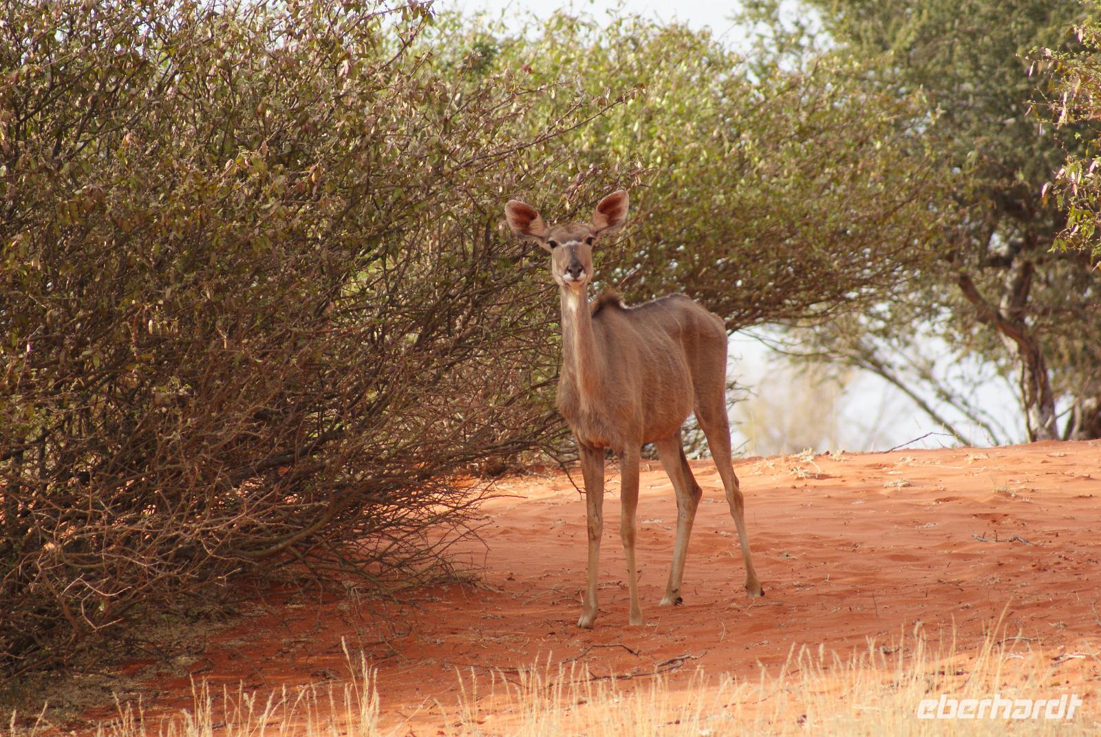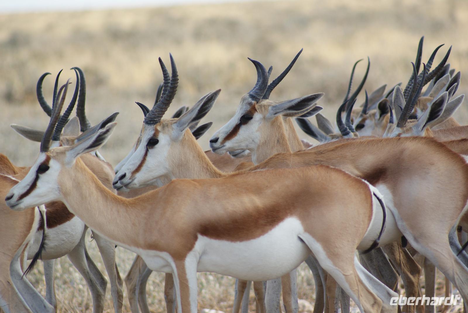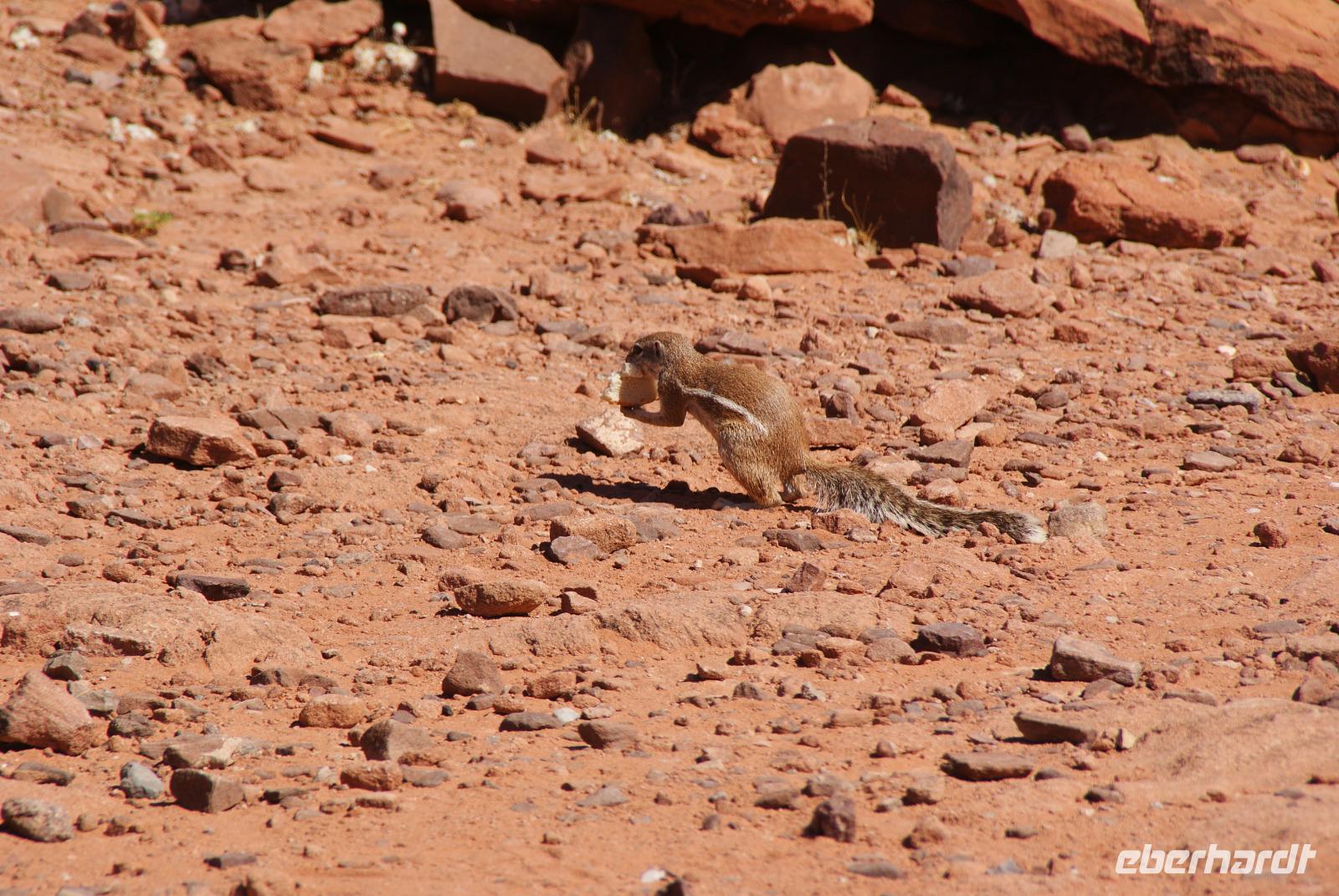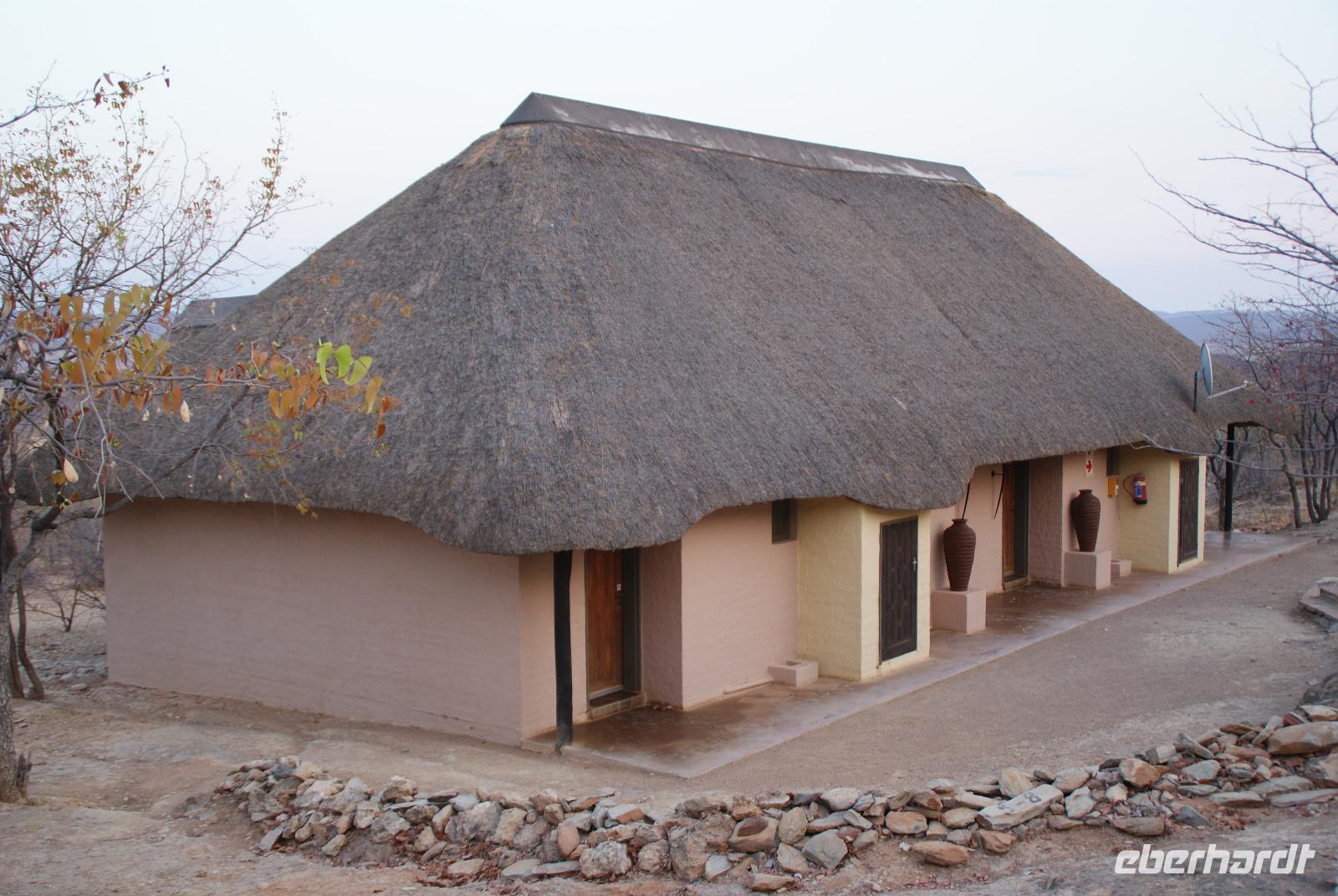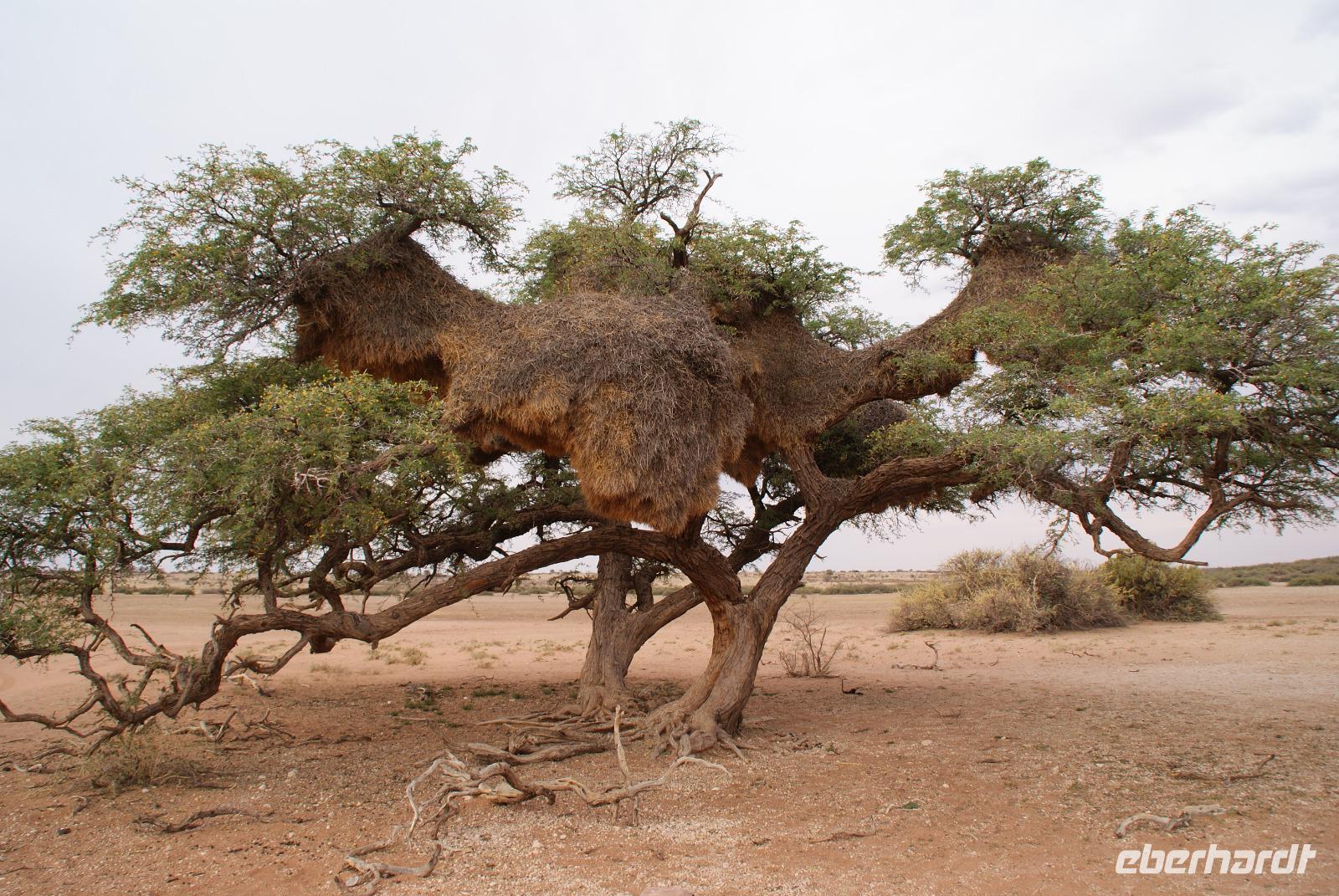Mit viel Wind in den Ohren haben wir herrlich geschlafen und sehen uns ausgeruht und guter Dinge zum ersten Frühstück in Namibia wieder. Ein leckeres Buffet mit grandioser Aussicht auf das unter uns liegende Windhoek empfängt uns. Nachdem alle Koffer wieder verladen sind, verlassen wir die Stadt und machen uns auf Richtung Kalahari mit dem heutigen Tagesziel der Kalahari Anib Lodge. Vorbei am sogenannten „Heldenacker" mit imposantem Obelisk, welcher an den Freiheitskampf 1966 erinnern soll, fahren wir weiter und lassen die Weiten Namibias auf uns wirken. Zahlreiche Bärenpaviane säumen unsere Strecke und graben nach schmackhaften Wurzeln. Reiseleiterin Dagmar gibt uns eine schöne Einführung über viel Nützliches und Wissenswertes, was wir für unseren Aufenthalt in Namibia benötigen werden. Am frühen Nachmittag erreichen wir unsere Lodge und haben die nächsten Stunden Zeit, die jeder nach Lust und Laune mit relaxen, schwimmen im Pool oder einer Wanderung auf dem Gelände verbringen kann. Gegen 16.30 Uhr treffen sich alle zur gebuchten Sundowner Fahrt mit offenen Jeeps wieder. Unsere beiden Guides Jürgen und Levis begleiten uns auf dieser Tour und so fahren zwei Jeeps exklusiv für die Eberhardt Gäste los, um die Kalahari mit Flora, Fauna und vor allem schon den ersten Tieren kennenzulernen. Unser lustiger Guide Jürgen zeigt uns neben Termitenhügeln, Kameldornakazien auch lustige Dinge, wie den Kot des Gefängnisesels (Zebra) und auch auf eine Gruppe homo touristicos (andere Gäste) treffen wir....Spaß bei Seite...wir sehen Löcher im Boden, die sich sogenannte Erdferkel gegraben haben, halten an einer imposanten Webervogelkolonie mit unzähligen Nestern. Dort entdecken wir (also Jürgen) einen Flecken-Uhu und beobachten das Treiben der unzähligen Vögel der Kolonie. Wunderschöne Kudus stehen im Dickicht selbst die stolzen Oryx Antilopen, das Nationaltier Südafrikas bekommen wir zu sehen. Unseren Weg kreuzt ein Warzenschwein, welches auch scherzhaft Buschradio (Antenne, also der Schwanz bei Flucht nach oben) genannt wird. Ein leckeres Getränk in Form von Gin Tonic, Wein, Bier oder Softgetränk versüßt uns den herrlichen Sonnenuntergang in der Kalahari und so gut gestärkt verläuft die Rückfahrt nochmal so fröhlich. Nach so vielen schönen Eindrücken treibt uns der Hunger ans reichhaltige Buffet und in geselliger Runde lassen wir uns ein köstliches Abendessen besonders gut schmecken.