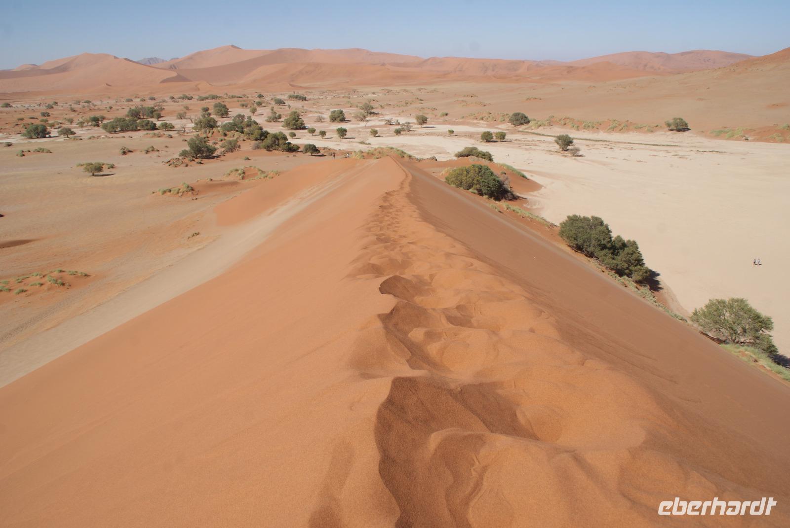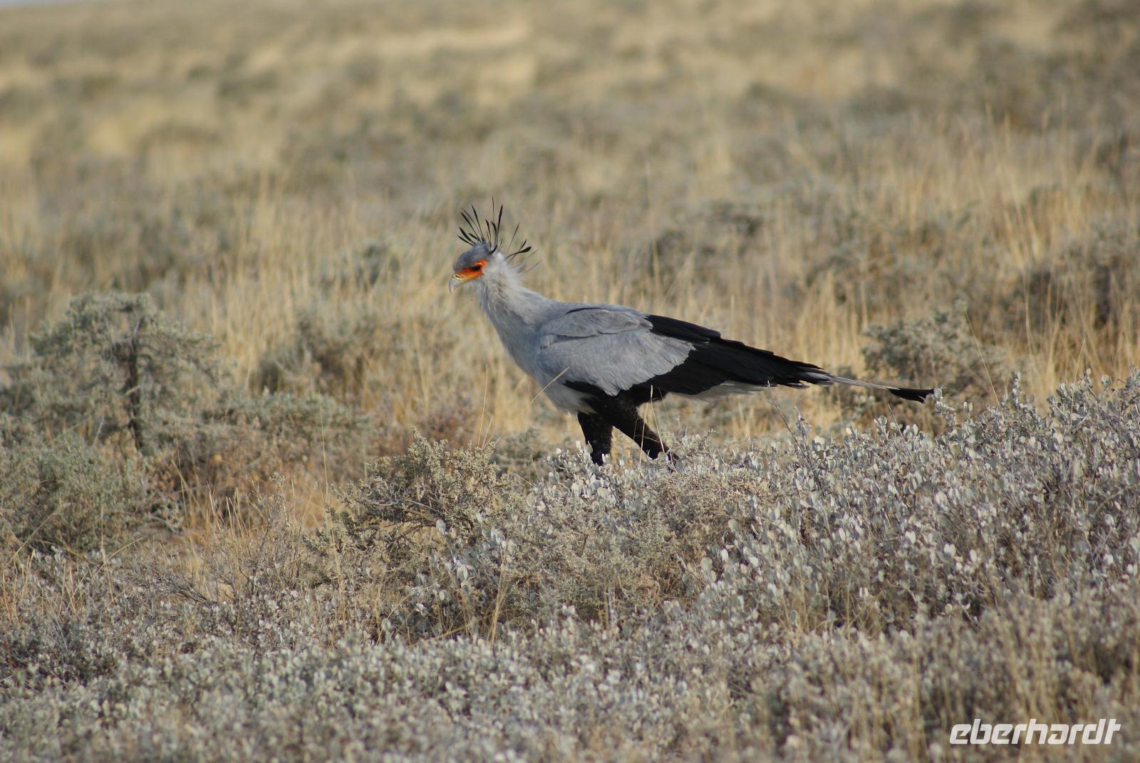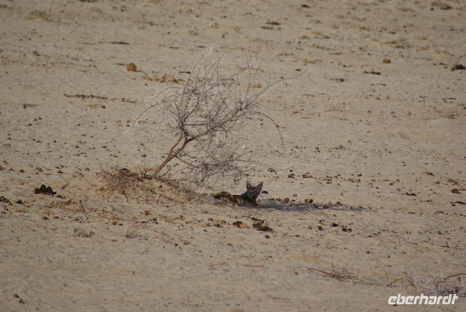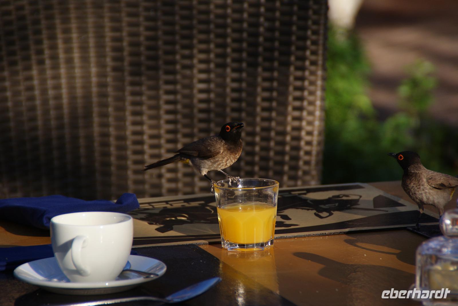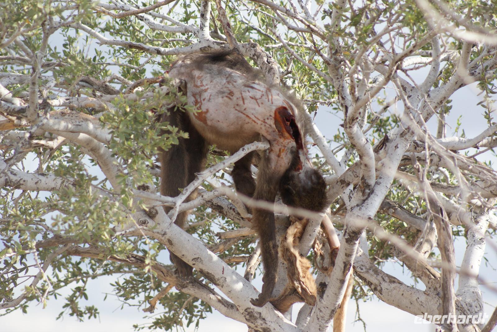 Mit viel Wind in den Ohren haben wir herrlich geschlafen und sehen uns ausgeruht und guter Dinge zum ersten Frühstück in Namibia wieder. Ein leckeres Buffet mit grandioser Aussicht auf das unter uns liegende Windhoek empfängt uns. Nachdem alle Koffer wieder verladen sind, verlassen wir die Stadt und machen uns auf Richtung Kalahari mit dem heutigen Tagesziel der Kalahari Anib Lodge. Vorbei am sogenannten „Heldenacker" mit imposantem Obelisk, welcher an den Freiheitskampf 1966 erinnern soll, fahren wir weiter und lassen die Weiten Namibias auf uns wirken. Zahlreiche Bärenpaviane säumen unsere Strecke und graben nach schmackhaften Wurzeln. Reiseleiterin Dagmar gibt uns eine schöne Einführung über viel Nützliches und Wissenswertes, was wir für unseren Aufenthalt in Namibia benötigen werden. Am frühen Nachmittag erreichen wir unsere Lodge und haben die nächsten Stunden Zeit, die jeder nach Lust und Laune mit relaxen, schwimmen im Pool oder einer Wanderung auf dem Gelände verbringen kann. Gegen 16.30 Uhr treffen sich alle zur gebuchten Sundowner Fahrt mit offenen Jeeps wieder. Unsere beiden Guides Jürgen und Levis begleiten uns auf dieser Tour und so fahren zwei Jeeps exklusiv für die Eberhardt Gäste los, um die Kalahari mit Flora, Fauna und vor allem schon den ersten Tieren kennenzulernen. Unser lustiger Guide Jürgen zeigt uns neben Termitenhügeln, Kameldornakazien auch lustige Dinge, wie den Kot des Gefängnisesels (Zebra) und auch auf eine Gruppe homo touristicos (andere Gäste) treffen wir....Spaß bei Seite...wir sehen Löcher im Boden, die sich sogenannte Erdferkel gegraben haben, halten an einer imposanten Webervogelkolonie mit unzähligen Nestern. Dort entdecken wir (also Jürgen) einen Flecken-Uhu und beobachten das Treiben der unzähligen Vögel der Kolonie. Wunderschöne Kudus stehen im Dickicht selbst die stolzen Oryx Antilopen, das Nationaltier Südafrikas bekommen wir zu sehen. Unseren Weg kreuzt ein Warzenschwein, welches auch scherzhaft Buschradio (Antenne, also der Schwanz bei Flucht nach oben) genannt wird. Ein leckeres Getränk in Form von Gin Tonic, Wein, Bier oder Softgetränk versüßt uns den herrlichen Sonnenuntergang in der Kalahari und so gut gestärkt verläuft die Rückfahrt nochmal so fröhlich. Nach so vielen schönen Eindrücken treibt uns der Hunger ans reichhaltige Buffet und in geselliger Runde lassen wir uns ein köstliches Abendessen besonders gut schmecken.