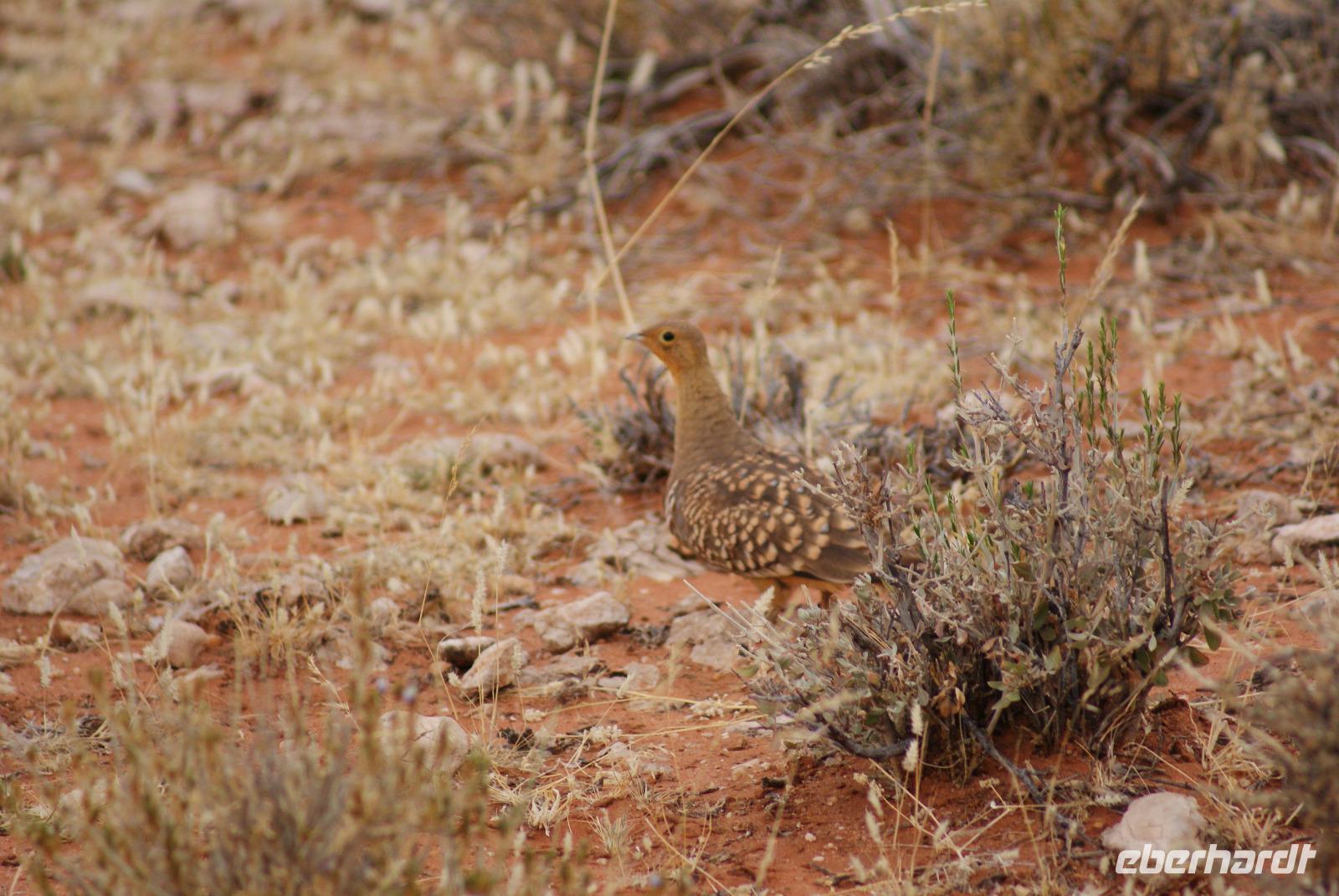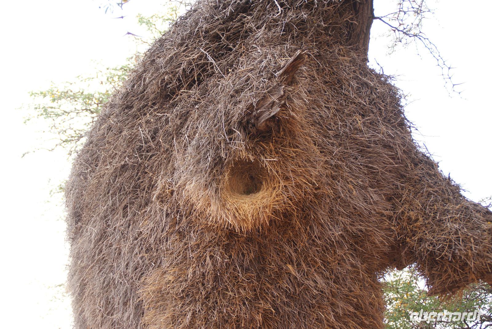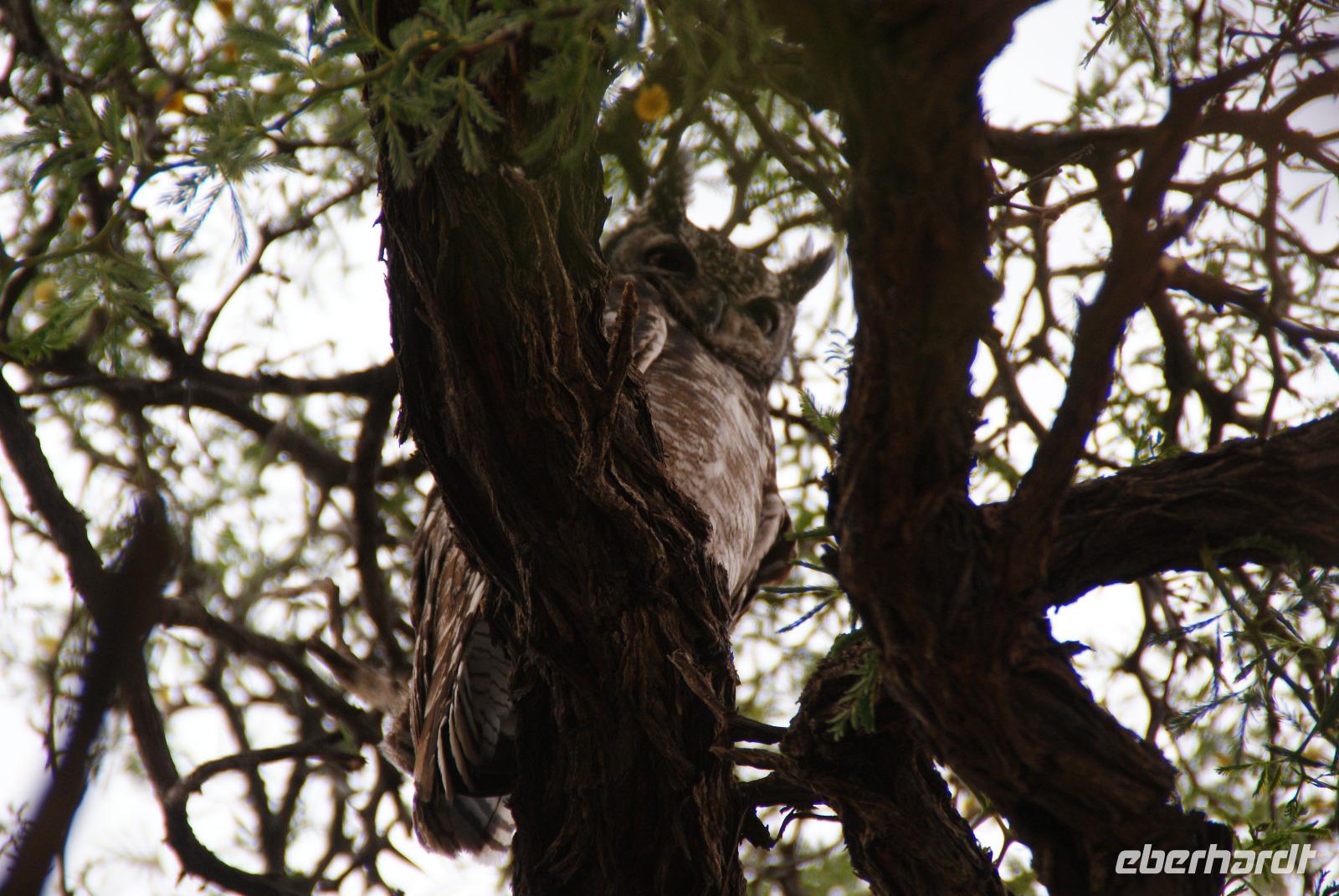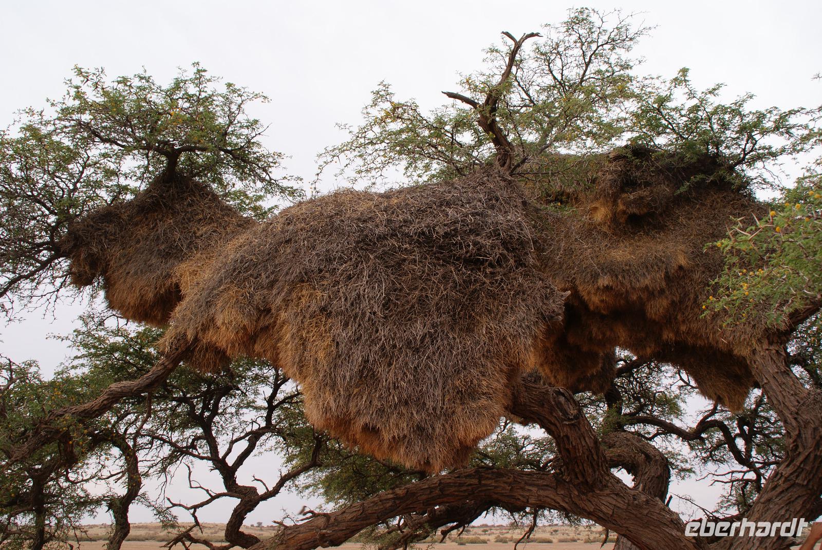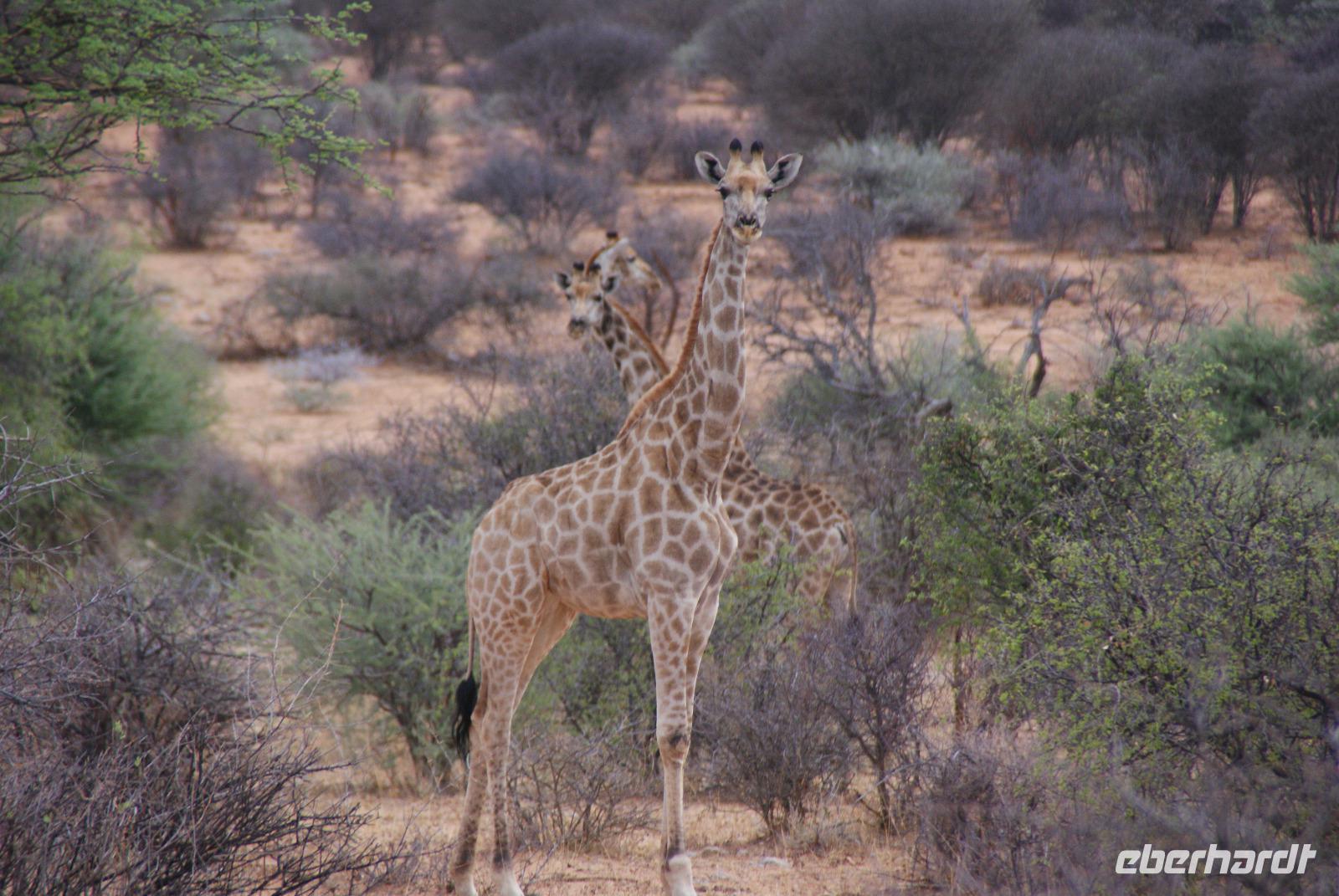Mit viel Wind in den Ohren haben wir herrlich geschlafen und sehen uns ausgeruht und guter Dinge zum ersten Frühstück in Namibia wieder. Ein leckeres Buffet mit grandioser Aussicht auf das unter uns liegende Windhoek empfängt uns. Nachdem alle Koffer wieder verladen sind, verlassen wir die Stadt und machen uns auf Richtung Kalahari mit dem heutigen Tagesziel der Kalahari Anib Lodge. Vorbei am sogenannten „Heldenacker" mit imposantem Obelisk, welcher an den Freiheitskampf 1966 erinnern soll, fahren wir weiter und lassen die Weiten Namibias auf uns wirken. Zahlreiche Bärenpaviane säumen unsere Strecke und graben nach schmackhaften Wurzeln. Reiseleiterin Dagmar gibt uns eine schöne Einführung über viel Nützliches und Wissenswertes, was wir für unseren Aufenthalt in Namibia benötigen werden. Am frühen Nachmittag erreichen wir unsere Lodge und haben die nächsten Stunden Zeit, die jeder nach Lust und Laune mit relaxen, schwimmen im Pool oder einer Wanderung auf dem Gelände verbringen kann. Gegen 16.30 Uhr treffen sich alle zur gebuchten Sundowner Fahrt mit offenen Jeeps wieder. Unsere beiden Guides Jürgen und Levis begleiten uns auf dieser Tour und so fahren zwei Jeeps exklusiv für die Eberhardt Gäste los, um die Kalahari mit Flora, Fauna und vor allem schon den ersten Tieren kennenzulernen. Unser lustiger Guide Jürgen zeigt uns neben Termitenhügeln, Kameldornakazien auch lustige Dinge, wie den Kot des Gefängnisesels (Zebra) und auch auf eine Gruppe homo touristicos (andere Gäste) treffen wir....Spaß bei Seite...wir sehen Löcher im Boden, die sich sogenannte Erdferkel gegraben haben, halten an einer imposanten Webervogelkolonie mit unzähligen Nestern. Dort entdecken wir (also Jürgen) einen Flecken-Uhu und beobachten das Treiben der unzähligen Vögel der Kolonie. Wunderschöne Kudus stehen im Dickicht selbst die stolzen Oryx Antilopen, das Nationaltier Südafrikas bekommen wir zu sehen. Unseren Weg kreuzt ein Warzenschwein, welches auch scherzhaft Buschradio (Antenne, also der Schwanz bei Flucht nach oben) genannt wird. Ein leckeres Getränk in Form von Gin Tonic, Wein, Bier oder Softgetränk versüßt uns den herrlichen Sonnenuntergang in der Kalahari und so gut gestärkt verläuft die Rückfahrt nochmal so fröhlich. Nach so vielen schönen Eindrücken treibt uns der Hunger ans reichhaltige Buffet und in geselliger Runde lassen wir uns ein köstliches Abendessen besonders gut schmecken.