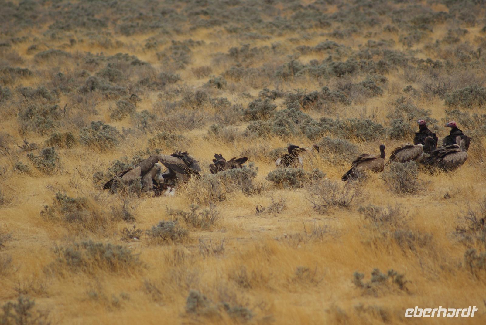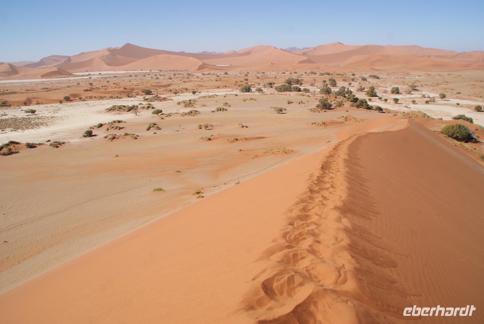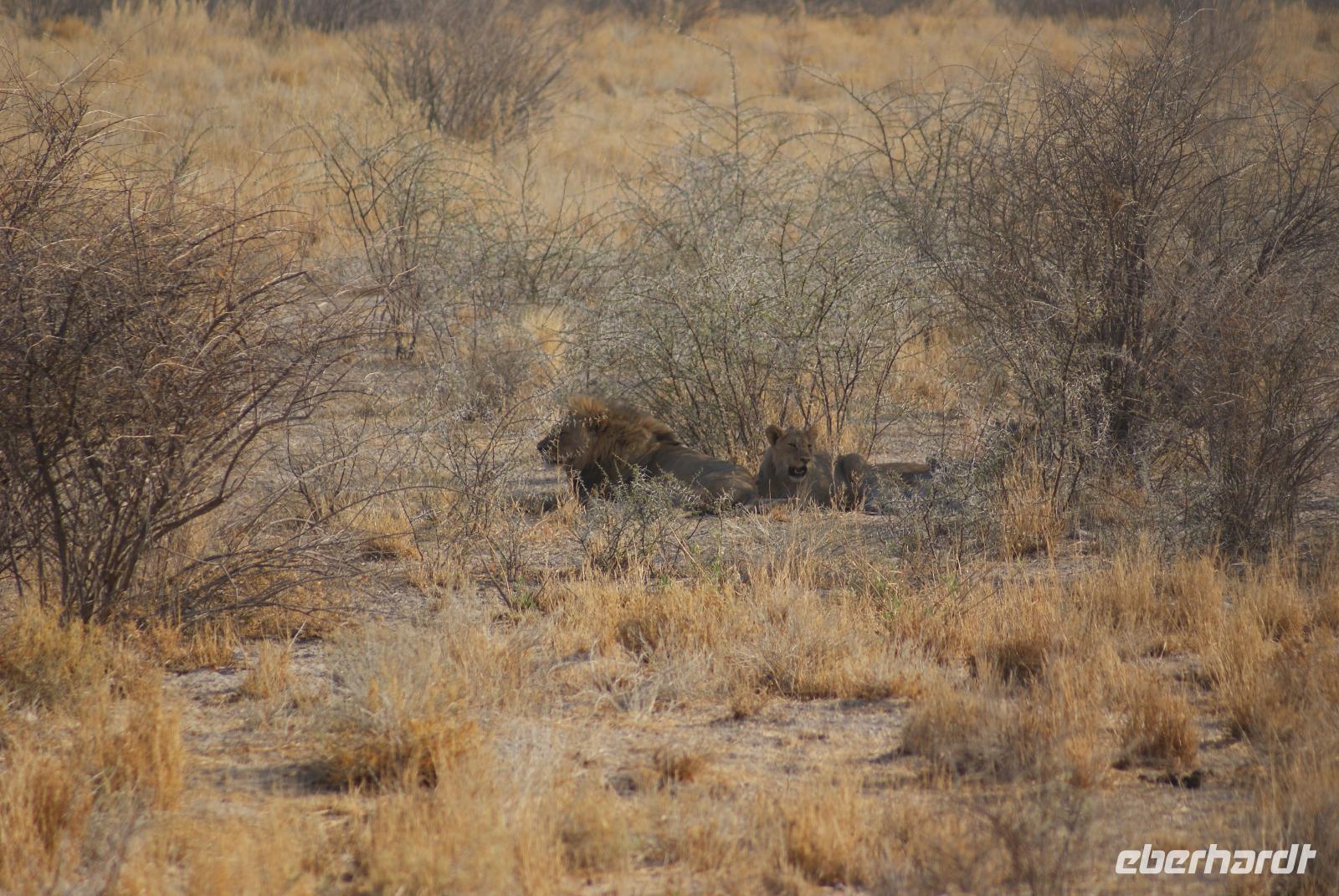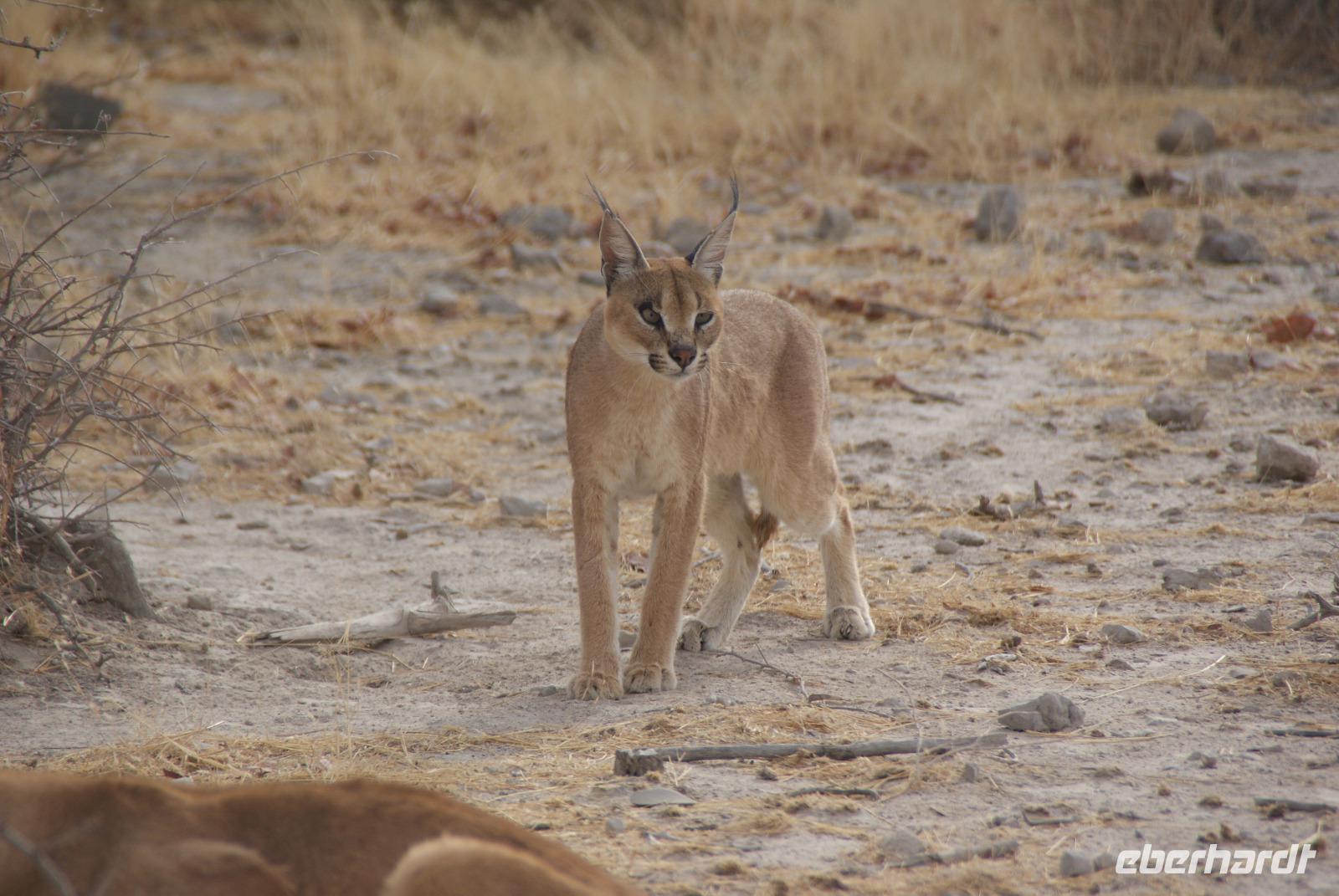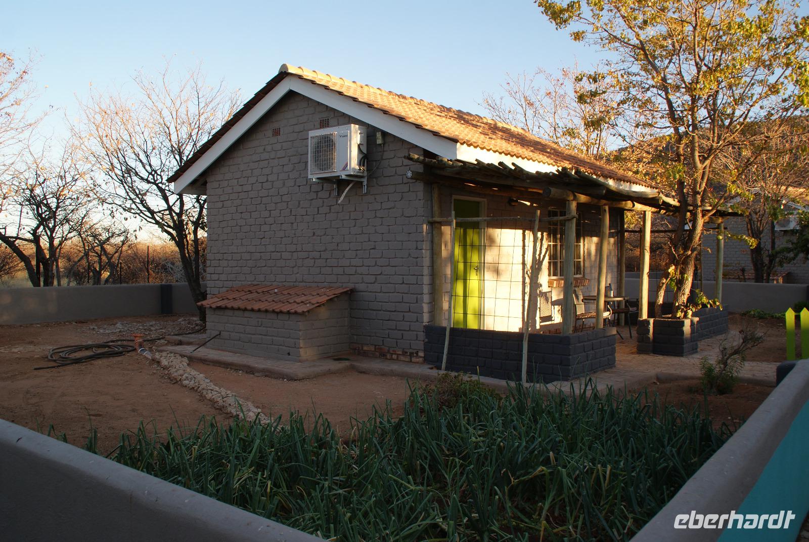 Mit viel Wind in den Ohren haben wir herrlich geschlafen und sehen uns ausgeruht und guter Dinge zum ersten Frühstück in Namibia wieder. Ein leckeres Buffet mit grandioser Aussicht auf das unter uns liegende Windhoek empfängt uns. Nachdem alle Koffer wieder verladen sind, verlassen wir die Stadt und machen uns auf Richtung Kalahari mit dem heutigen Tagesziel der Kalahari Anib Lodge. Vorbei am sogenannten „Heldenacker" mit imposantem Obelisk, welcher an den Freiheitskampf 1966 erinnern soll, fahren wir weiter und lassen die Weiten Namibias auf uns wirken. Zahlreiche Bärenpaviane säumen unsere Strecke und graben nach schmackhaften Wurzeln. Reiseleiterin Dagmar gibt uns eine schöne Einführung über viel Nützliches und Wissenswertes, was wir für unseren Aufenthalt in Namibia benötigen werden. Am frühen Nachmittag erreichen wir unsere Lodge und haben die nächsten Stunden Zeit, die jeder nach Lust und Laune mit relaxen, schwimmen im Pool oder einer Wanderung auf dem Gelände verbringen kann. Gegen 16.30 Uhr treffen sich alle zur gebuchten Sundowner Fahrt mit offenen Jeeps wieder. Unsere beiden Guides Jürgen und Levis begleiten uns auf dieser Tour und so fahren zwei Jeeps exklusiv für die Eberhardt Gäste los, um die Kalahari mit Flora, Fauna und vor allem schon den ersten Tieren kennenzulernen. Unser lustiger Guide Jürgen zeigt uns neben Termitenhügeln, Kameldornakazien auch lustige Dinge, wie den Kot des Gefängnisesels (Zebra) und auch auf eine Gruppe homo touristicos (andere Gäste) treffen wir....Spaß bei Seite...wir sehen Löcher im Boden, die sich sogenannte Erdferkel gegraben haben, halten an einer imposanten Webervogelkolonie mit unzähligen Nestern. Dort entdecken wir (also Jürgen) einen Flecken-Uhu und beobachten das Treiben der unzähligen Vögel der Kolonie. Wunderschöne Kudus stehen im Dickicht selbst die stolzen Oryx Antilopen, das Nationaltier Südafrikas bekommen wir zu sehen. Unseren Weg kreuzt ein Warzenschwein, welches auch scherzhaft Buschradio (Antenne, also der Schwanz bei Flucht nach oben) genannt wird. Ein leckeres Getränk in Form von Gin Tonic, Wein, Bier oder Softgetränk versüßt uns den herrlichen Sonnenuntergang in der Kalahari und so gut gestärkt verläuft die Rückfahrt nochmal so fröhlich. Nach so vielen schönen Eindrücken treibt uns der Hunger ans reichhaltige Buffet und in geselliger Runde lassen wir uns ein köstliches Abendessen besonders gut schmecken.