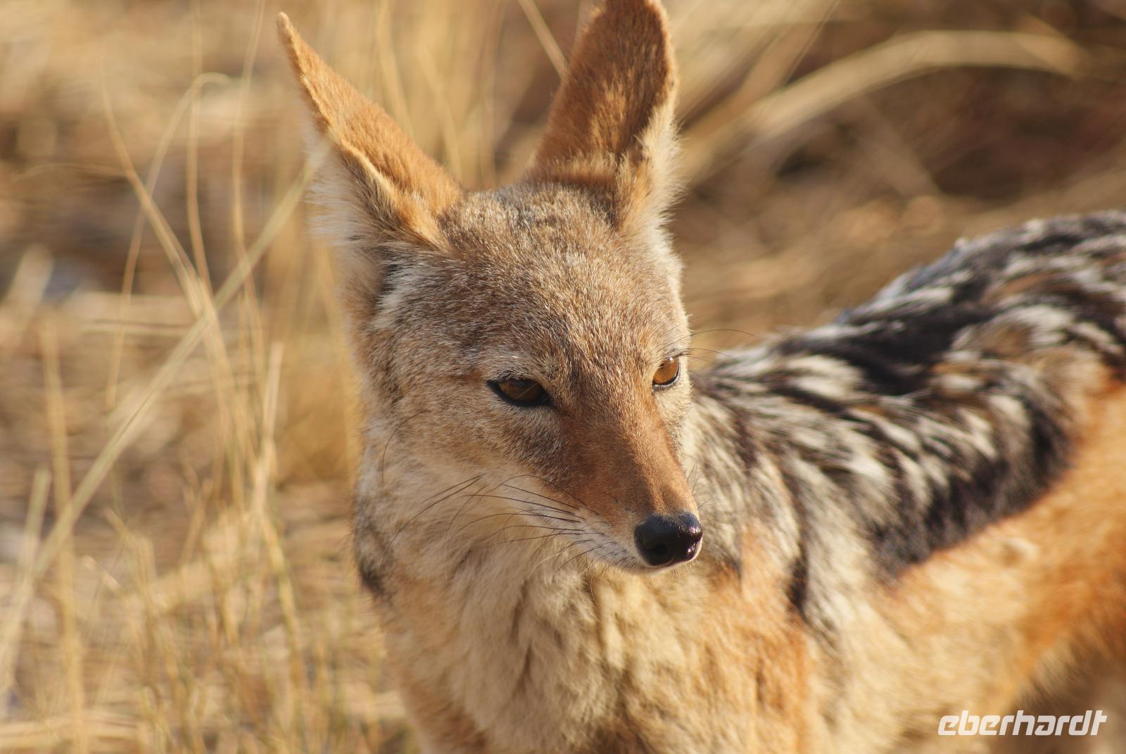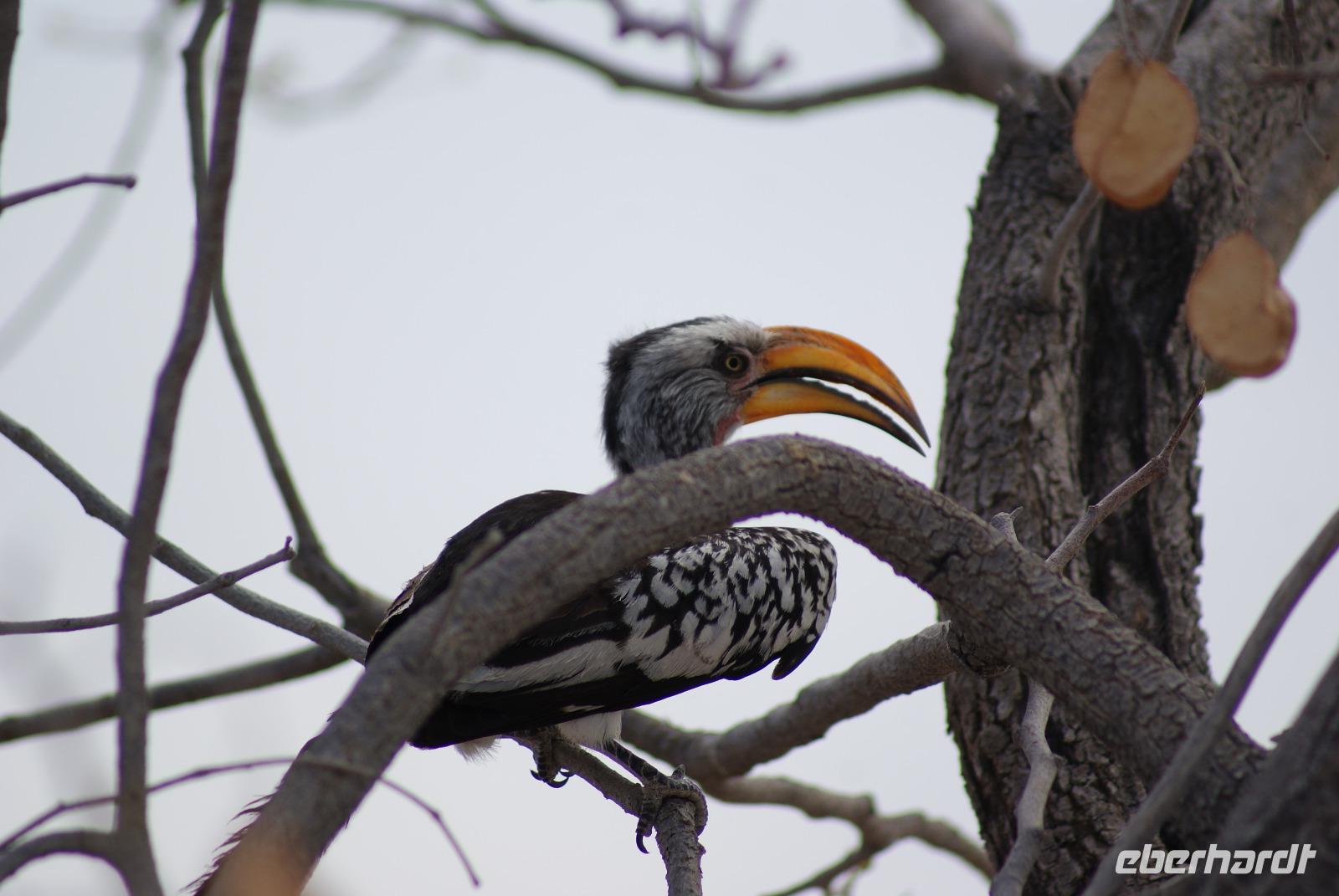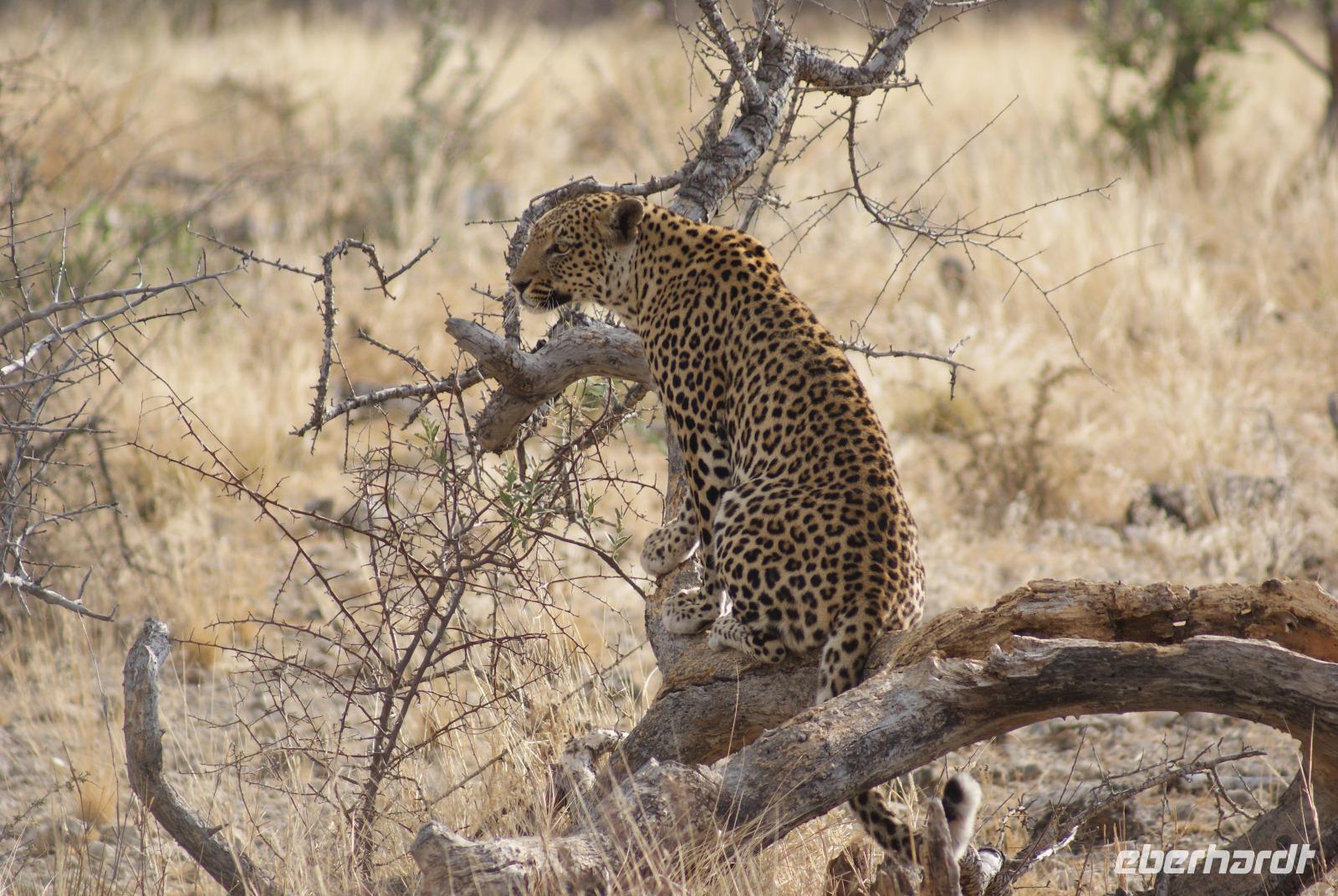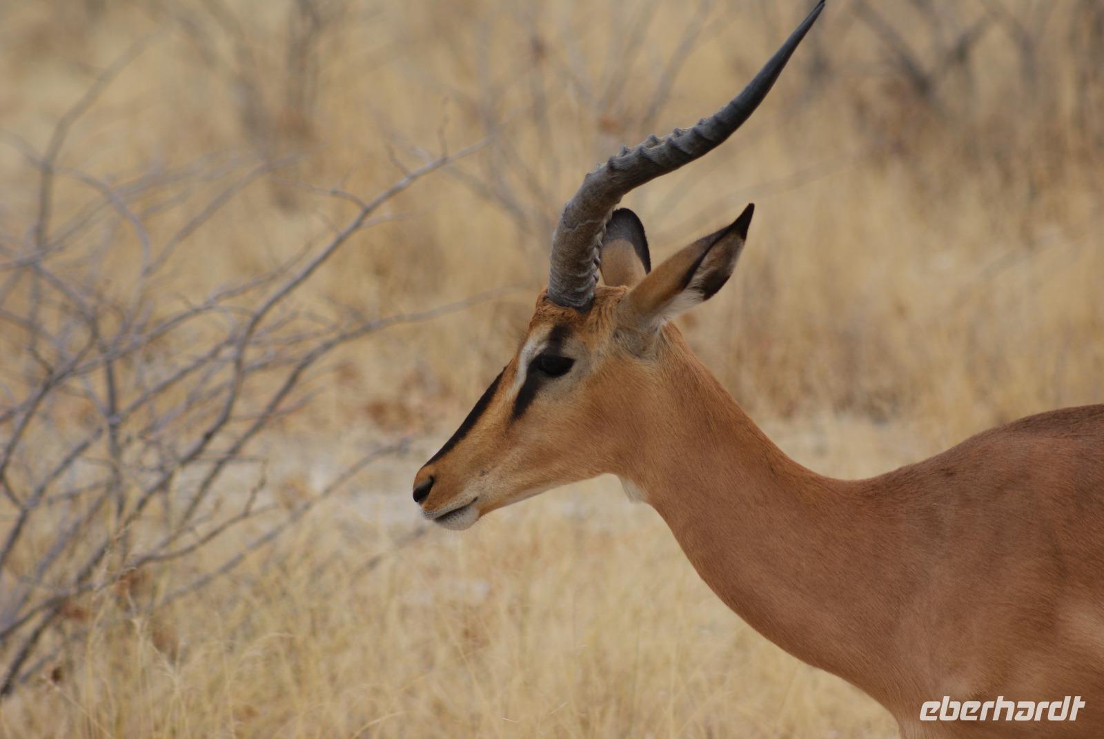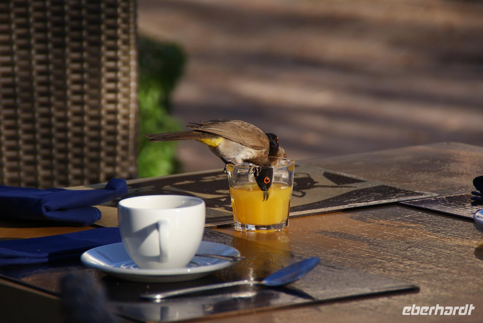 Mit viel Wind in den Ohren haben wir herrlich geschlafen und sehen uns ausgeruht und guter Dinge zum ersten Frühstück in Namibia wieder. Ein leckeres Buffet mit grandioser Aussicht auf das unter uns liegende Windhoek empfängt uns. Nachdem alle Koffer wieder verladen sind, verlassen wir die Stadt und machen uns auf Richtung Kalahari mit dem heutigen Tagesziel der Kalahari Anib Lodge. Vorbei am sogenannten „Heldenacker" mit imposantem Obelisk, welcher an den Freiheitskampf 1966 erinnern soll, fahren wir weiter und lassen die Weiten Namibias auf uns wirken. Zahlreiche Bärenpaviane säumen unsere Strecke und graben nach schmackhaften Wurzeln. Reiseleiterin Dagmar gibt uns eine schöne Einführung über viel Nützliches und Wissenswertes, was wir für unseren Aufenthalt in Namibia benötigen werden. Am frühen Nachmittag erreichen wir unsere Lodge und haben die nächsten Stunden Zeit, die jeder nach Lust und Laune mit relaxen, schwimmen im Pool oder einer Wanderung auf dem Gelände verbringen kann. Gegen 16.30 Uhr treffen sich alle zur gebuchten Sundowner Fahrt mit offenen Jeeps wieder. Unsere beiden Guides Jürgen und Levis begleiten uns auf dieser Tour und so fahren zwei Jeeps exklusiv für die Eberhardt Gäste los, um die Kalahari mit Flora, Fauna und vor allem schon den ersten Tieren kennenzulernen. Unser lustiger Guide Jürgen zeigt uns neben Termitenhügeln, Kameldornakazien auch lustige Dinge, wie den Kot des Gefängnisesels (Zebra) und auch auf eine Gruppe homo touristicos (andere Gäste) treffen wir....Spaß bei Seite...wir sehen Löcher im Boden, die sich sogenannte Erdferkel gegraben haben, halten an einer imposanten Webervogelkolonie mit unzähligen Nestern. Dort entdecken wir (also Jürgen) einen Flecken-Uhu und beobachten das Treiben der unzähligen Vögel der Kolonie. Wunderschöne Kudus stehen im Dickicht selbst die stolzen Oryx Antilopen, das Nationaltier Südafrikas bekommen wir zu sehen. Unseren Weg kreuzt ein Warzenschwein, welches auch scherzhaft Buschradio (Antenne, also der Schwanz bei Flucht nach oben) genannt wird. Ein leckeres Getränk in Form von Gin Tonic, Wein, Bier oder Softgetränk versüßt uns den herrlichen Sonnenuntergang in der Kalahari und so gut gestärkt verläuft die Rückfahrt nochmal so fröhlich. Nach so vielen schönen Eindrücken treibt uns der Hunger ans reichhaltige Buffet und in geselliger Runde lassen wir uns ein köstliches Abendessen besonders gut schmecken.