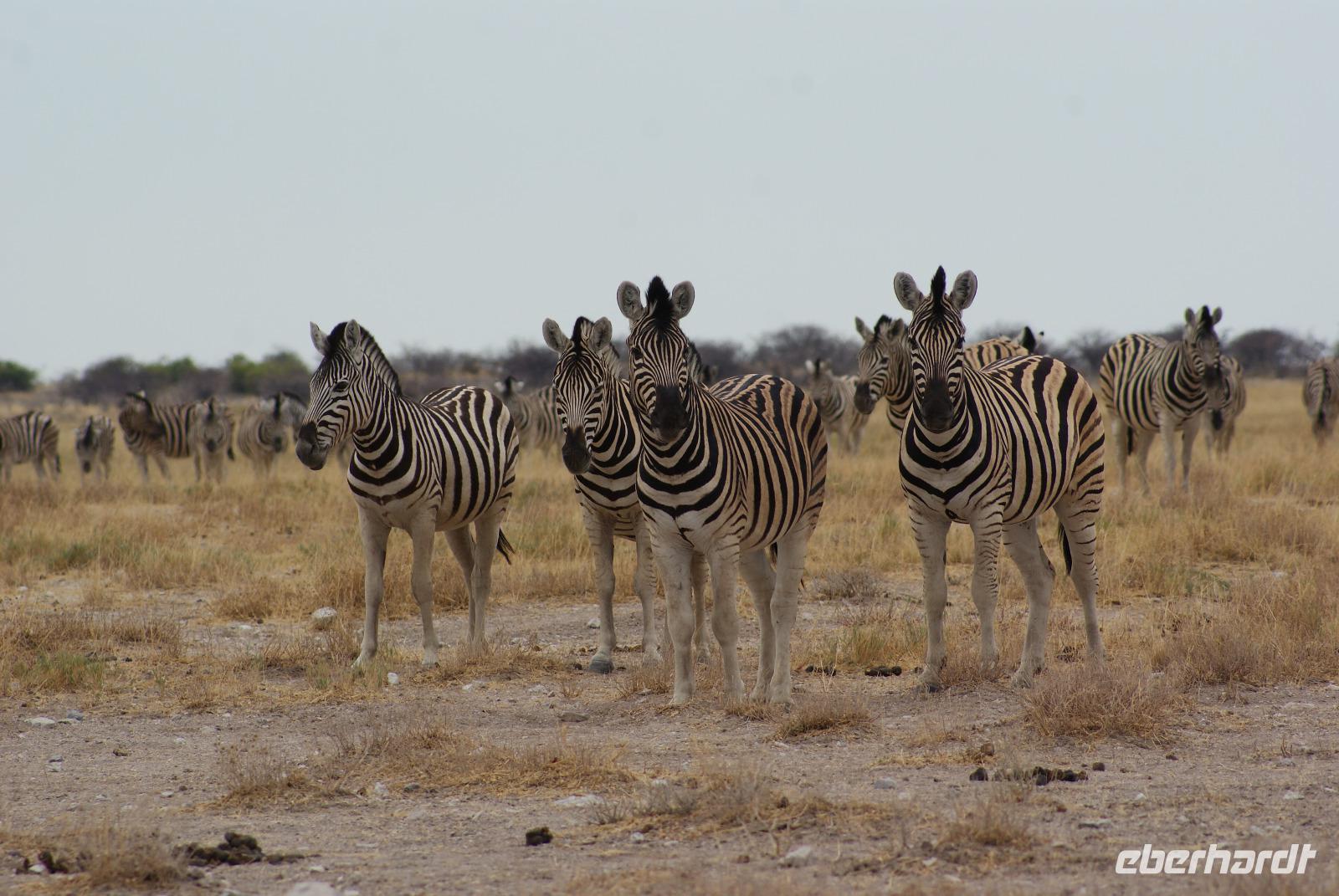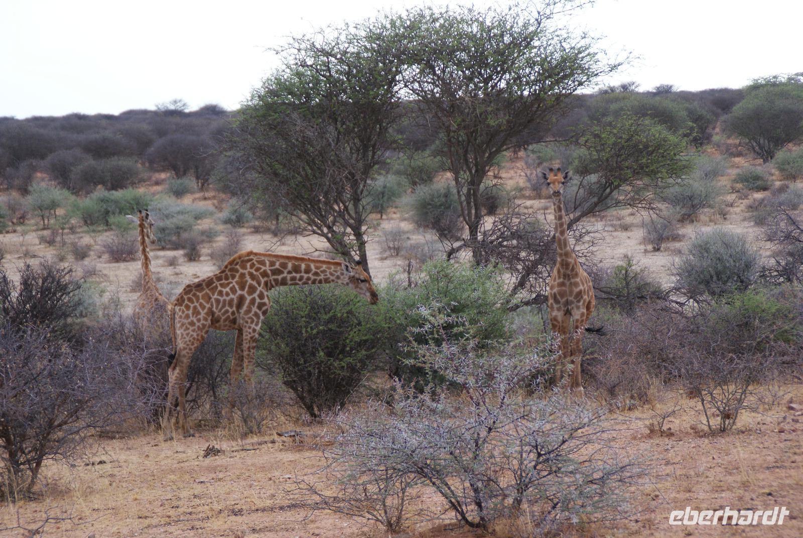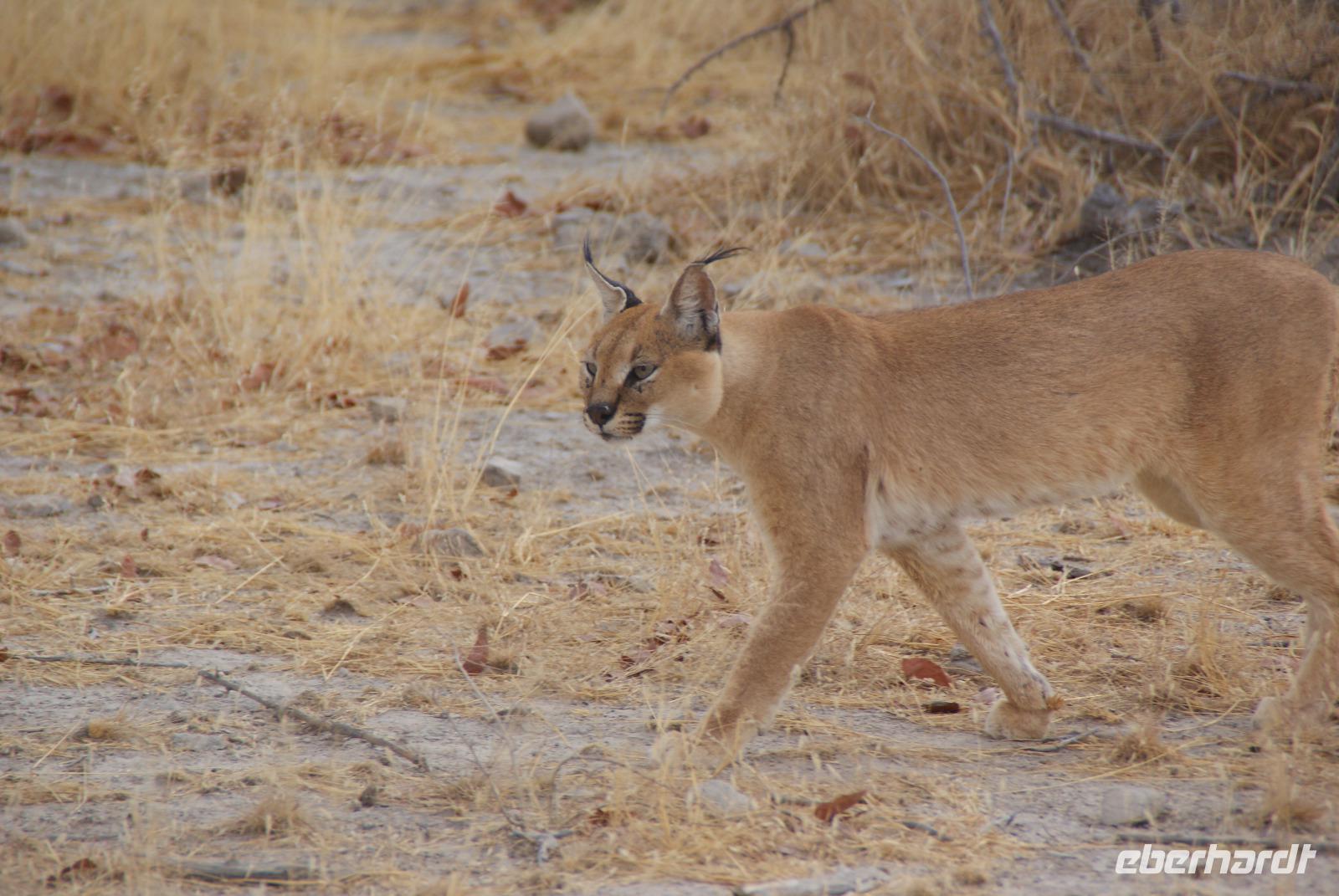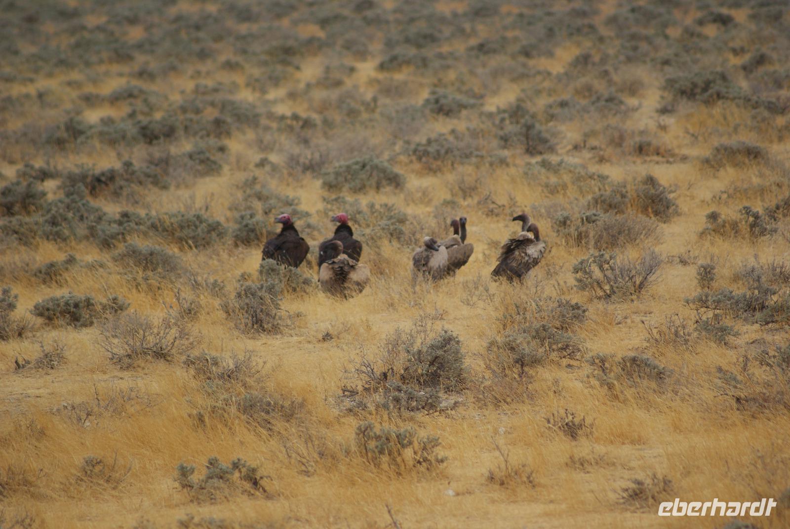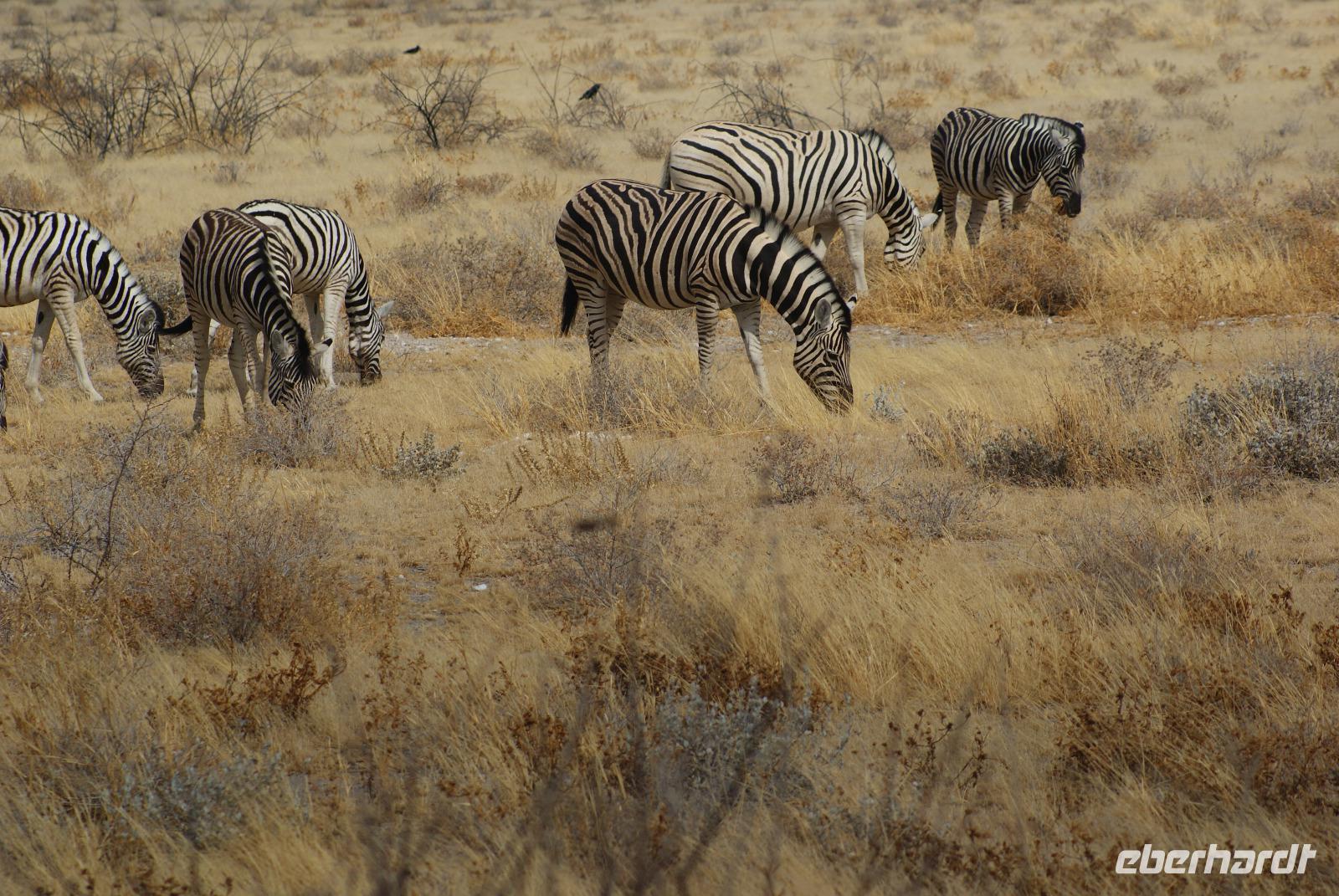 Mit viel Wind in den Ohren haben wir herrlich geschlafen und sehen uns ausgeruht und guter Dinge zum ersten Frühstück in Namibia wieder. Ein leckeres Buffet mit grandioser Aussicht auf das unter uns liegende Windhoek empfängt uns. Nachdem alle Koffer wieder verladen sind, verlassen wir die Stadt und machen uns auf Richtung Kalahari mit dem heutigen Tagesziel der Kalahari Anib Lodge. Vorbei am sogenannten „Heldenacker" mit imposantem Obelisk, welcher an den Freiheitskampf 1966 erinnern soll, fahren wir weiter und lassen die Weiten Namibias auf uns wirken. Zahlreiche Bärenpaviane säumen unsere Strecke und graben nach schmackhaften Wurzeln. Reiseleiterin Dagmar gibt uns eine schöne Einführung über viel Nützliches und Wissenswertes, was wir für unseren Aufenthalt in Namibia benötigen werden. Am frühen Nachmittag erreichen wir unsere Lodge und haben die nächsten Stunden Zeit, die jeder nach Lust und Laune mit relaxen, schwimmen im Pool oder einer Wanderung auf dem Gelände verbringen kann. Gegen 16.30 Uhr treffen sich alle zur gebuchten Sundowner Fahrt mit offenen Jeeps wieder. Unsere beiden Guides Jürgen und Levis begleiten uns auf dieser Tour und so fahren zwei Jeeps exklusiv für die Eberhardt Gäste los, um die Kalahari mit Flora, Fauna und vor allem schon den ersten Tieren kennenzulernen. Unser lustiger Guide Jürgen zeigt uns neben Termitenhügeln, Kameldornakazien auch lustige Dinge, wie den Kot des Gefängnisesels (Zebra) und auch auf eine Gruppe homo touristicos (andere Gäste) treffen wir....Spaß bei Seite...wir sehen Löcher im Boden, die sich sogenannte Erdferkel gegraben haben, halten an einer imposanten Webervogelkolonie mit unzähligen Nestern. Dort entdecken wir (also Jürgen) einen Flecken-Uhu und beobachten das Treiben der unzähligen Vögel der Kolonie. Wunderschöne Kudus stehen im Dickicht selbst die stolzen Oryx Antilopen, das Nationaltier Südafrikas bekommen wir zu sehen. Unseren Weg kreuzt ein Warzenschwein, welches auch scherzhaft Buschradio (Antenne, also der Schwanz bei Flucht nach oben) genannt wird. Ein leckeres Getränk in Form von Gin Tonic, Wein, Bier oder Softgetränk versüßt uns den herrlichen Sonnenuntergang in der Kalahari und so gut gestärkt verläuft die Rückfahrt nochmal so fröhlich. Nach so vielen schönen Eindrücken treibt uns der Hunger ans reichhaltige Buffet und in geselliger Runde lassen wir uns ein köstliches Abendessen besonders gut schmecken.