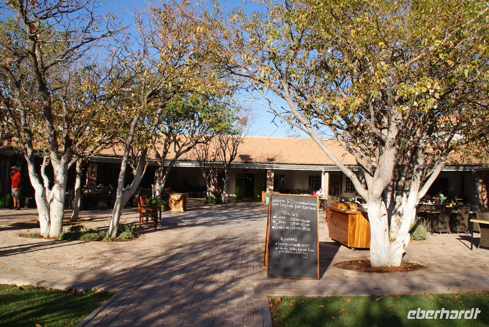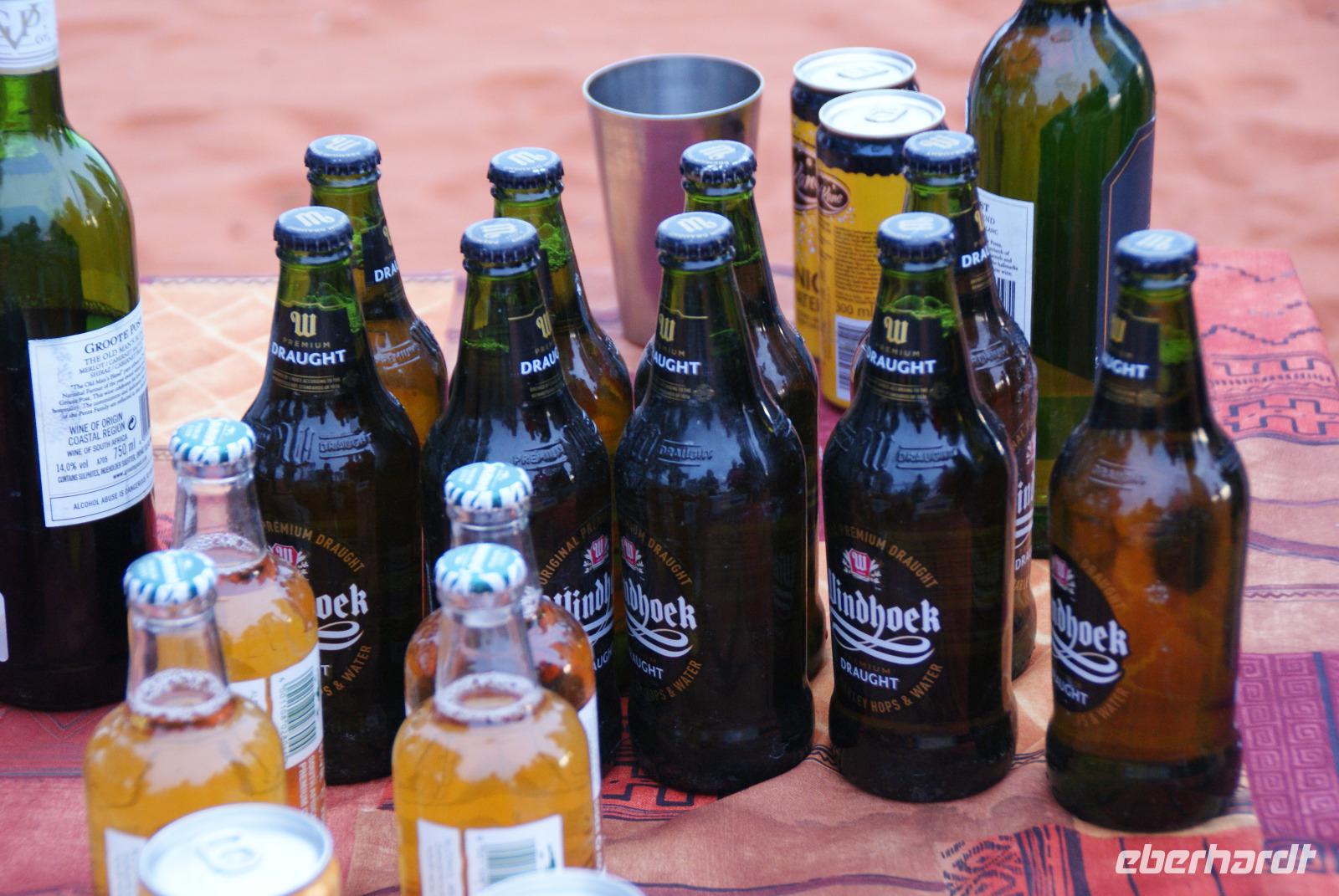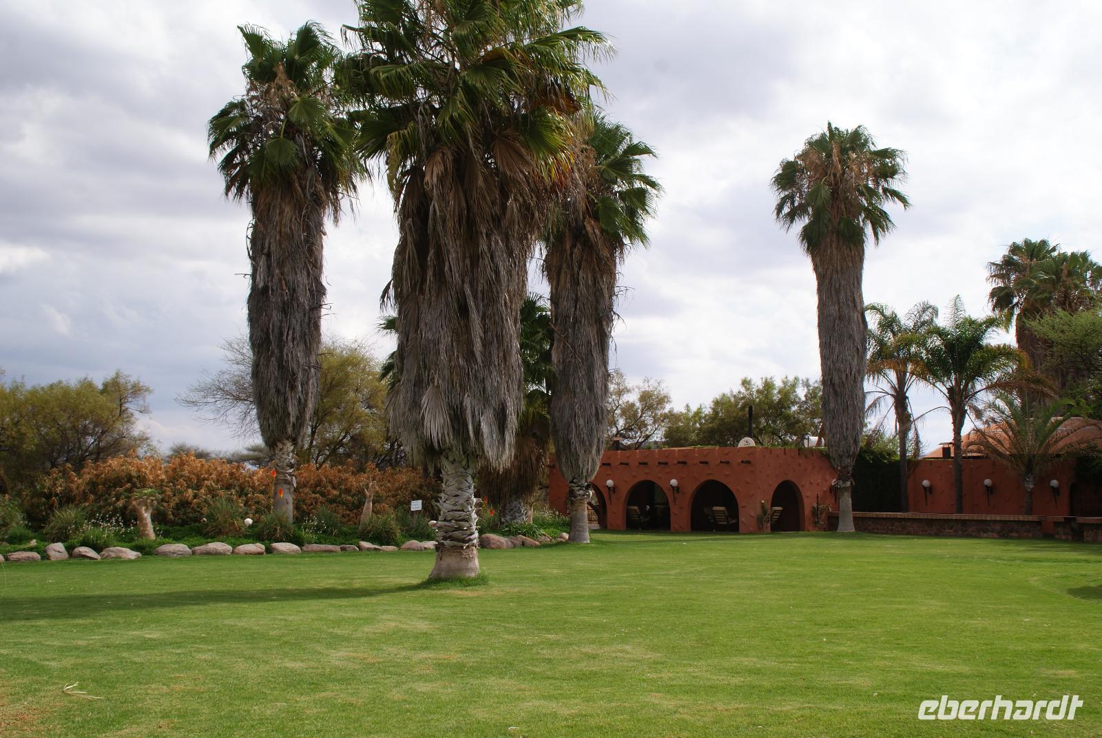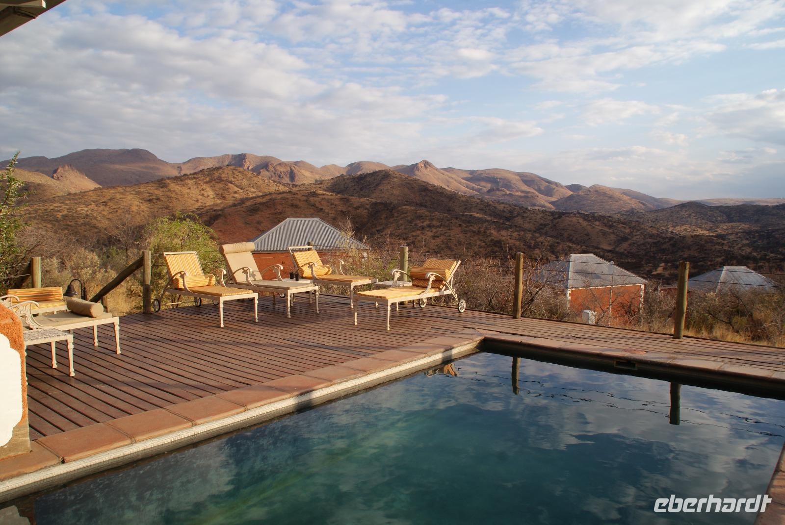Mit dem Meer in den Ohren und bei kühlen Temperaturen haben wir herrlich geschlafen. Nach einem guten Frühstück verlassen wir Lüderitz und fahren zunächst zum kleinen Örtchen Aus um hier noch einen Kaffee, den Geldautomaten, kleine Knabbereien zu besorgen und werfen einen Blick auf die schöne hiesige Kirche. Weiter geht die Fahrt über Helmeringhausen zu unserem Mittagsstopp nach Maltahöhe, welches einst nach einer gewissen Malta und auf der Anhöhe gelegen benannt wurde. Dagmar erklärt uns, dass hier 50 weiße Namibianer und 8000 Namas wohnen. Hier kehren wir in ein schönes Lokal mit Biergarten ein und genießen einen kurzen Mittagssnack. Die Fahrt führt uns weiter zum Namib Naukluft Gebirge und auch heute sind wir wieder begeistert von der sich stets verändernden Landschaft. Am Nachmittag erreichen wir unsere schöne Unterkunft, die Namib Desert Lodge und werden mit wohltuend gekühlten Tüchern und kühlem Getränk empfangen. Ein kurzer Check-in unserer schönen Zimmer mit Blick auf vorbeiziehende Oryxantilopen und wir treffen uns am Wasserloch um mit einem Gläschen Amarula auf die erste, erlebnisreiche Woche anzustoßen. Unter dem Sternenhimmel Afrikas sitzend genießen wir ein tolles Abendessen mit großer Auswahl und lassen die Eindrücke des Tages Revue passieren.