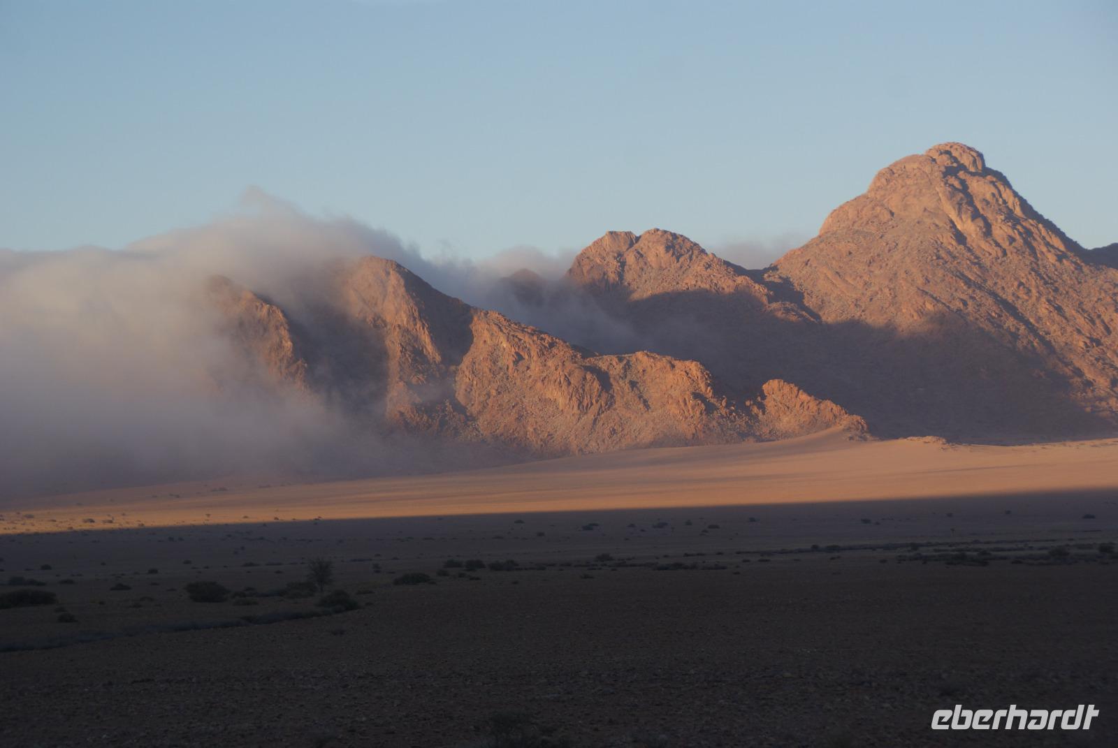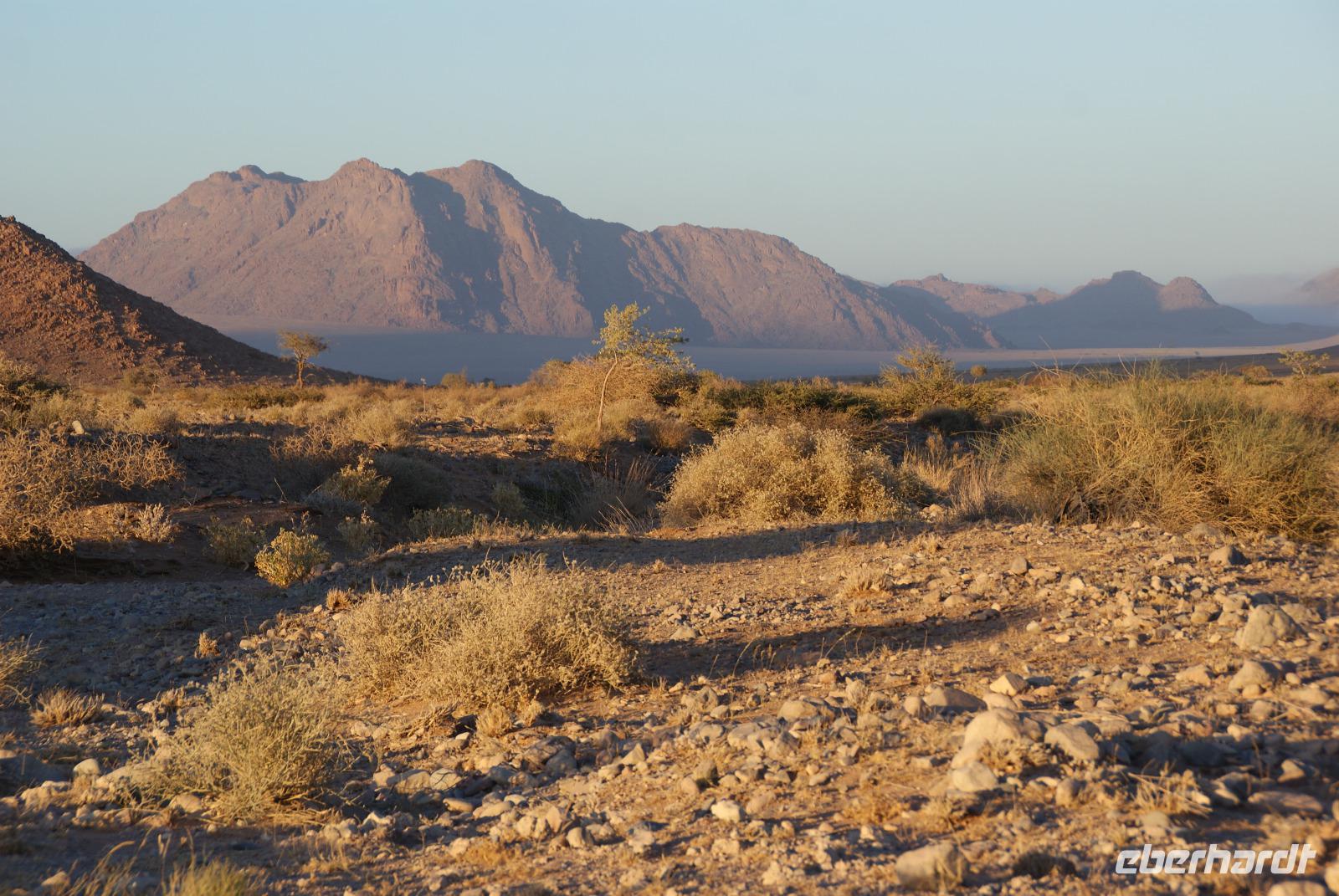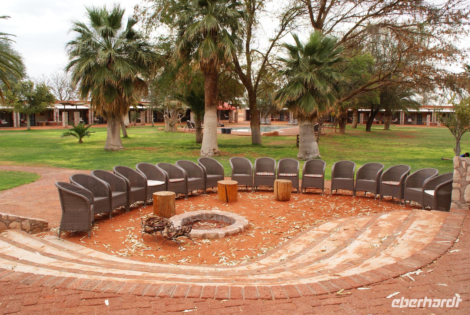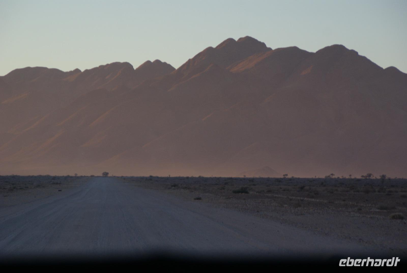 Mit dem Meer in den Ohren und bei kühlen Temperaturen haben wir herrlich geschlafen. Nach einem guten Frühstück verlassen wir Lüderitz und fahren zunächst zum kleinen Örtchen Aus um hier noch einen Kaffee, den Geldautomaten, kleine Knabbereien zu besorgen und werfen einen Blick auf die schöne hiesige Kirche. Weiter geht die Fahrt über Helmeringhausen zu unserem Mittagsstopp nach Maltahöhe, welches einst nach einer gewissen Malta und auf der Anhöhe gelegen benannt wurde. Dagmar erklärt uns, dass hier 50 weiße Namibianer und 8000 Namas wohnen. Hier kehren wir in ein schönes Lokal mit Biergarten ein und genießen einen kurzen Mittagssnack. Die Fahrt führt uns weiter zum Namib Naukluft Gebirge und auch heute sind wir wieder begeistert von der sich stets verändernden Landschaft. Am Nachmittag erreichen wir unsere schöne Unterkunft, die Namib Desert Lodge und werden mit wohltuend gekühlten Tüchern und kühlem Getränk empfangen. Ein kurzer Check-in unserer schönen Zimmer mit Blick auf vorbeiziehende Oryxantilopen und wir treffen uns am Wasserloch um mit einem Gläschen Amarula auf die erste, erlebnisreiche Woche anzustoßen. Unter dem Sternenhimmel Afrikas sitzend genießen wir ein tolles Abendessen mit großer Auswahl und lassen die Eindrücke des Tages Revue passieren.
